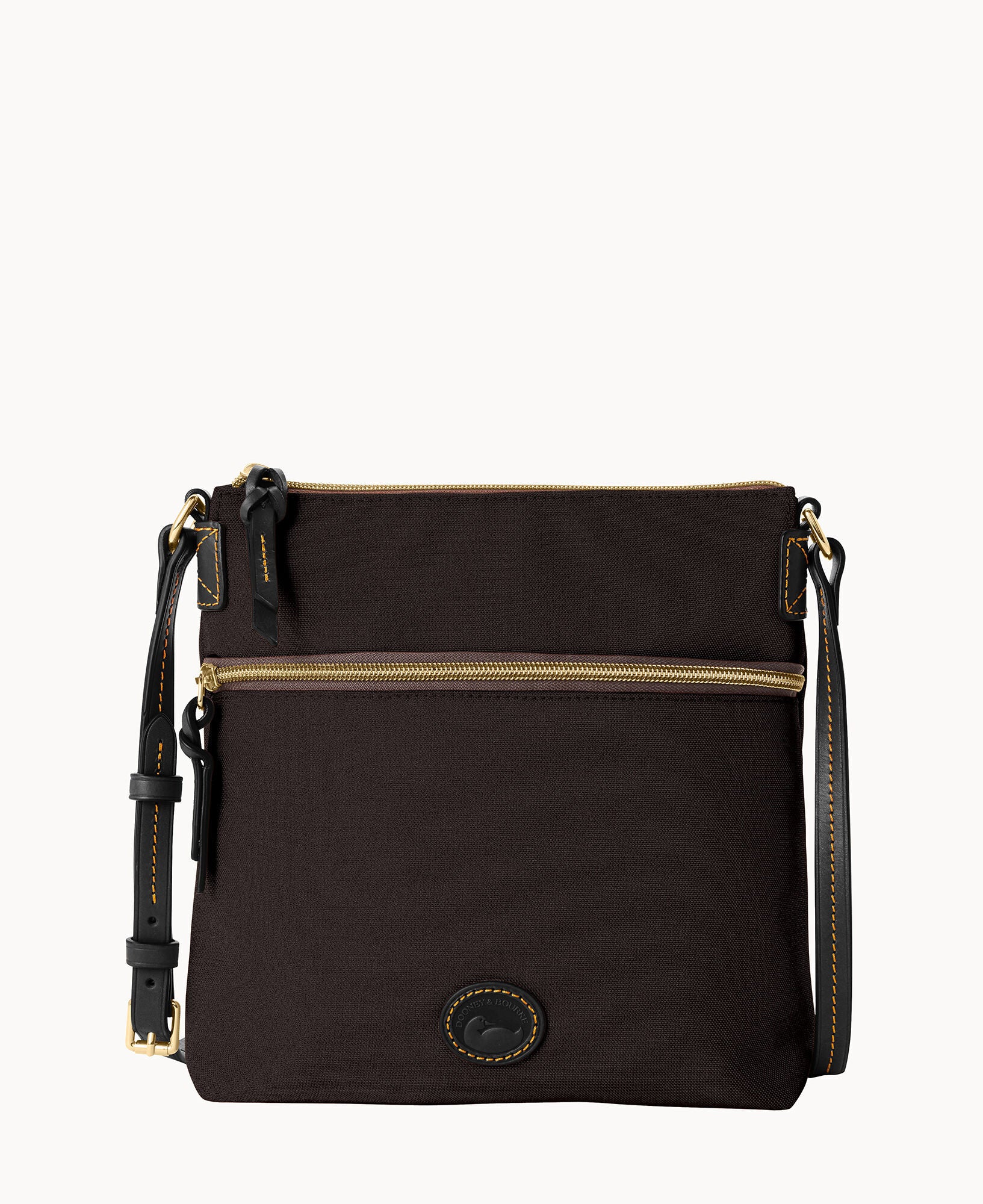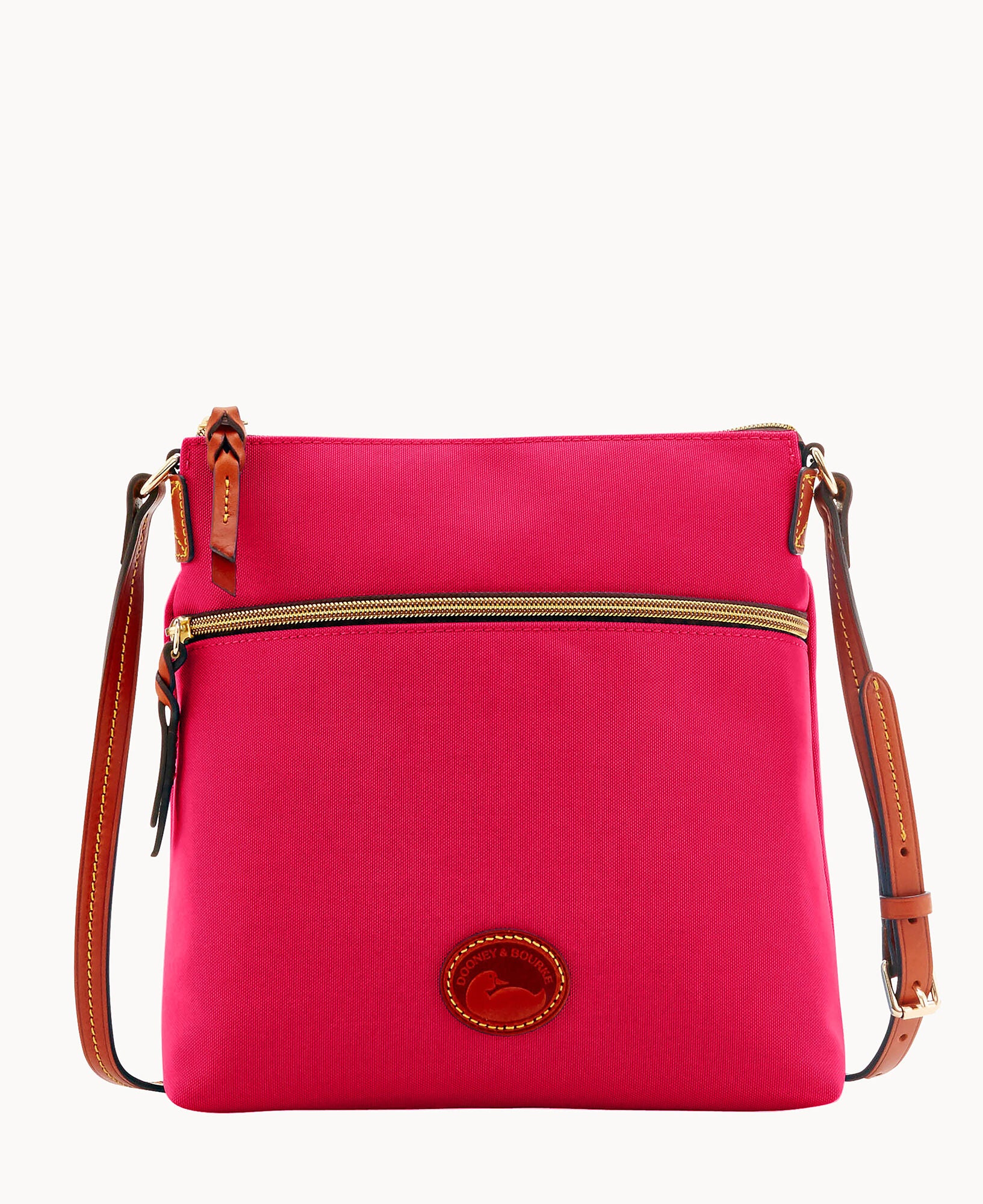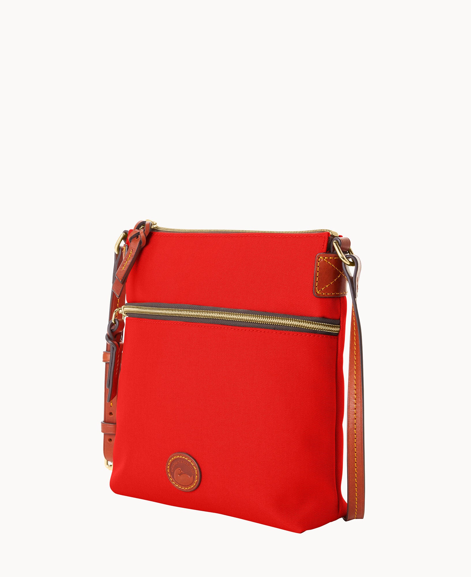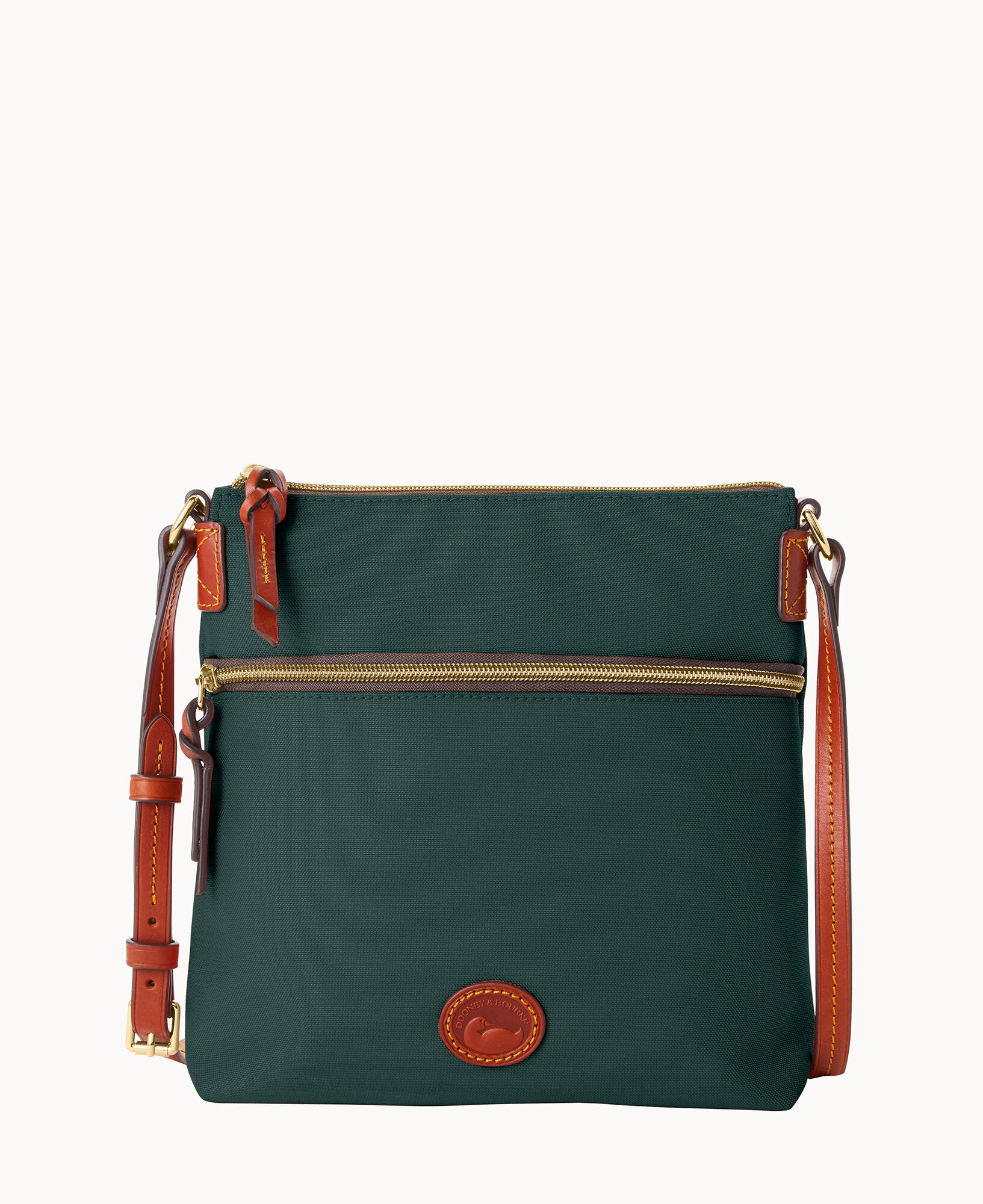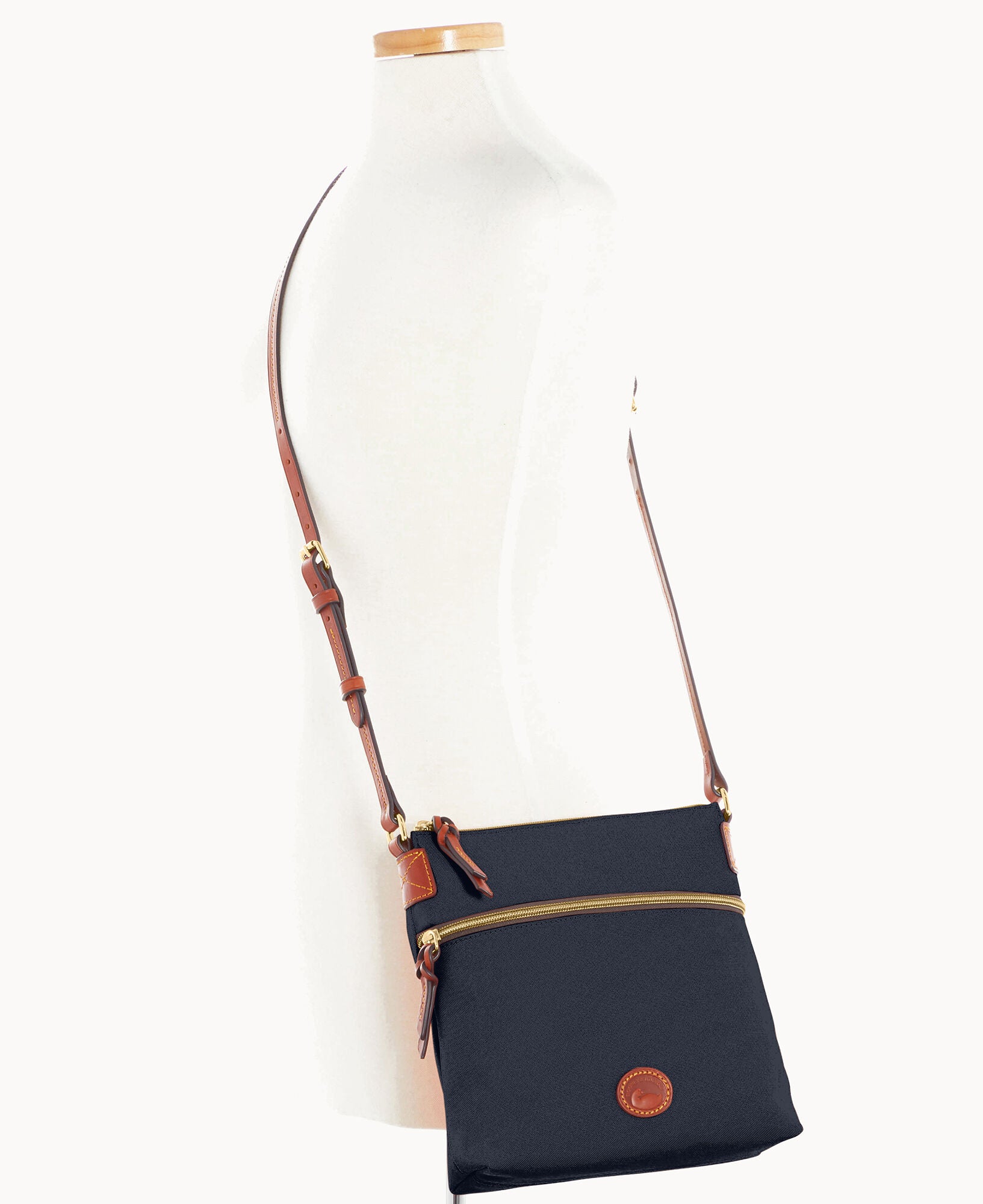 One outside zip pocket. One inside zip pocket. Two inside pockets. Cell phone pocket. Inside key hook. Adjustable shoulder strap. Strap drop length 25″. Lined. Zipper closure.
