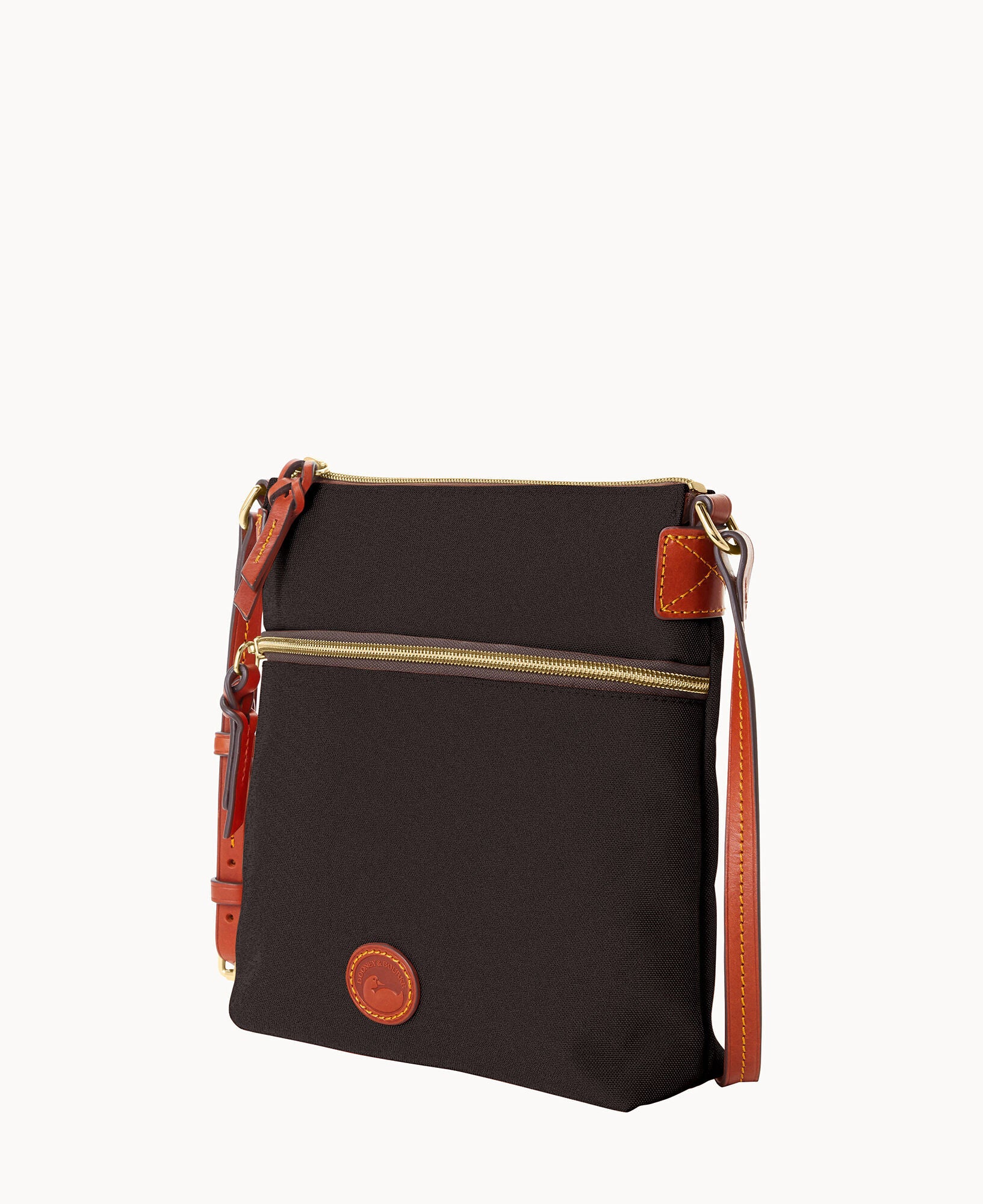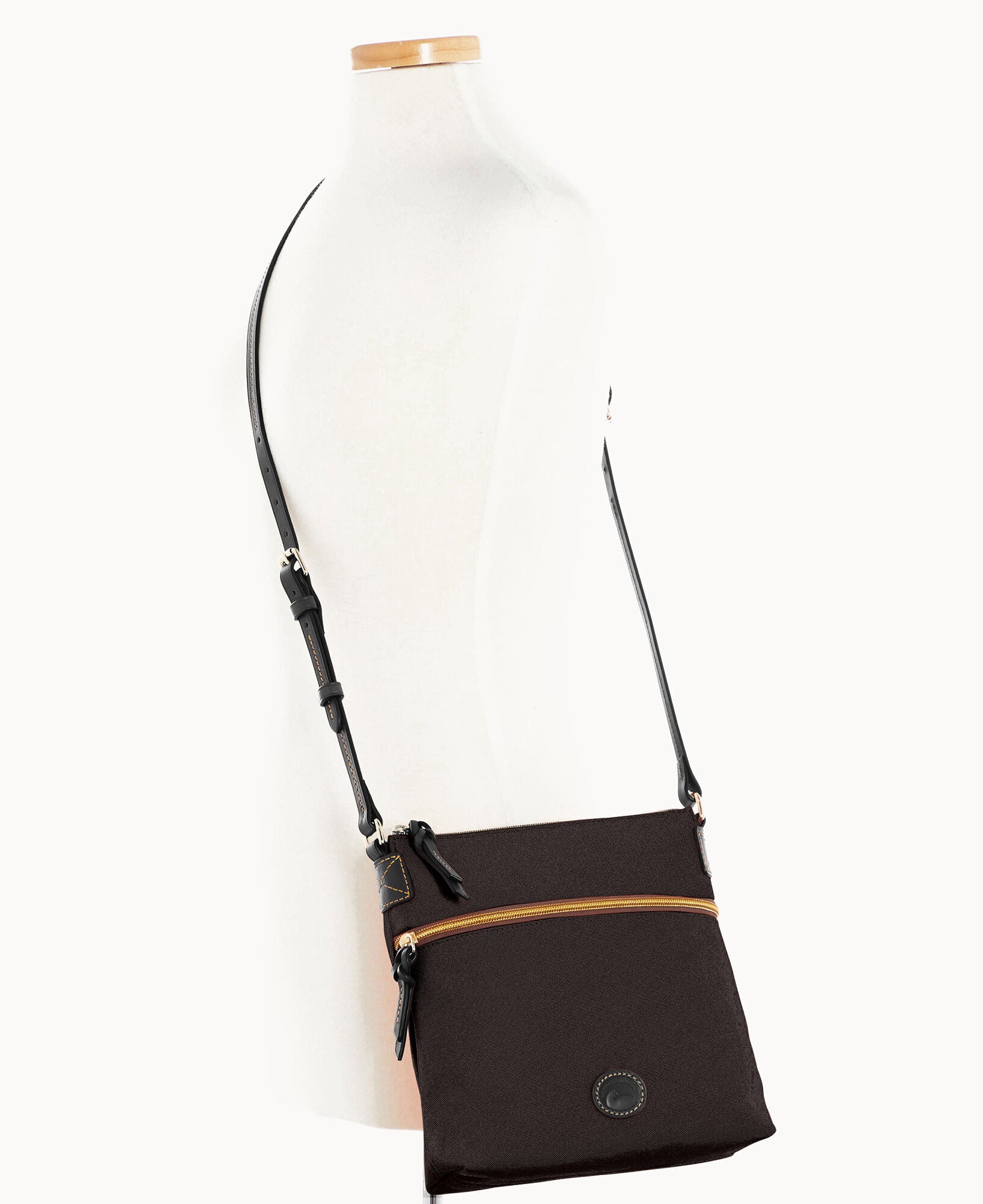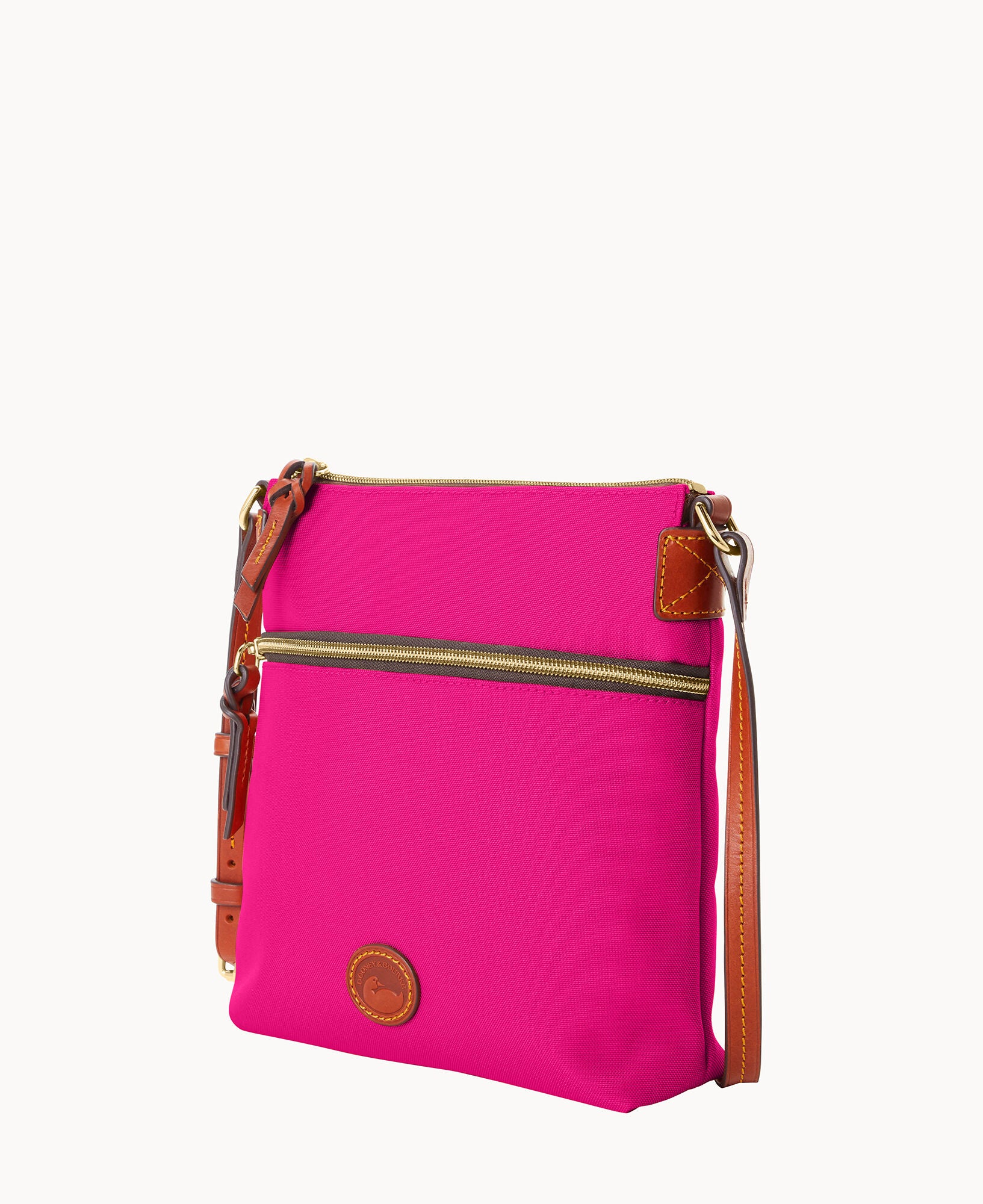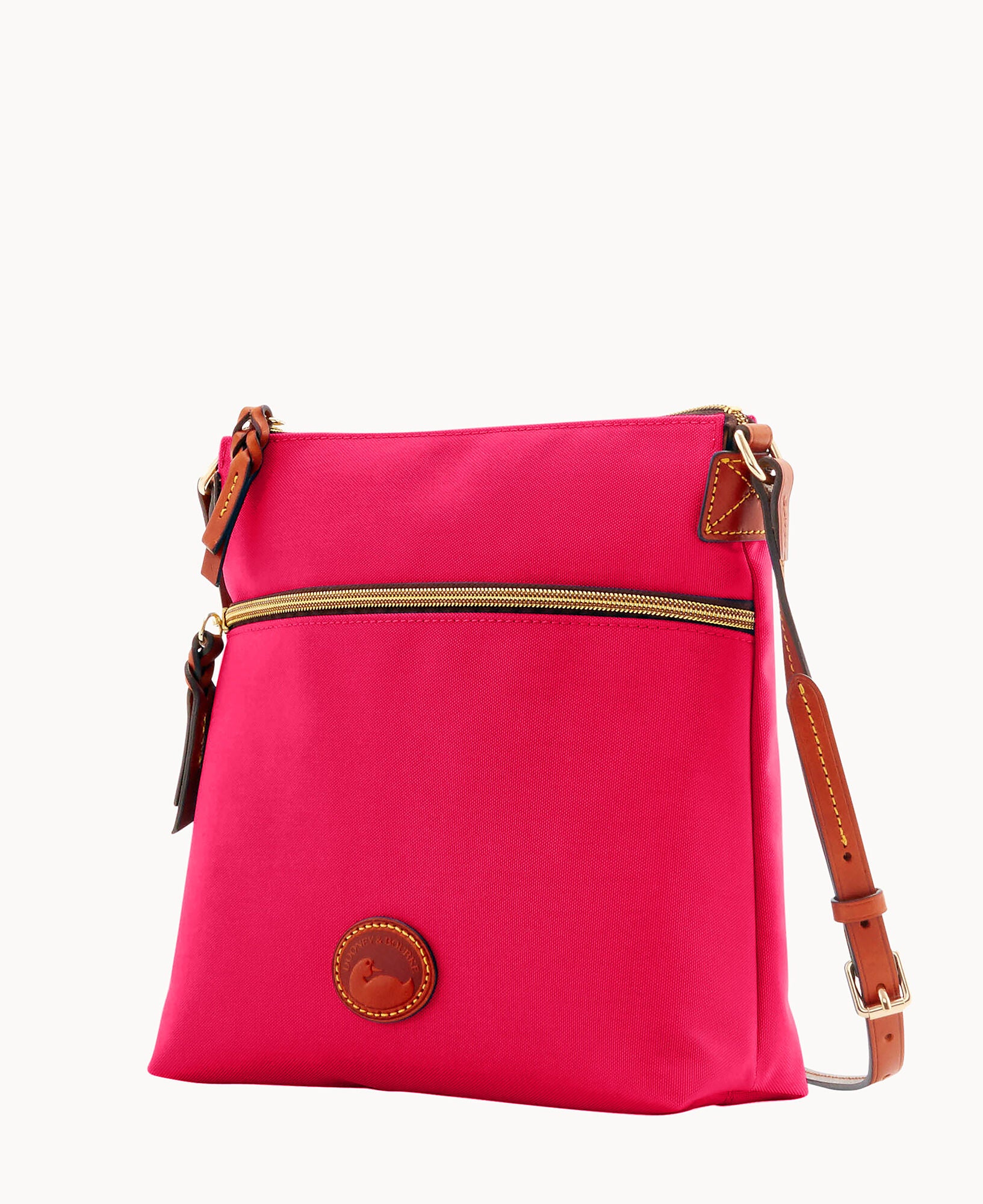 One outside zip pocket. One inside zip pocket. Two inside pockets. Cell phone pocket. Inside key hook. Adjustable shoulder strap. Strap drop length 25″. Lined. Zipper closure.