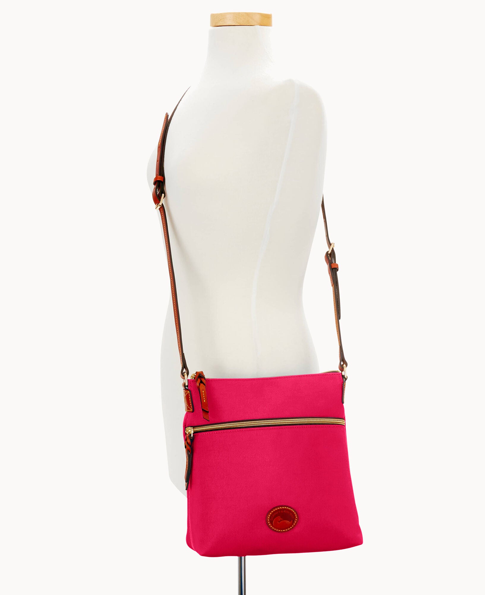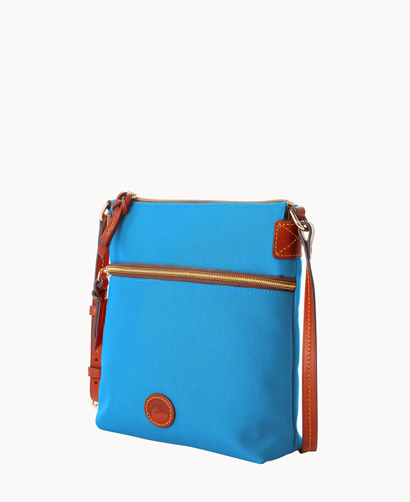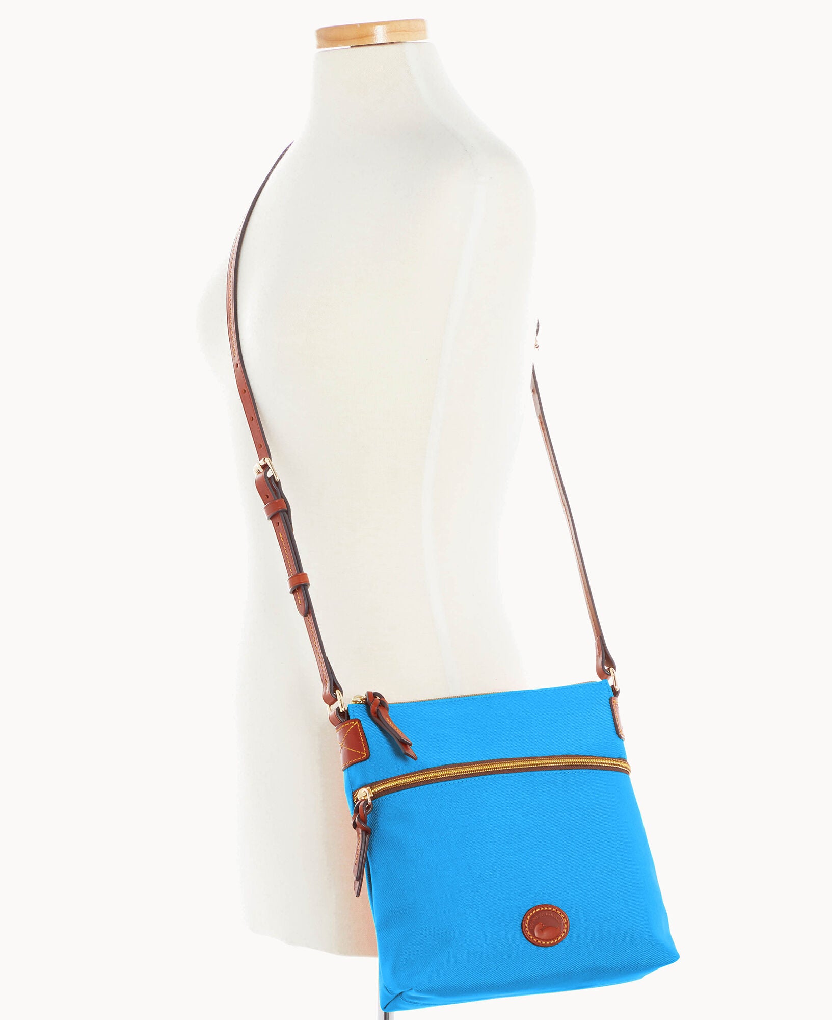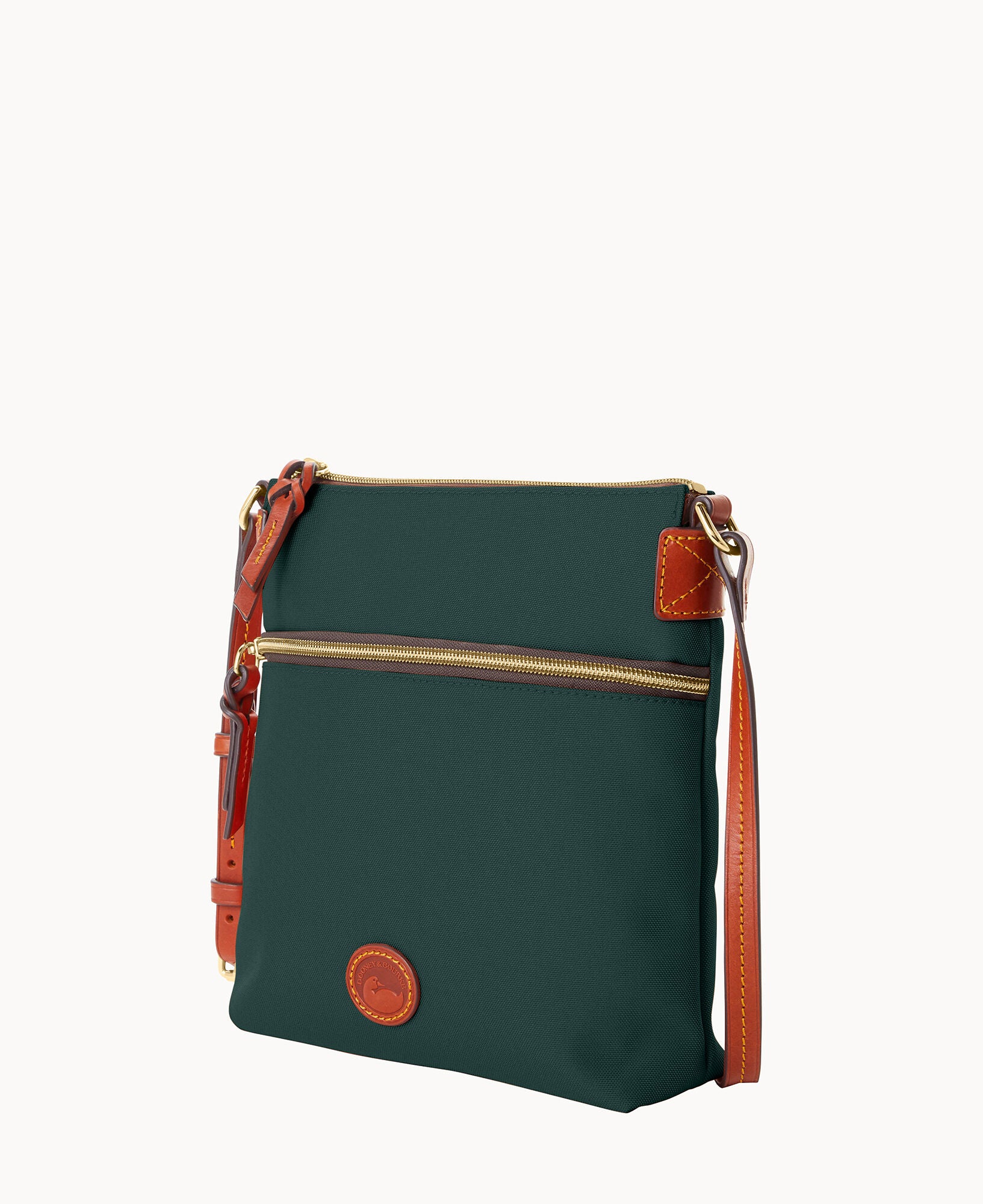 One outside zip pocket. One inside zip pocket. Two inside pockets. Cell phone pocket. Inside key hook. Adjustable shoulder strap. Strap drop length 25″. Lined. Zipper closure.