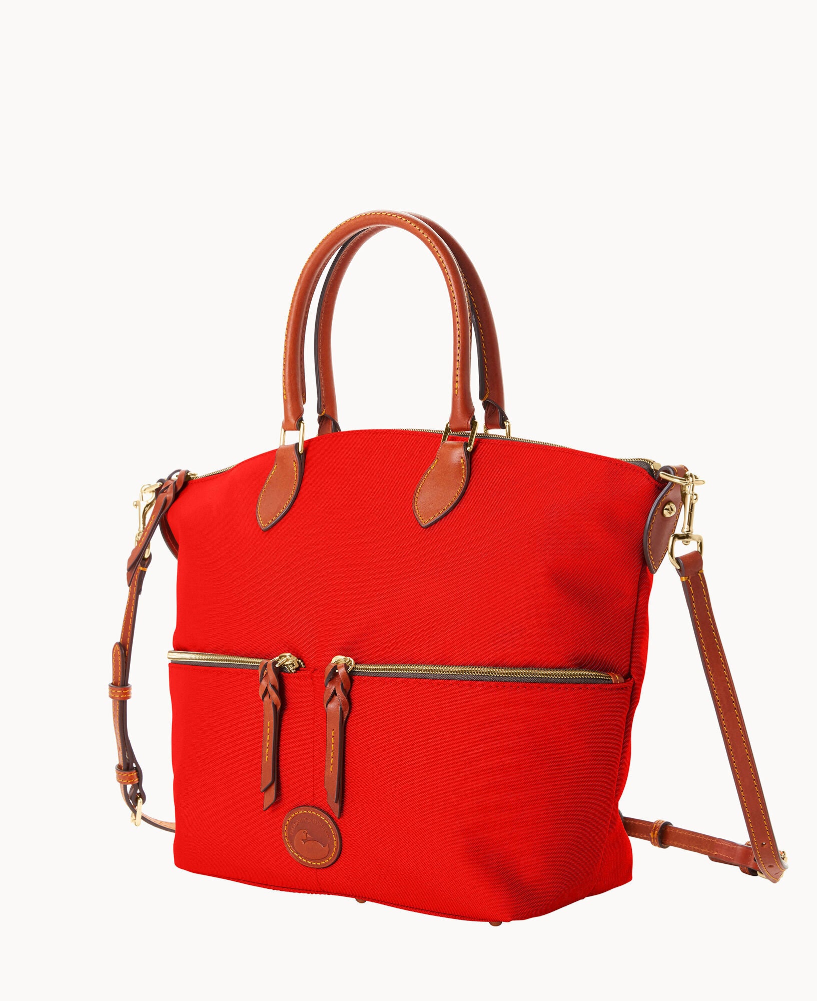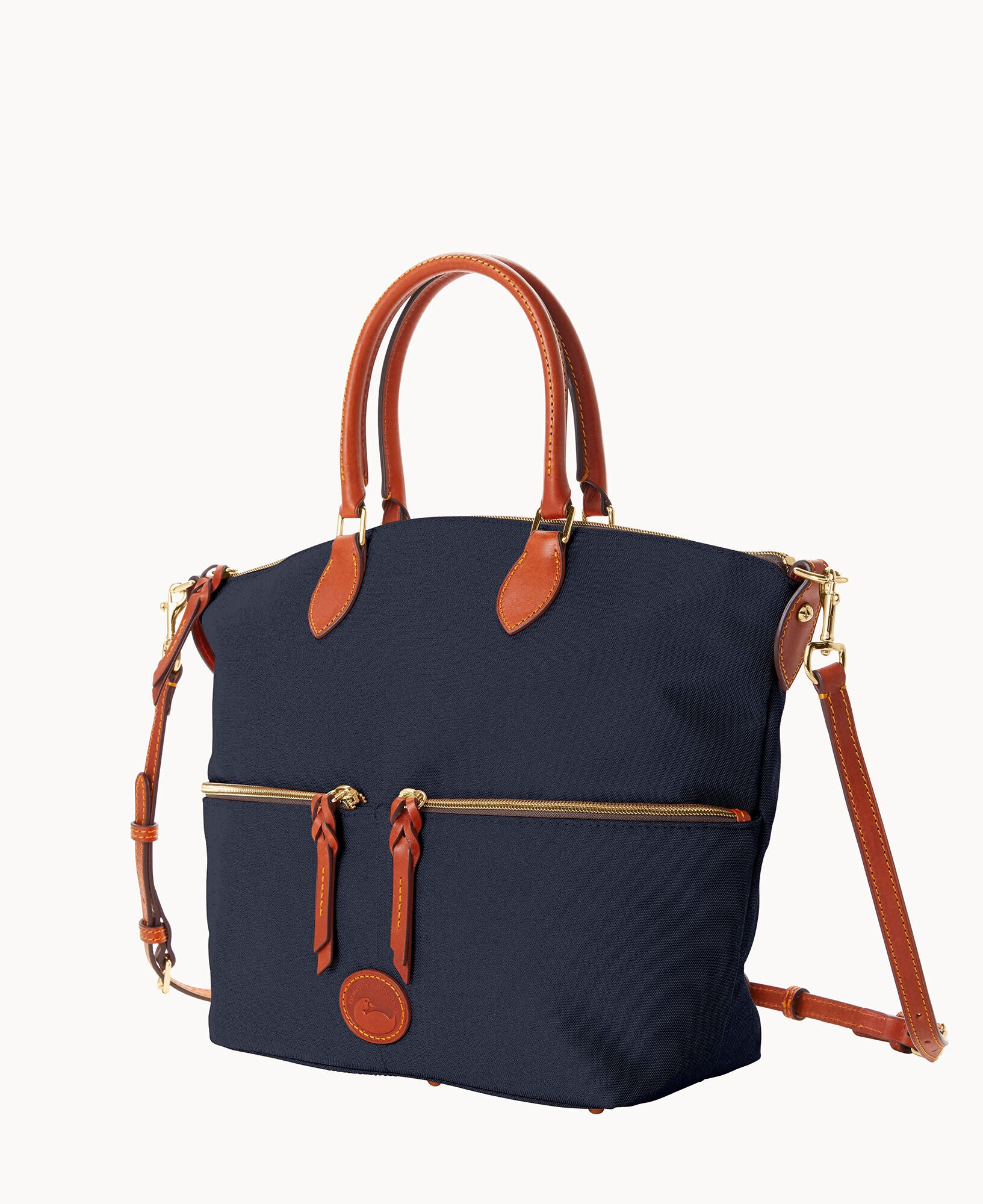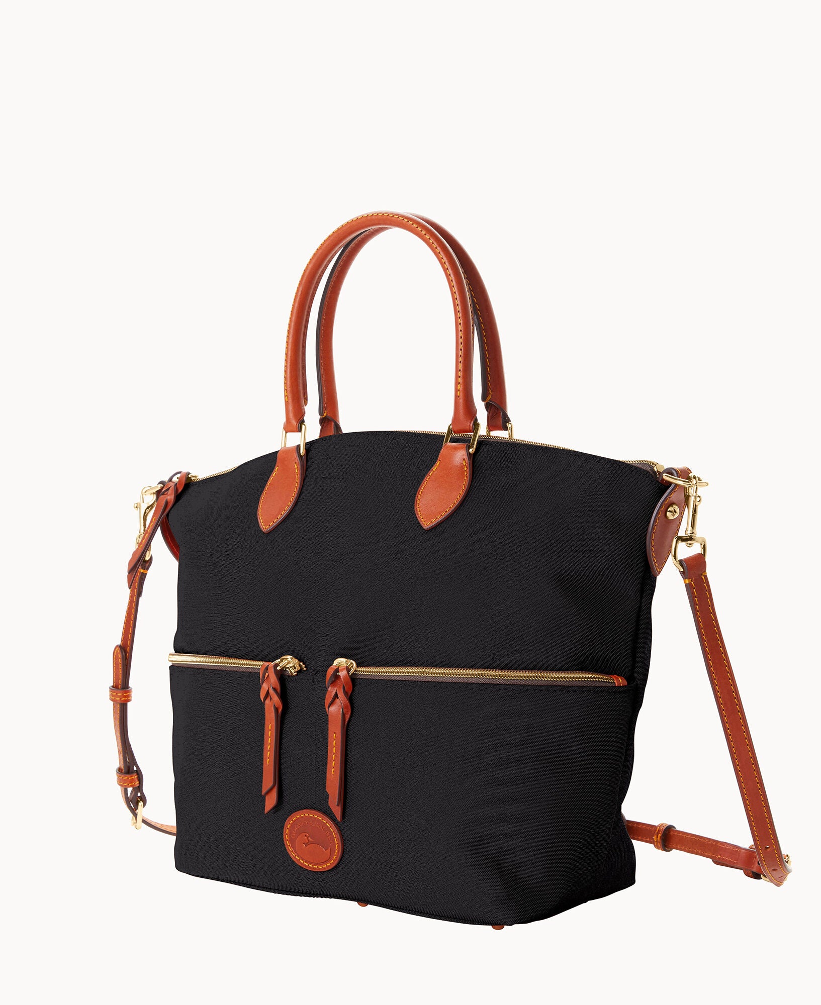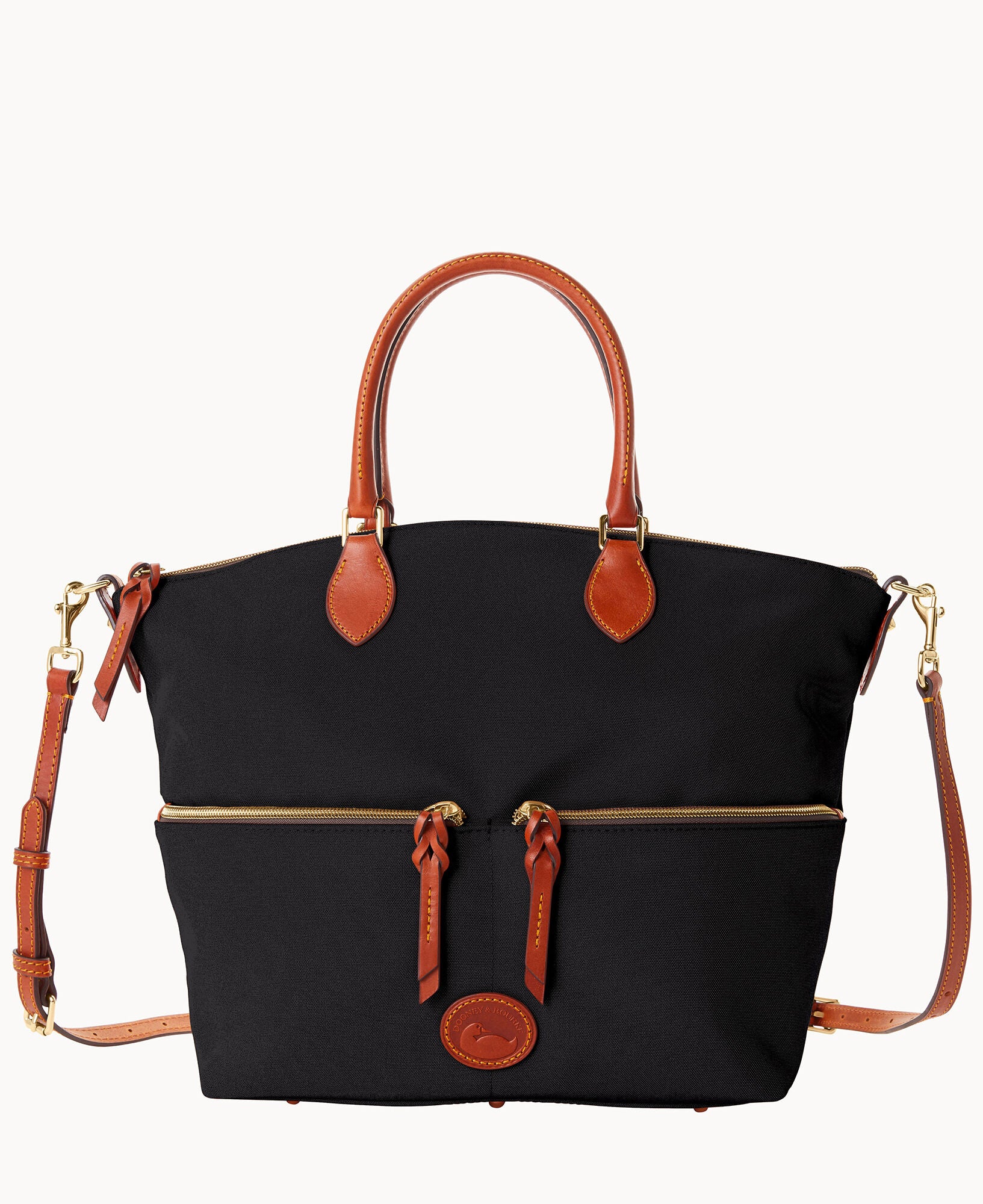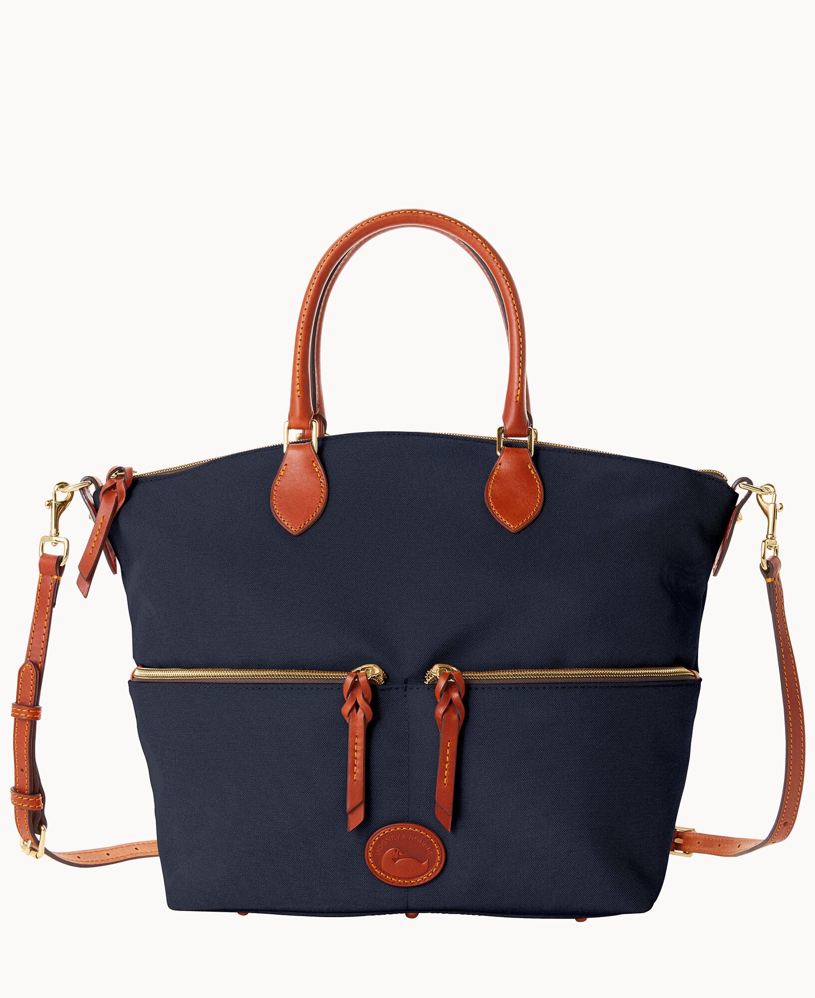 Two outside zip pockets. One inside zip pocket. Two inside pockets. Cell phone pocket. Inside key hook. Handle drop length 5.5″. Adjustable, detachable shoulder strap. Strap drop length 22″. Lined. Feet. Zipper closure.