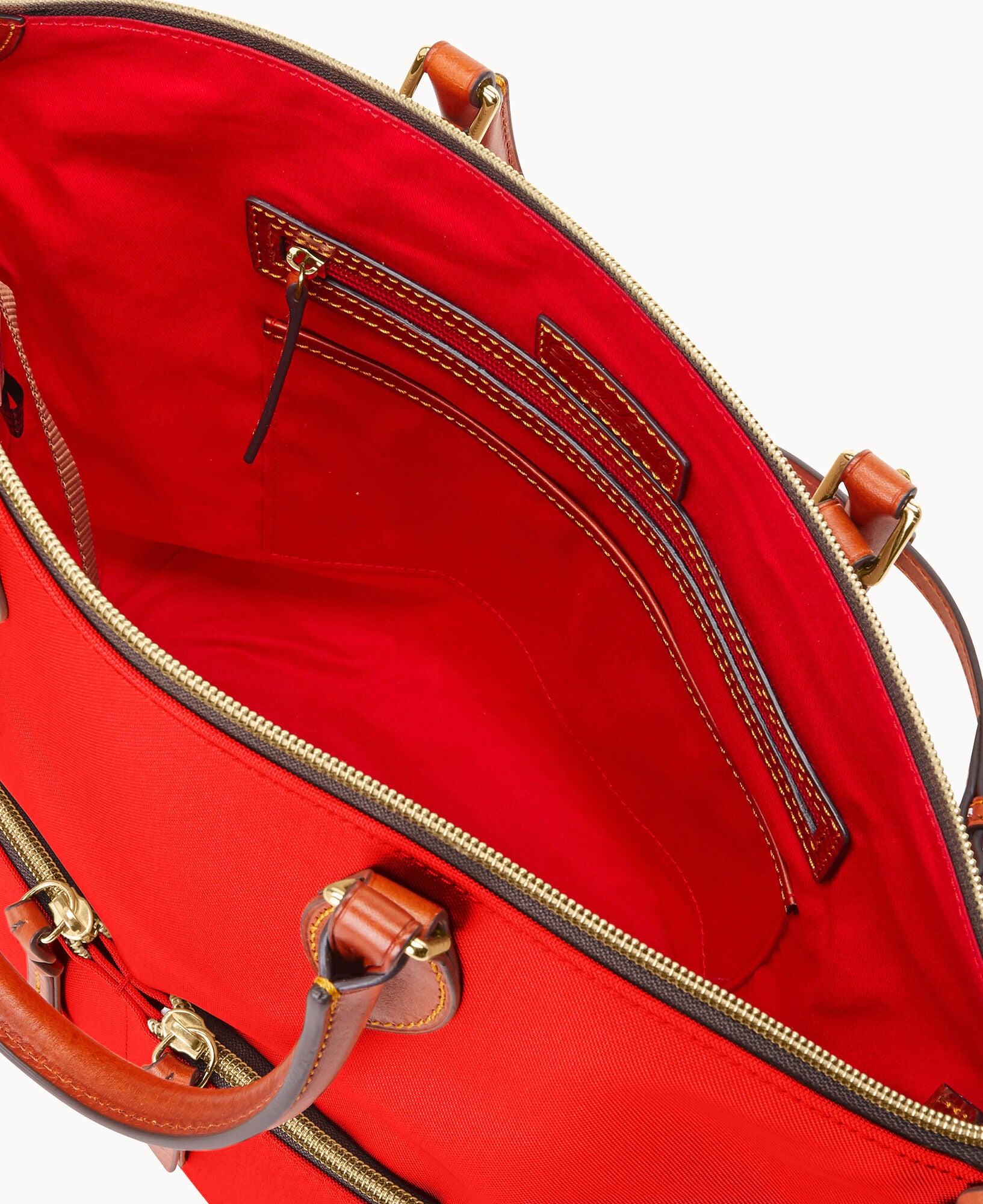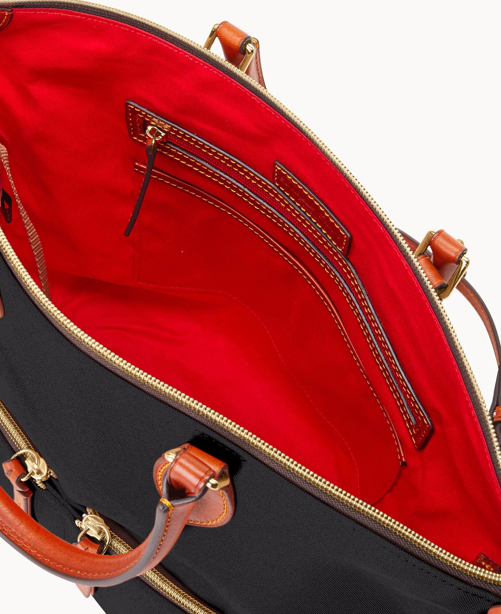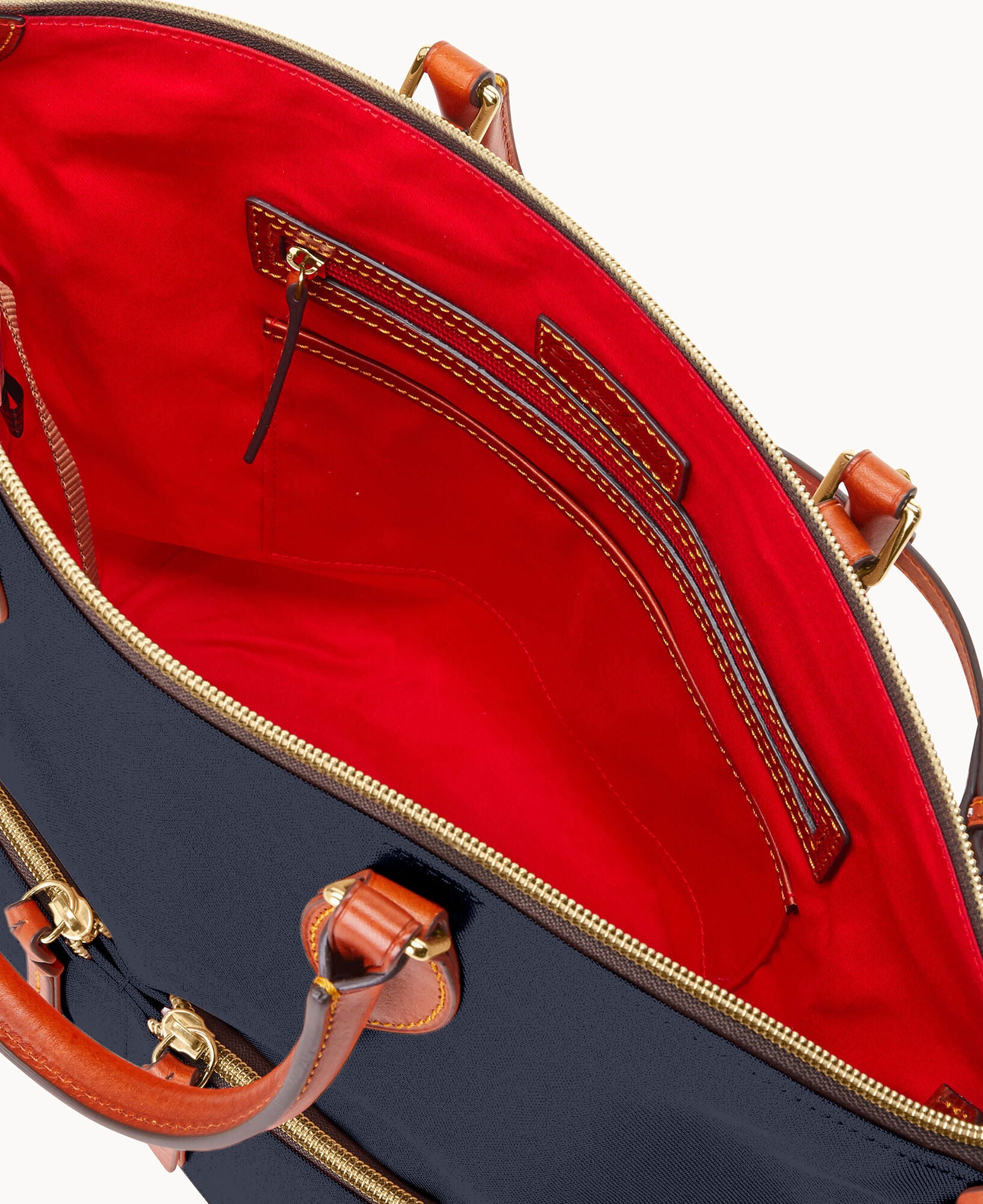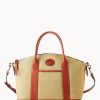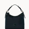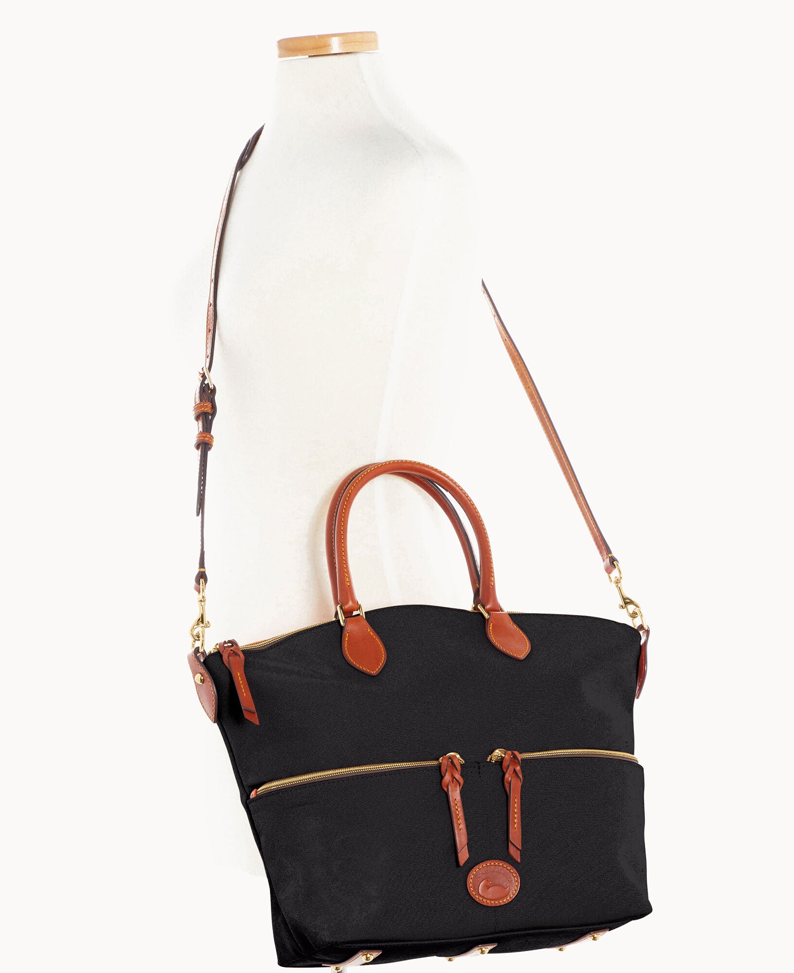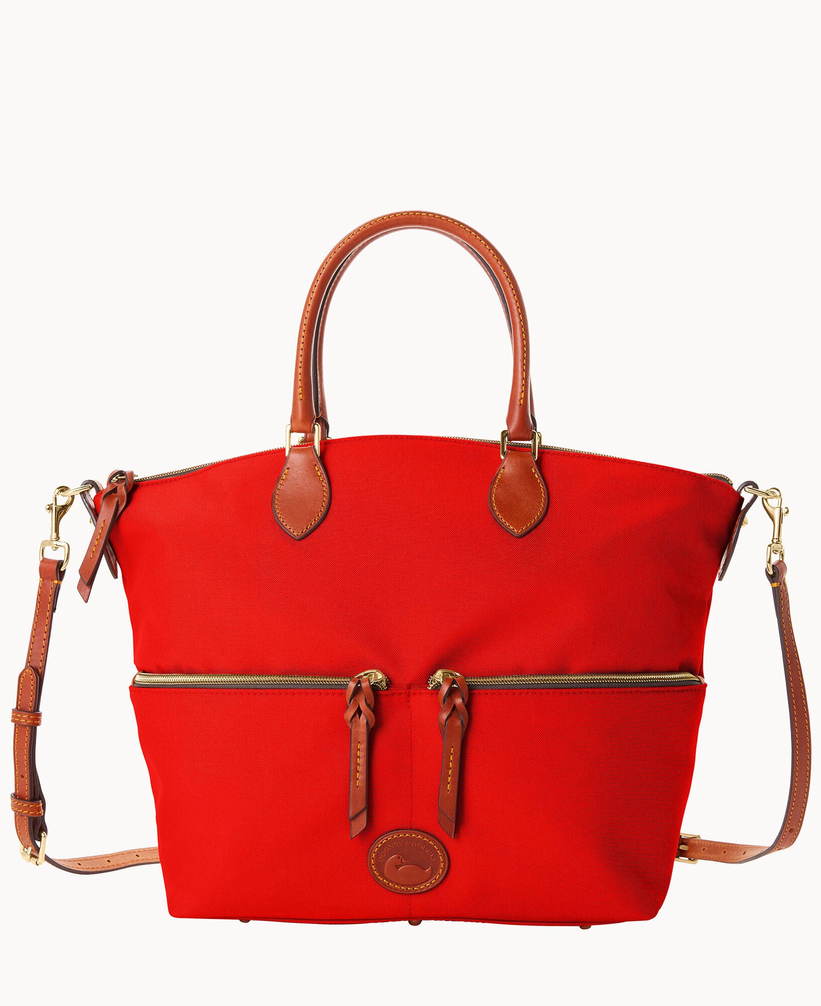 Two outside zip pockets. One inside zip pocket. Two inside pockets. Cell phone pocket. Inside key hook. Handle drop length 5.5″. Adjustable, detachable shoulder strap. Strap drop length 22″. Lined. Feet. Zipper closure.