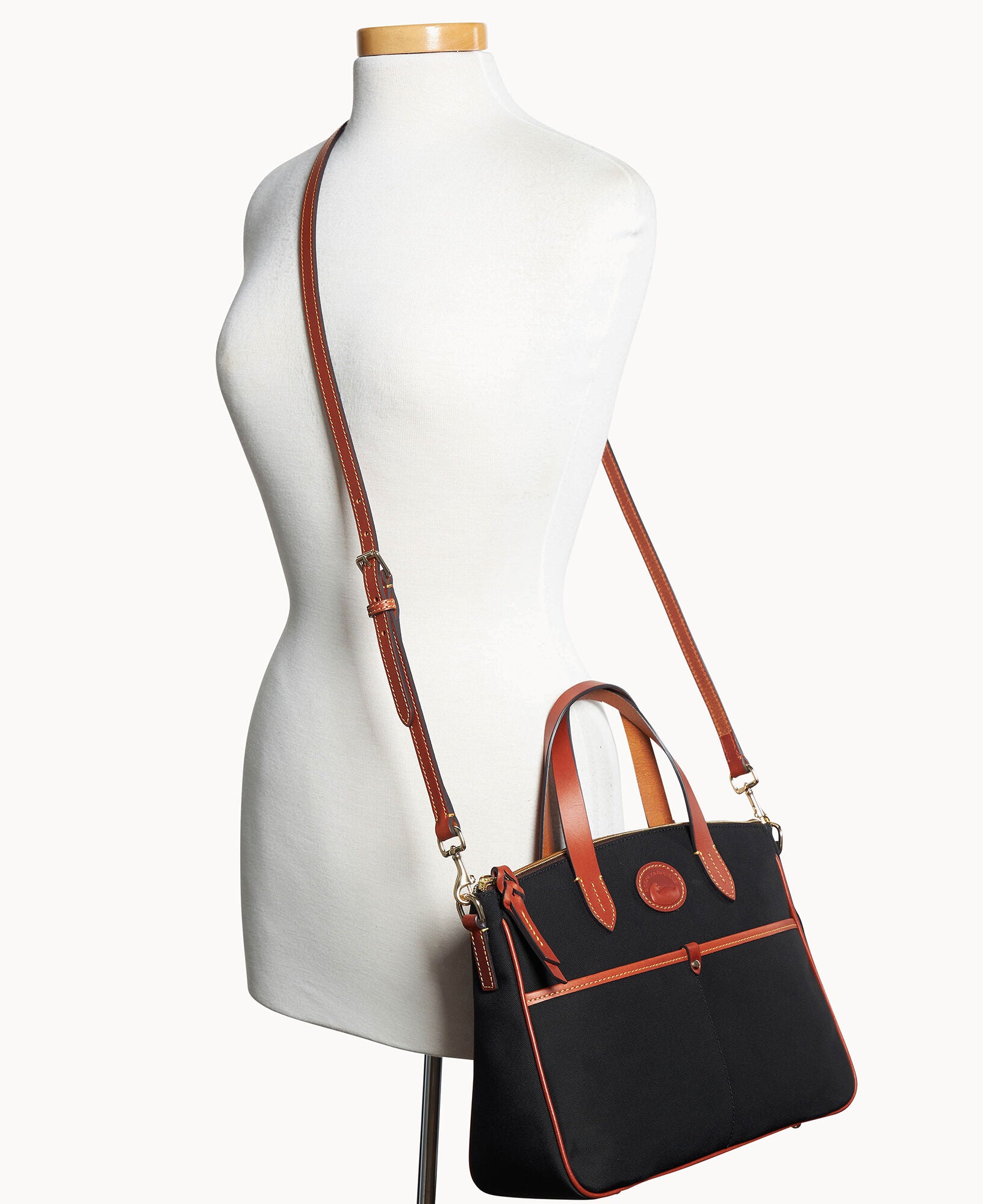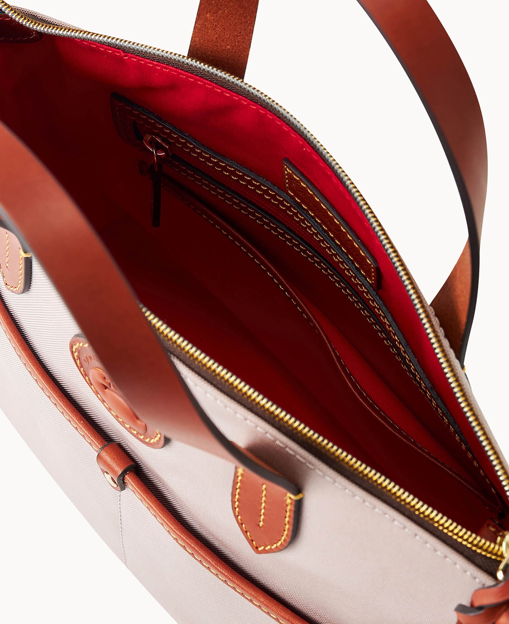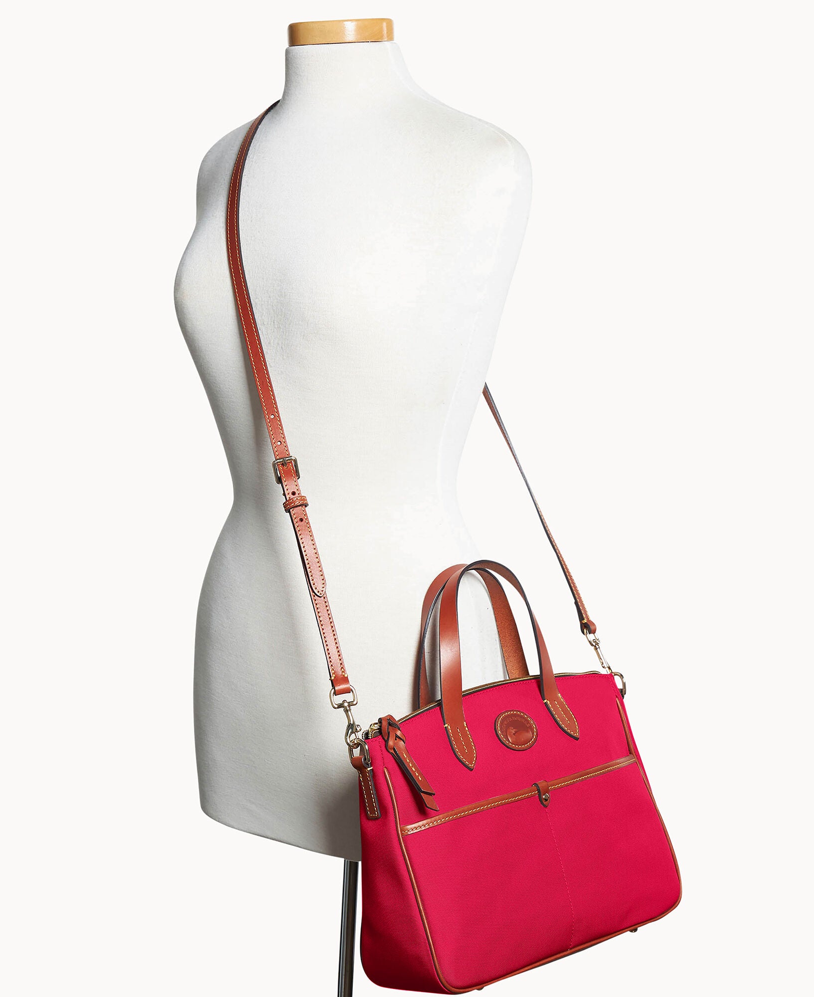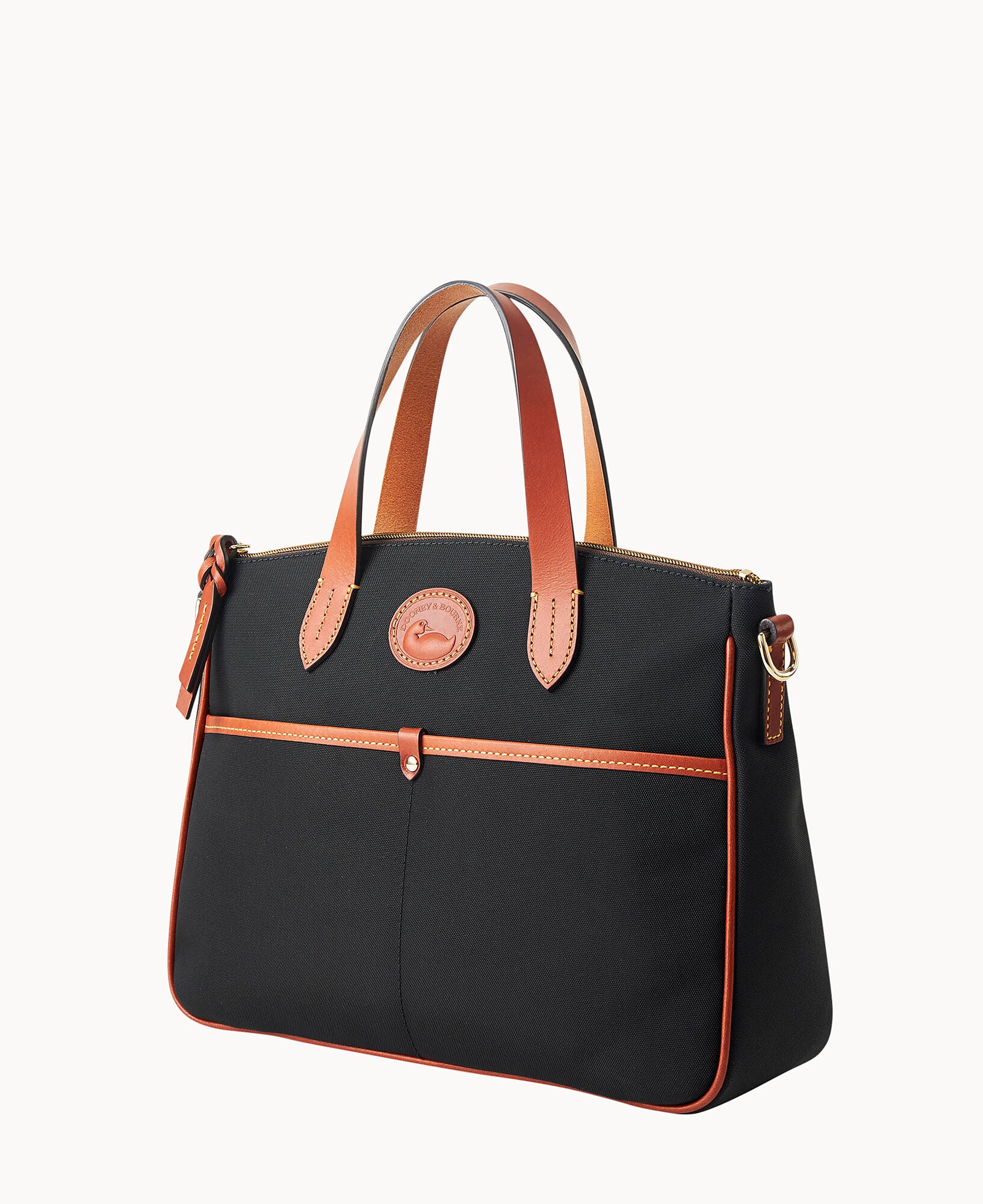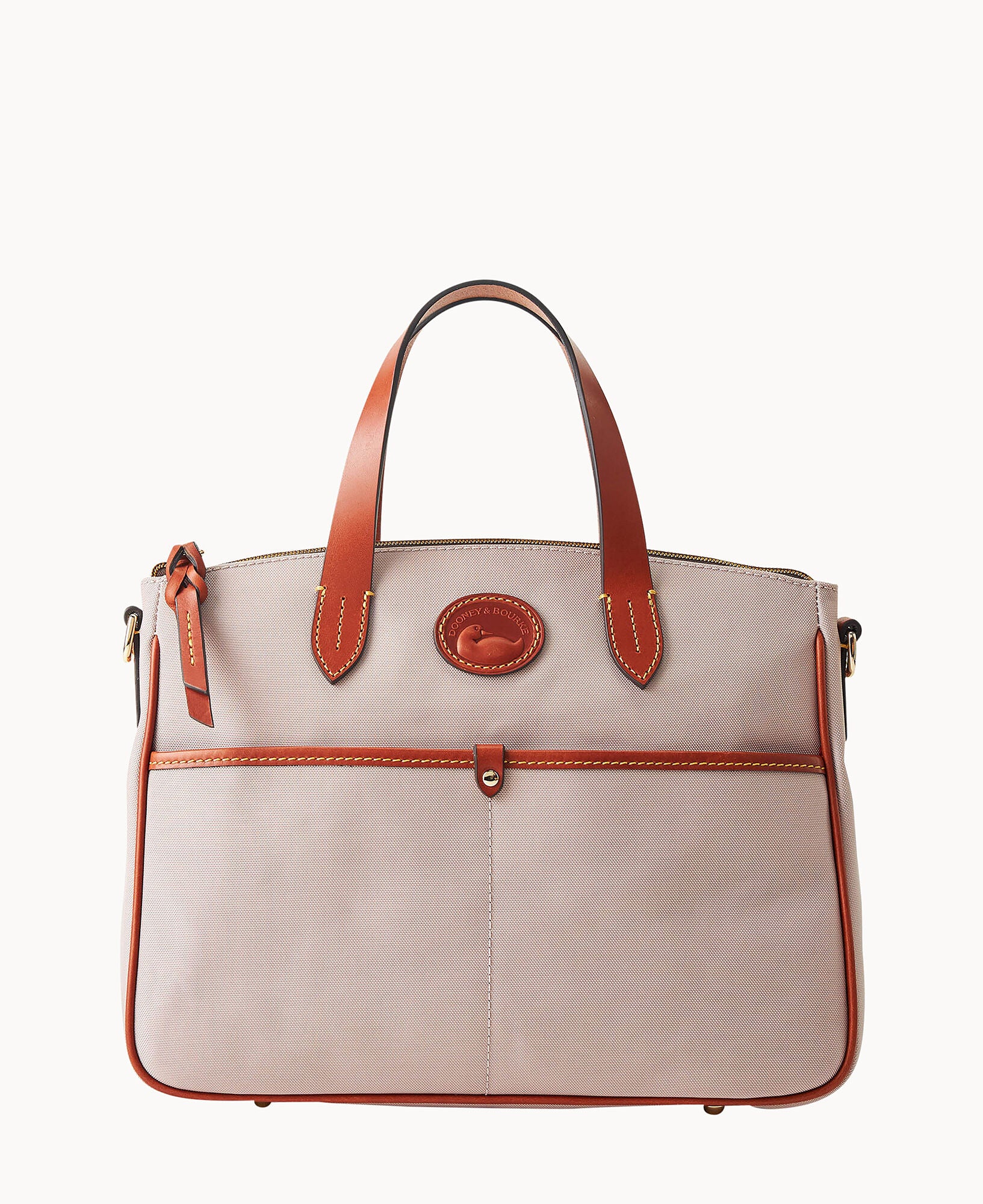 Two outside pockets. One inside zip pocket. Two inside pockets. Cell phone pocket. Inside key hook. Handle drop length 4.5″. Adjustable, detachable shoulder strap. Strap drop length 26″. Lined. Feet. Zipper closure.