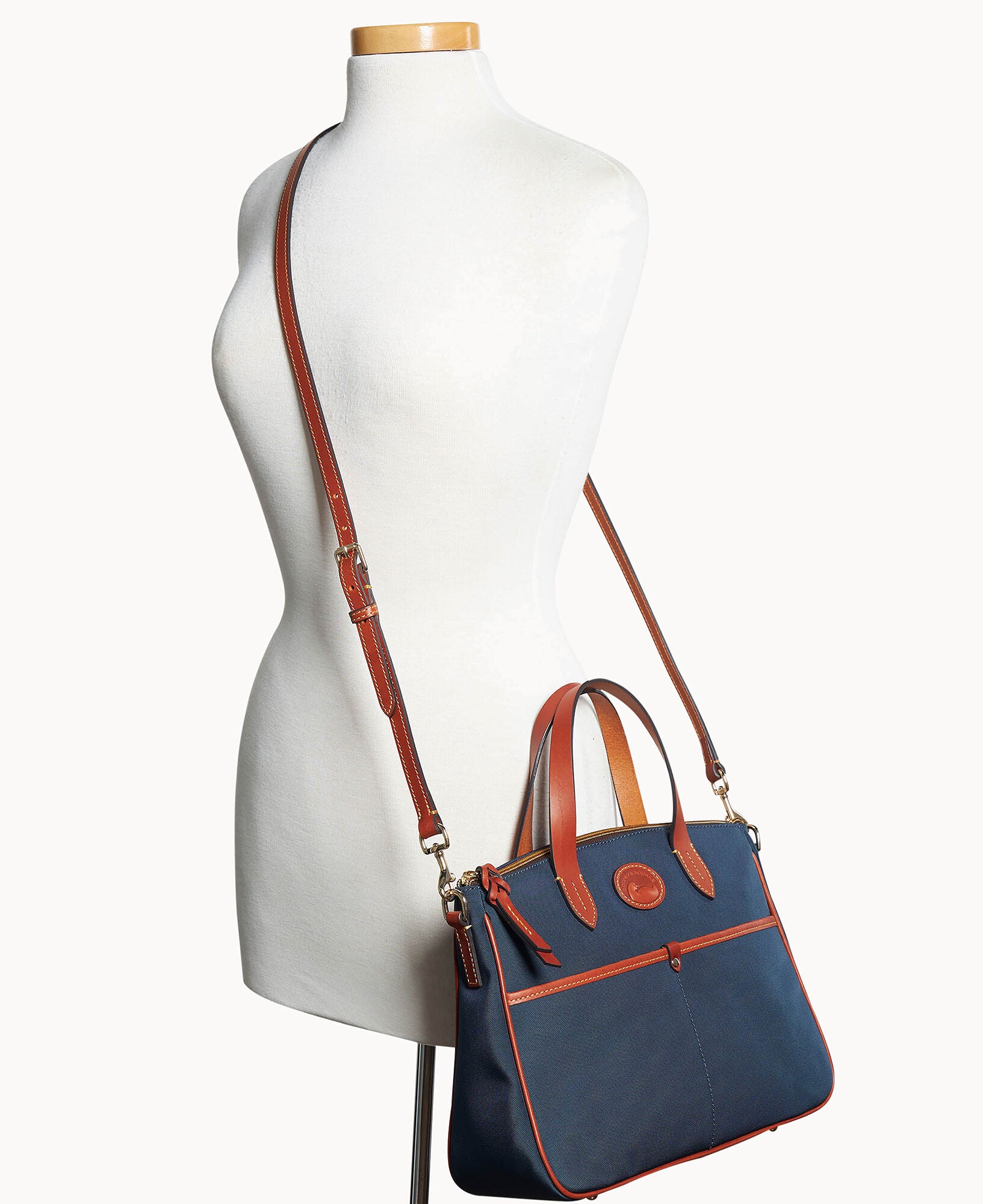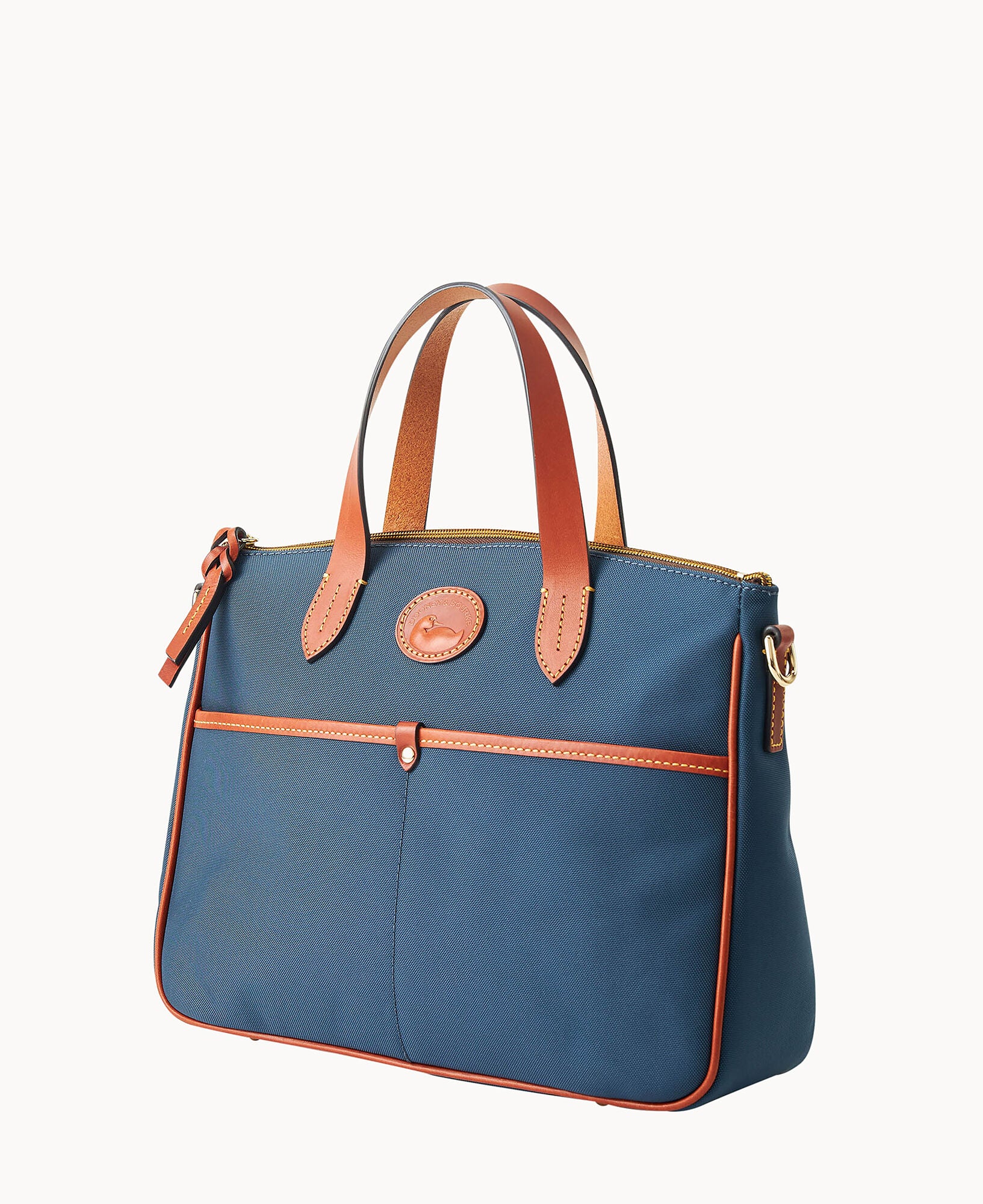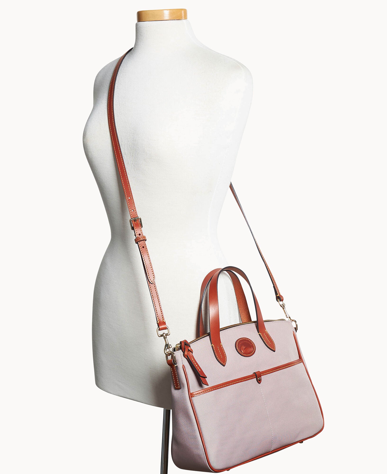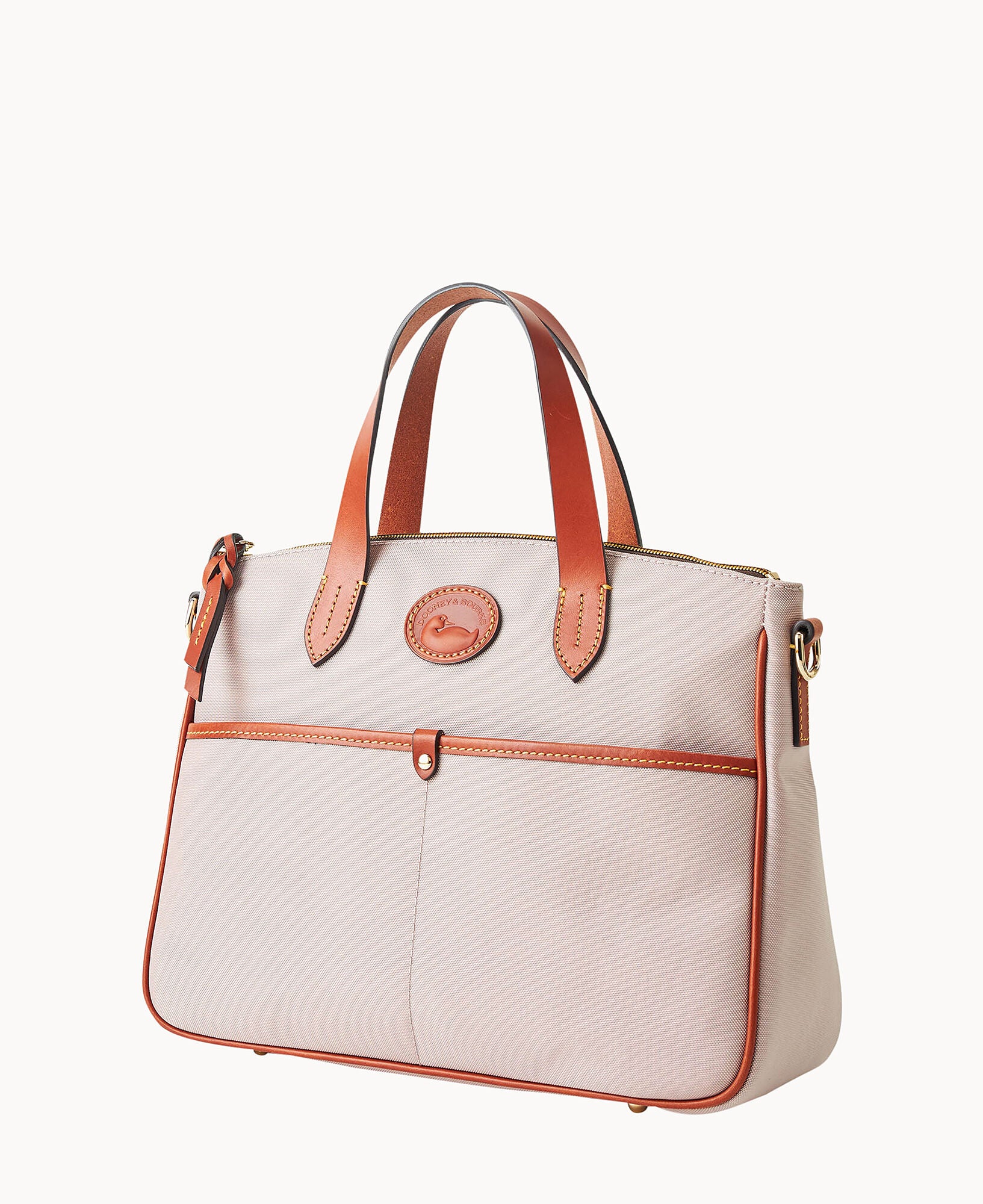 Two outside pockets. One inside zip pocket. Two inside pockets. Cell phone pocket. Inside key hook. Handle drop length 4.5″. Adjustable, detachable shoulder strap. Strap drop length 26″. Lined. Feet. Zipper closure.