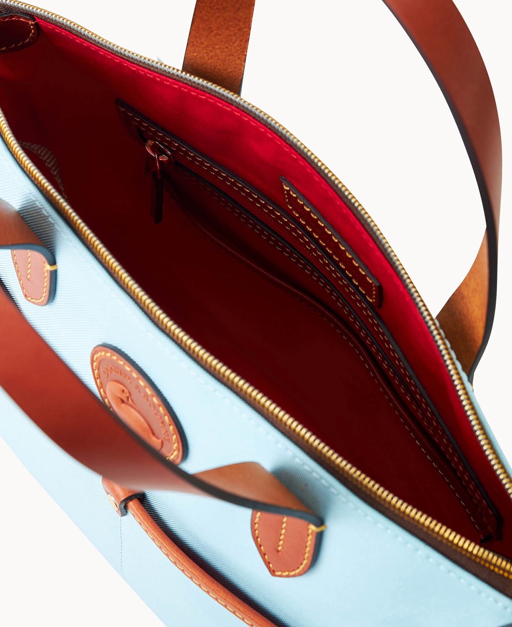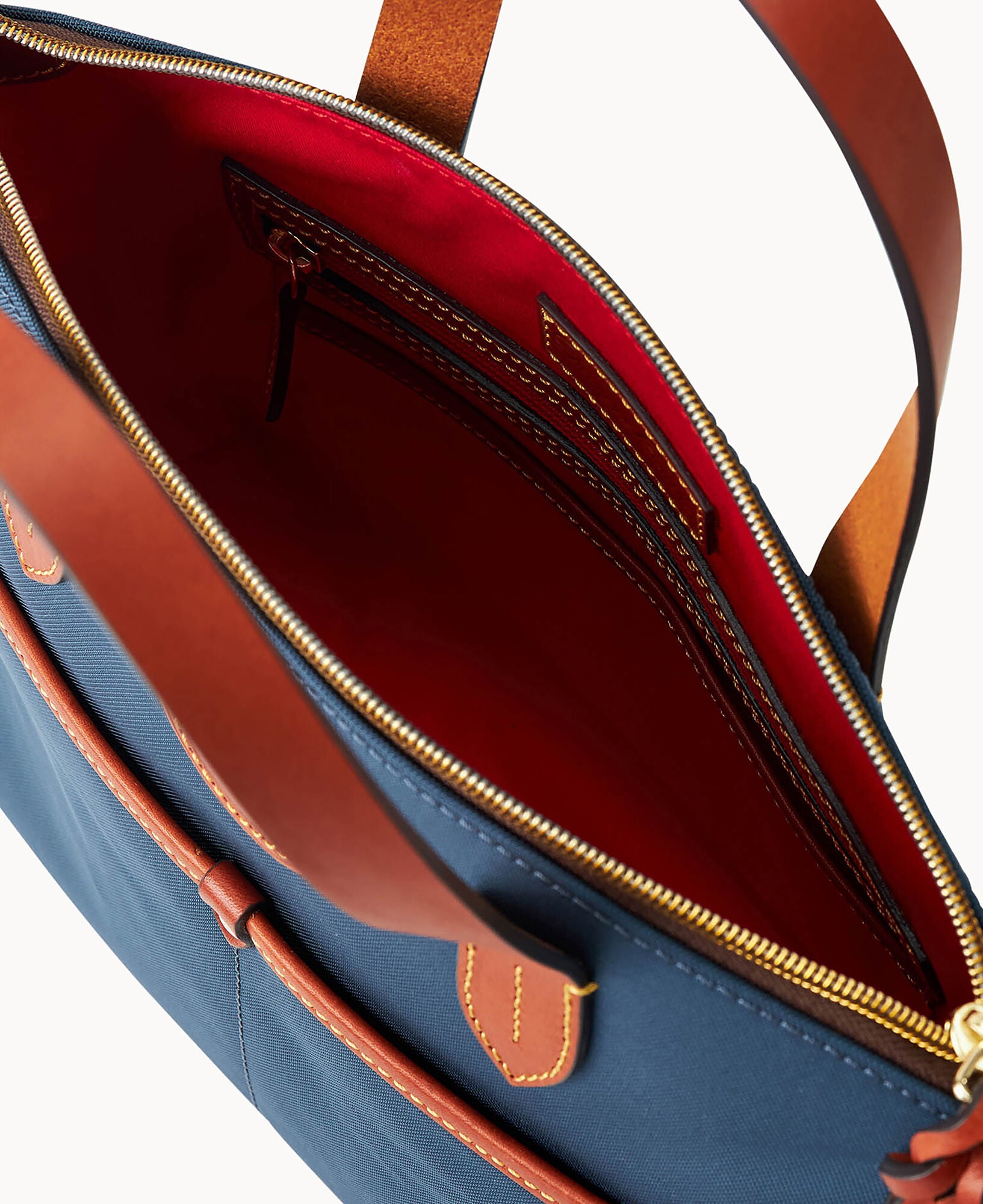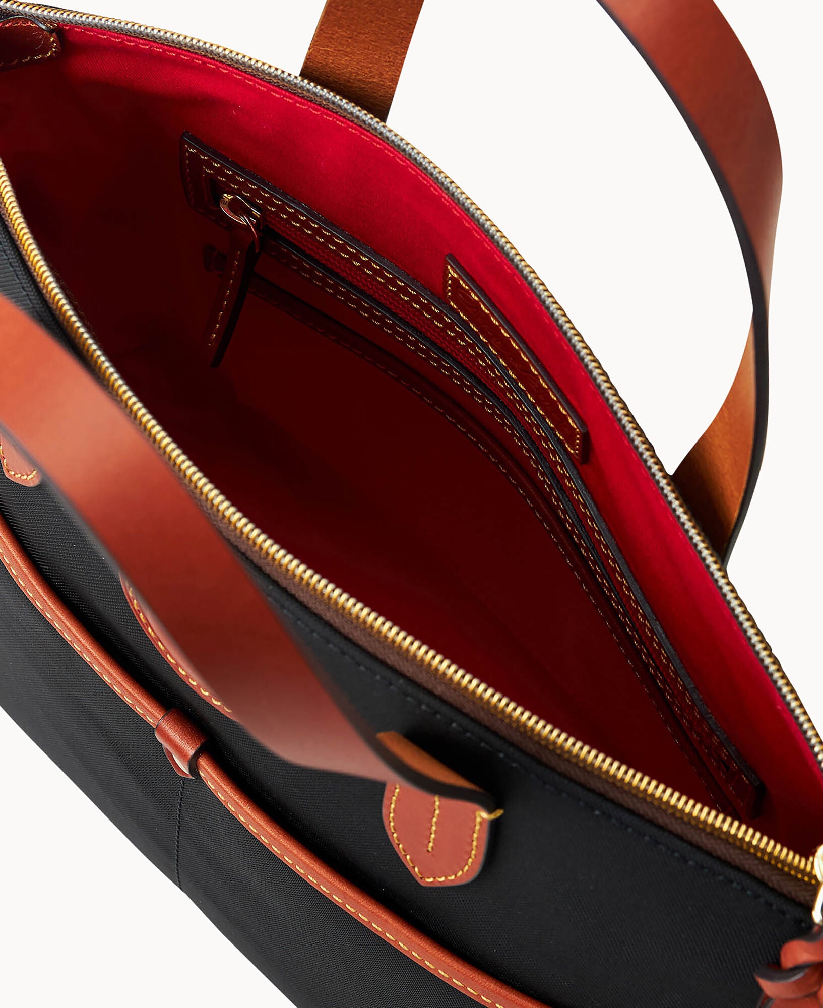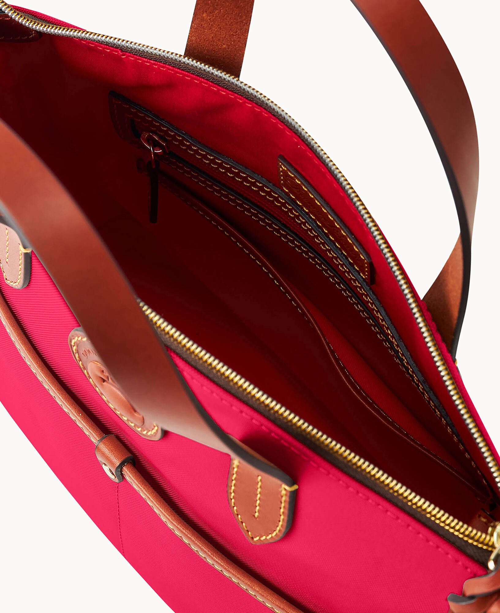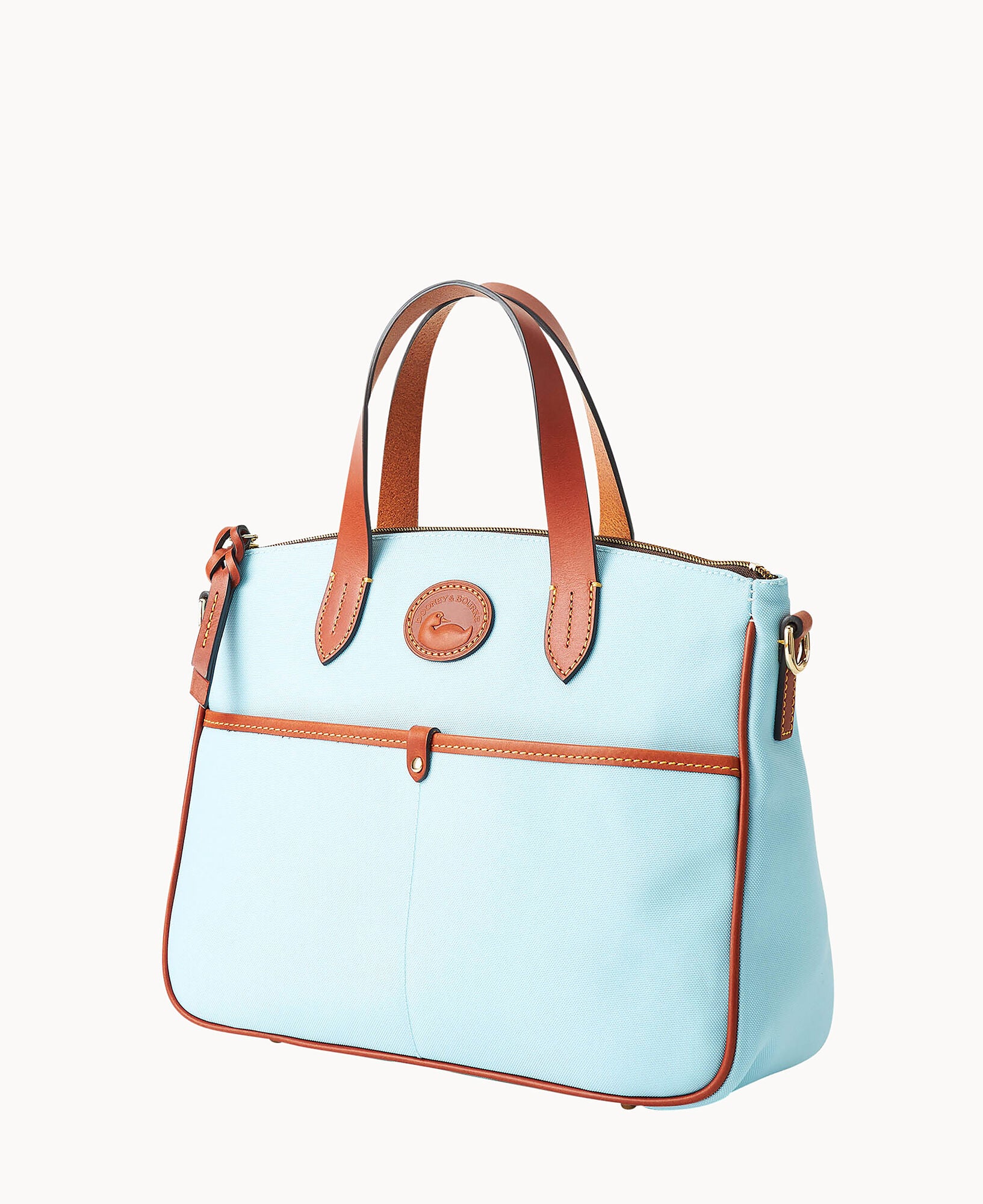 Two outside pockets. One inside zip pocket. Two inside pockets. Cell phone pocket. Inside key hook. Handle drop length 4.5″. Adjustable, detachable shoulder strap. Strap drop length 26″. Lined. Feet. Zipper closure.