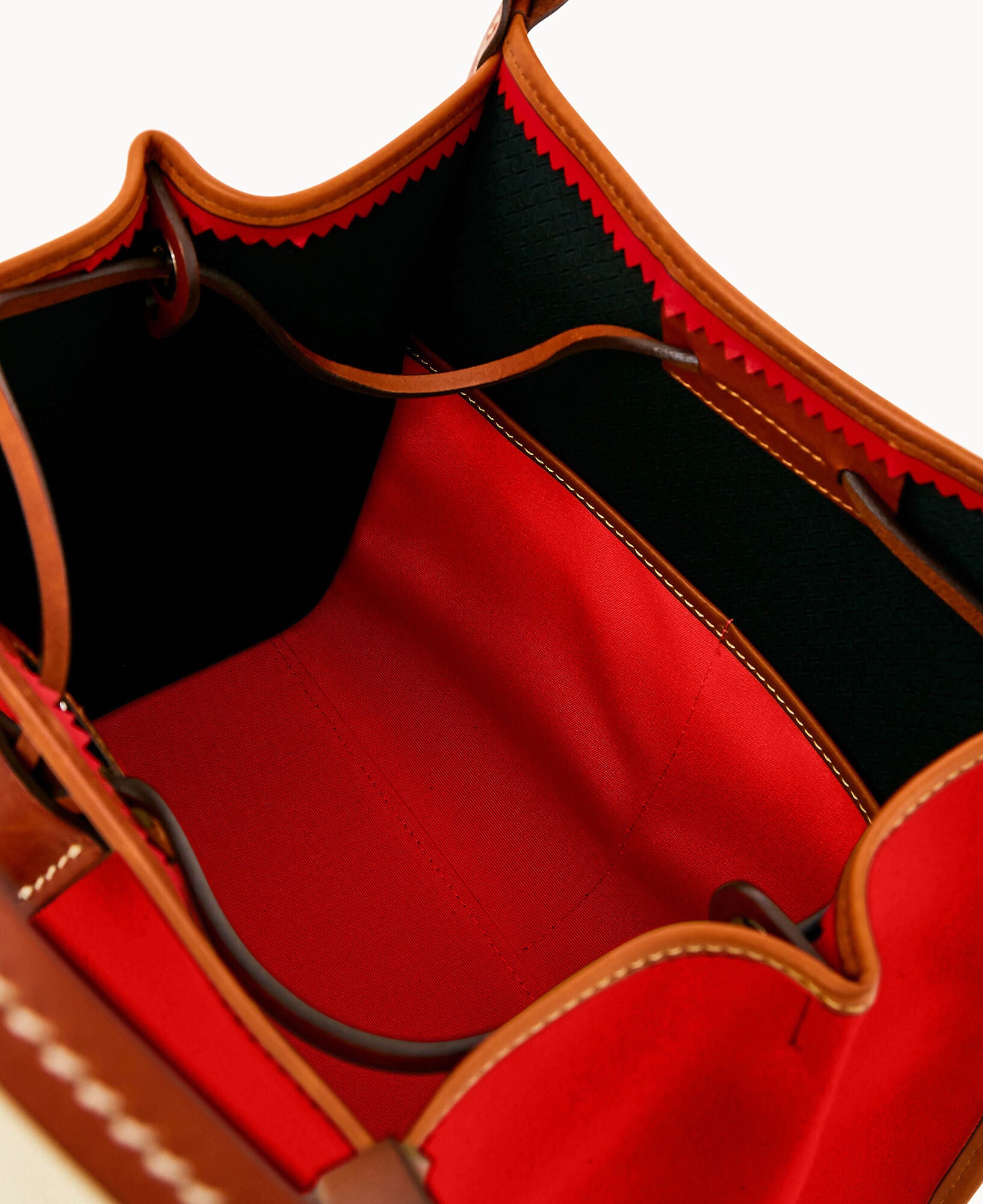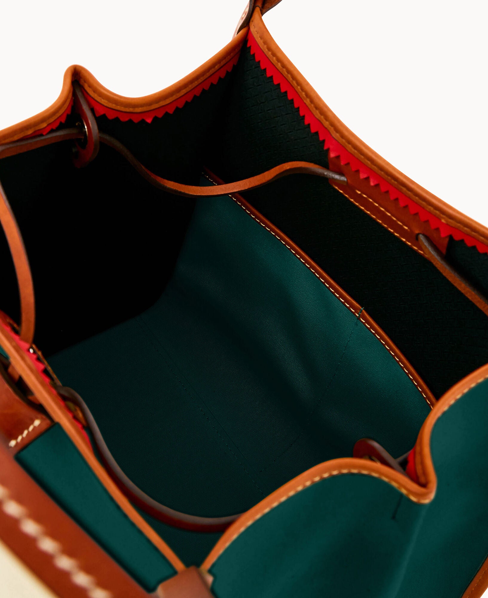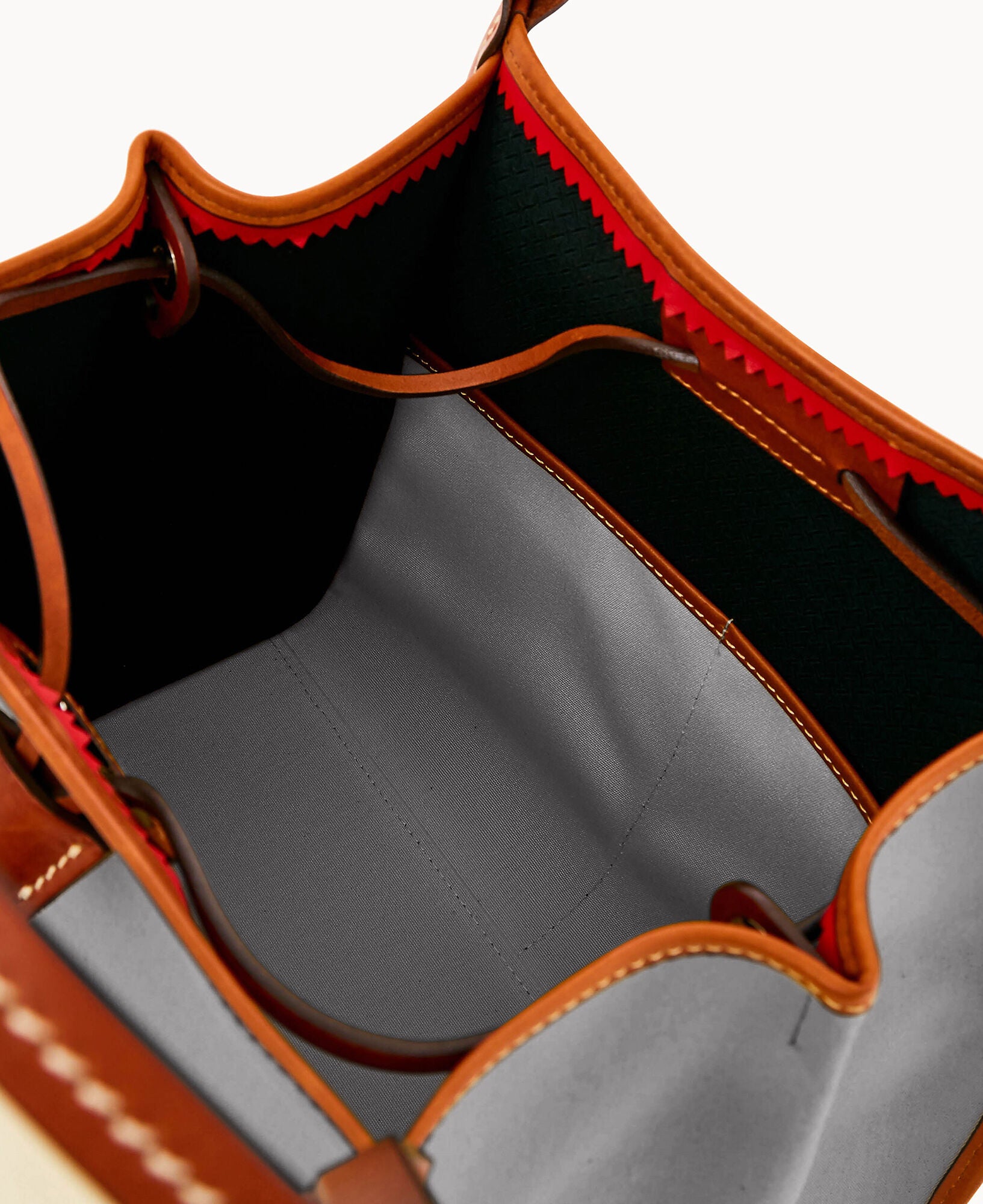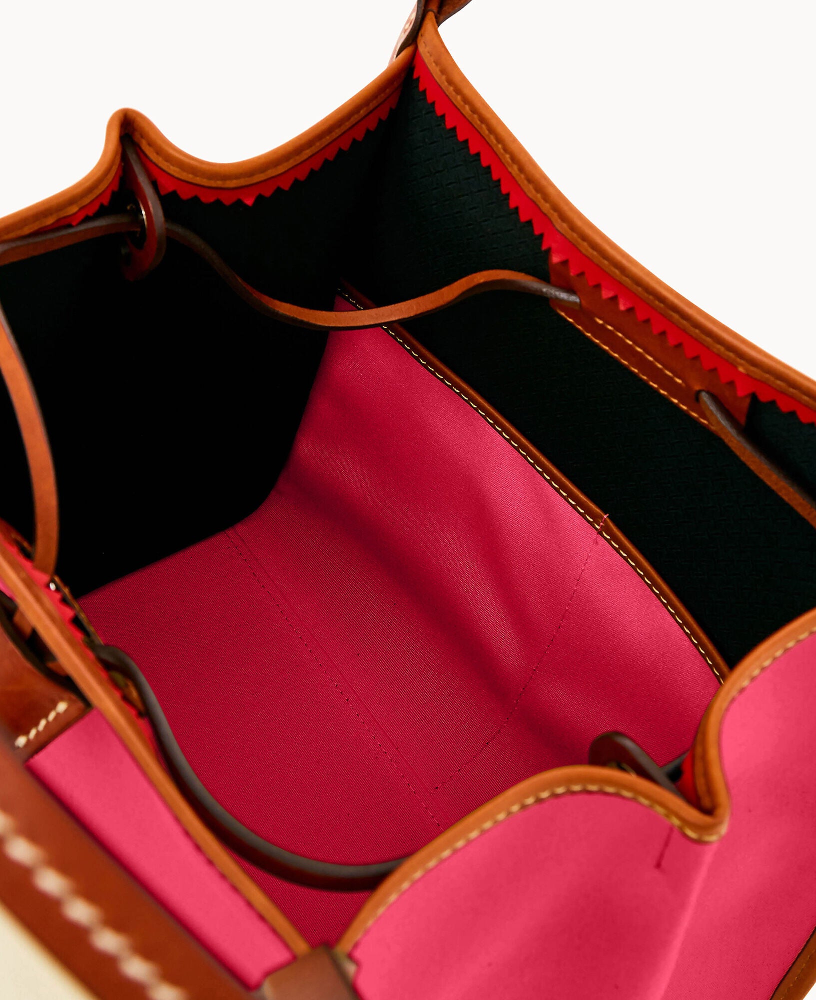 Inside key hook. Strap drop length 11″. Drawstring closure.