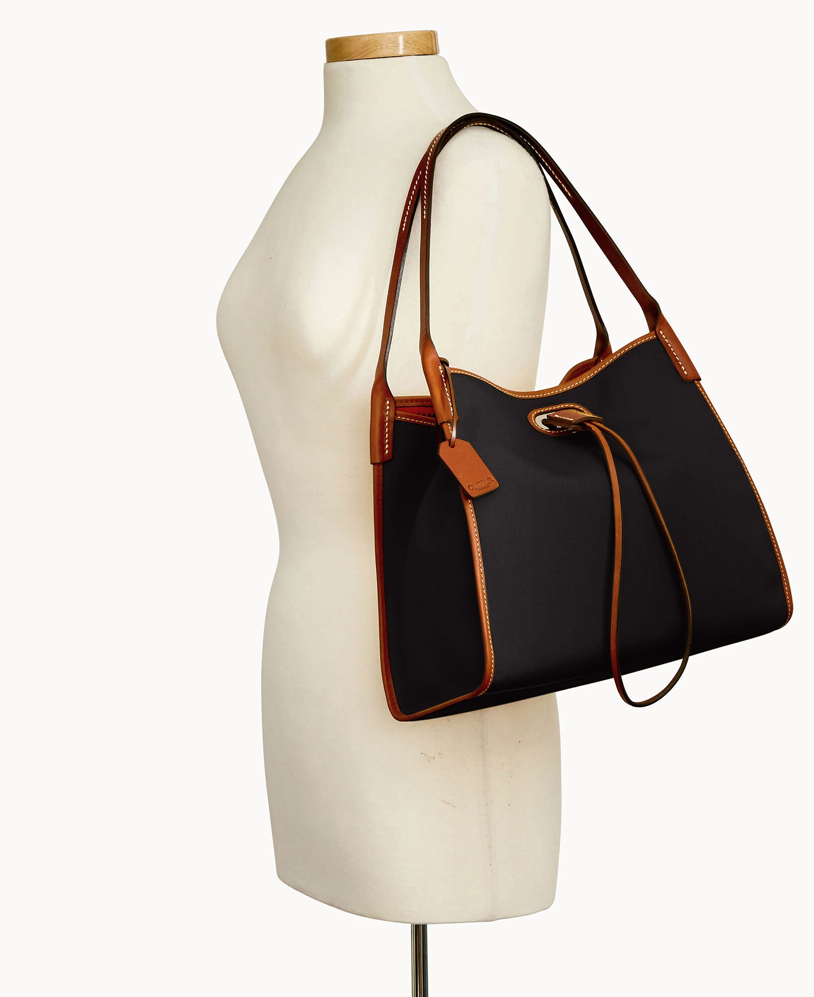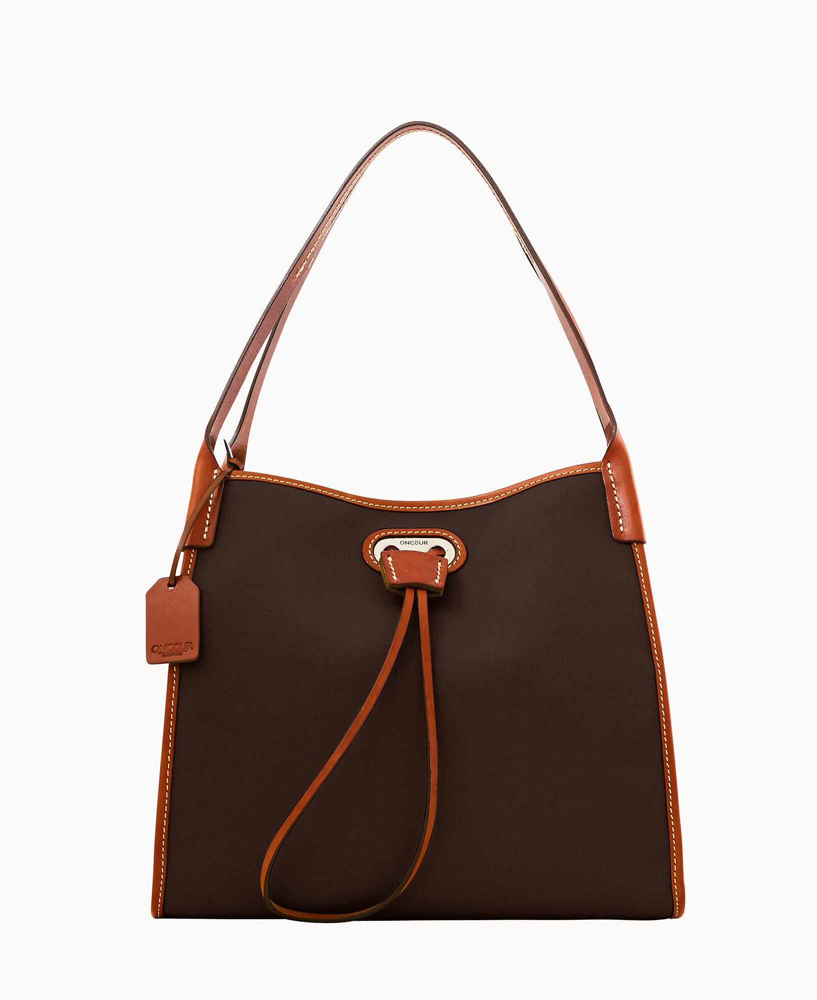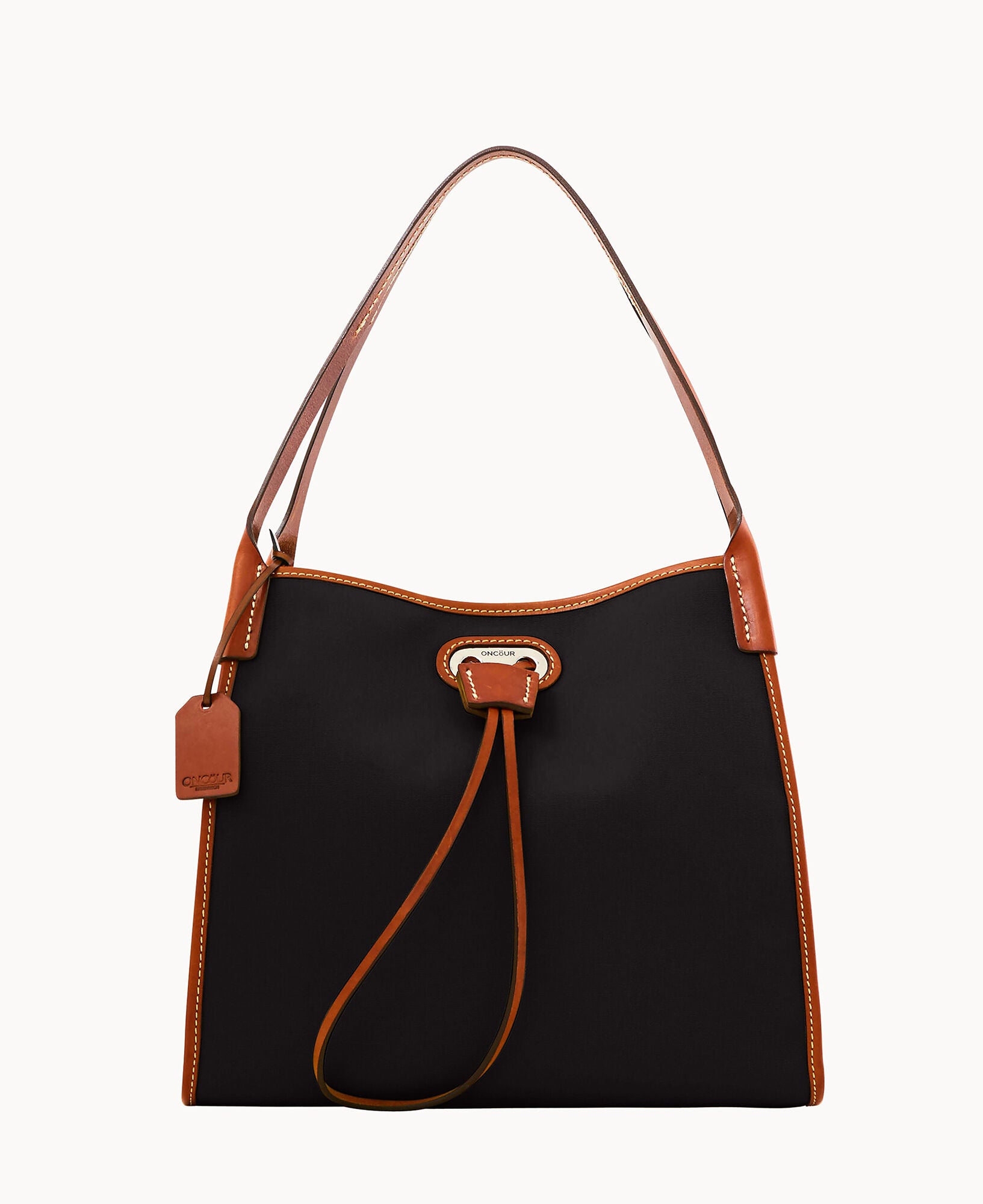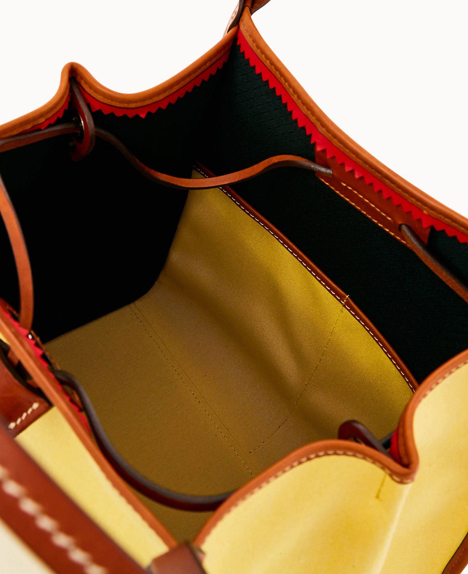 Inside key hook. Strap drop length 11″. Drawstring closure.