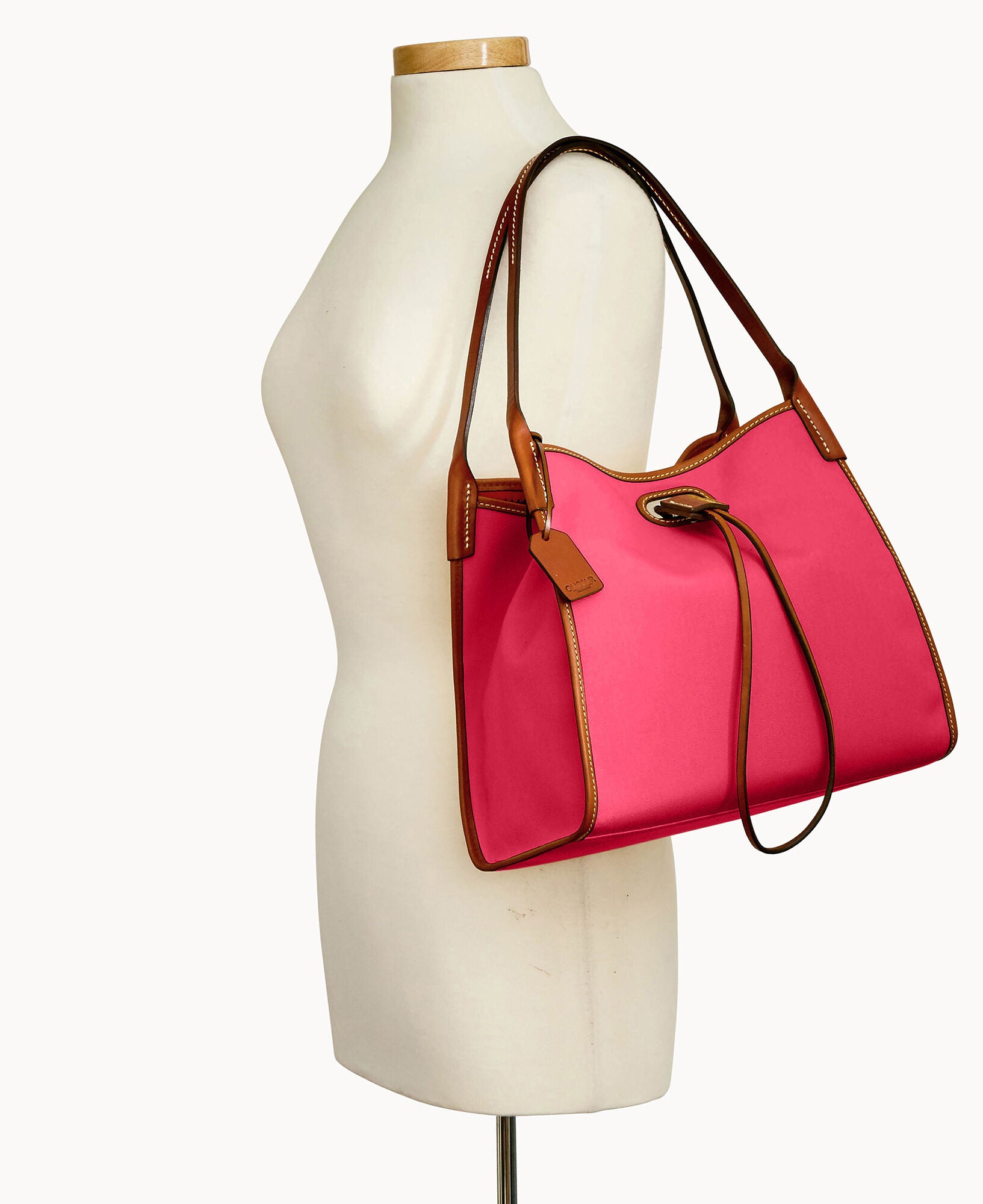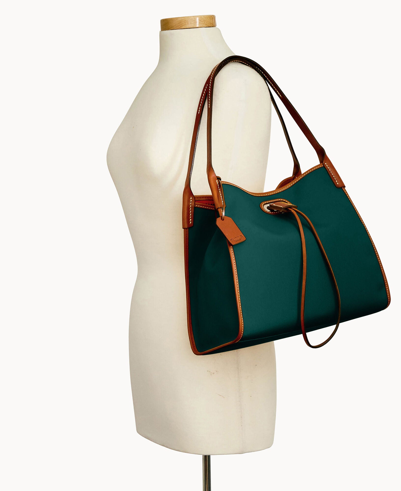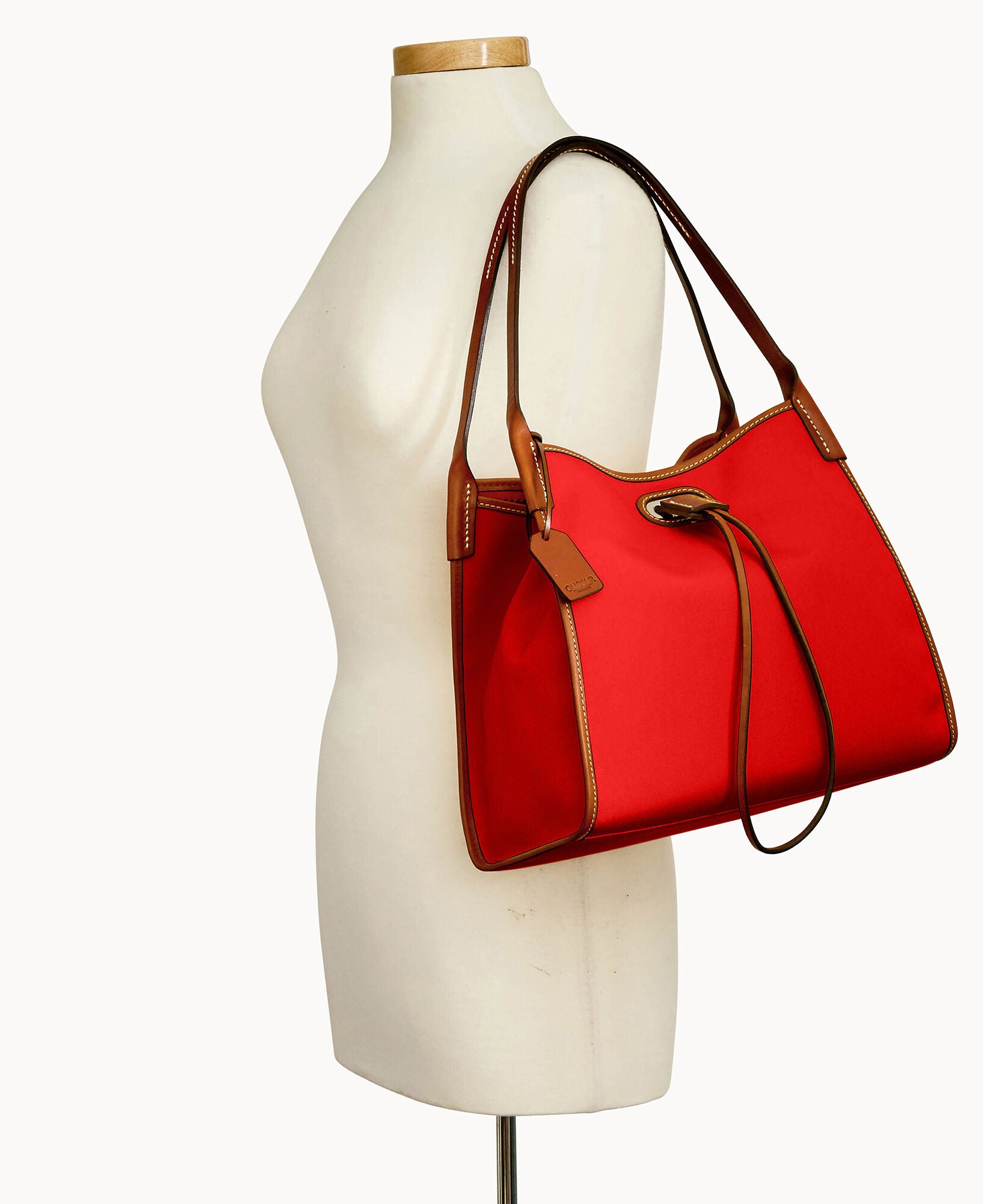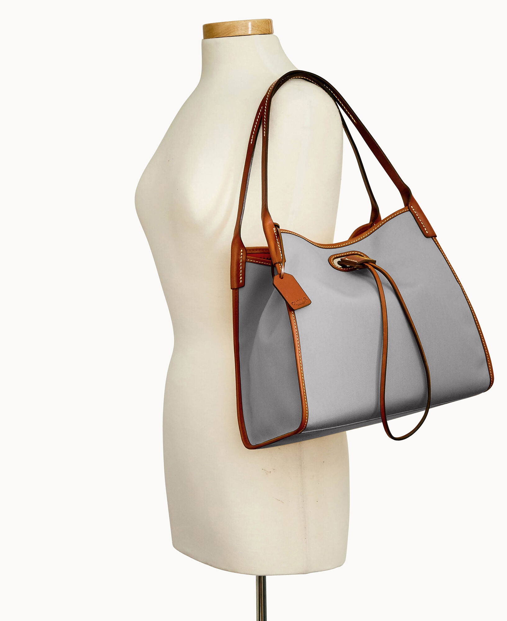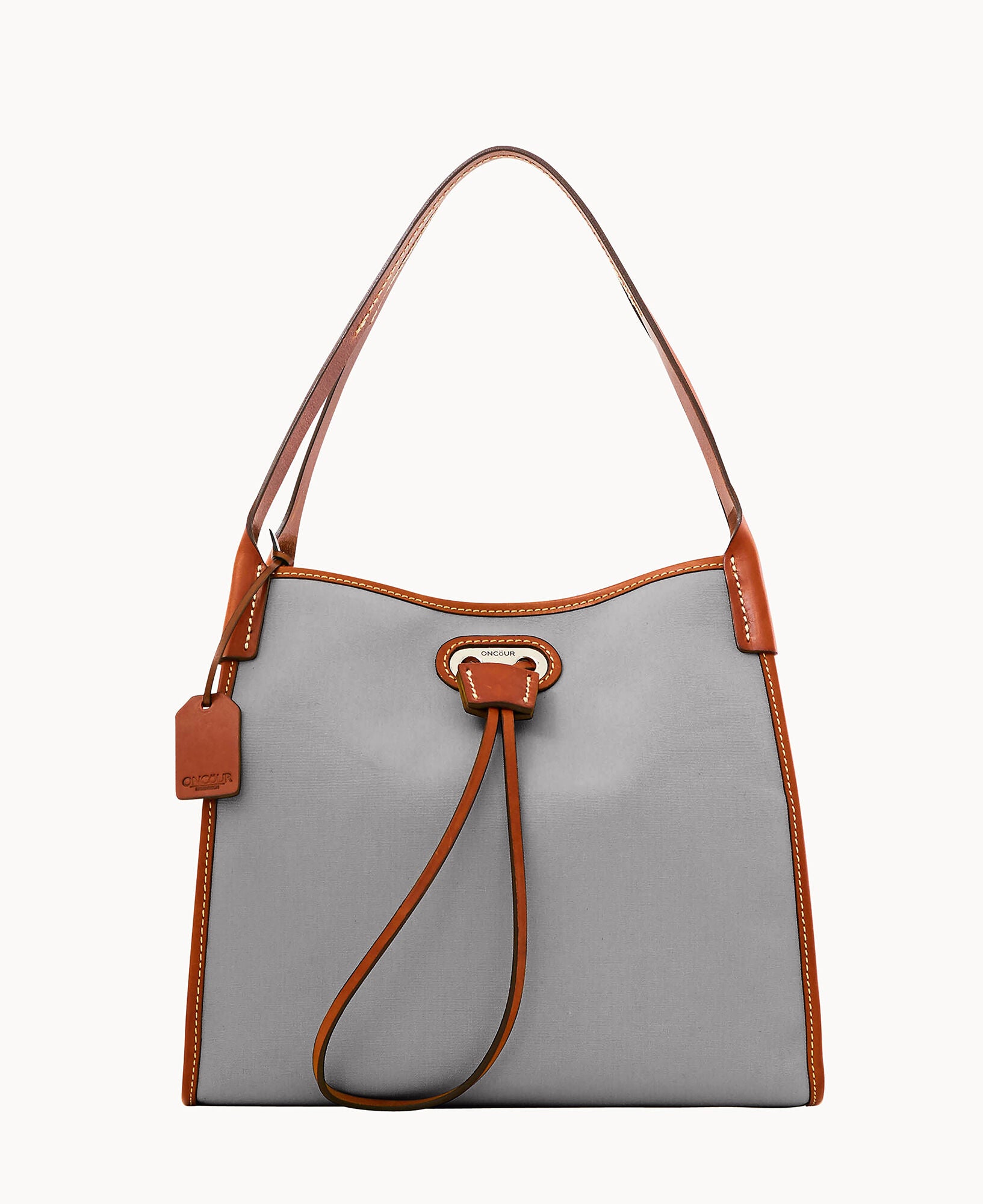Inside key hook. Strap drop length 11″. Drawstring closure.