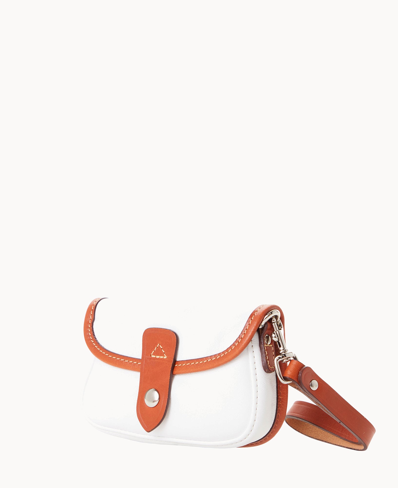 One outside pocket. Inside key hook. Detachable wrist strap. Lined. Snap closure.