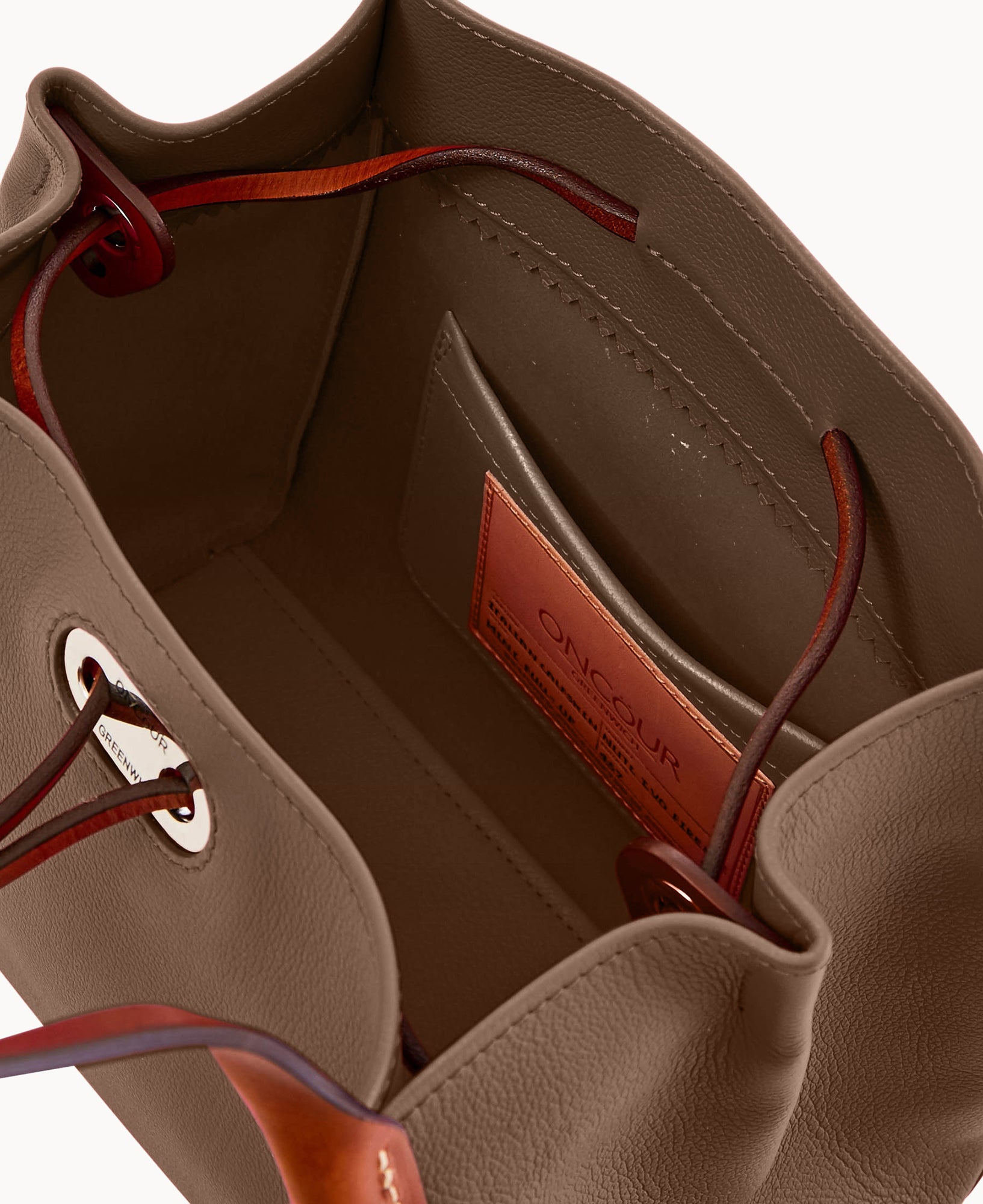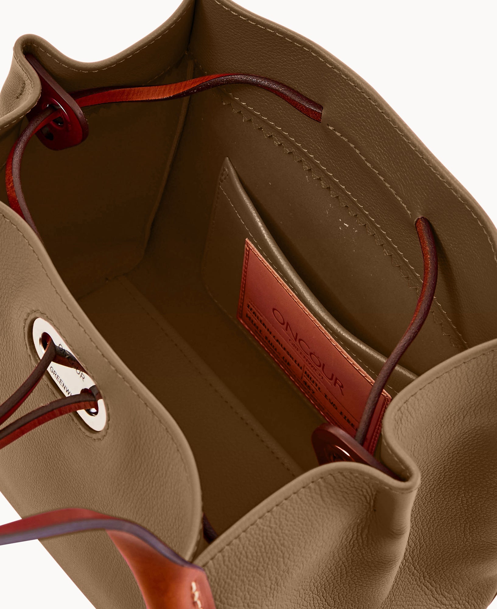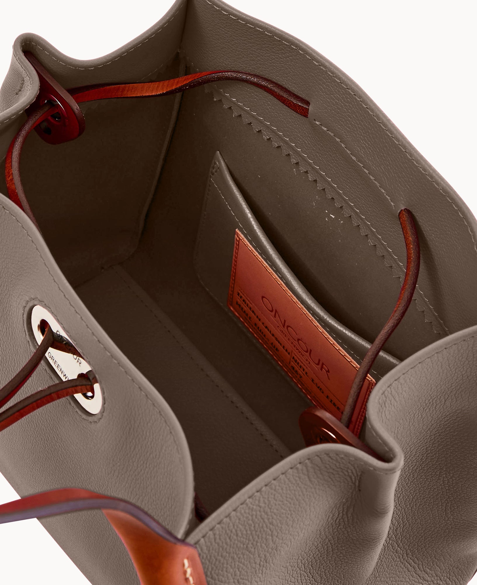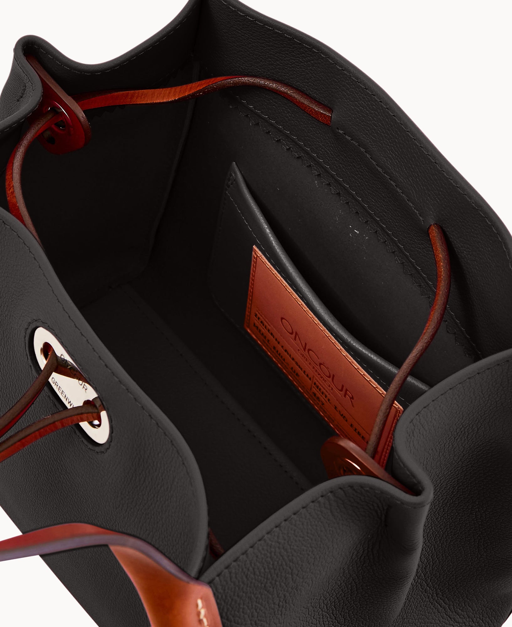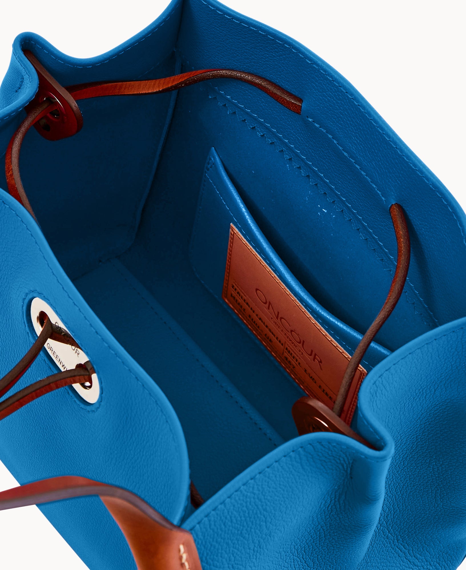 Two inside pockets. Inside key hook. Strap drop length 5″. Drawstring closure.