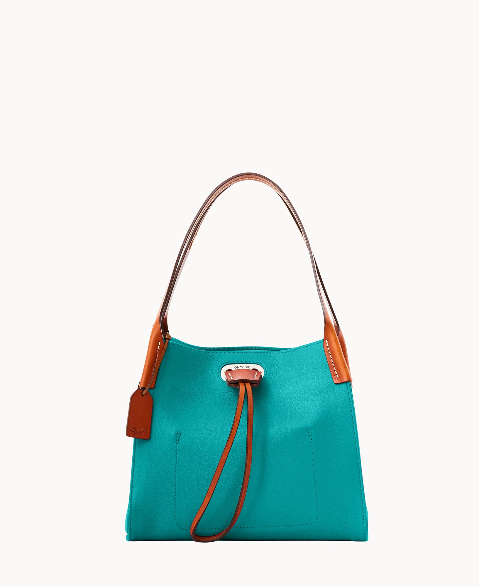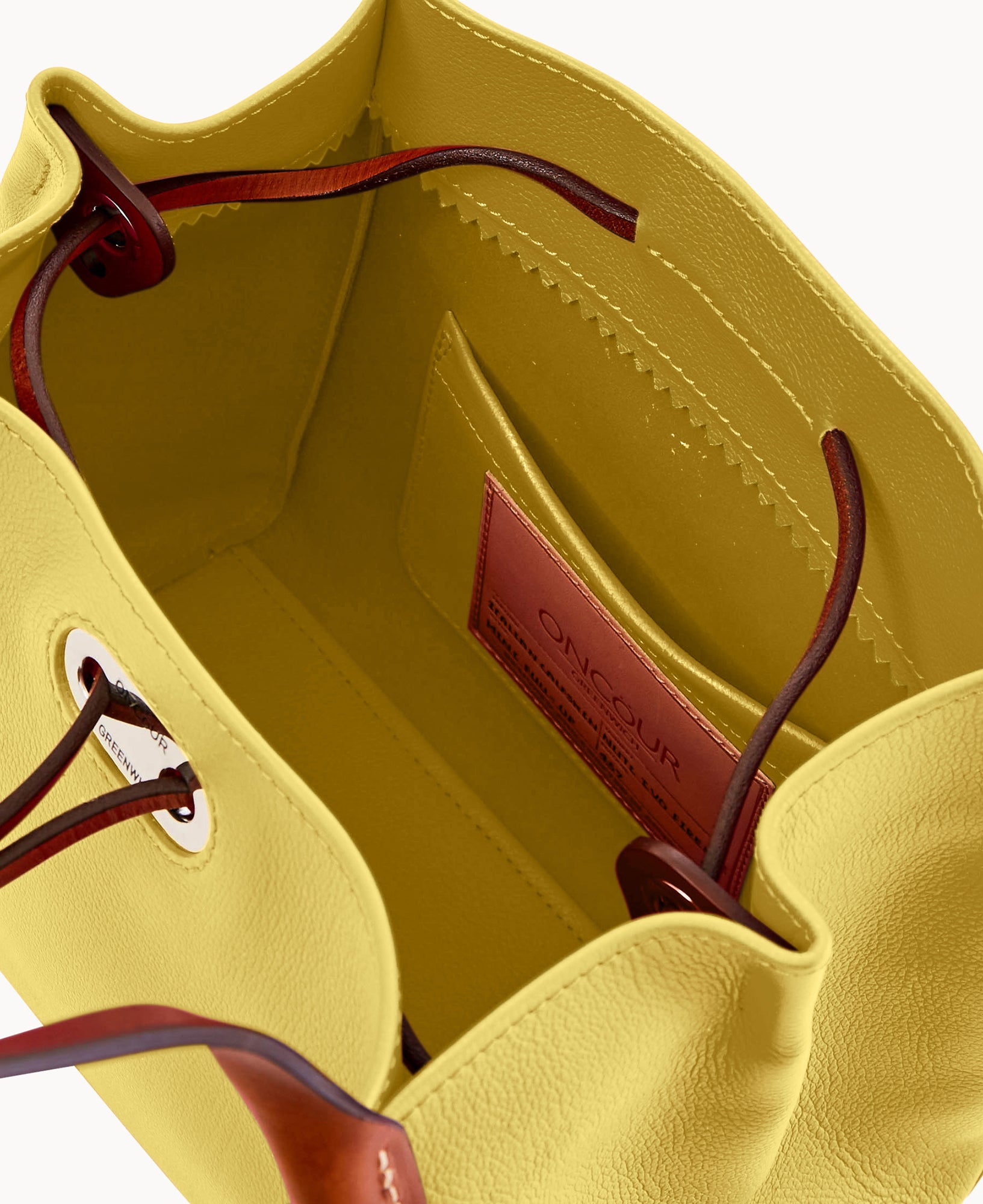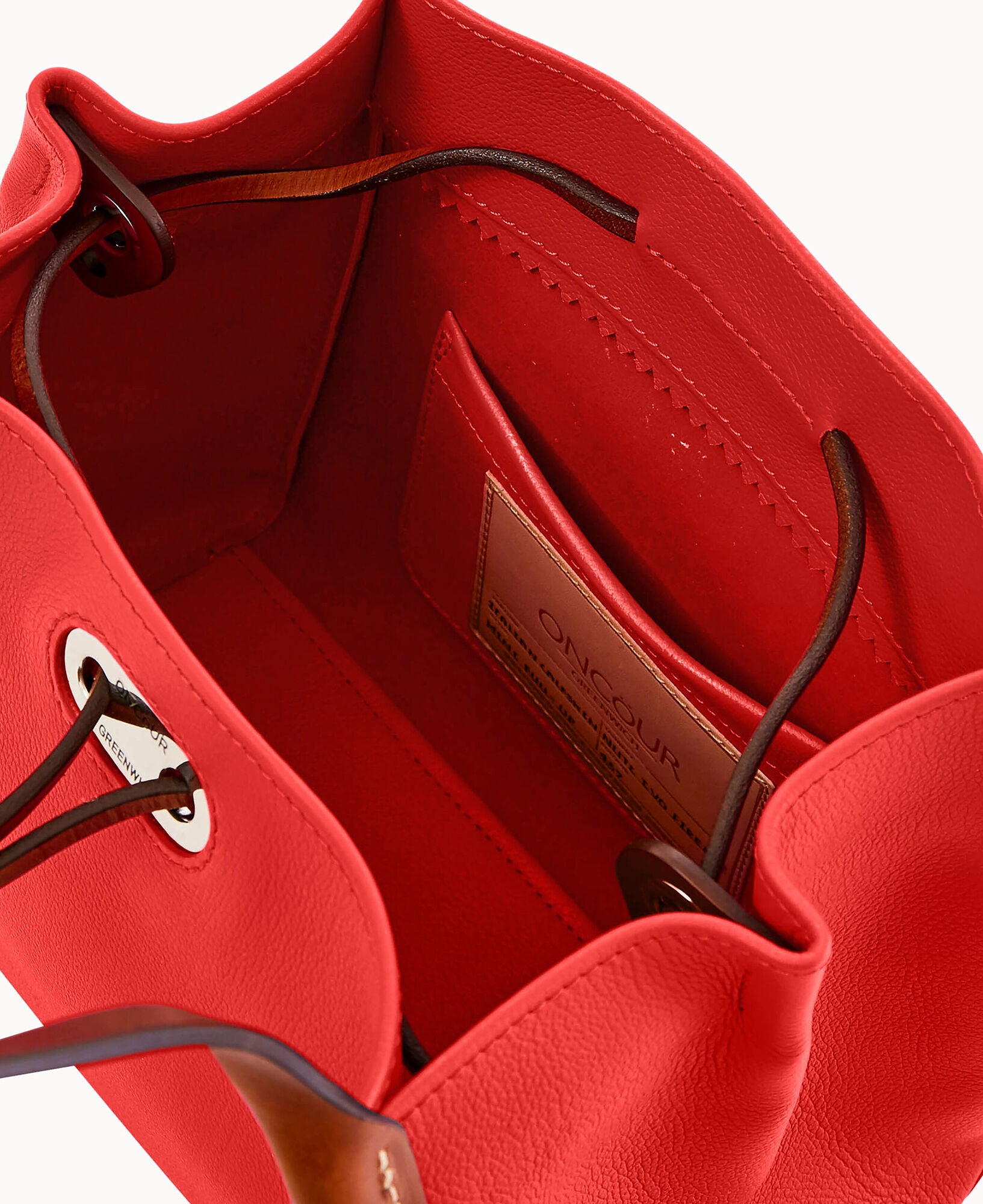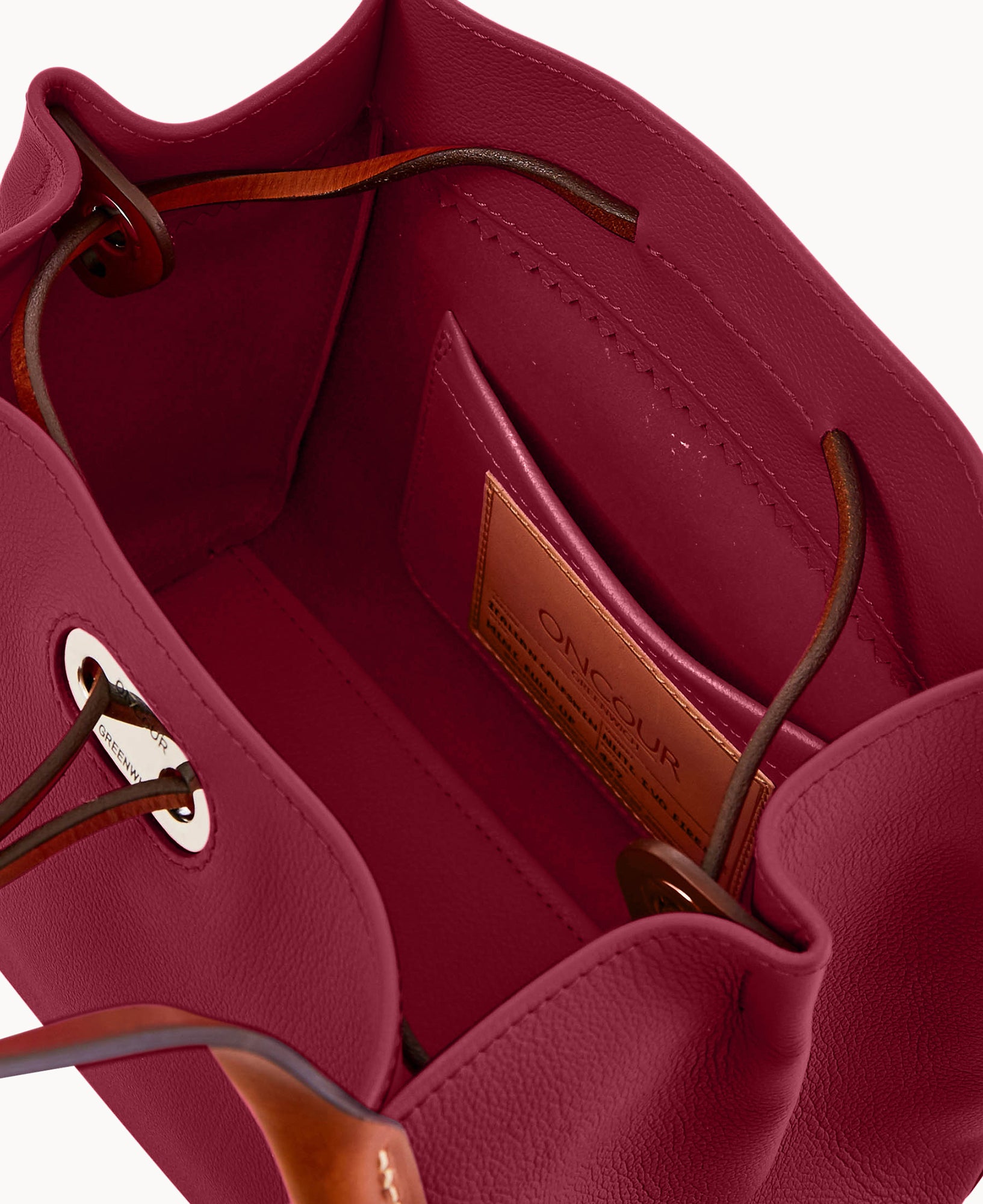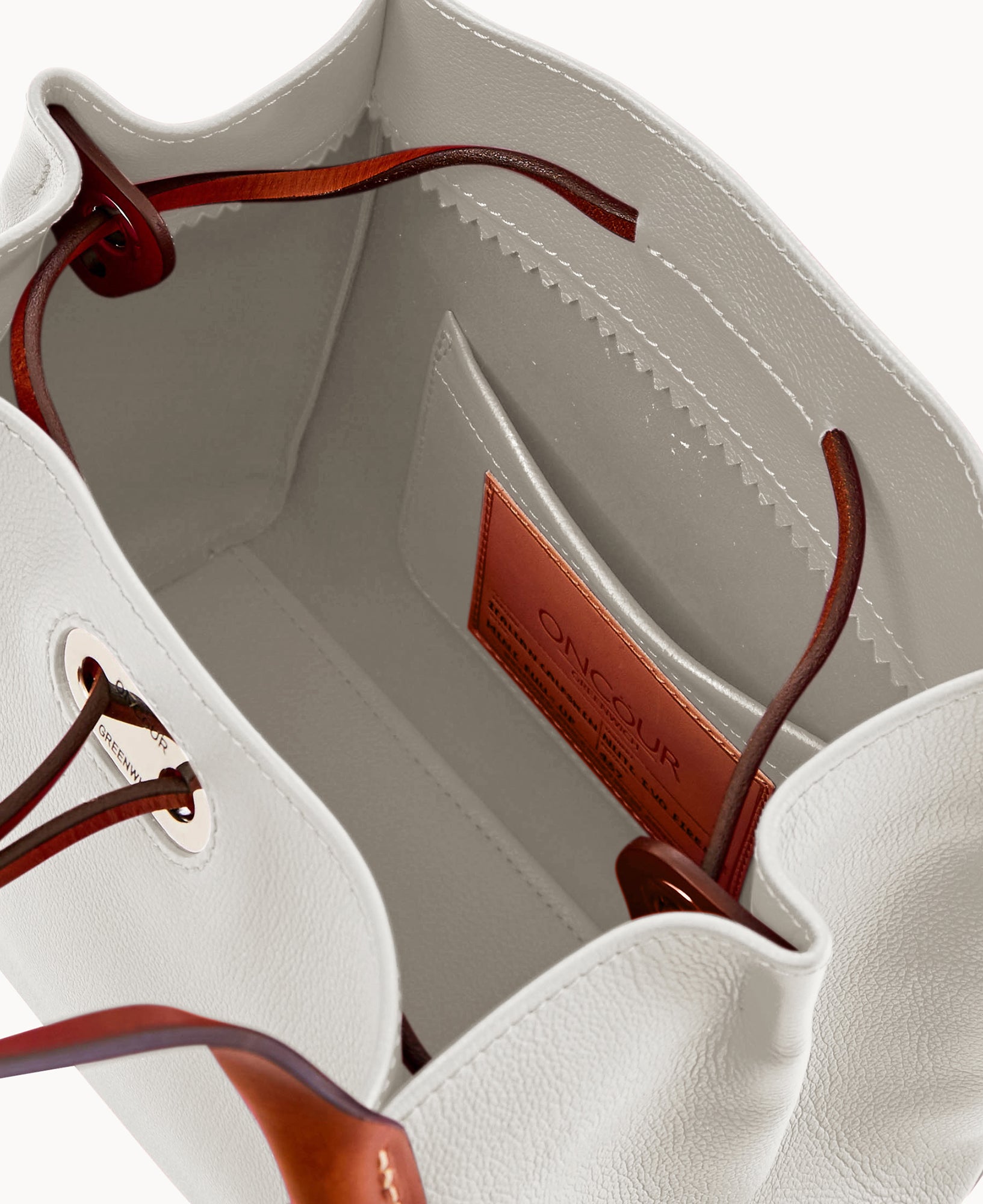 Two inside pockets. Inside key hook. Strap drop length 5″. Drawstring closure.