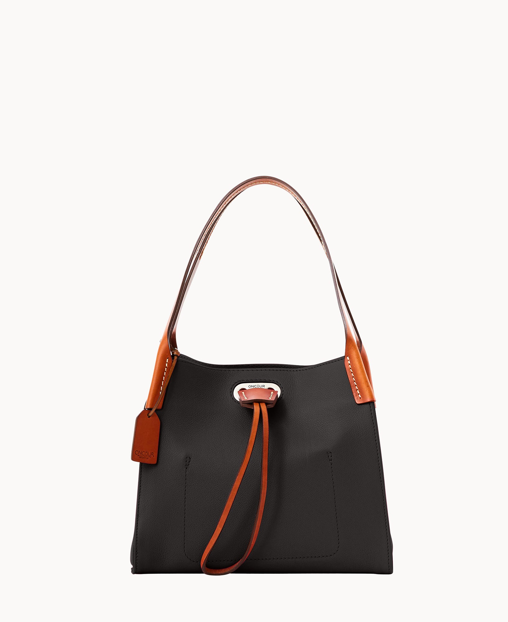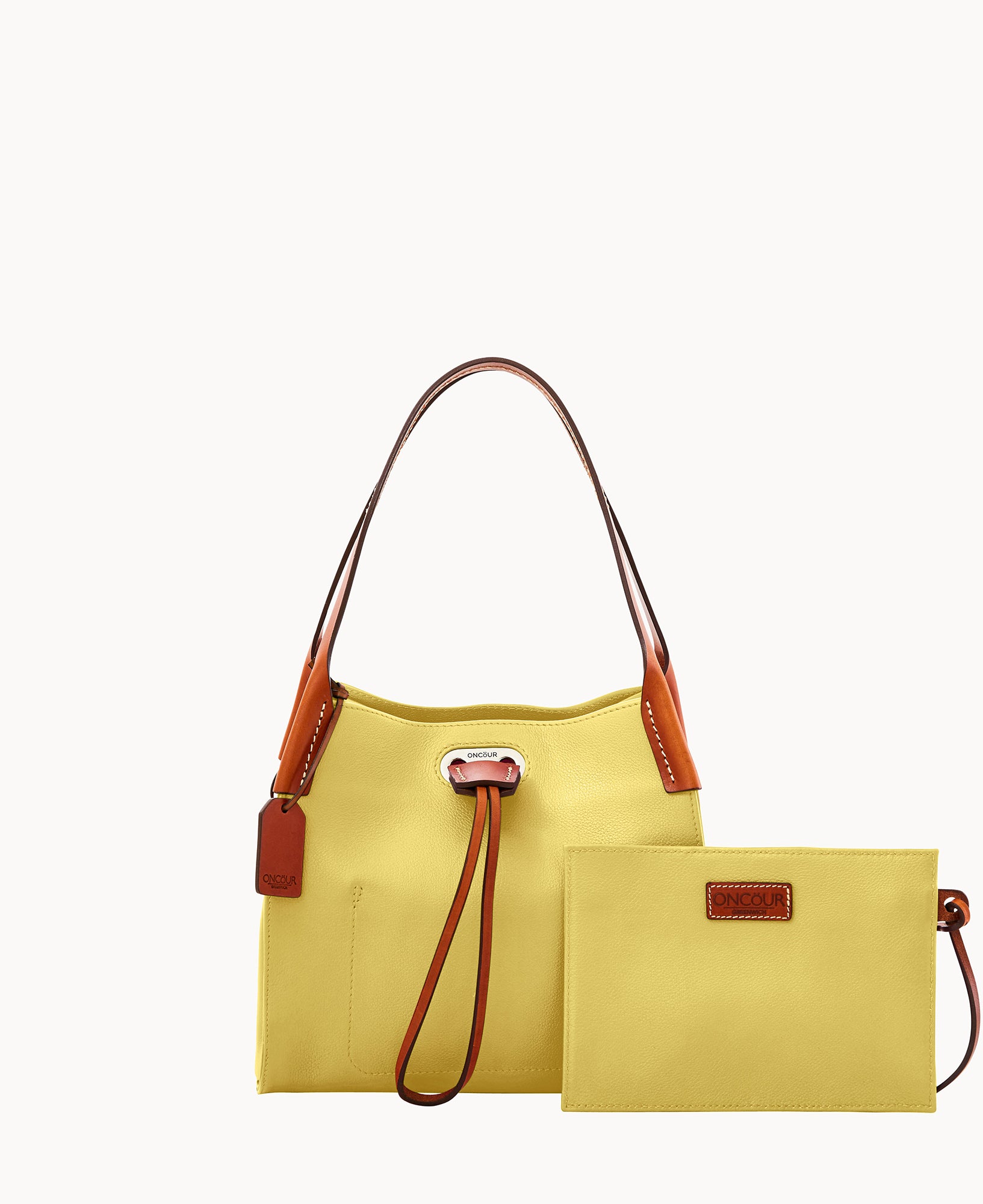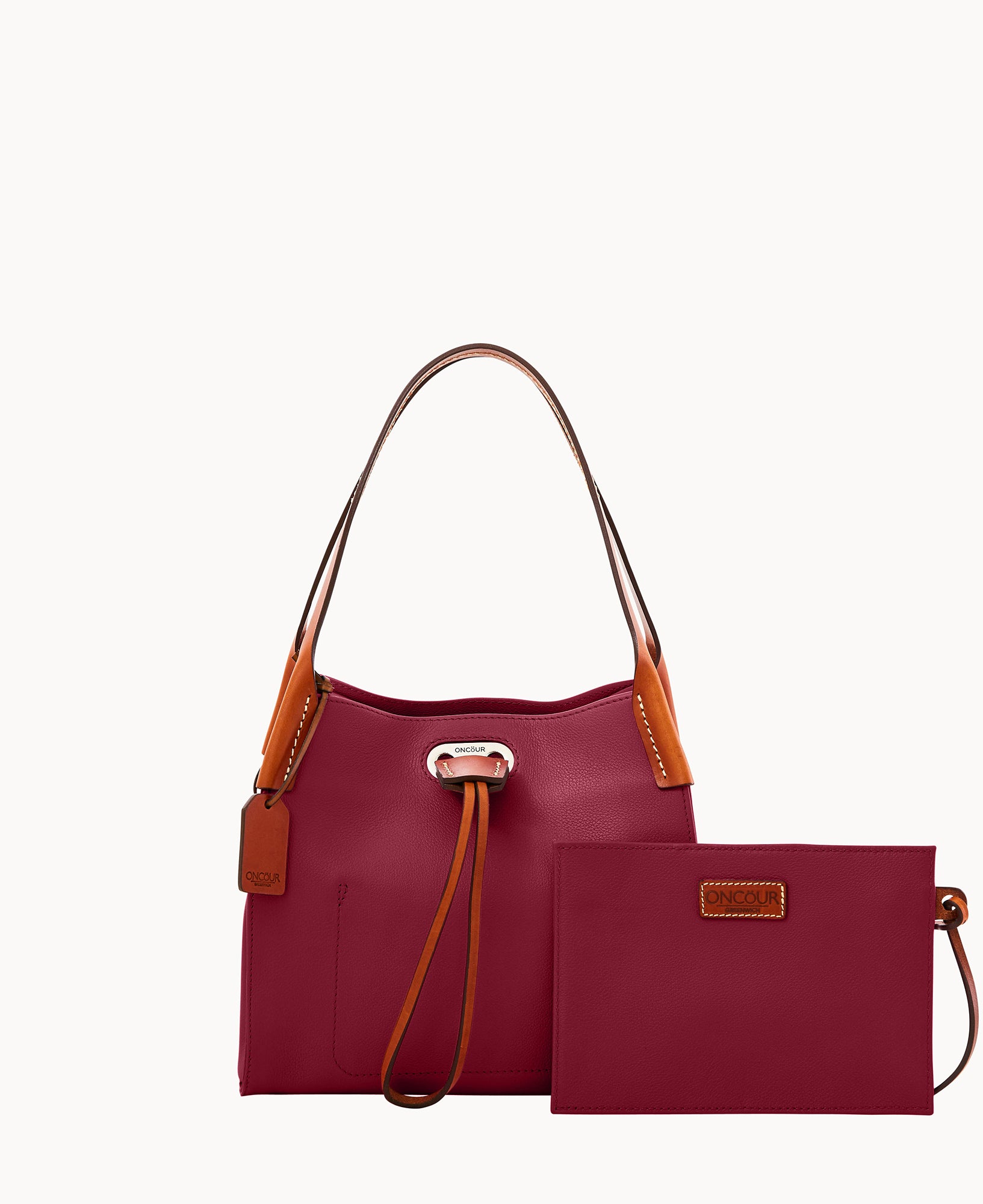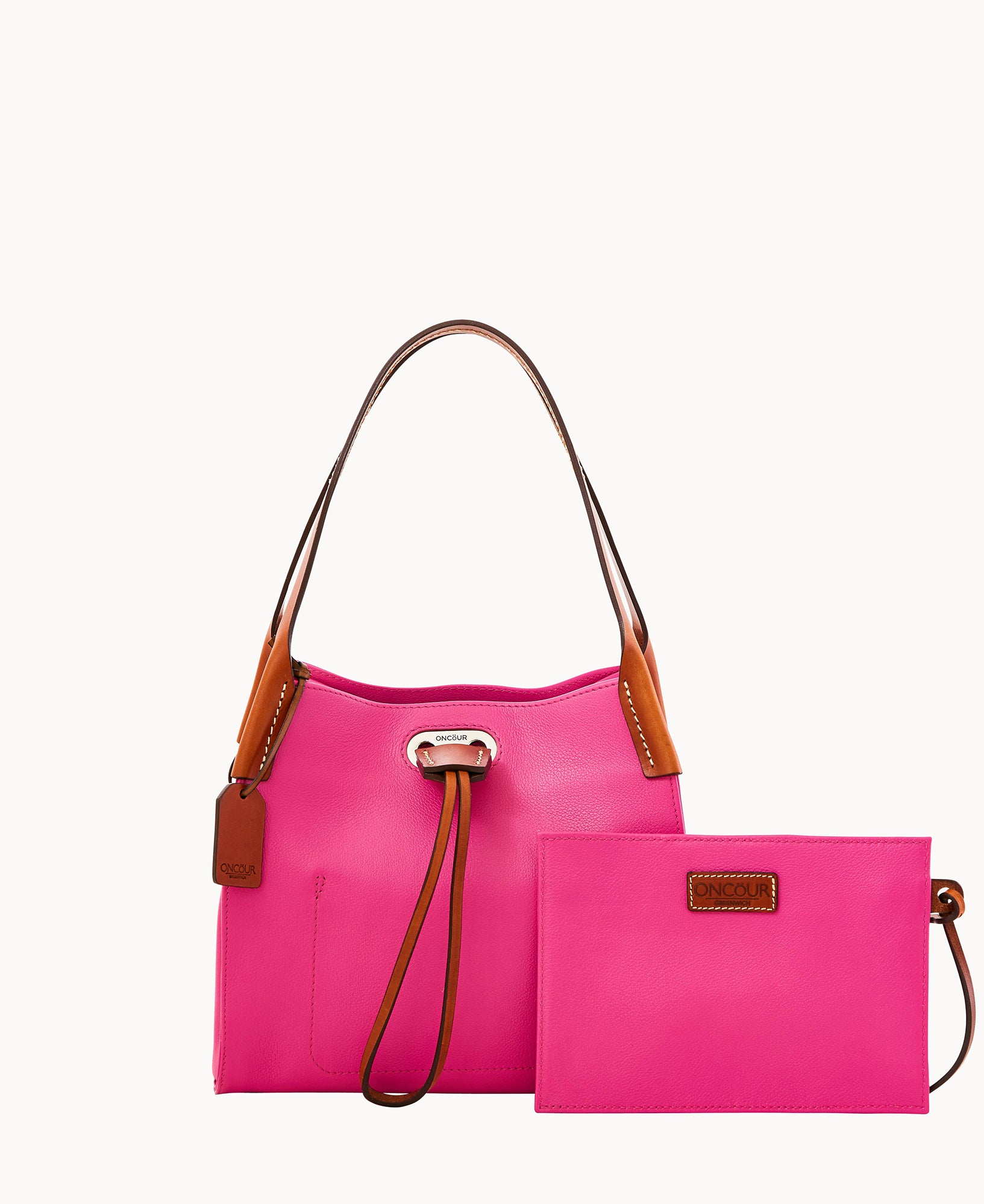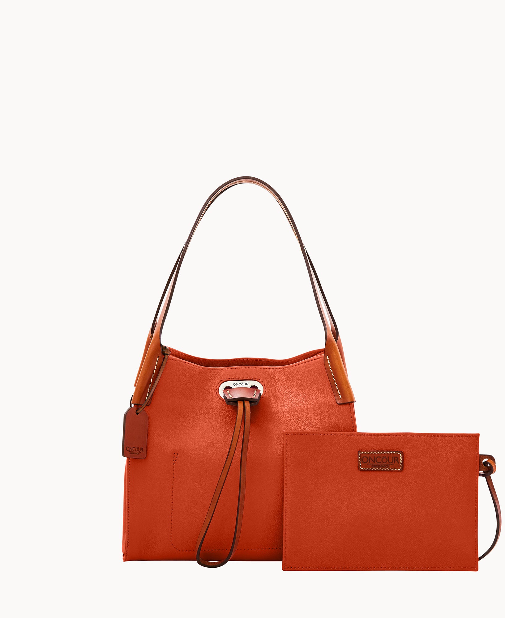 Two inside pockets. Inside key hook. Strap drop length 5″. Drawstring closure.