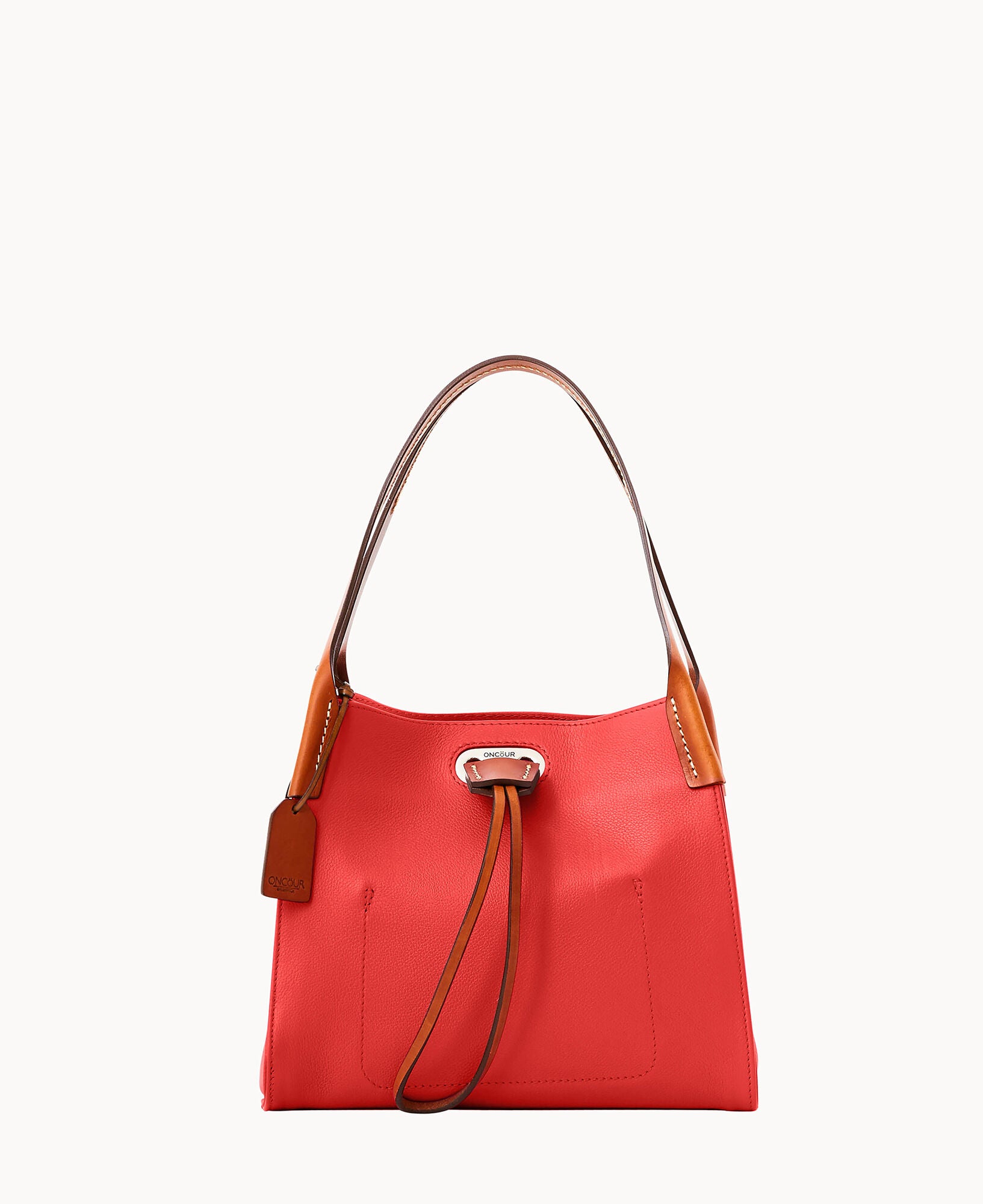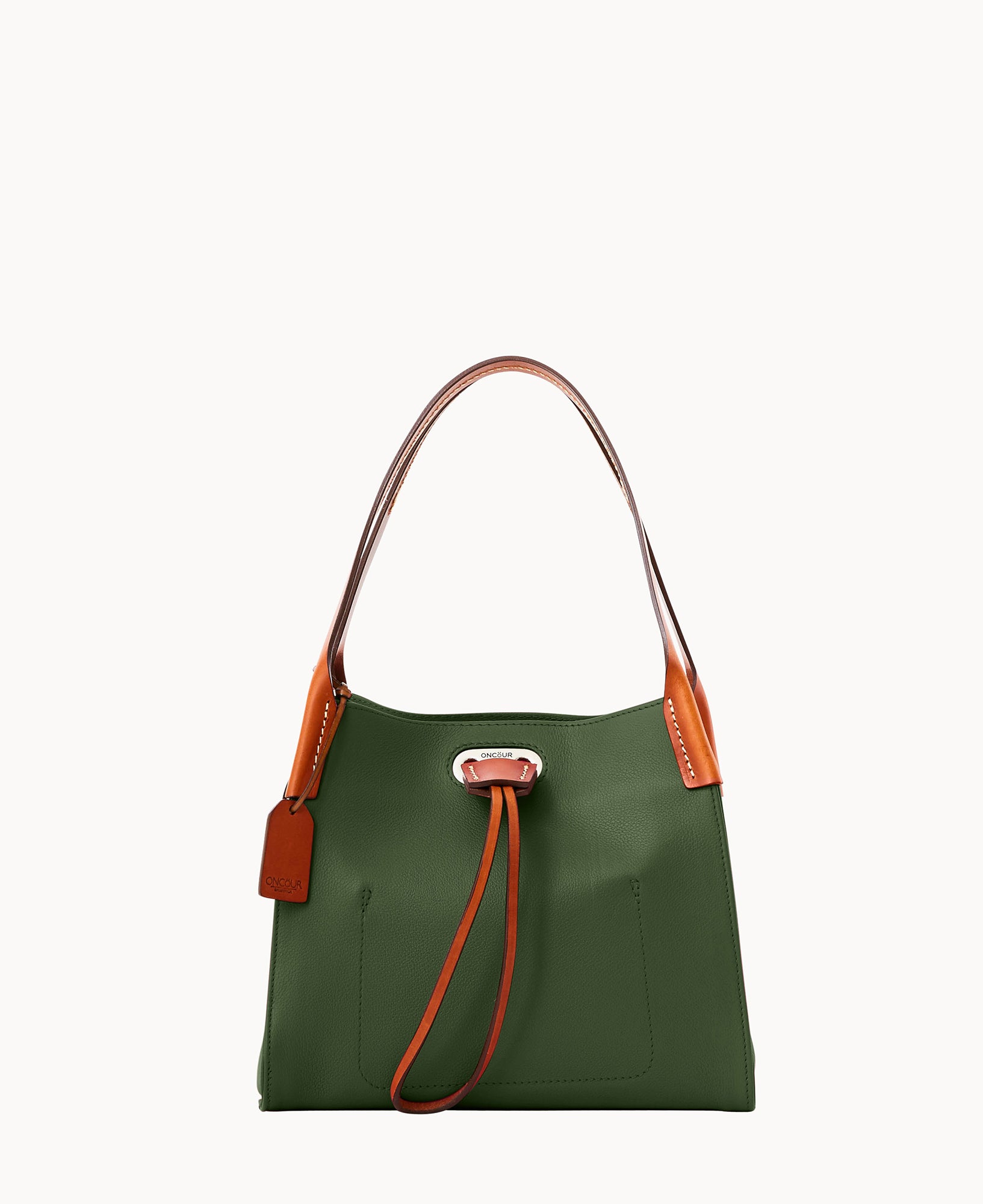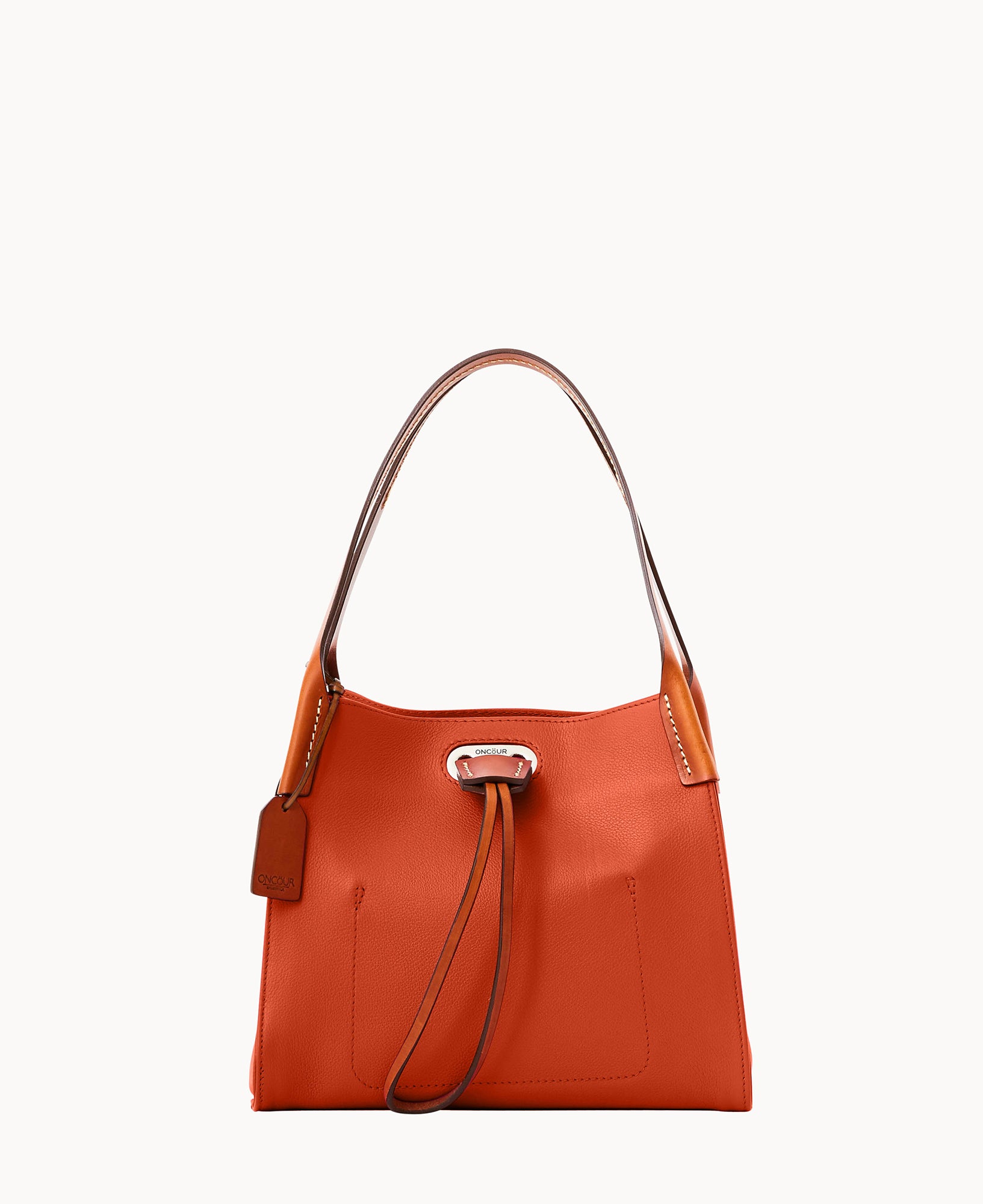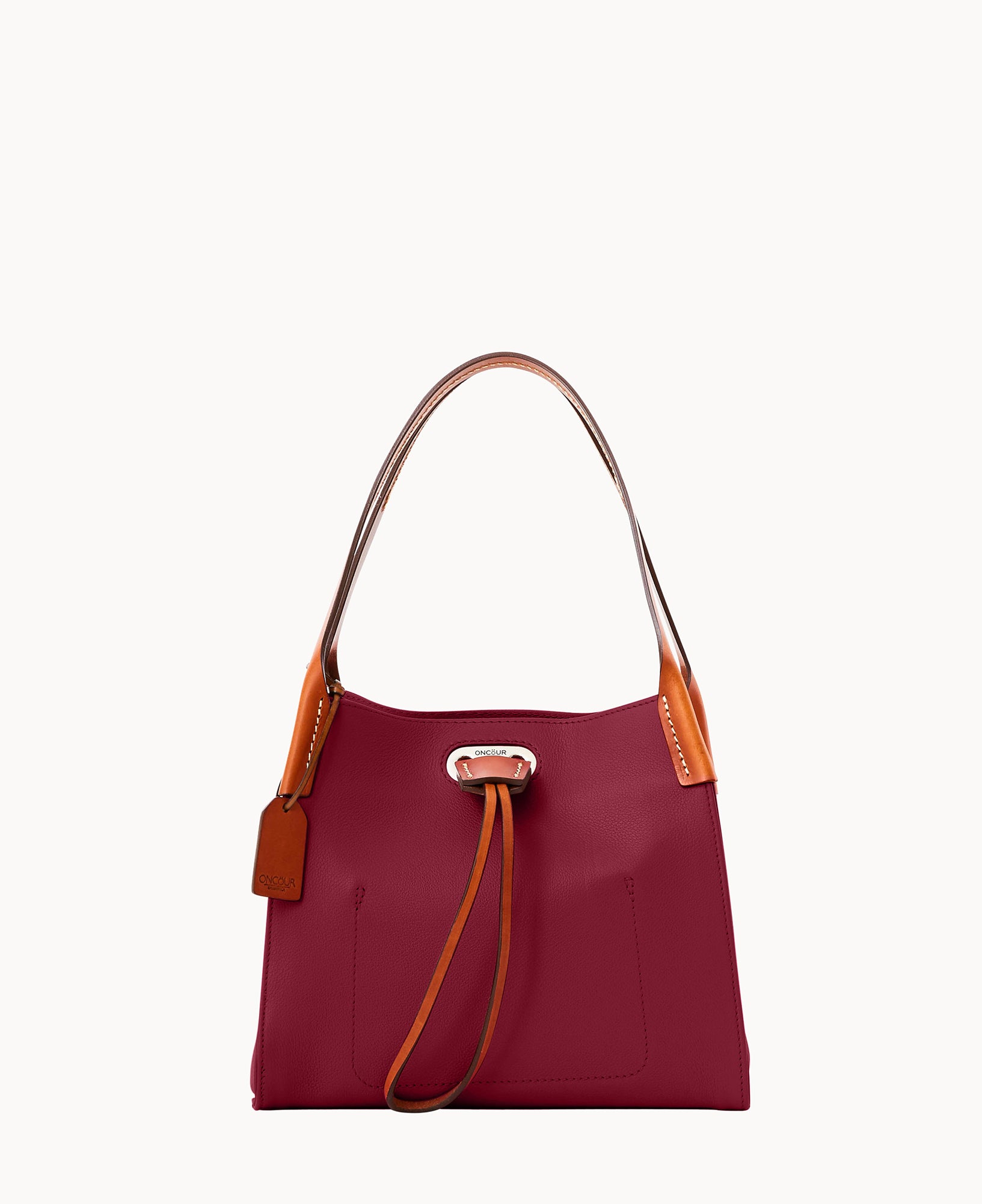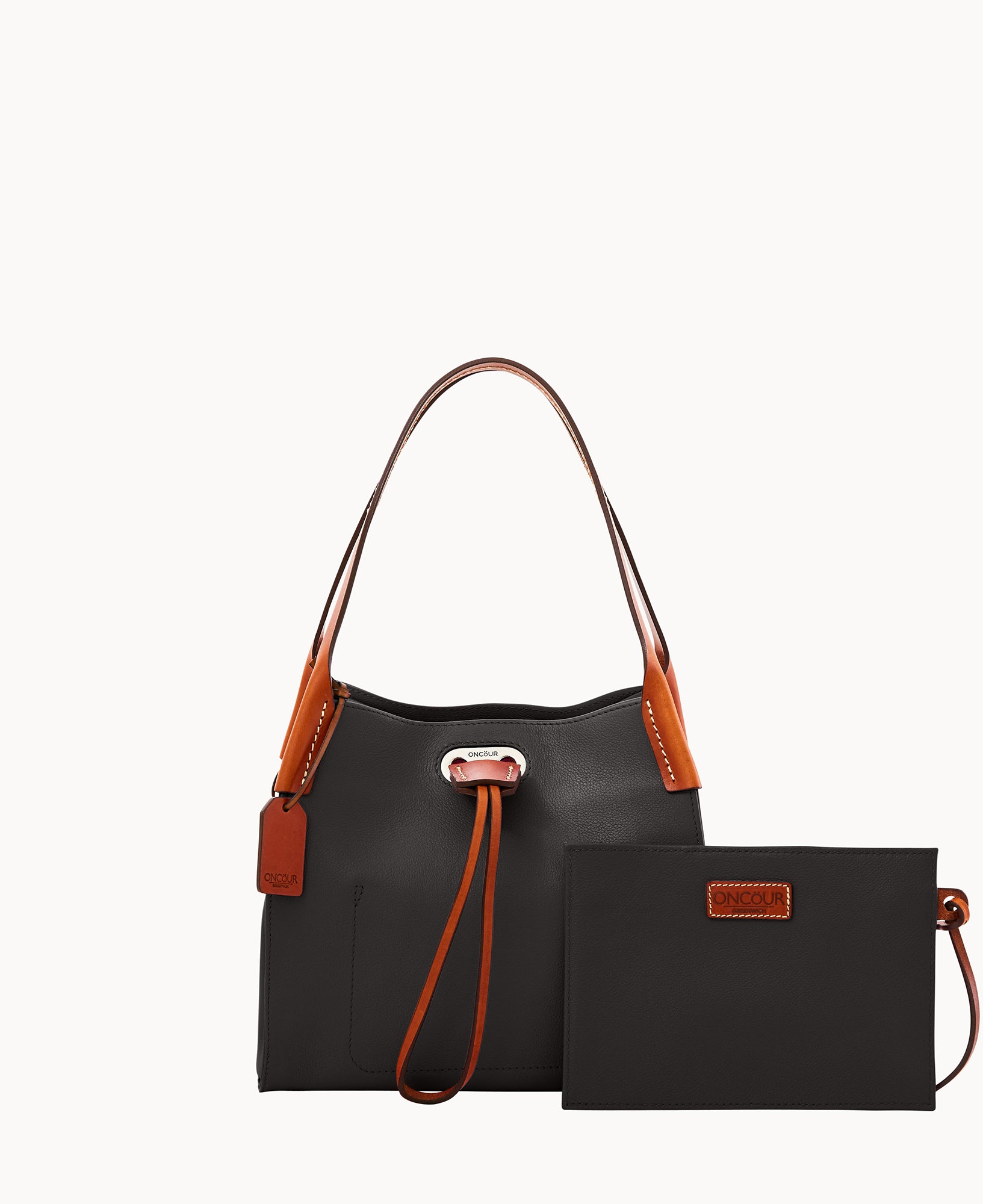 Two inside pockets. Inside key hook. Strap drop length 5″. Drawstring closure.