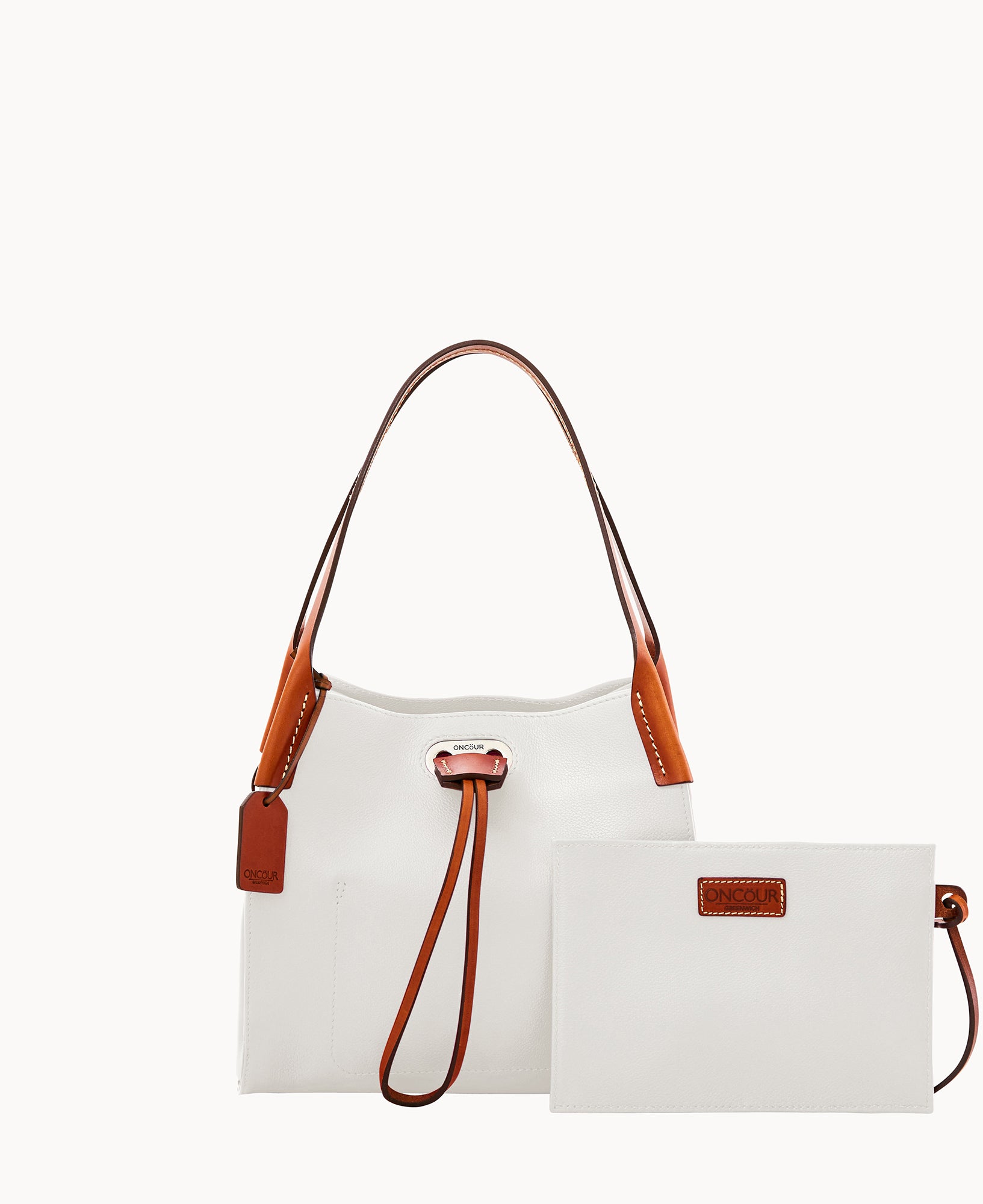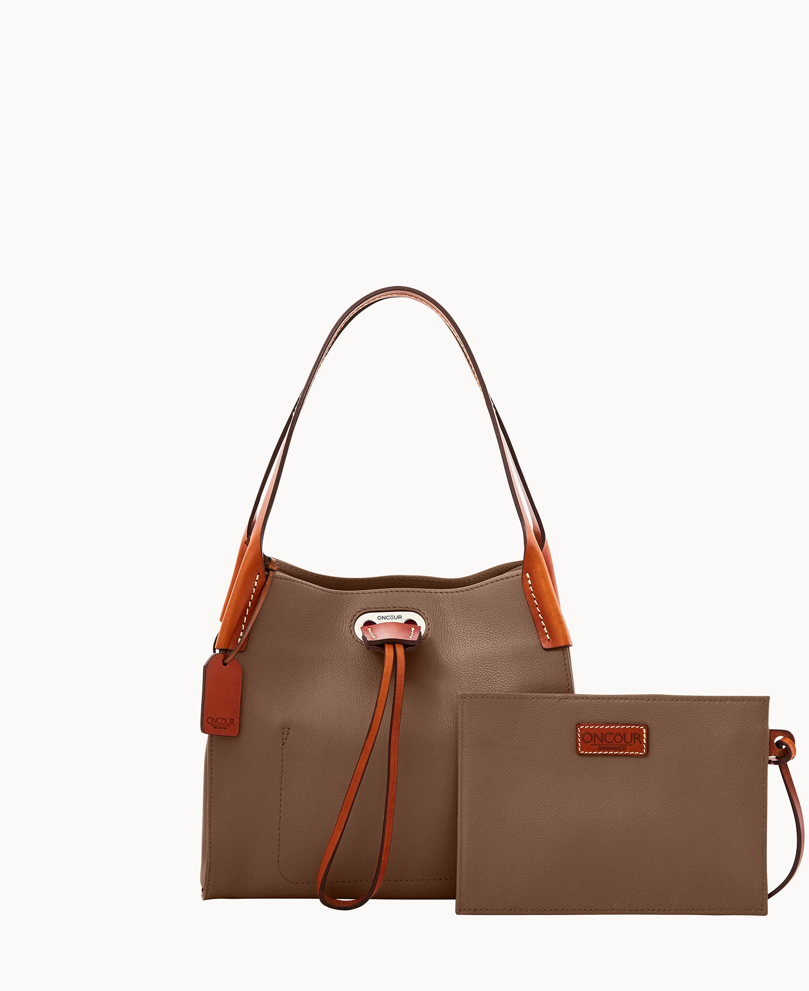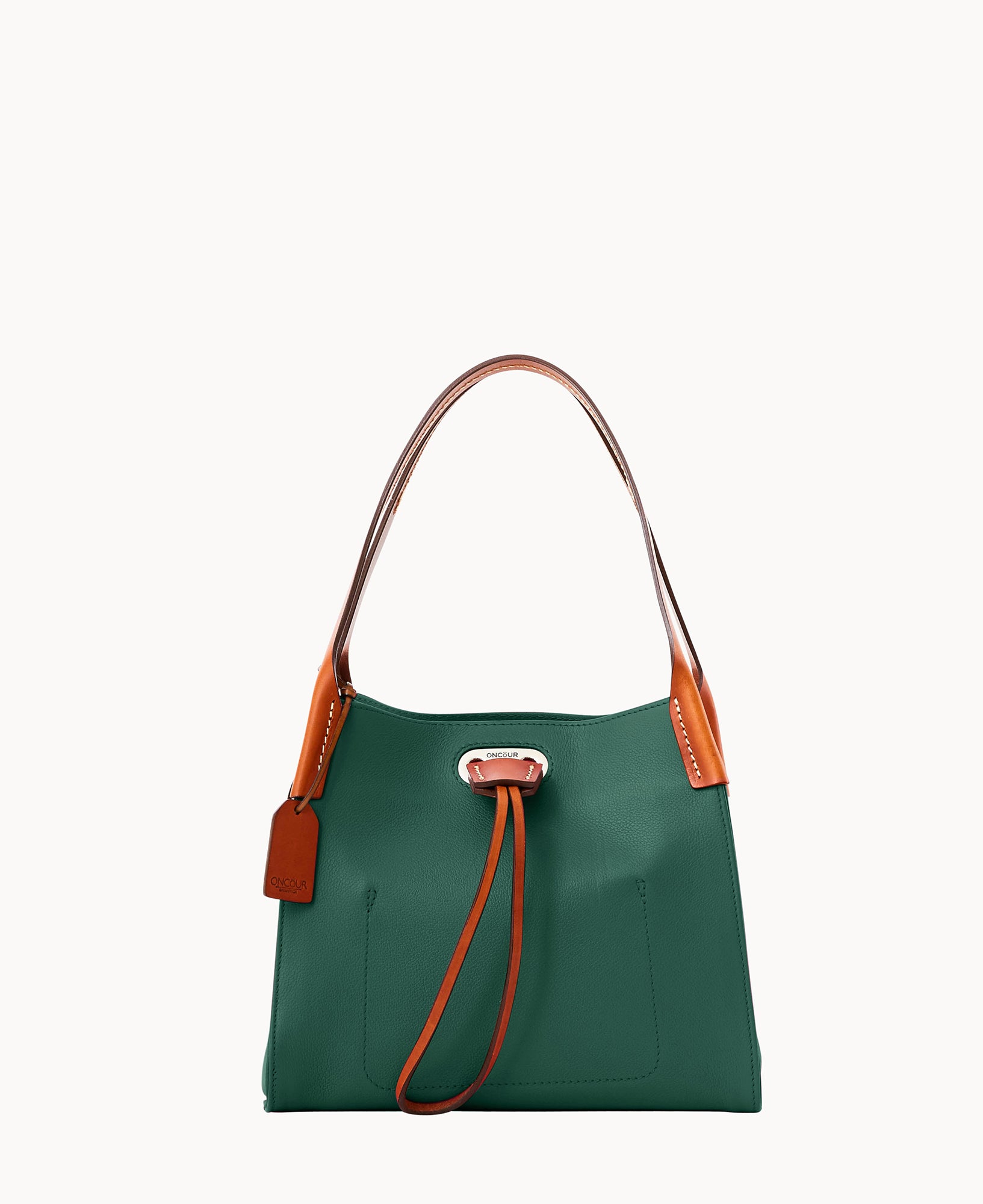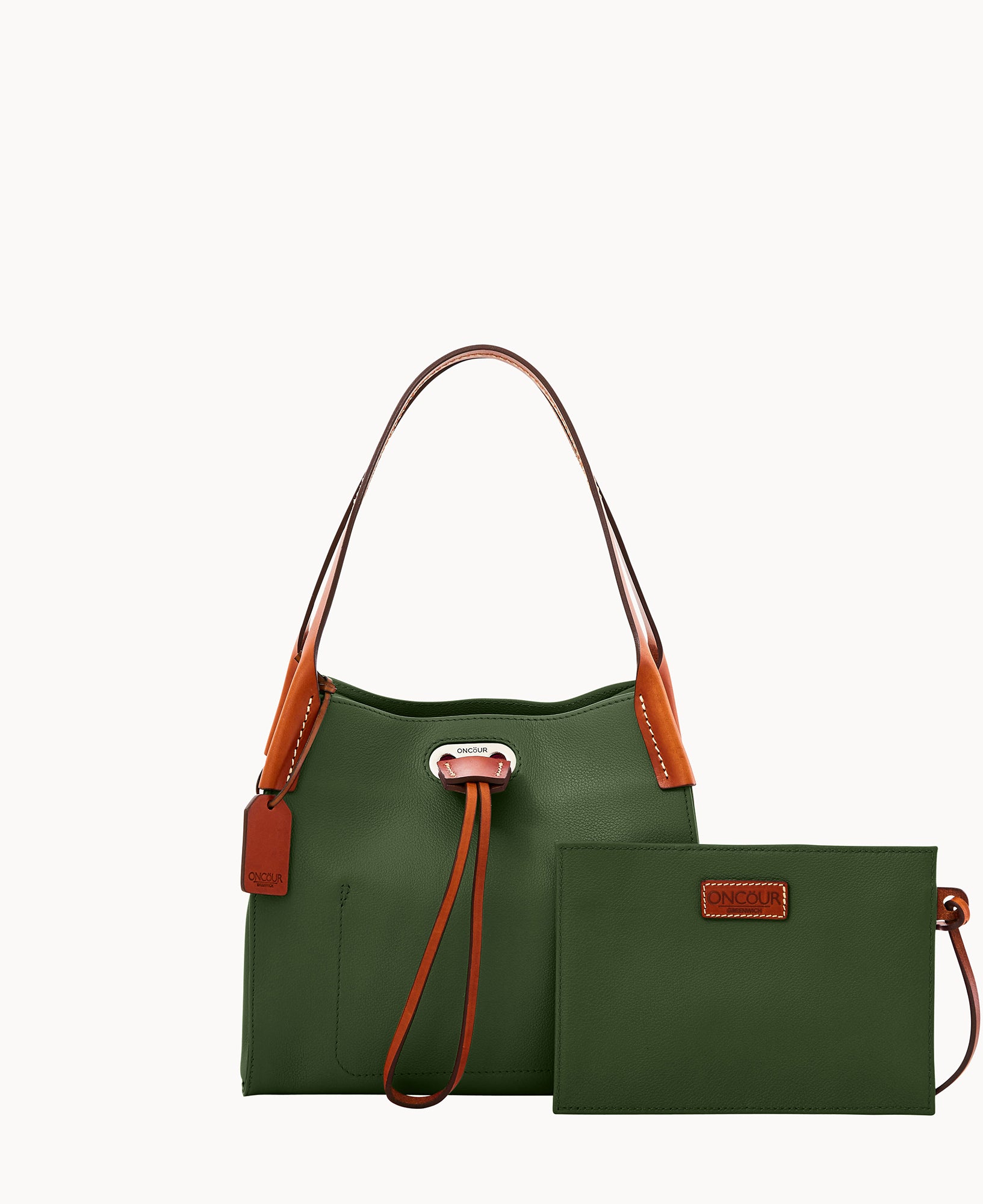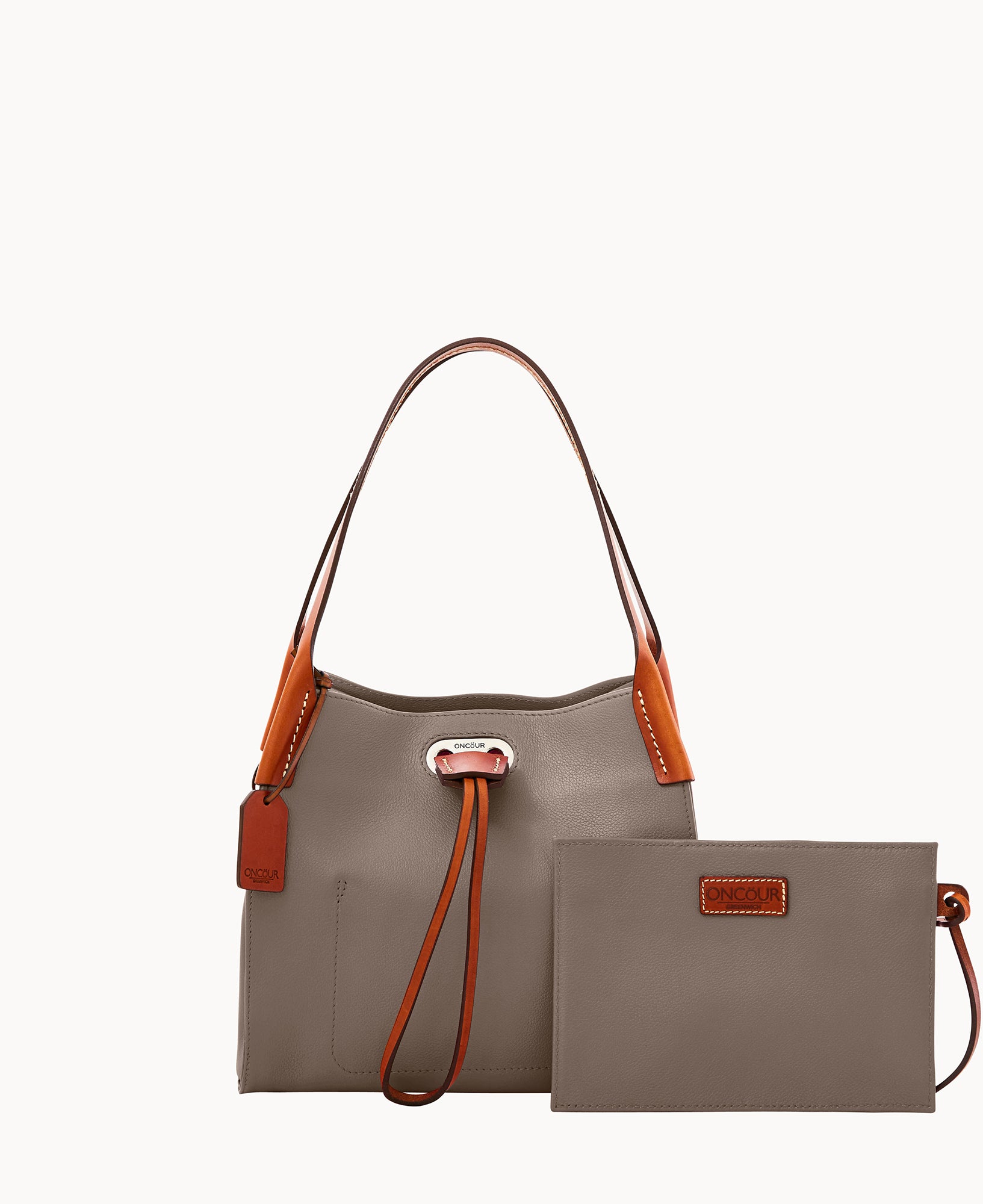 Two inside pockets. Inside key hook. Strap drop length 5″. Drawstring closure.