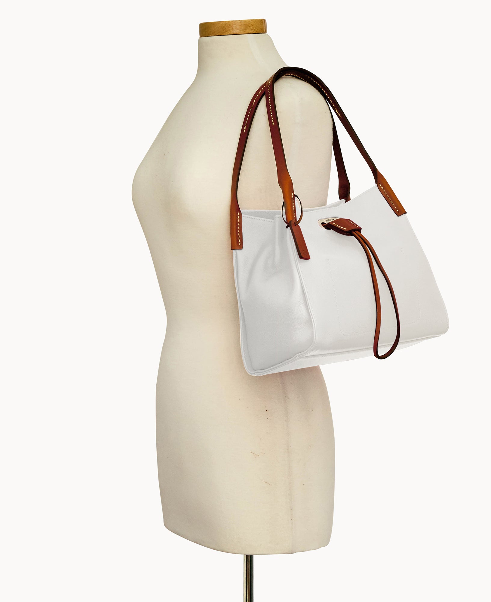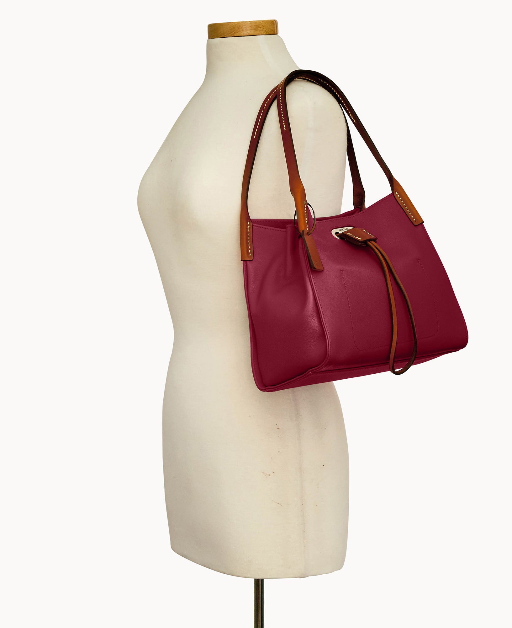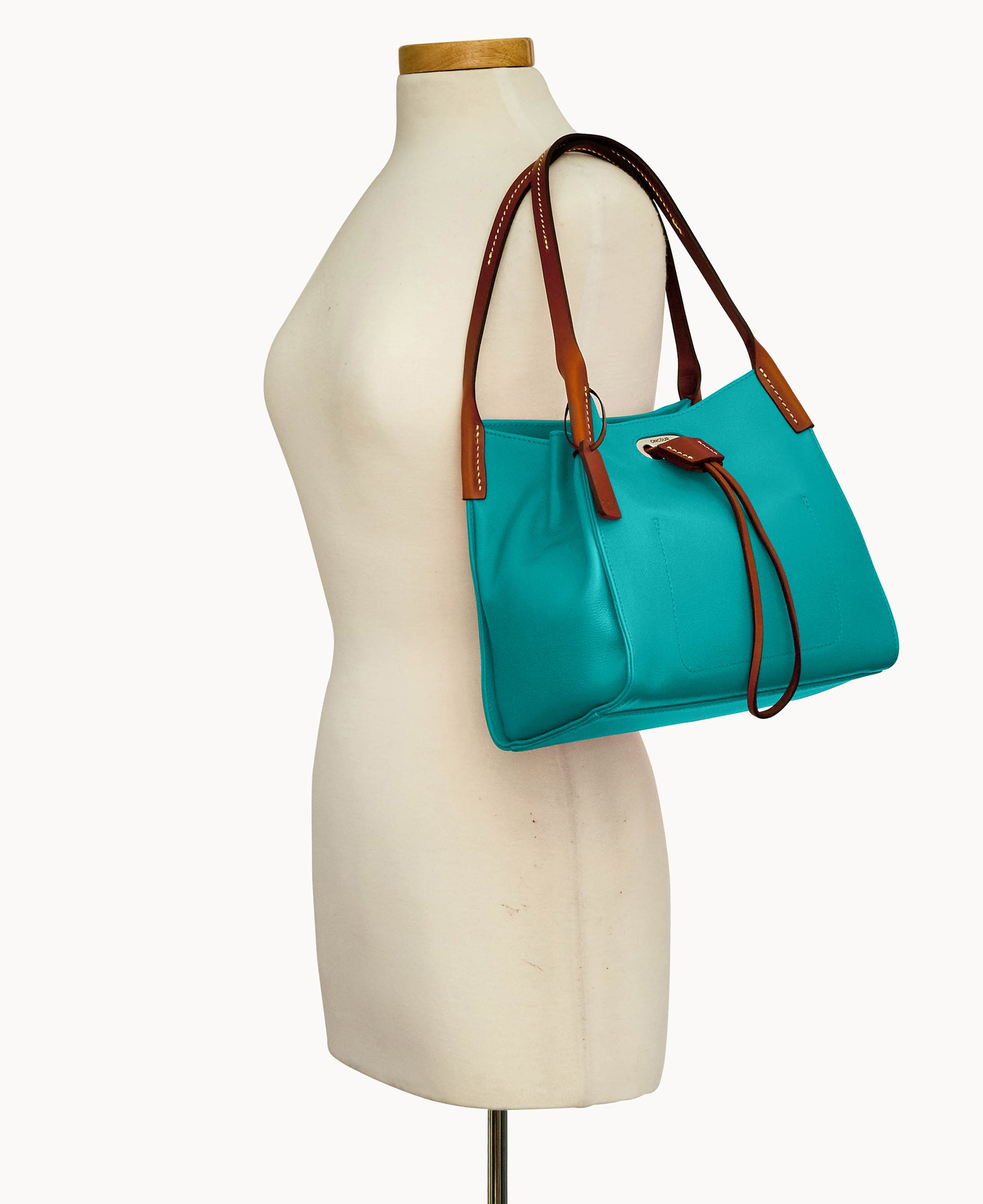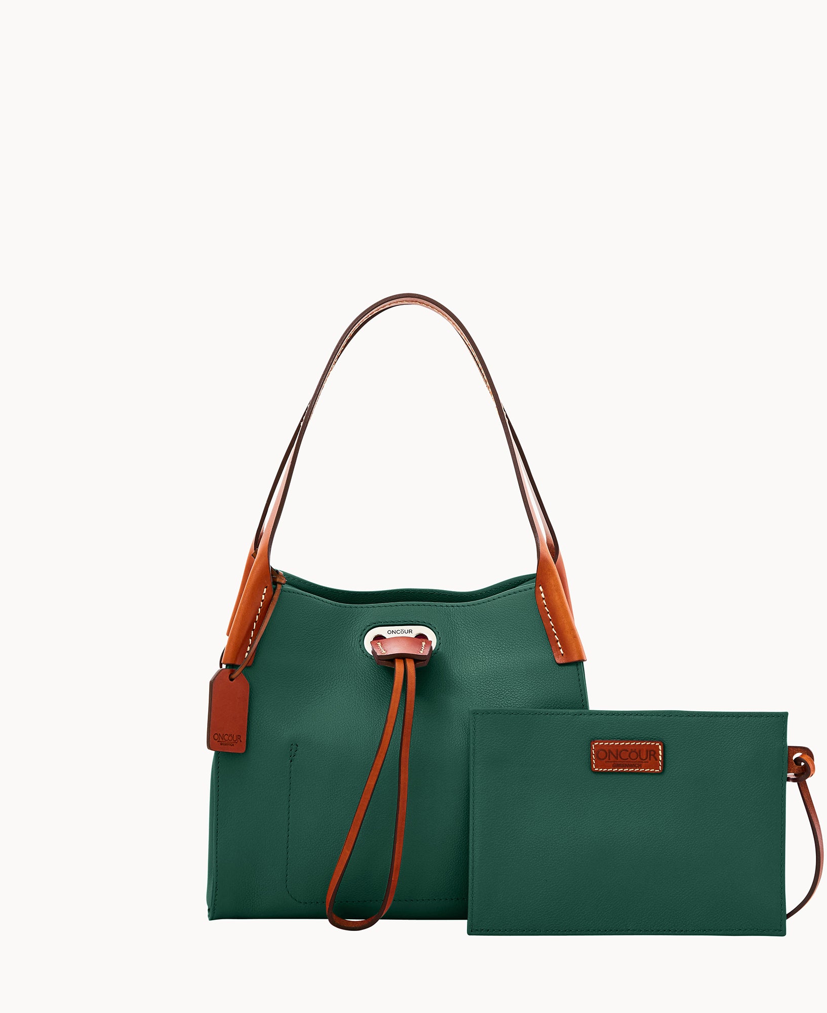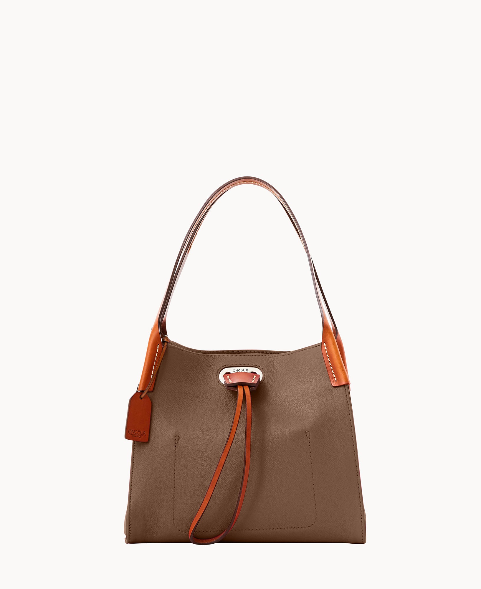 Two inside pockets. Inside key hook. Strap drop length 5″. Drawstring closure.