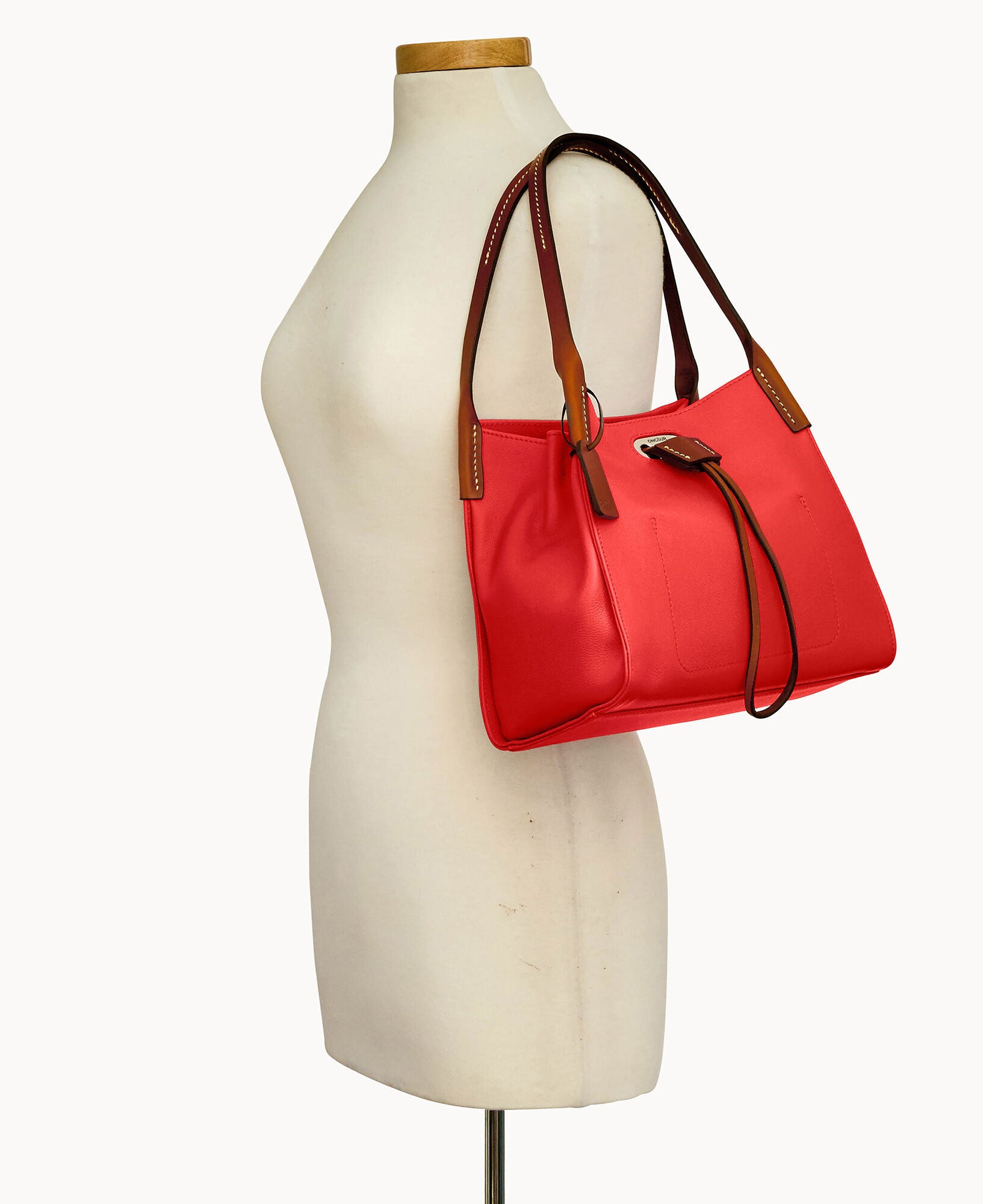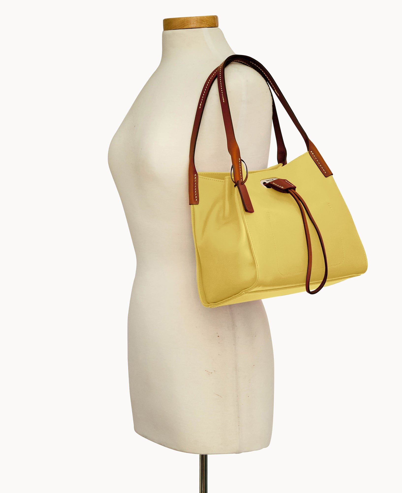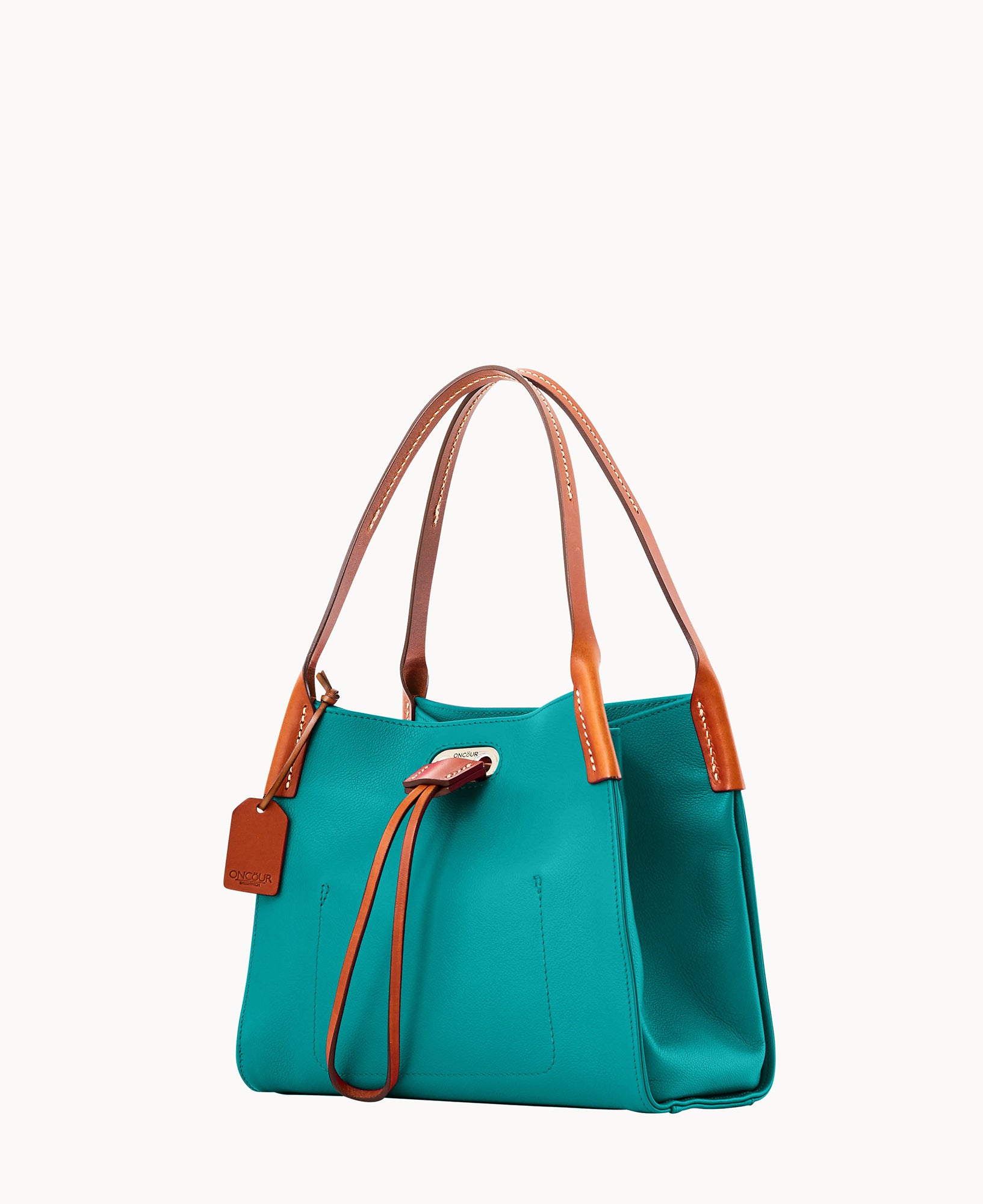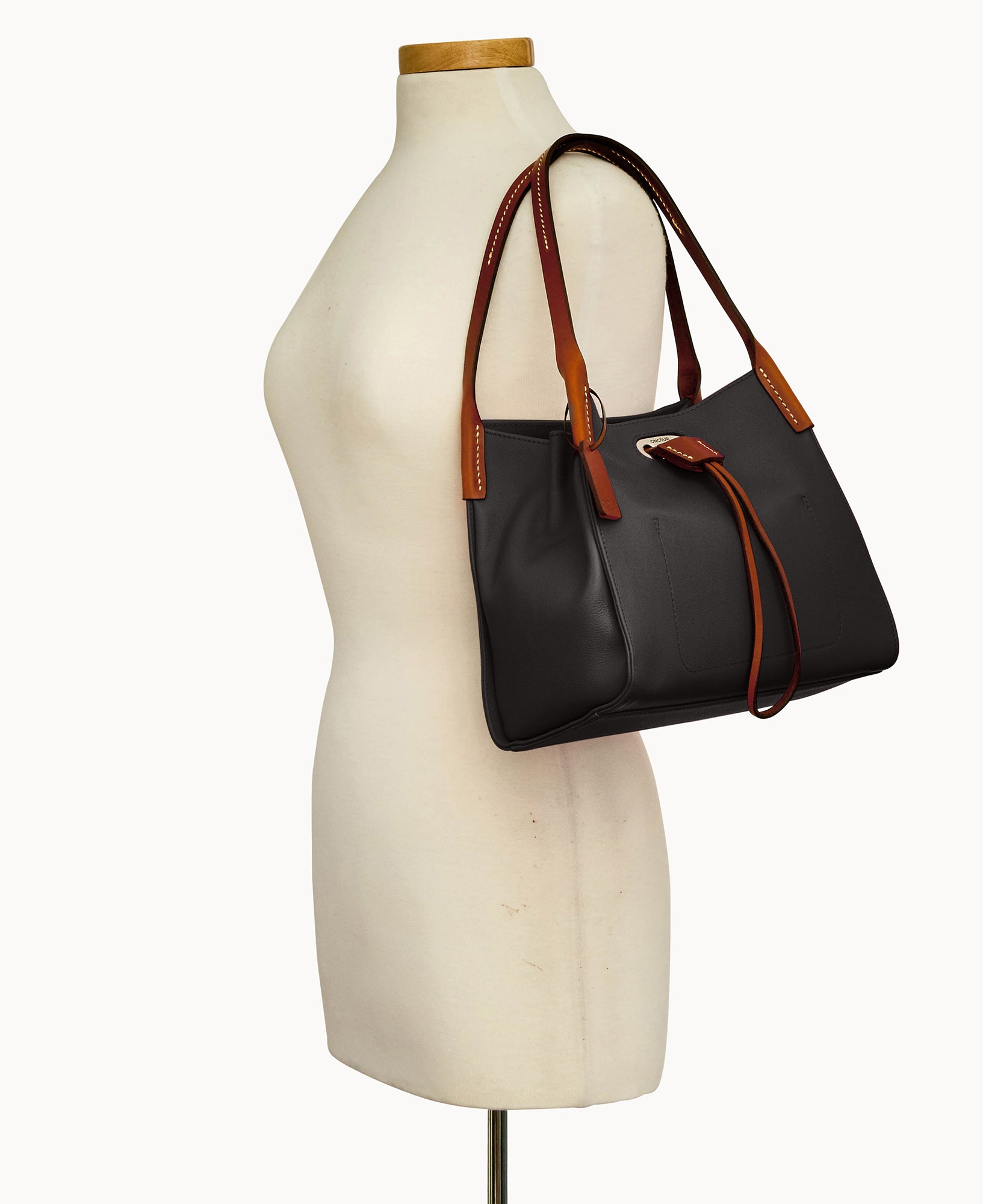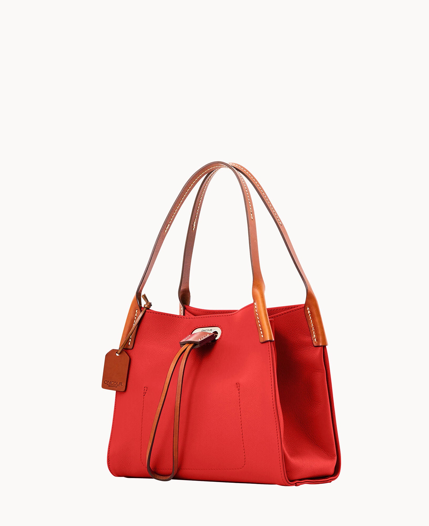 Two inside pockets. Inside key hook. Strap drop length 5″. Drawstring closure.