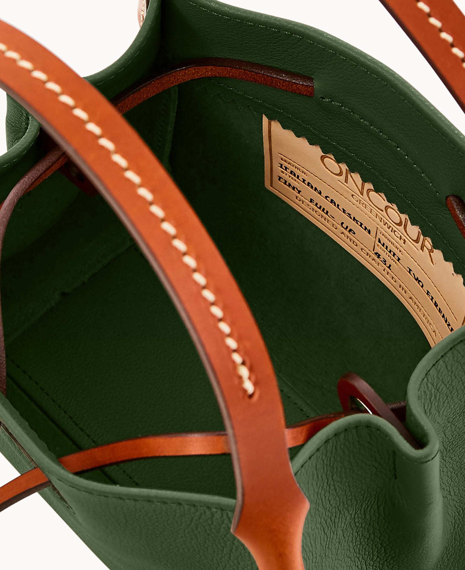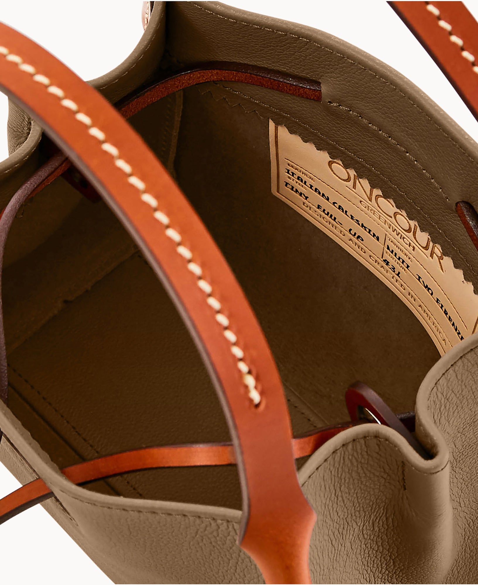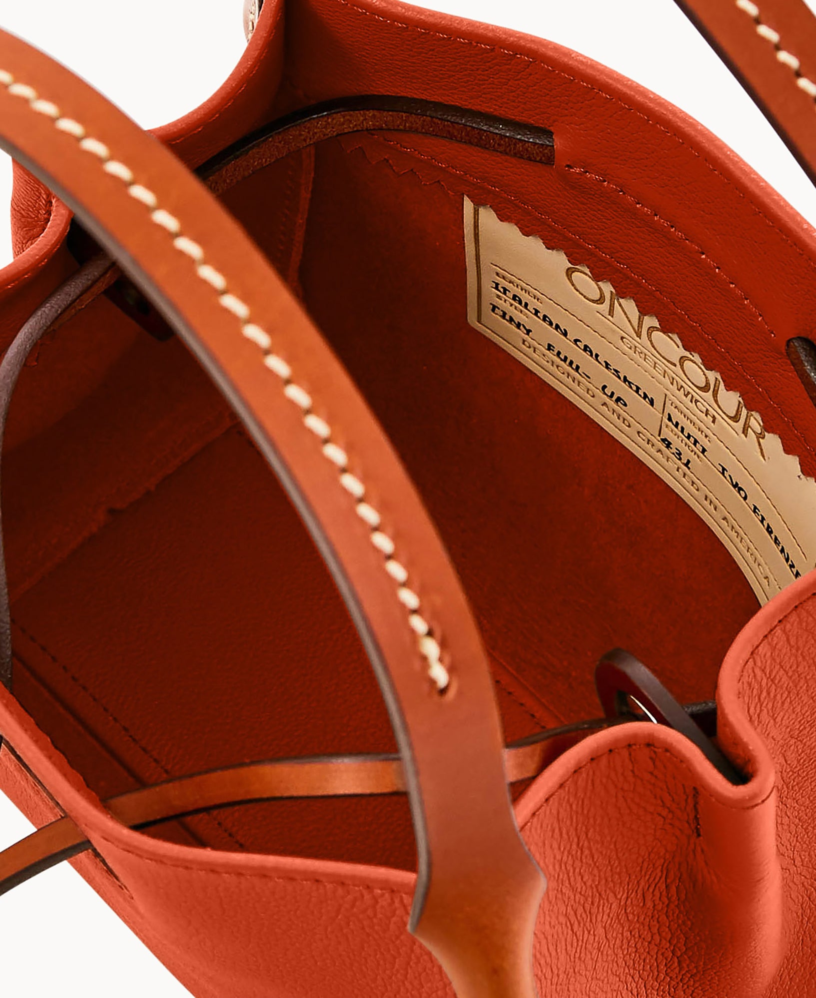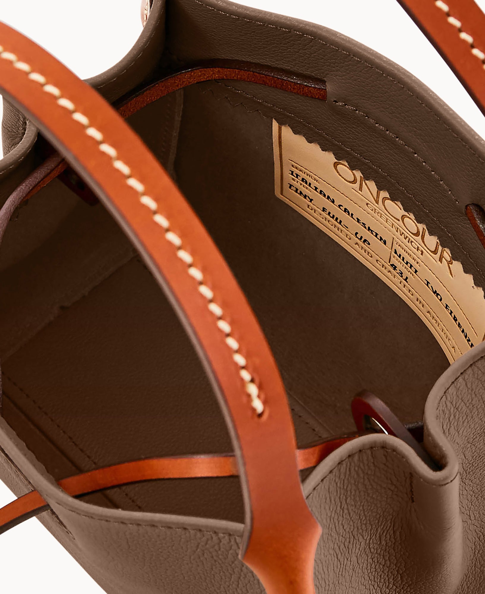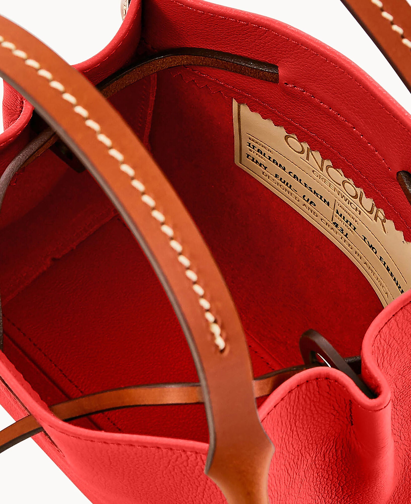 Inside key hook. Strap drop length 5″. Drawstring closure.
