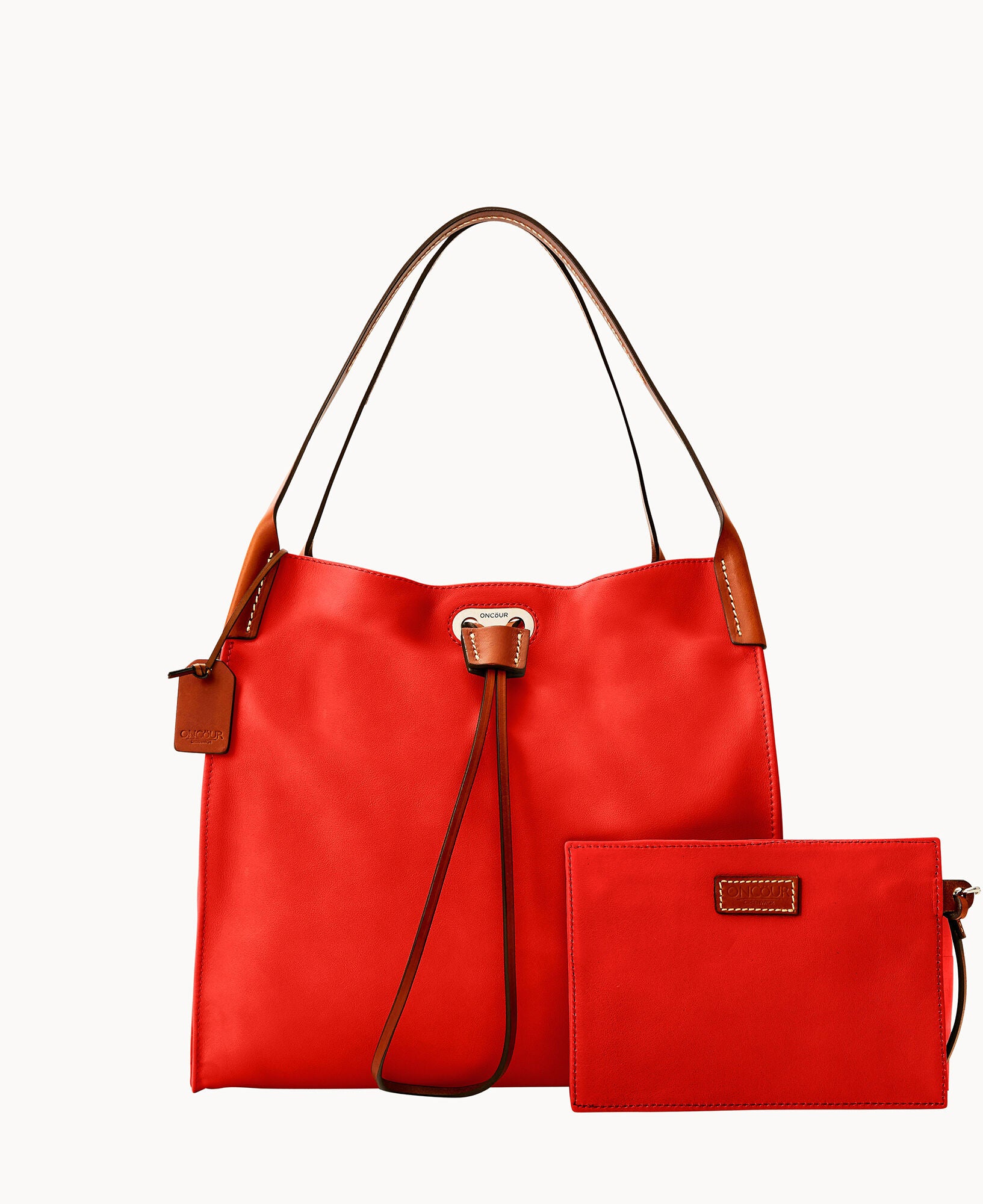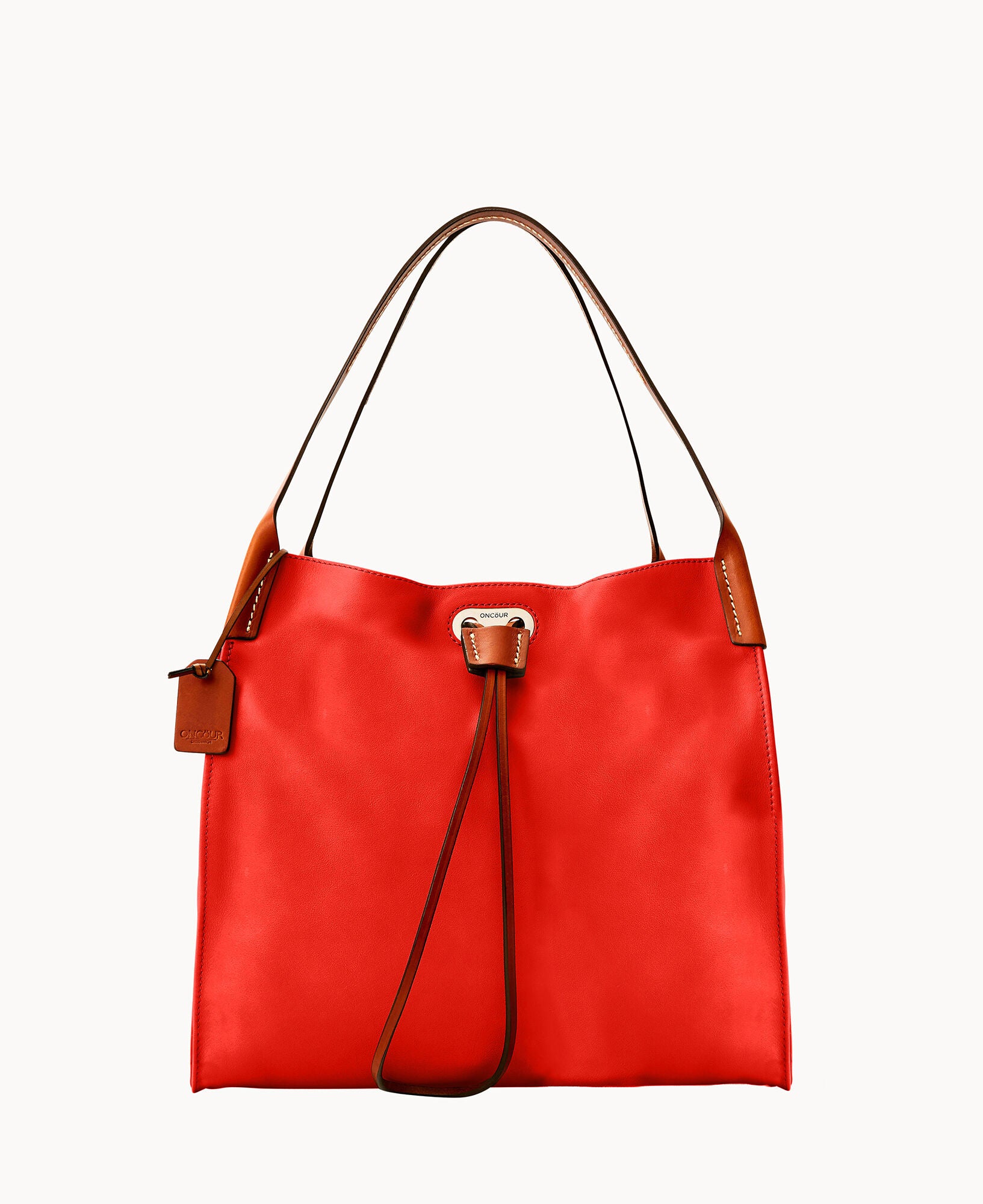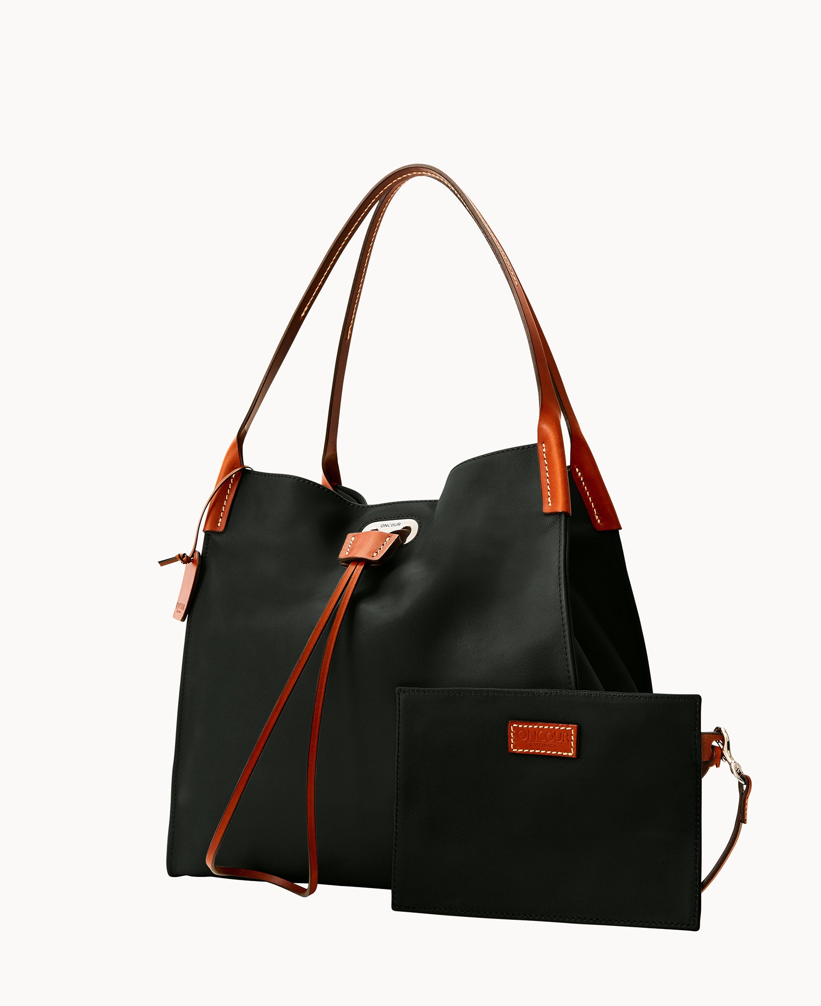 Inside key hook. Strap drop length 11″. Drawstring closure.