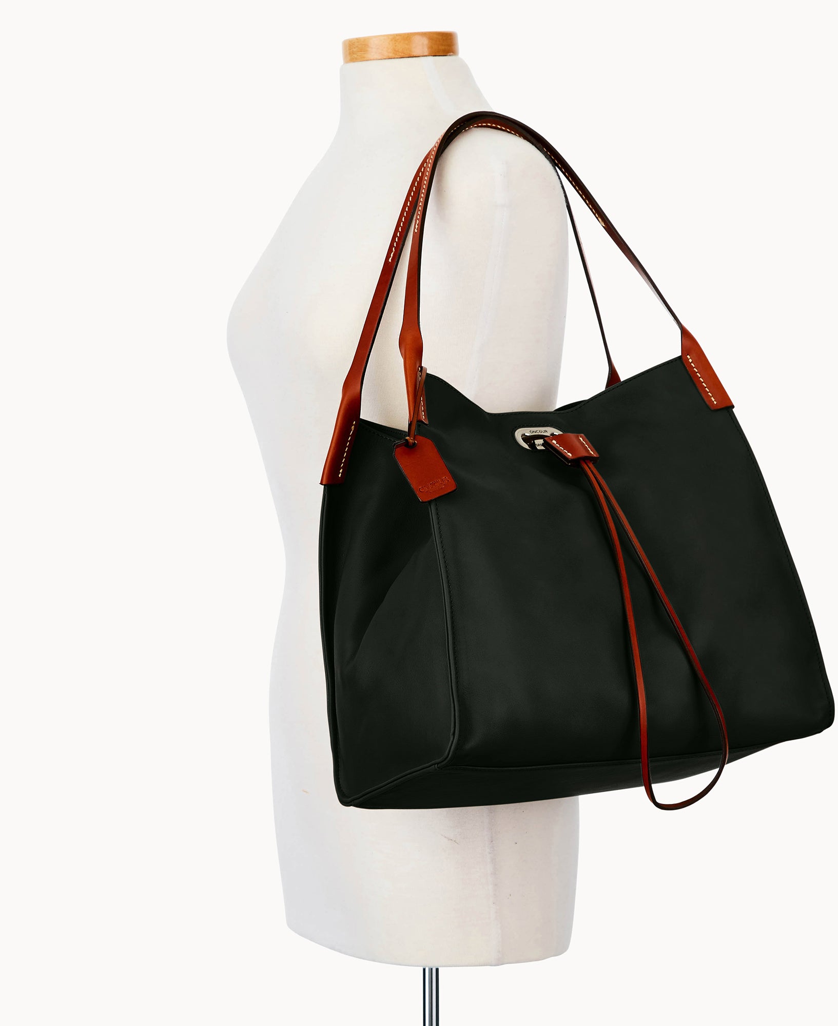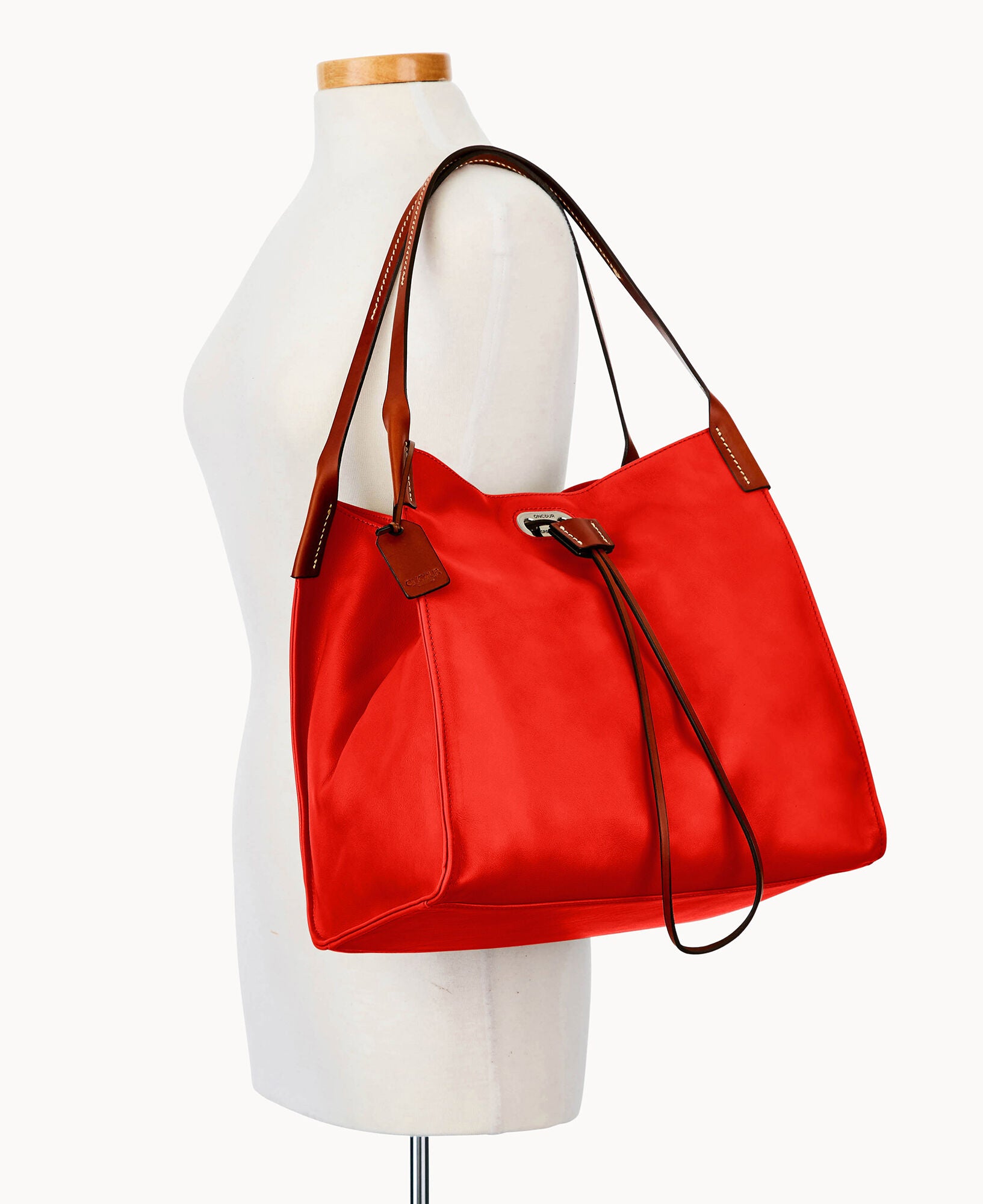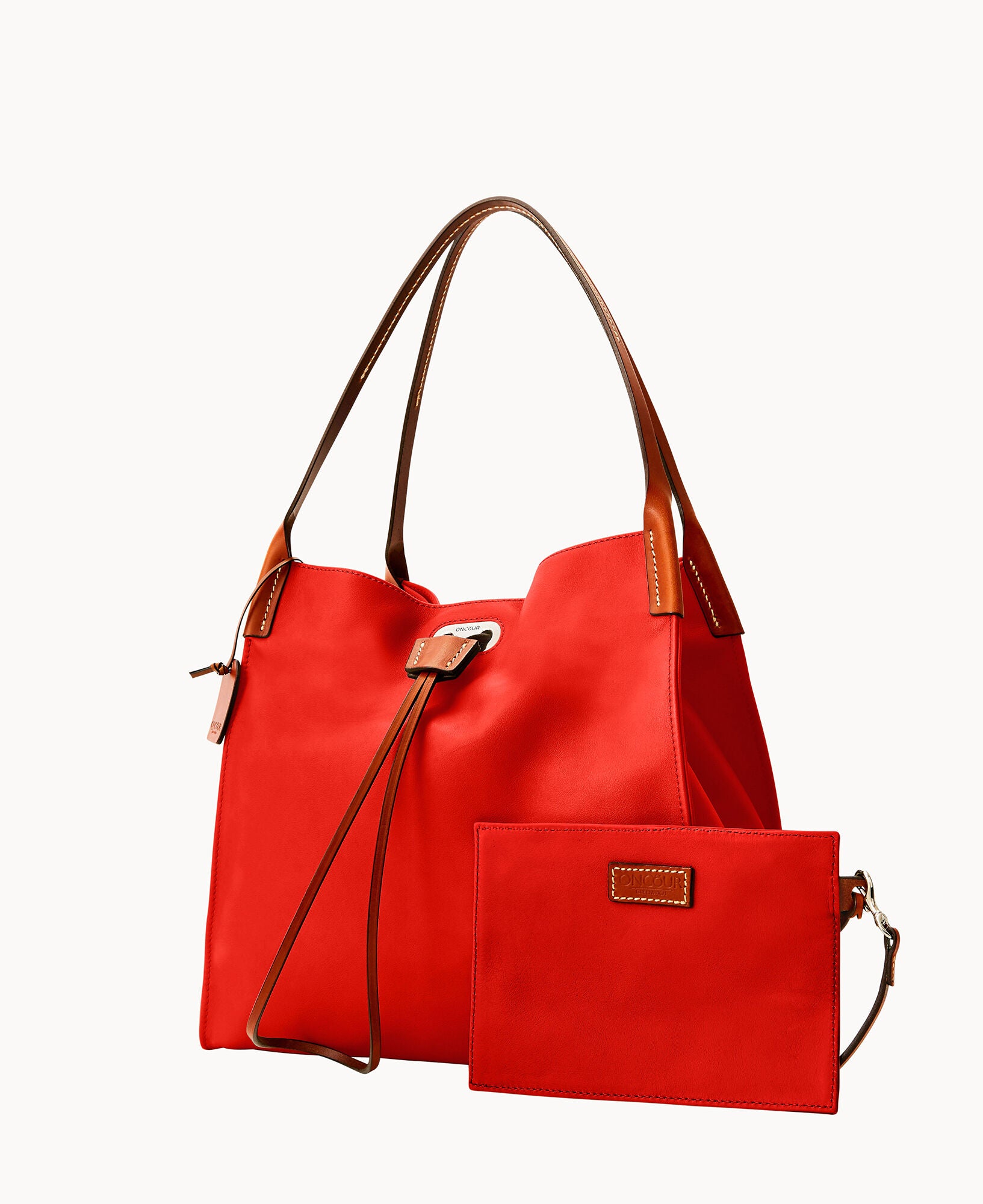 Inside key hook. Strap drop length 11″. Drawstring closure.