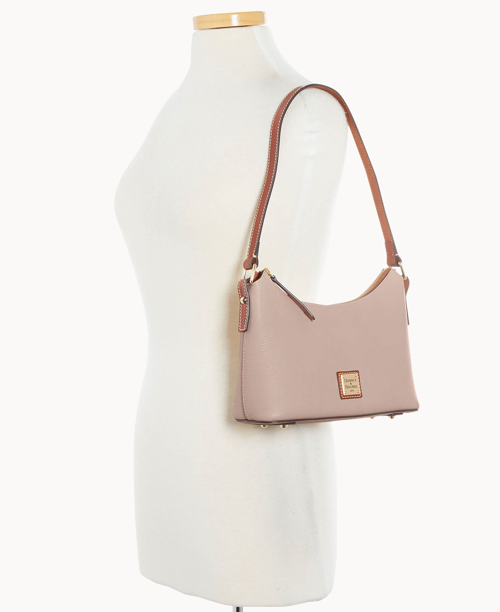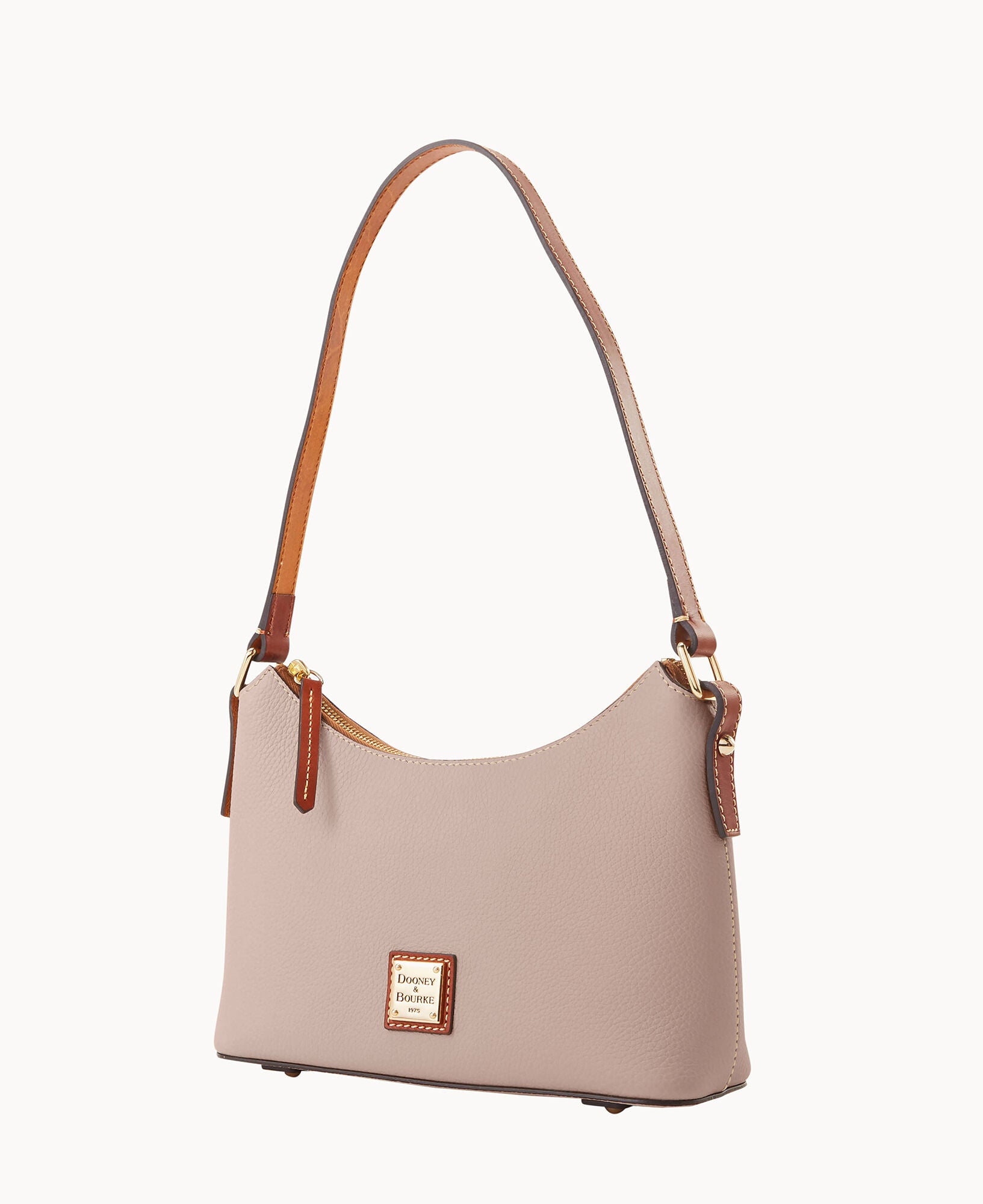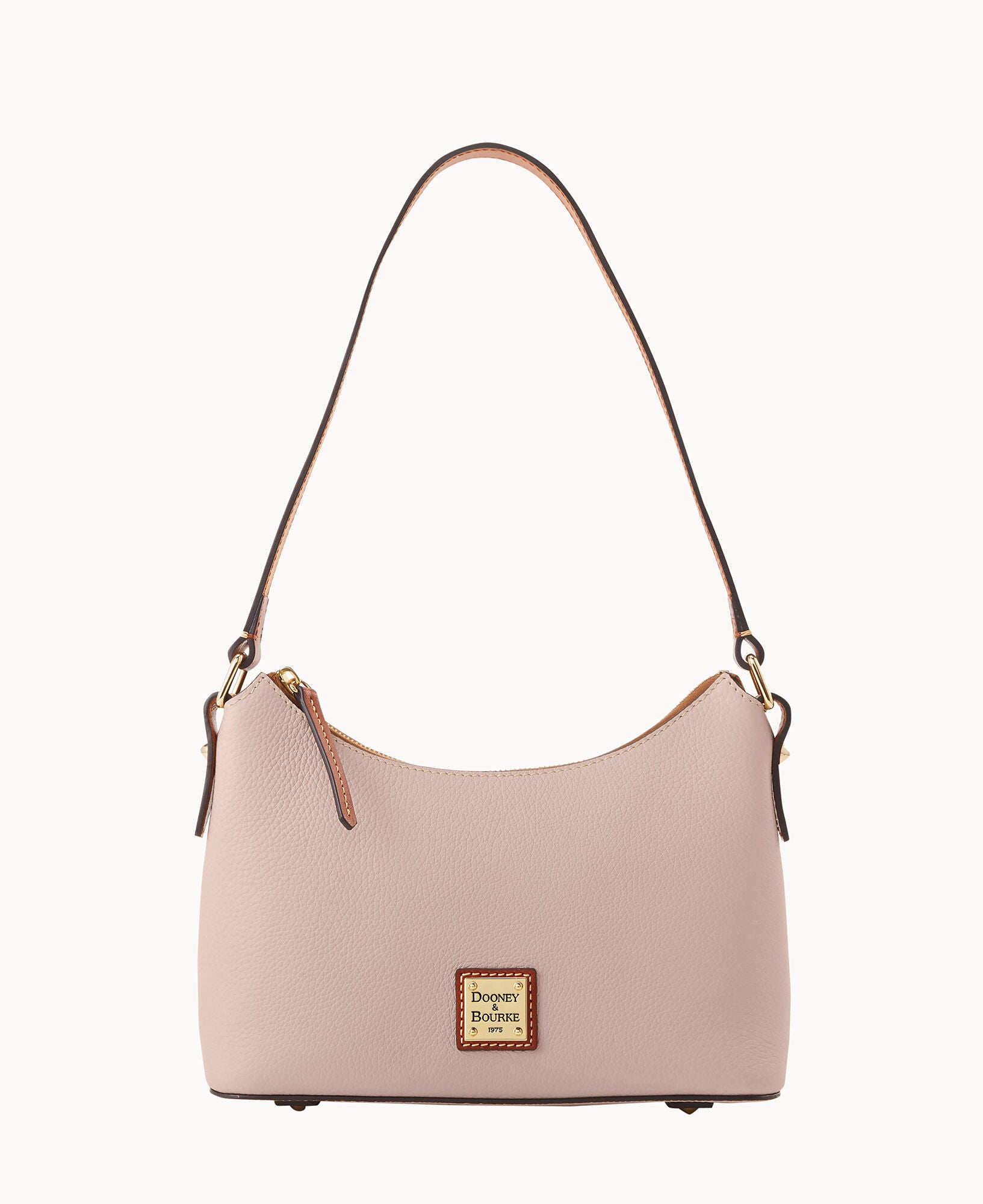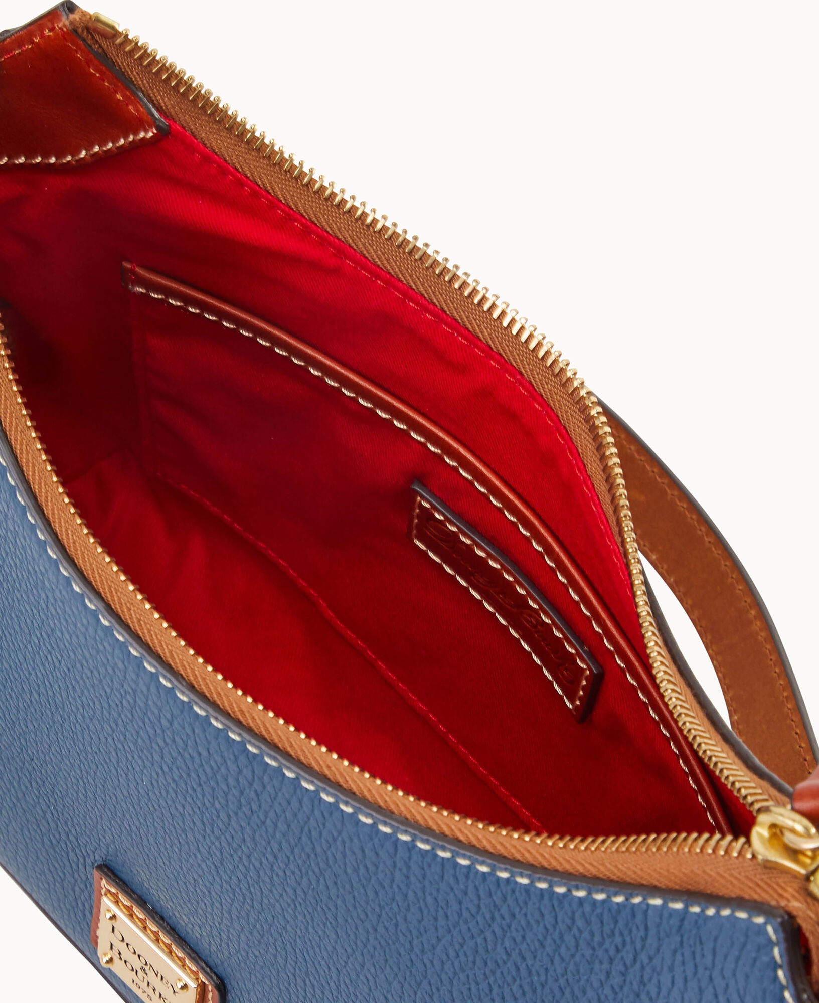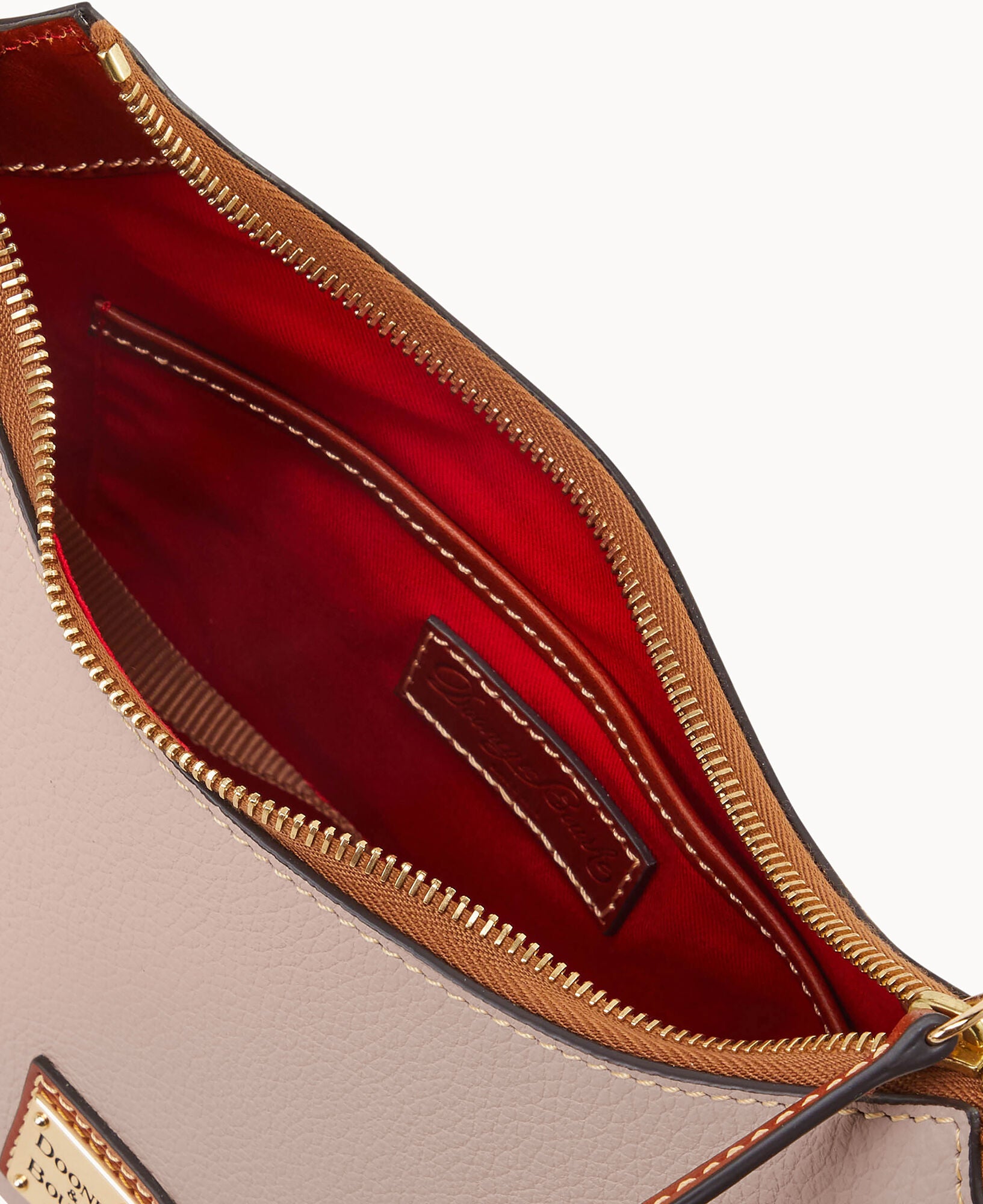 Two inside slip pockets. Inside key hook. Strap drop length 11″. Lined. Feet. Zipper closure.