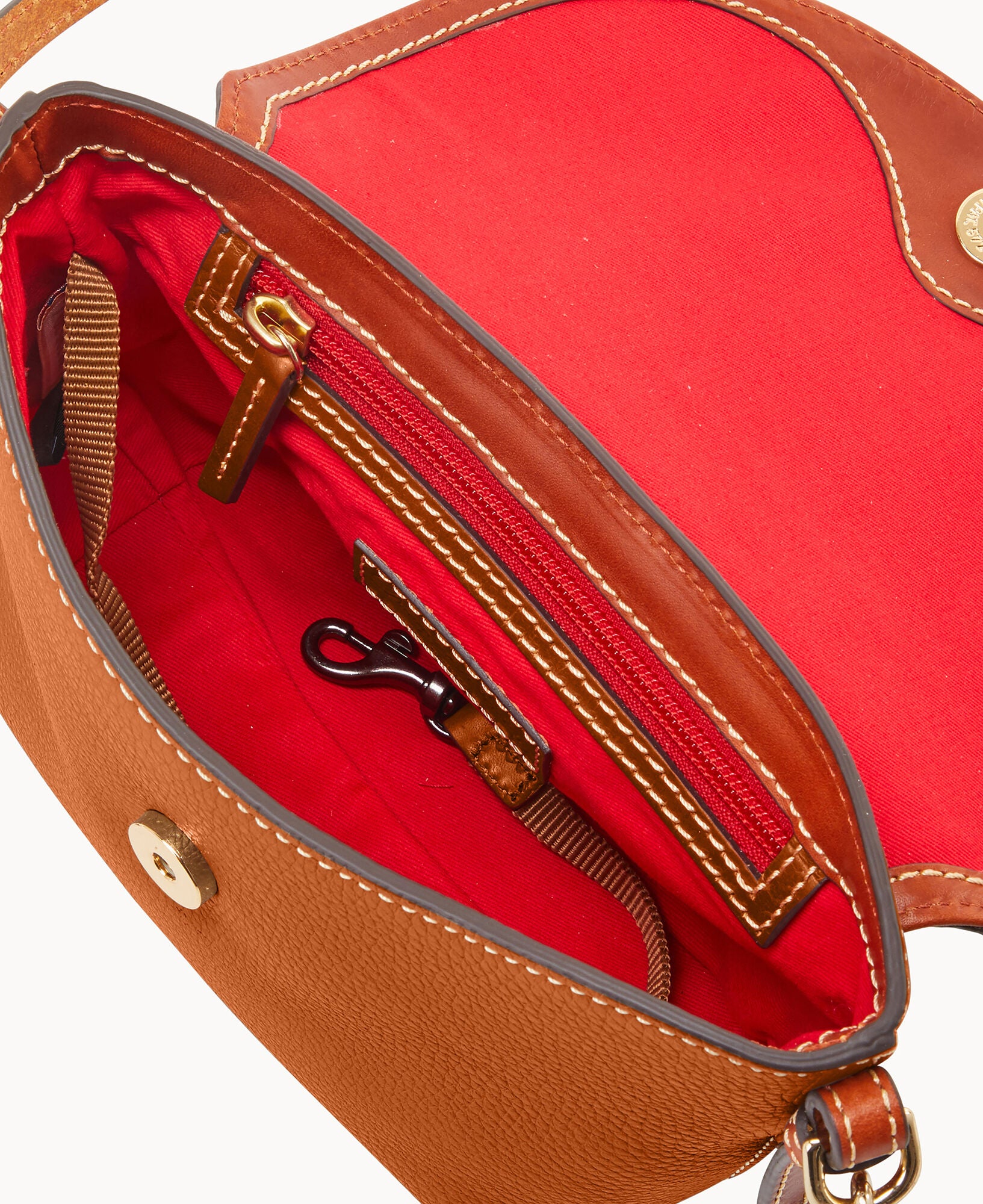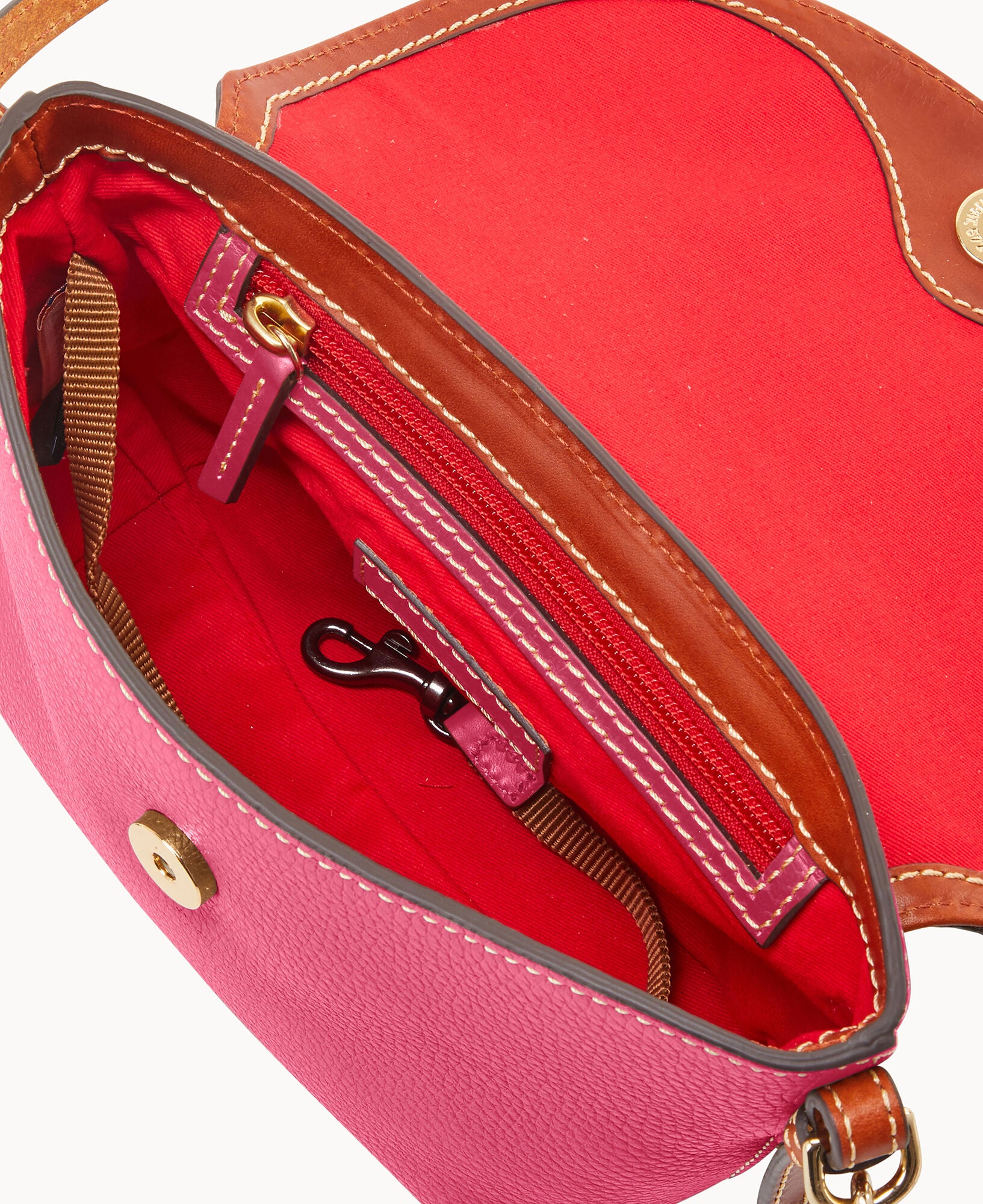 One inside slip pocket. One inside zip pocket. Inside key hook. Strap drop length 26.5″. Adjustable strap. Detachable strap. Lined. Magnetic closure