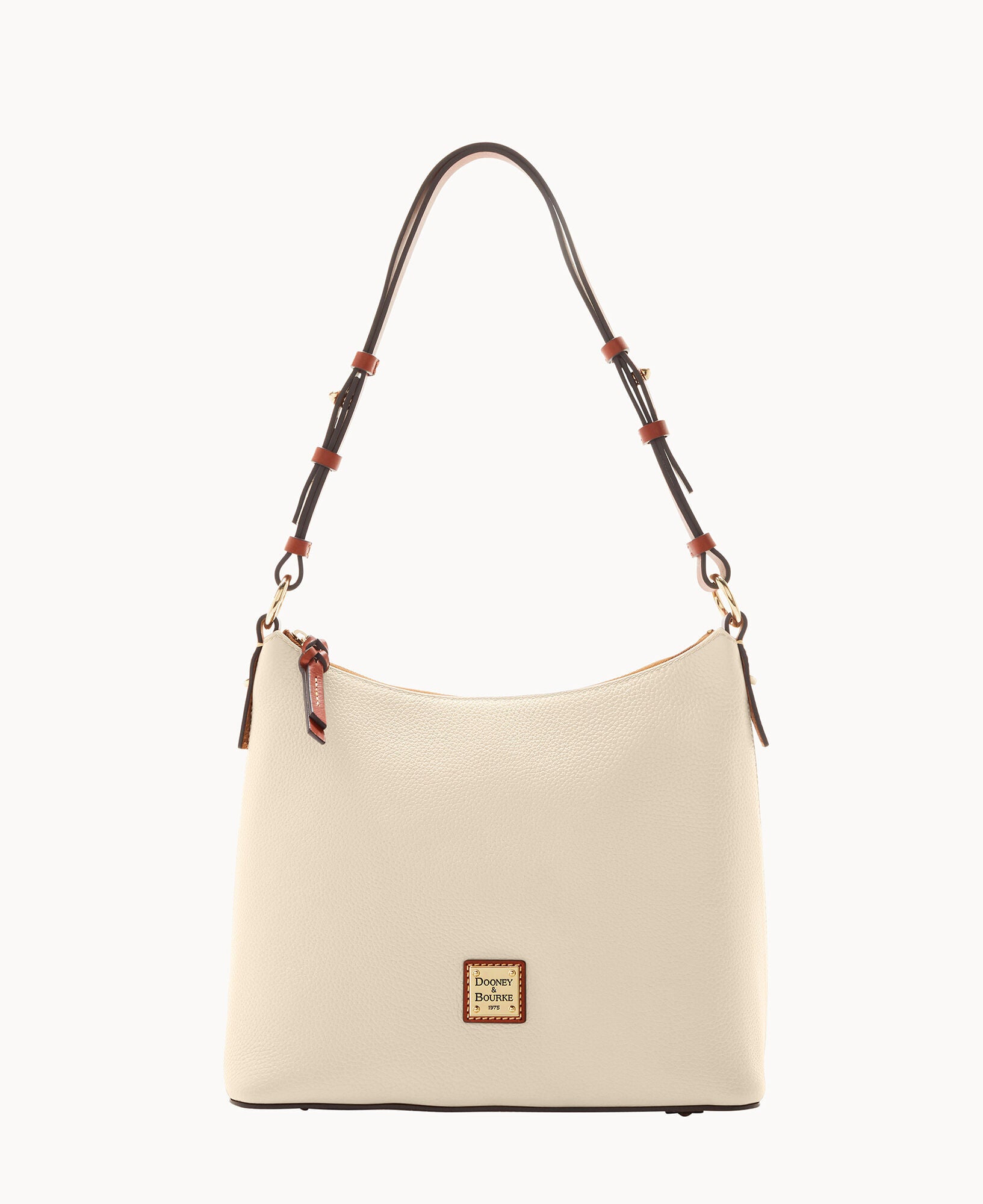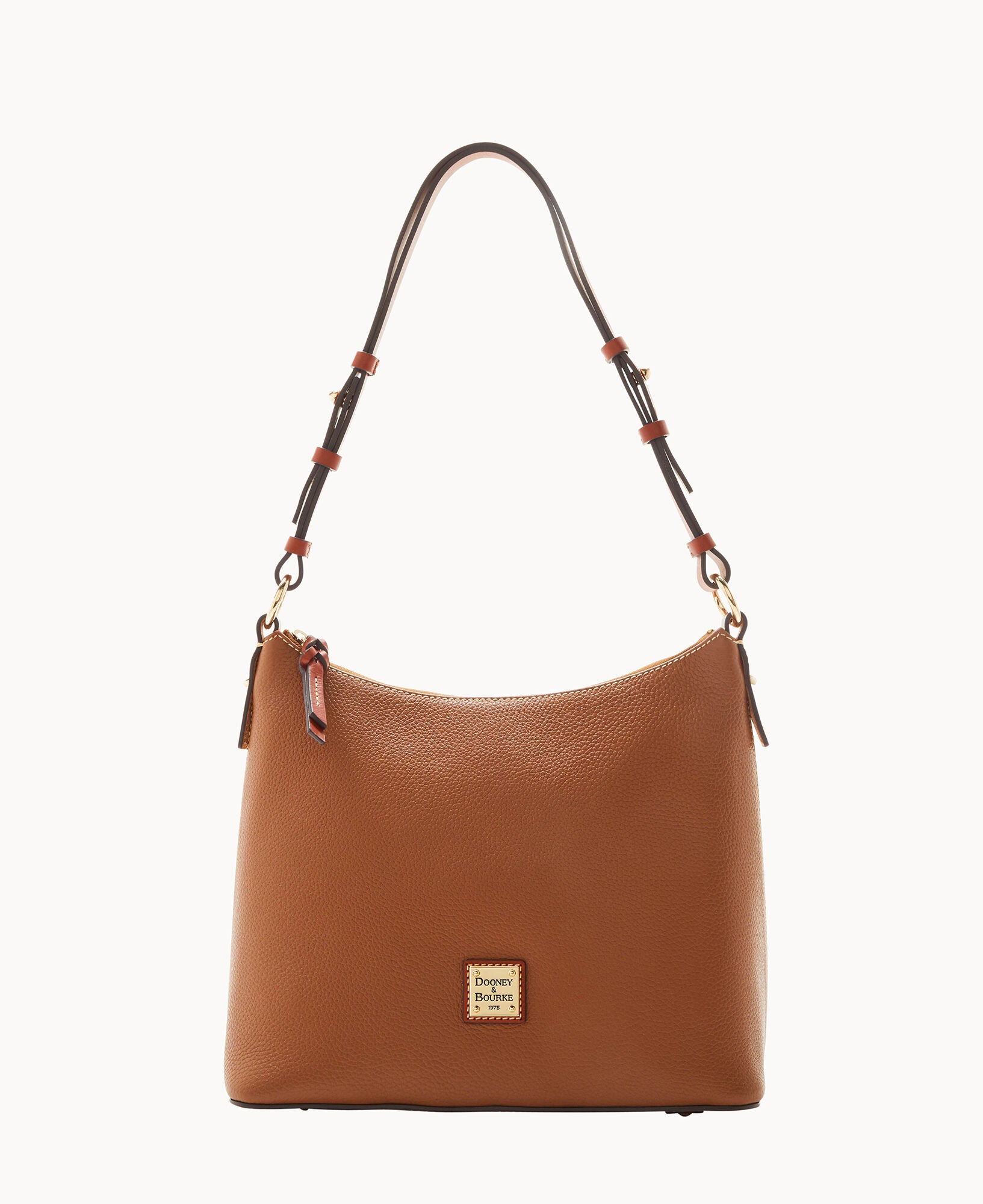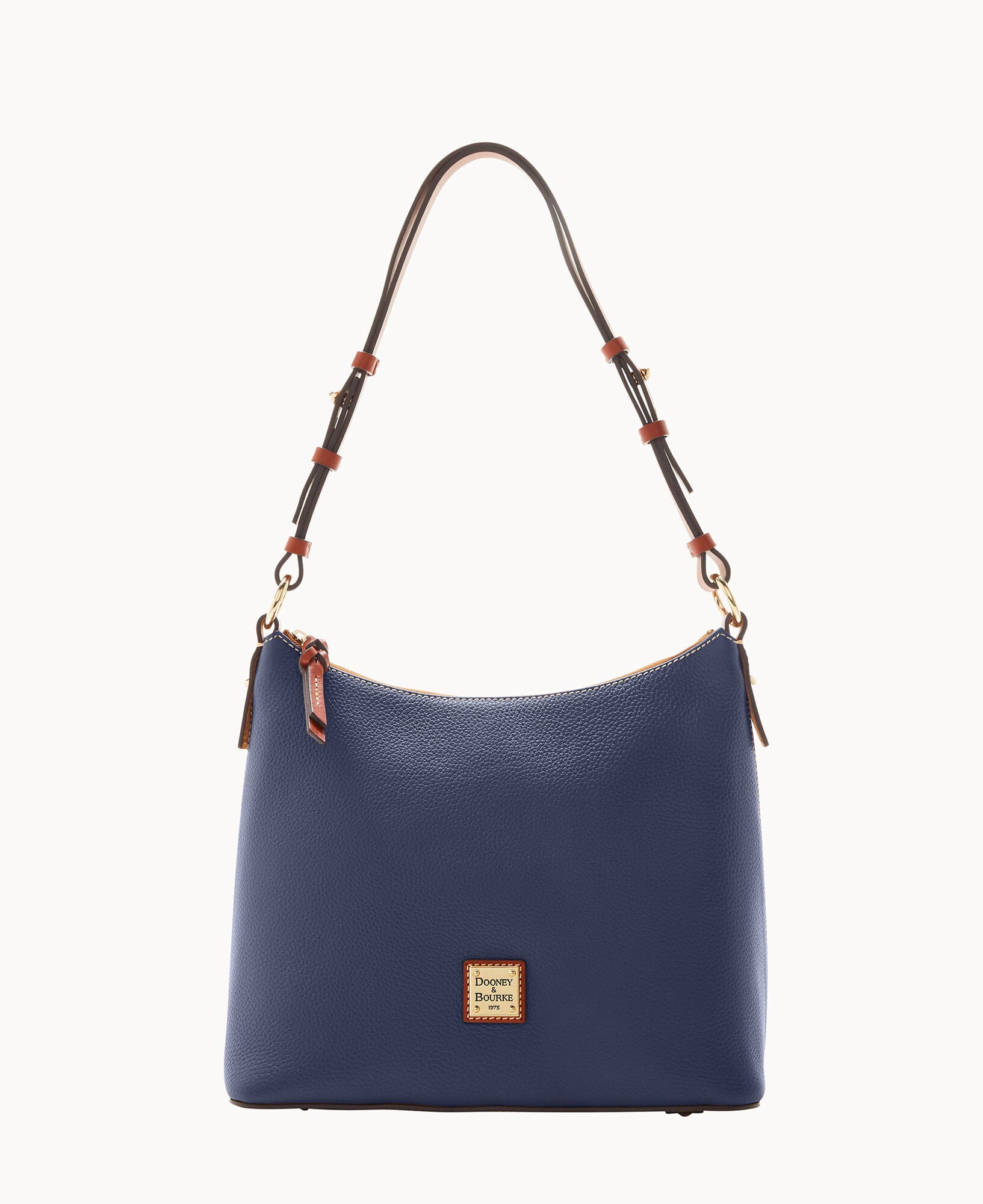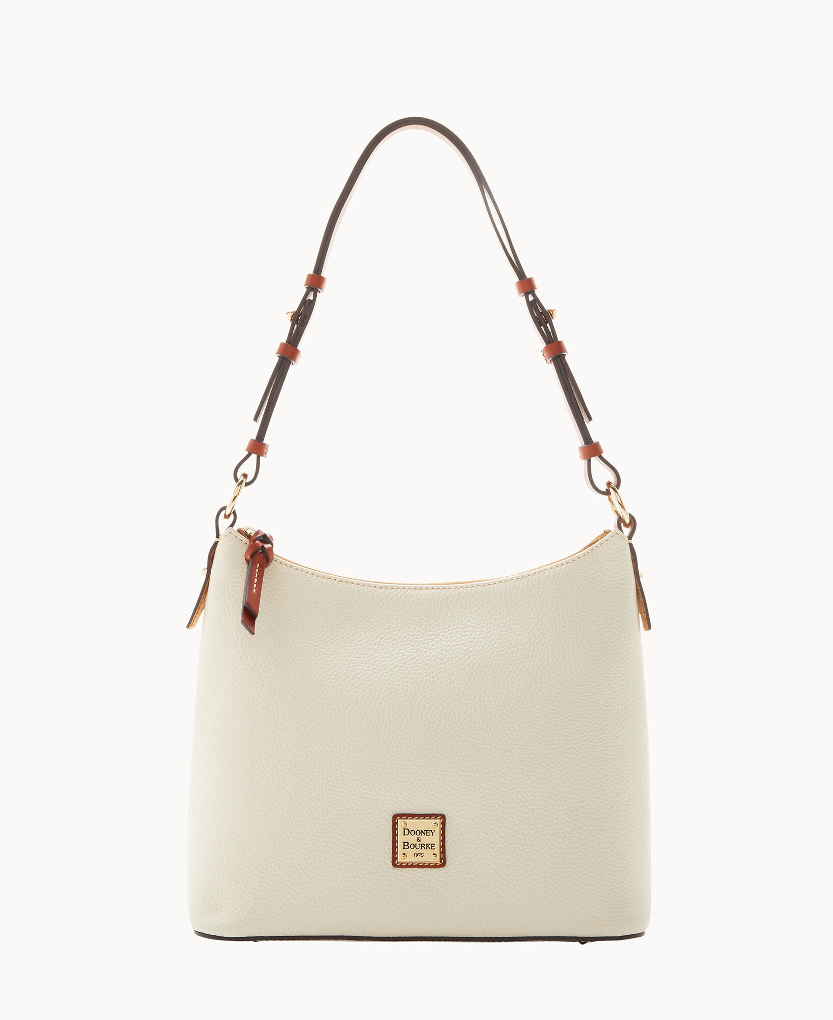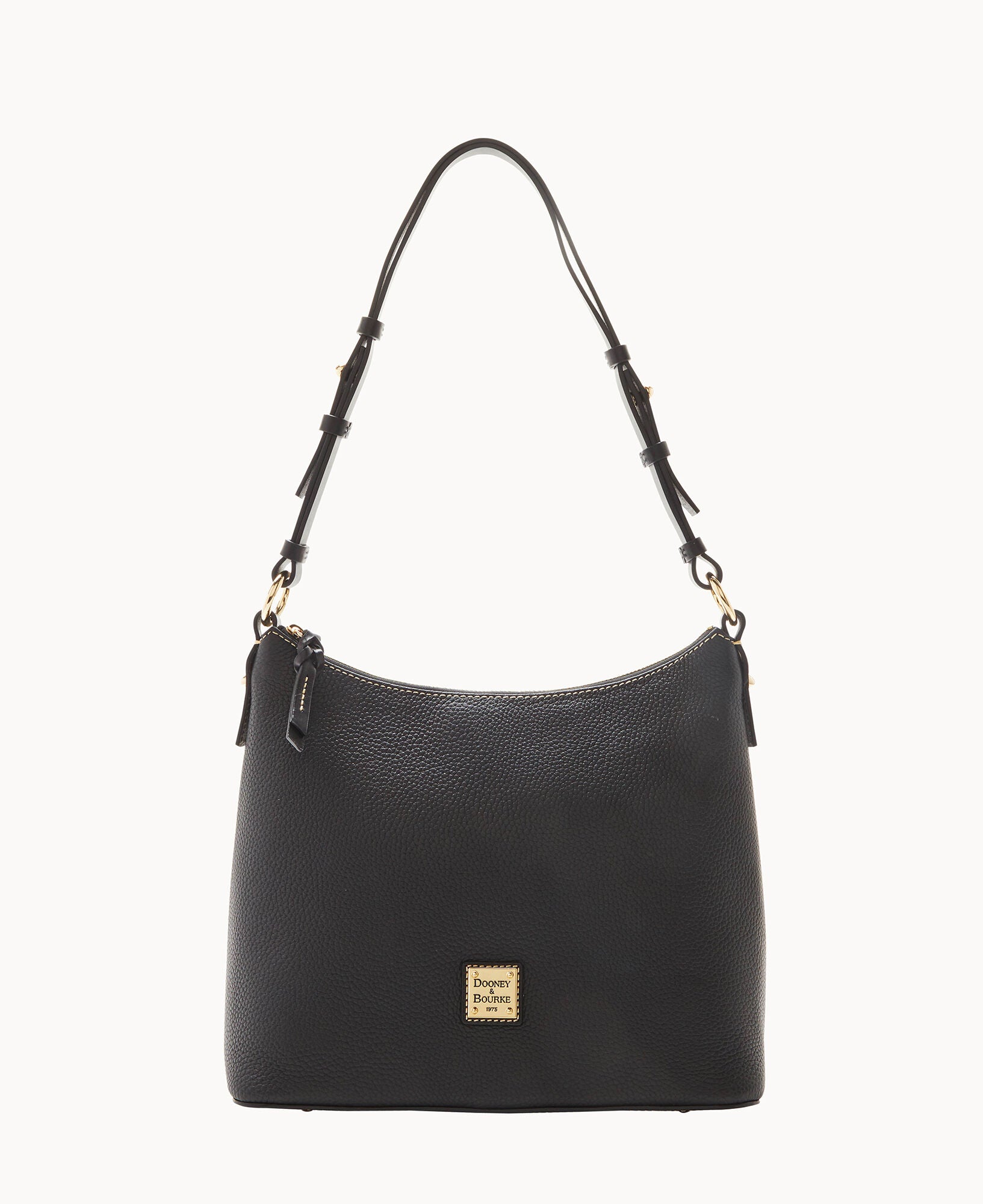 One inside zip pocket. Two inside pockets. Cell phone pocket. Inside key hook. Adjustable shoulder strap. Strap drop length 12″. Lined. Feet. Zipper closure.
