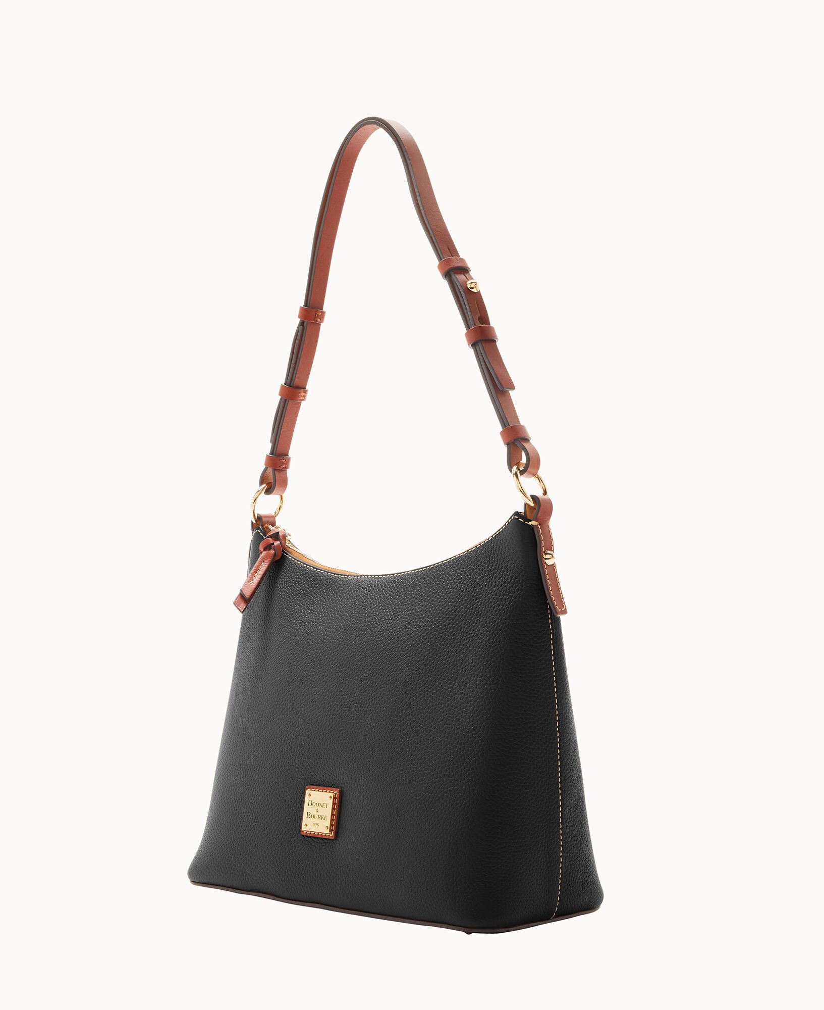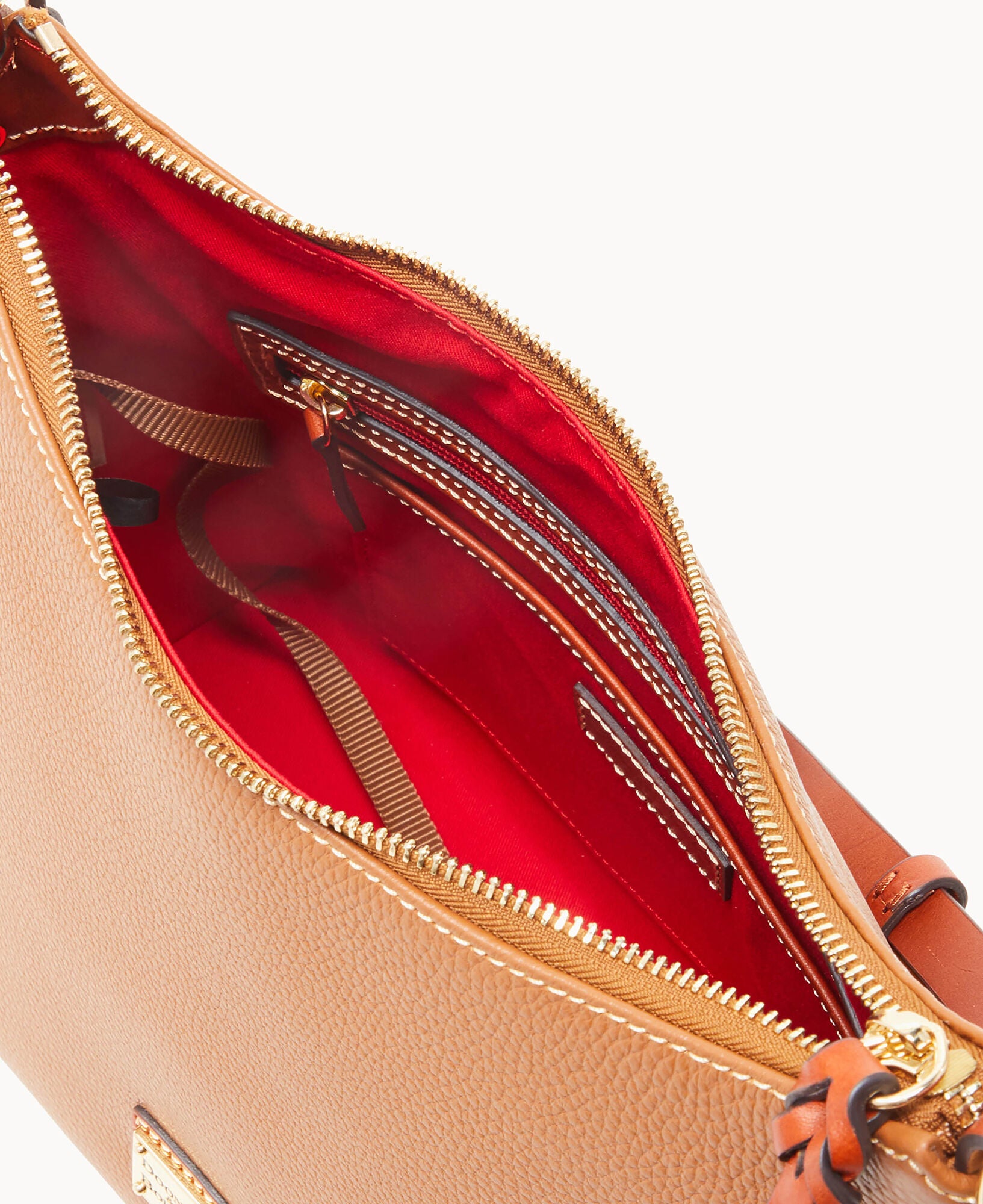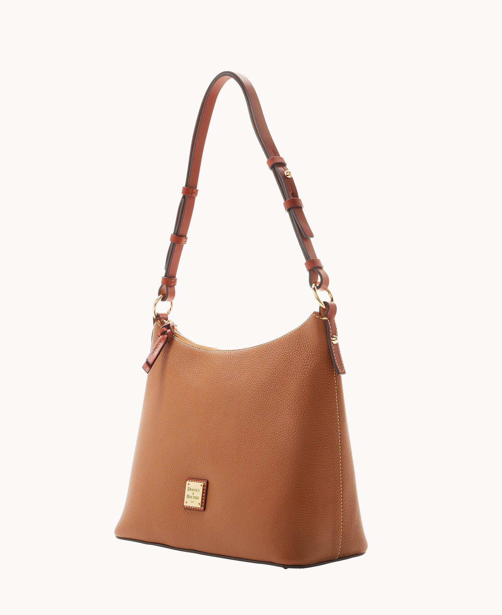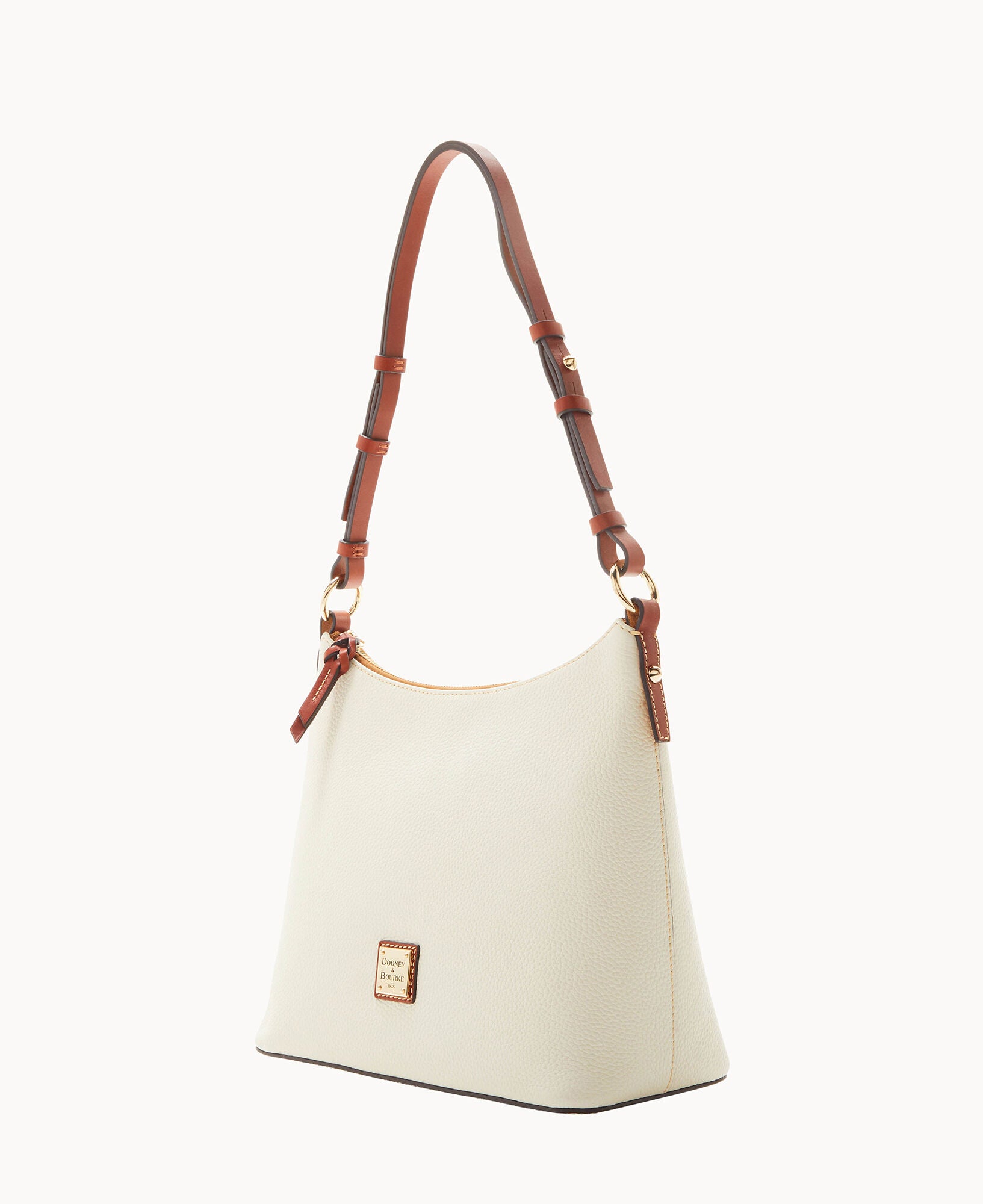 One inside zip pocket. Two inside pockets. Cell phone pocket. Inside key hook. Adjustable shoulder strap. Strap drop length 12″. Lined. Feet. Zipper closure.