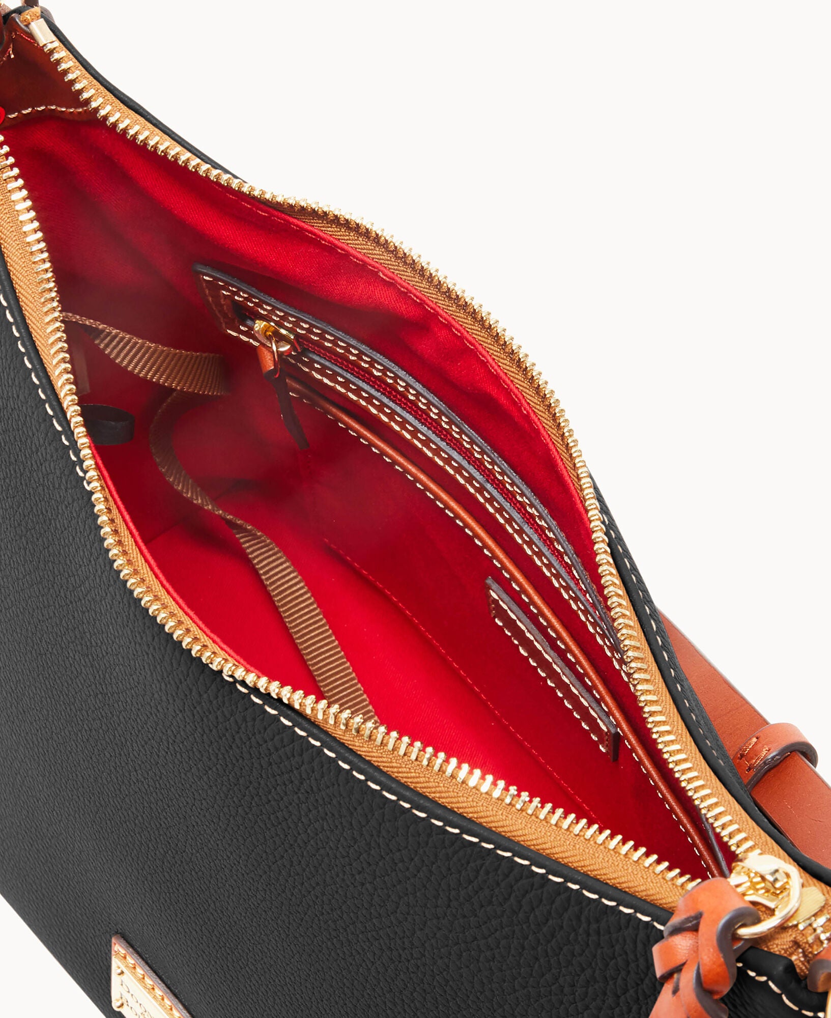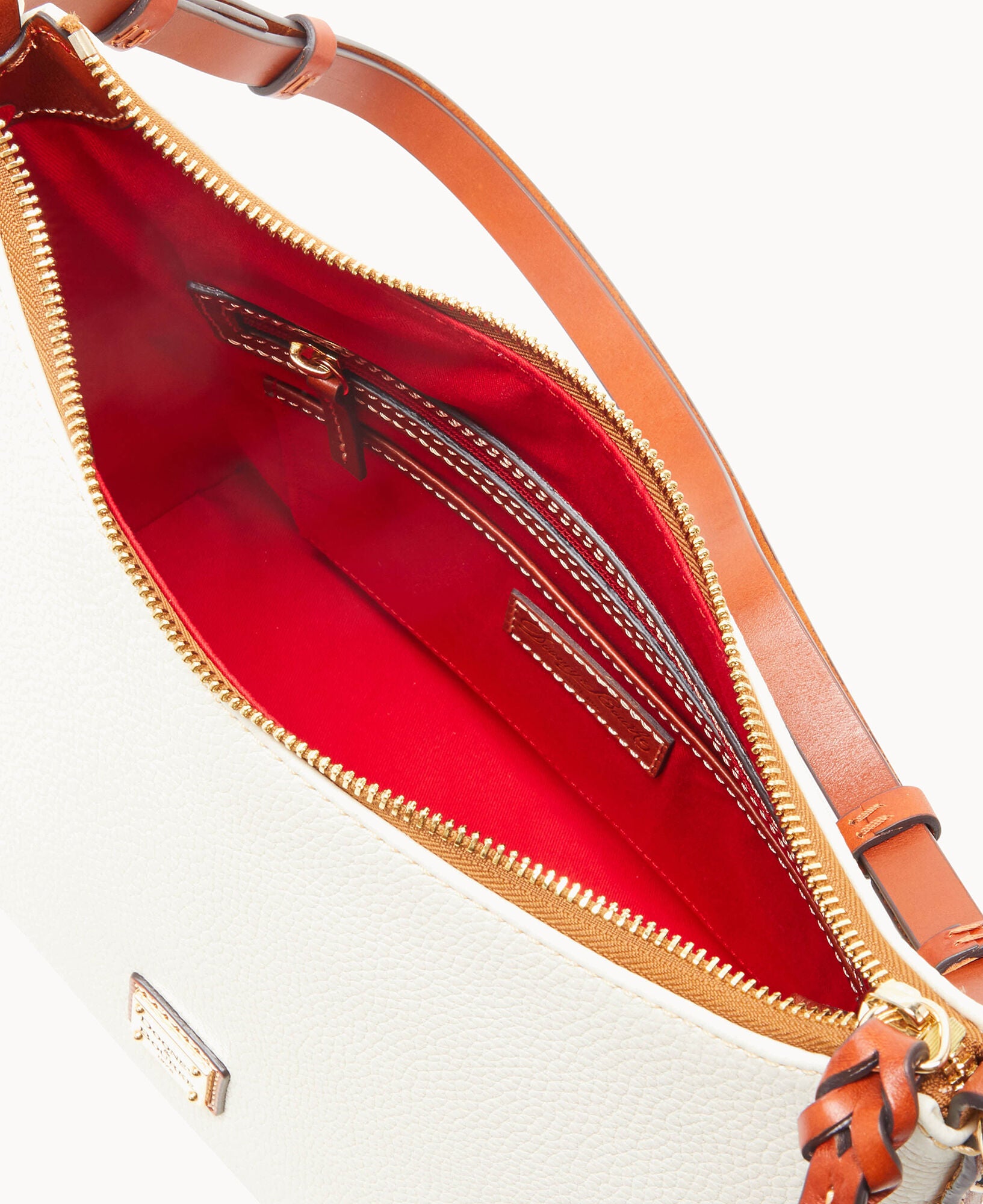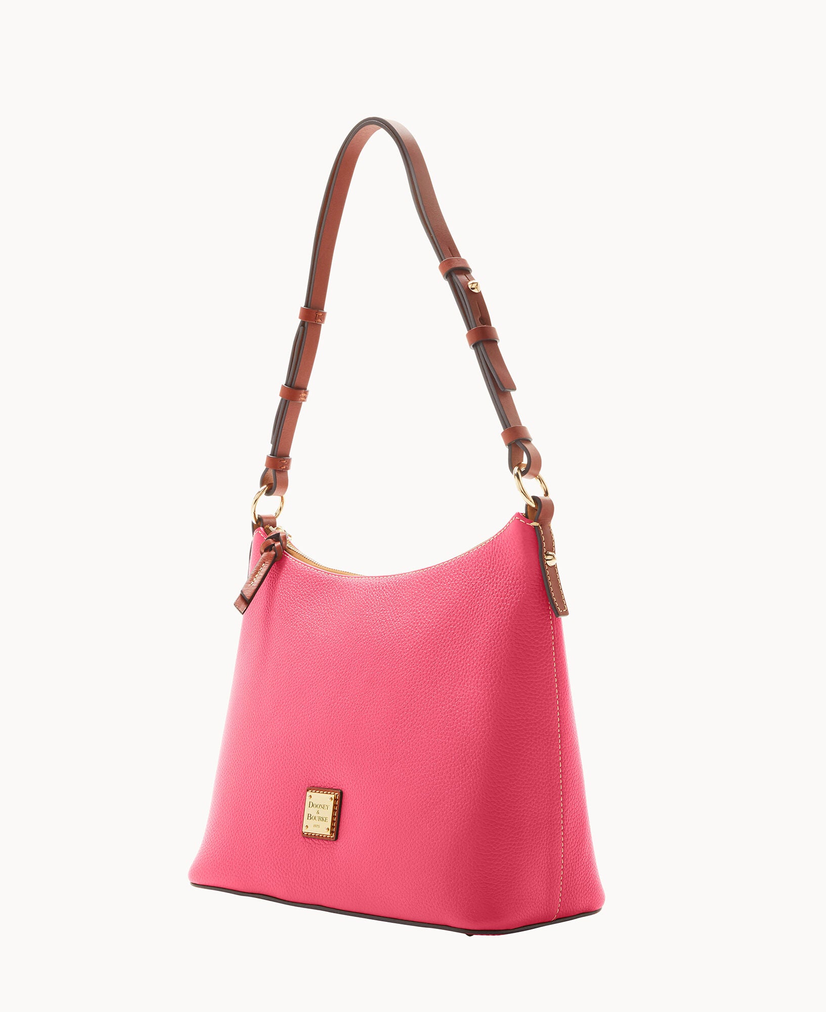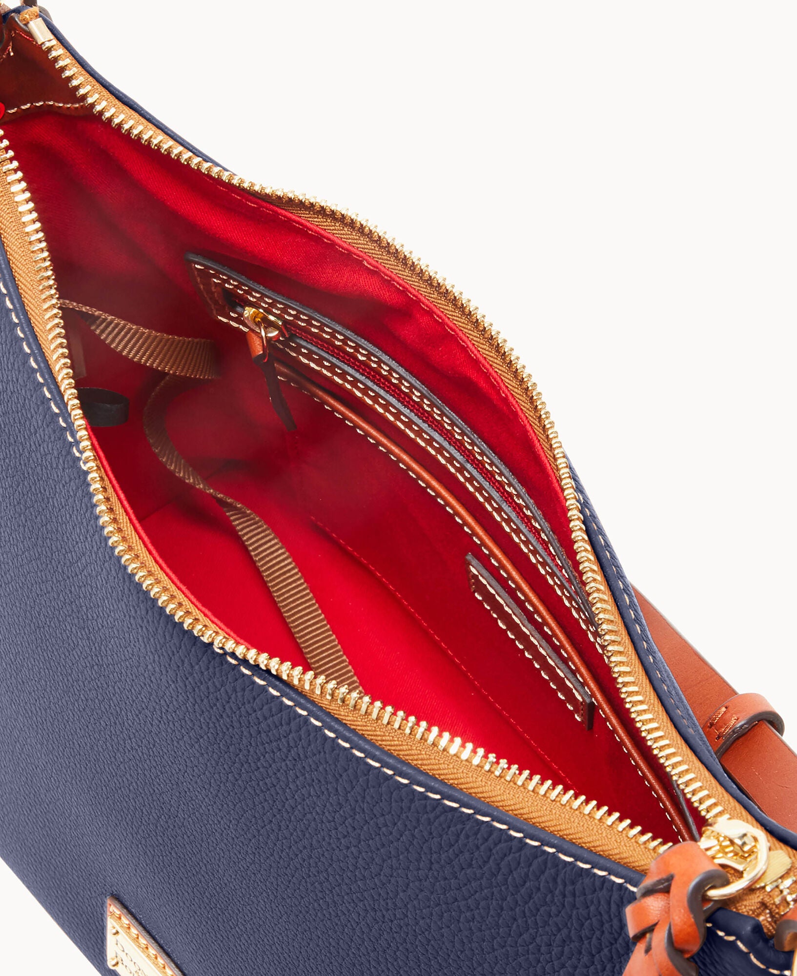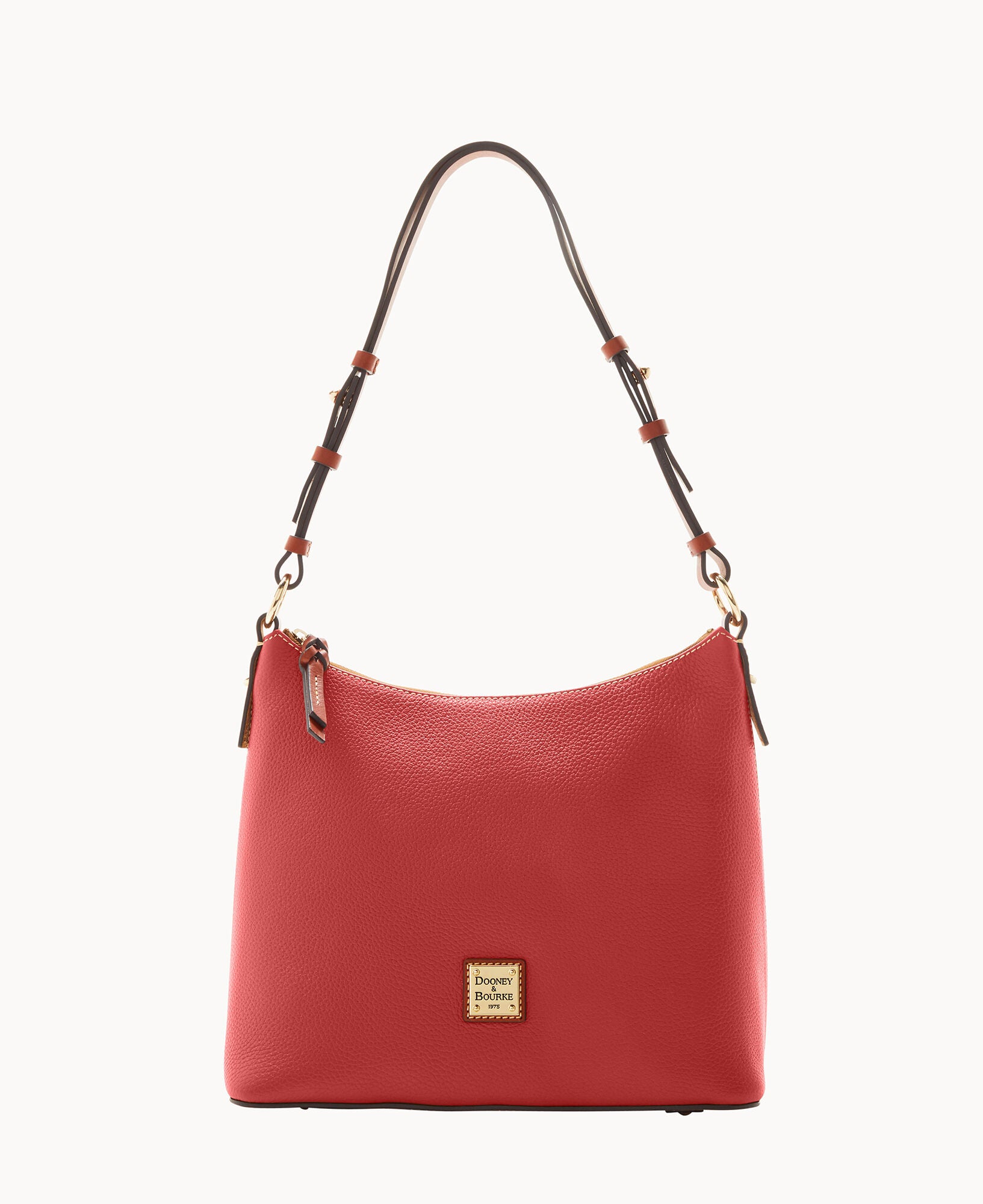 One inside zip pocket. Two inside pockets. Cell phone pocket. Inside key hook. Adjustable shoulder strap. Strap drop length 12″. Lined. Feet. Zipper closure.