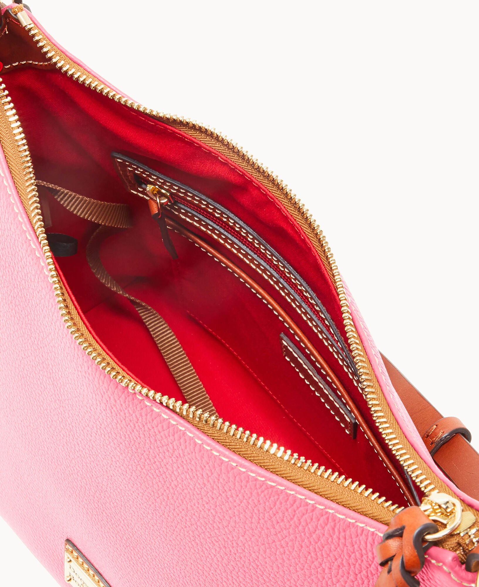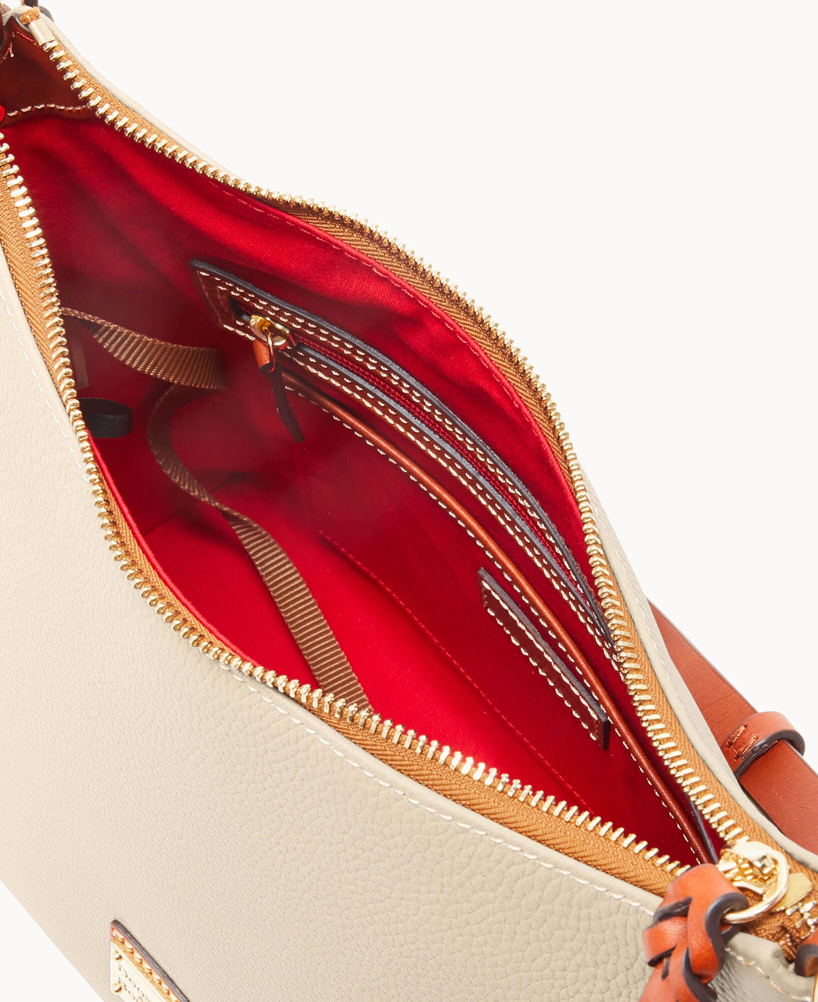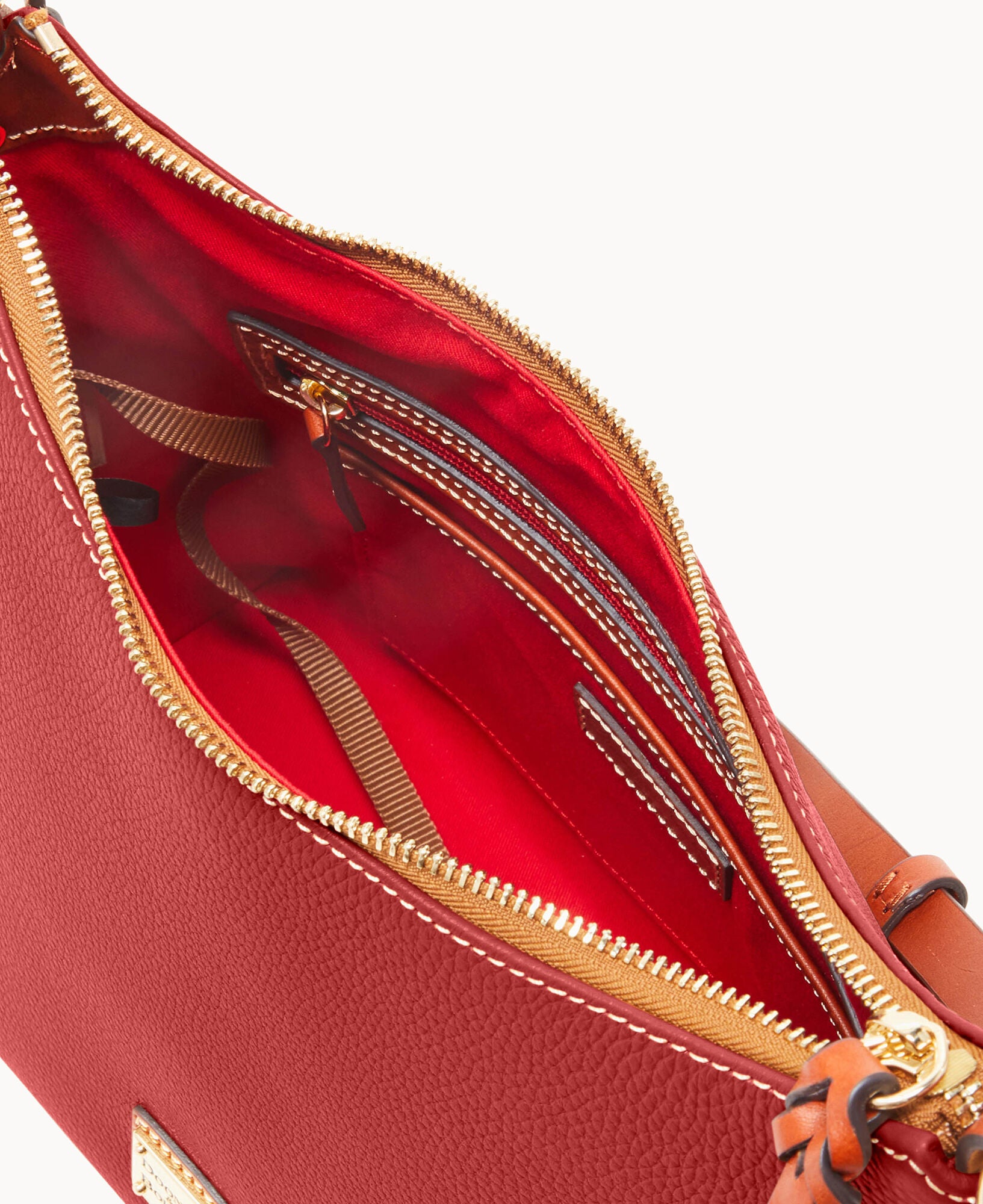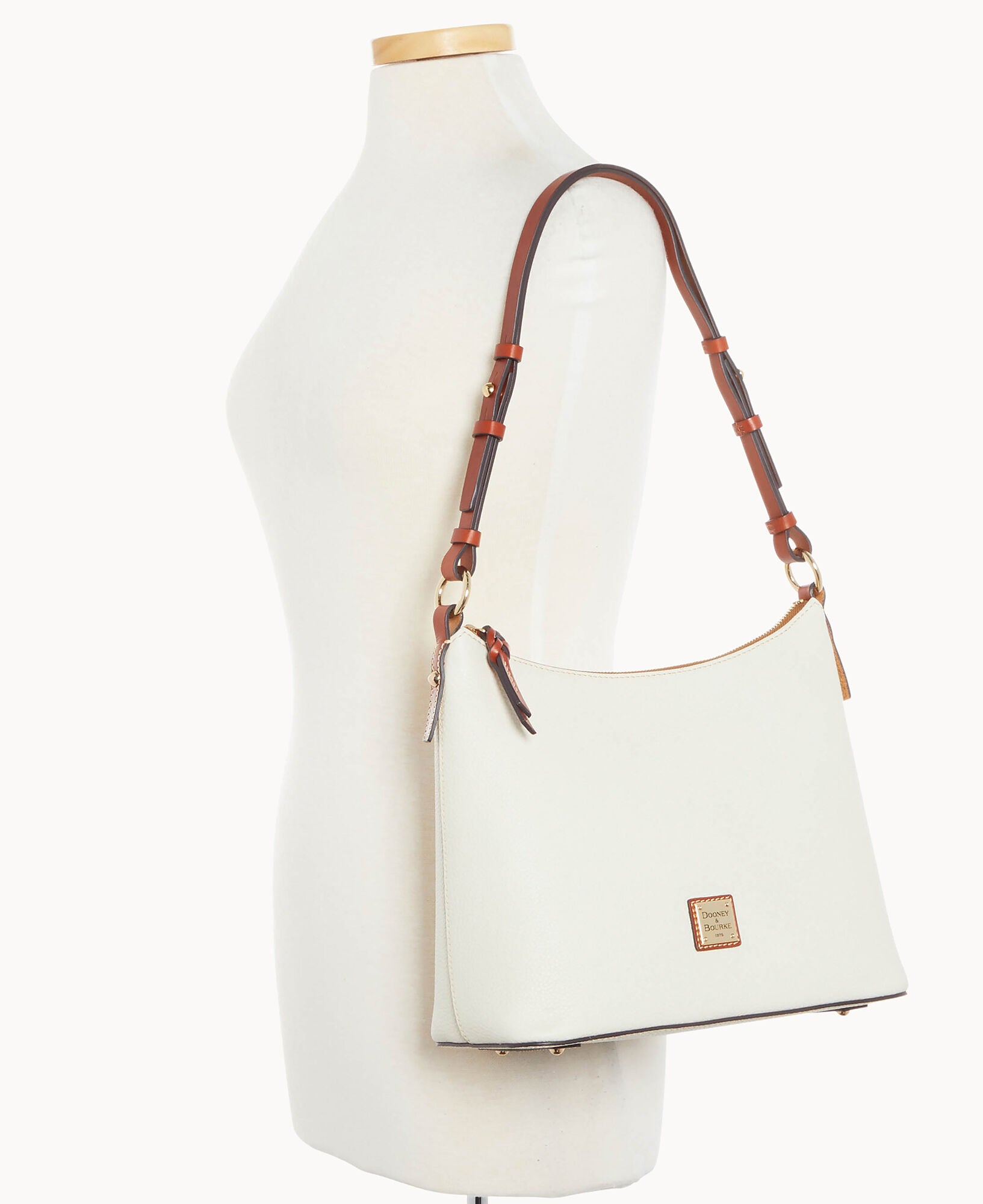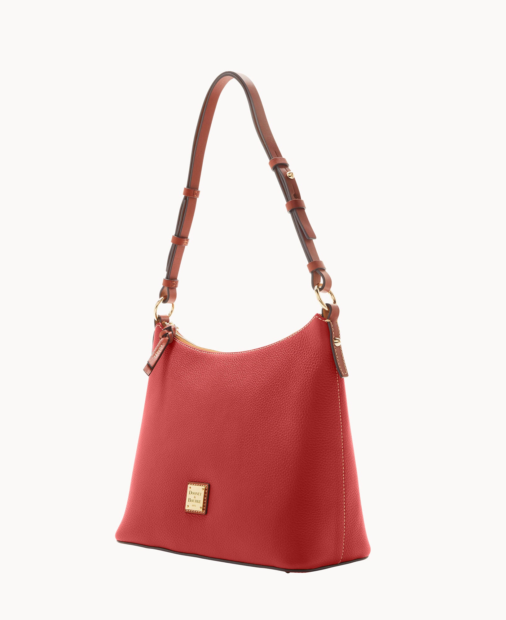One inside zip pocket. Two inside pockets. Cell phone pocket. Inside key hook. Adjustable shoulder strap. Strap drop length 12″. Lined. Feet. Zipper closure.