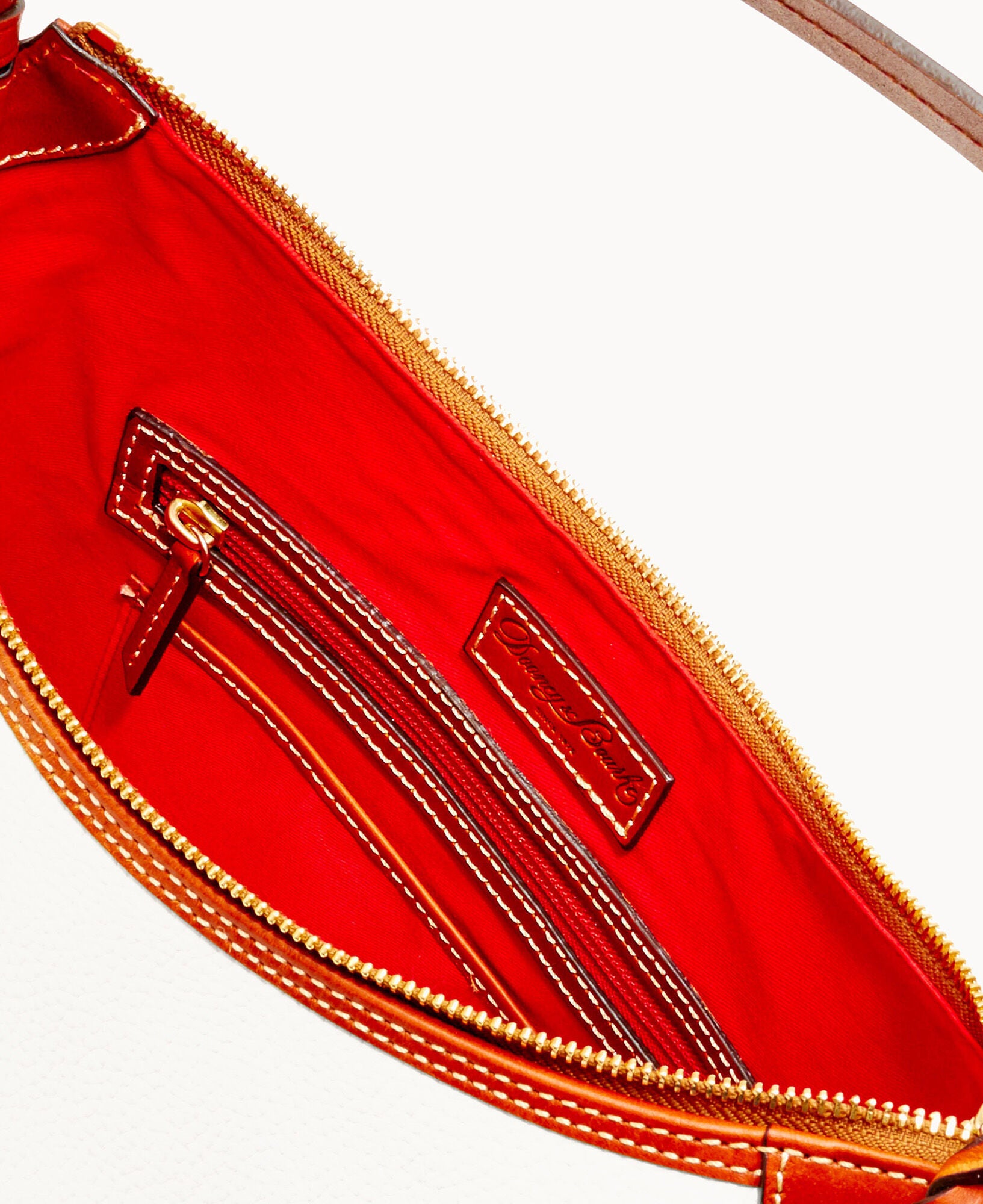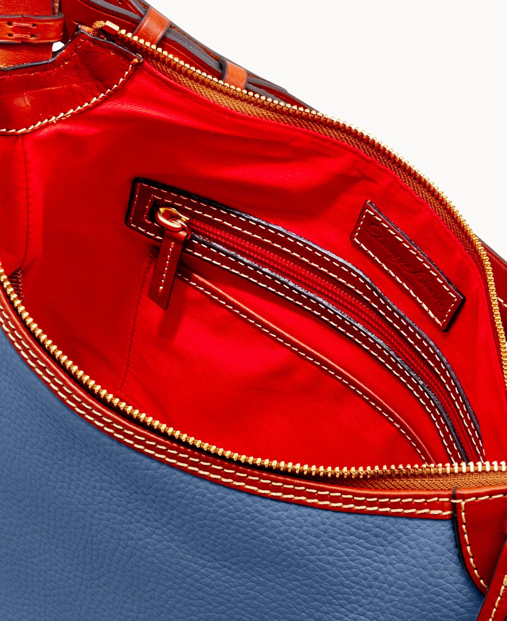 One inside zip pocket. Two inside pockets. Cell phone pocket. Inside key hook. Handle drop length 7.5″. Adjustable shoulder strap. Strap drop length 8″. Lined. Feet. Zipper closure.
