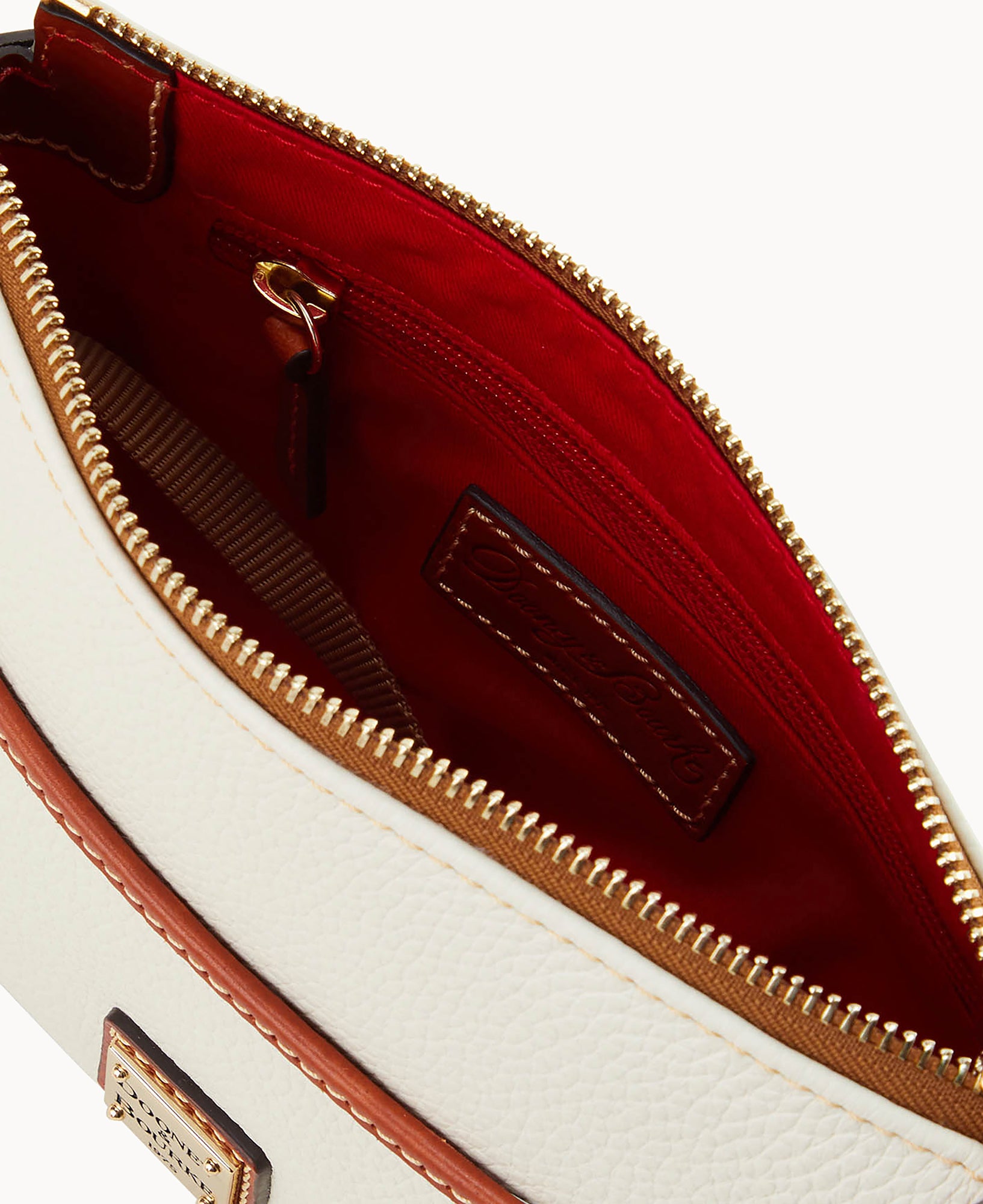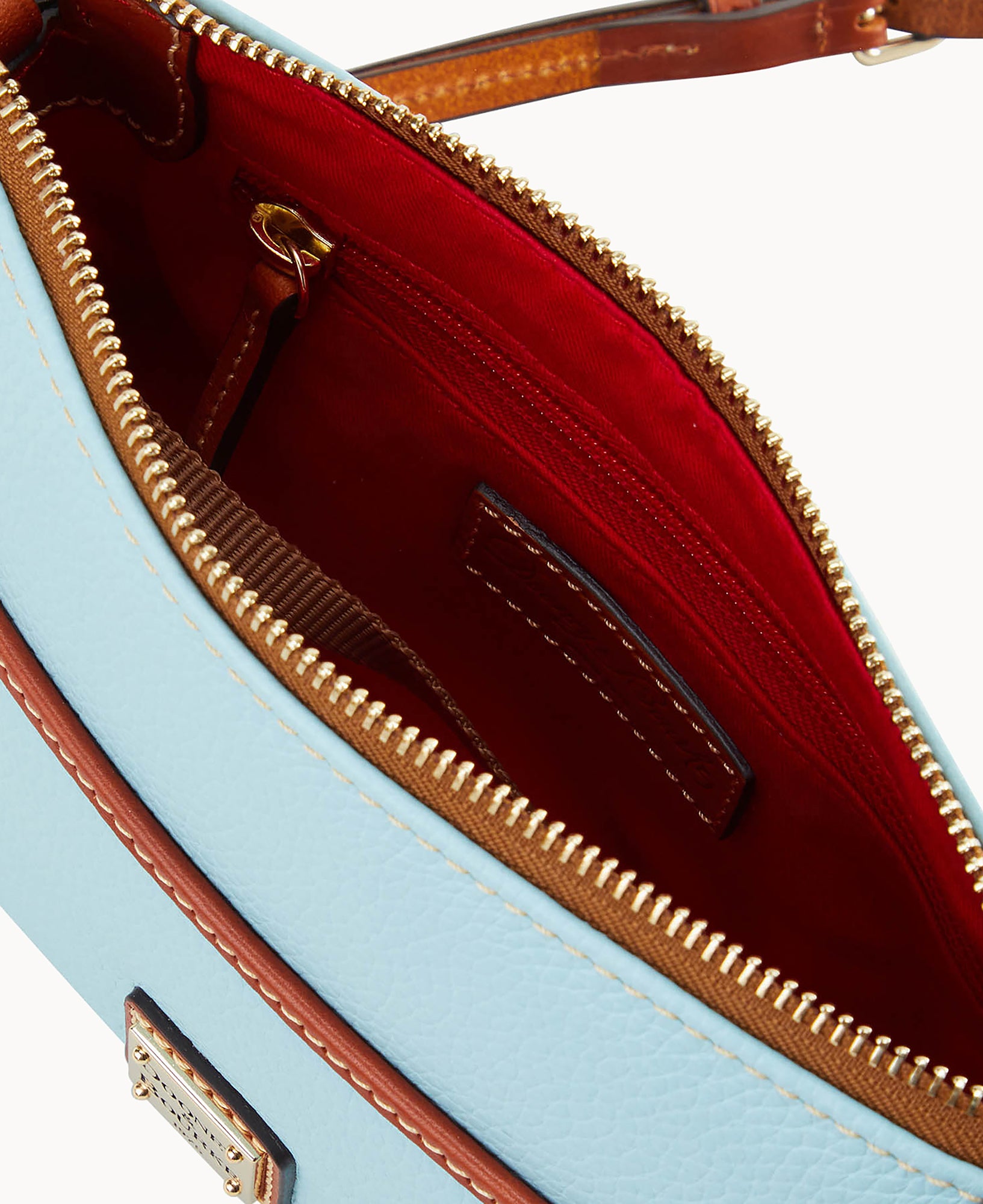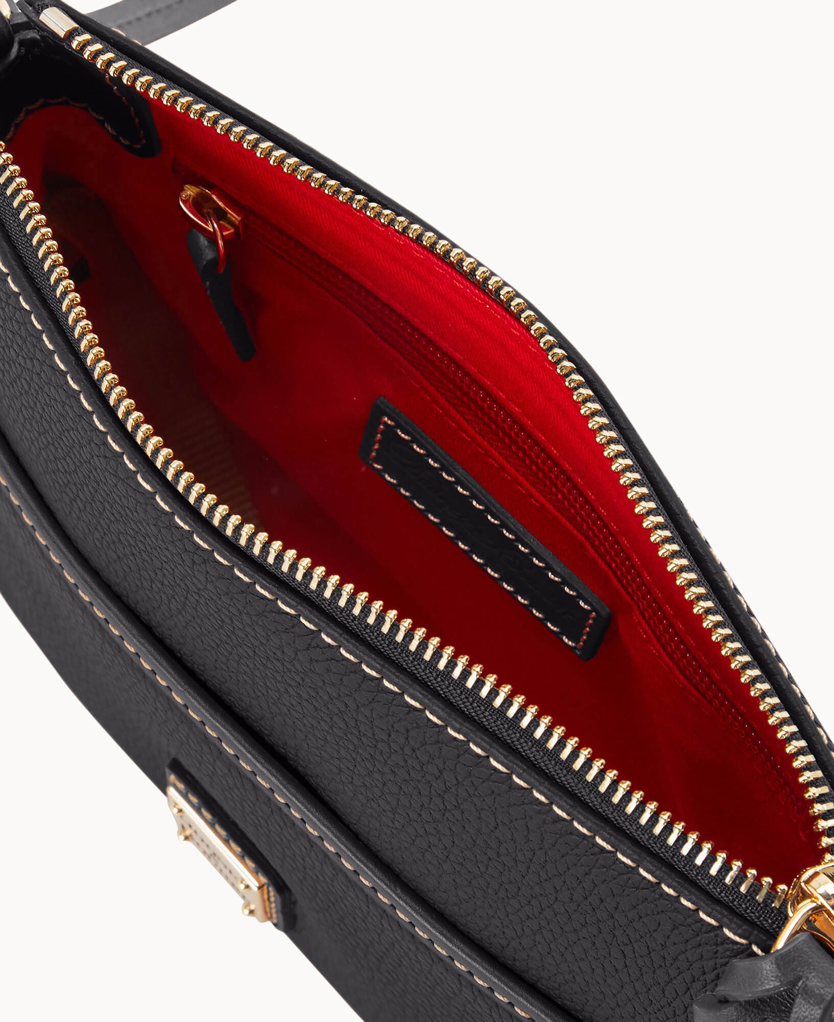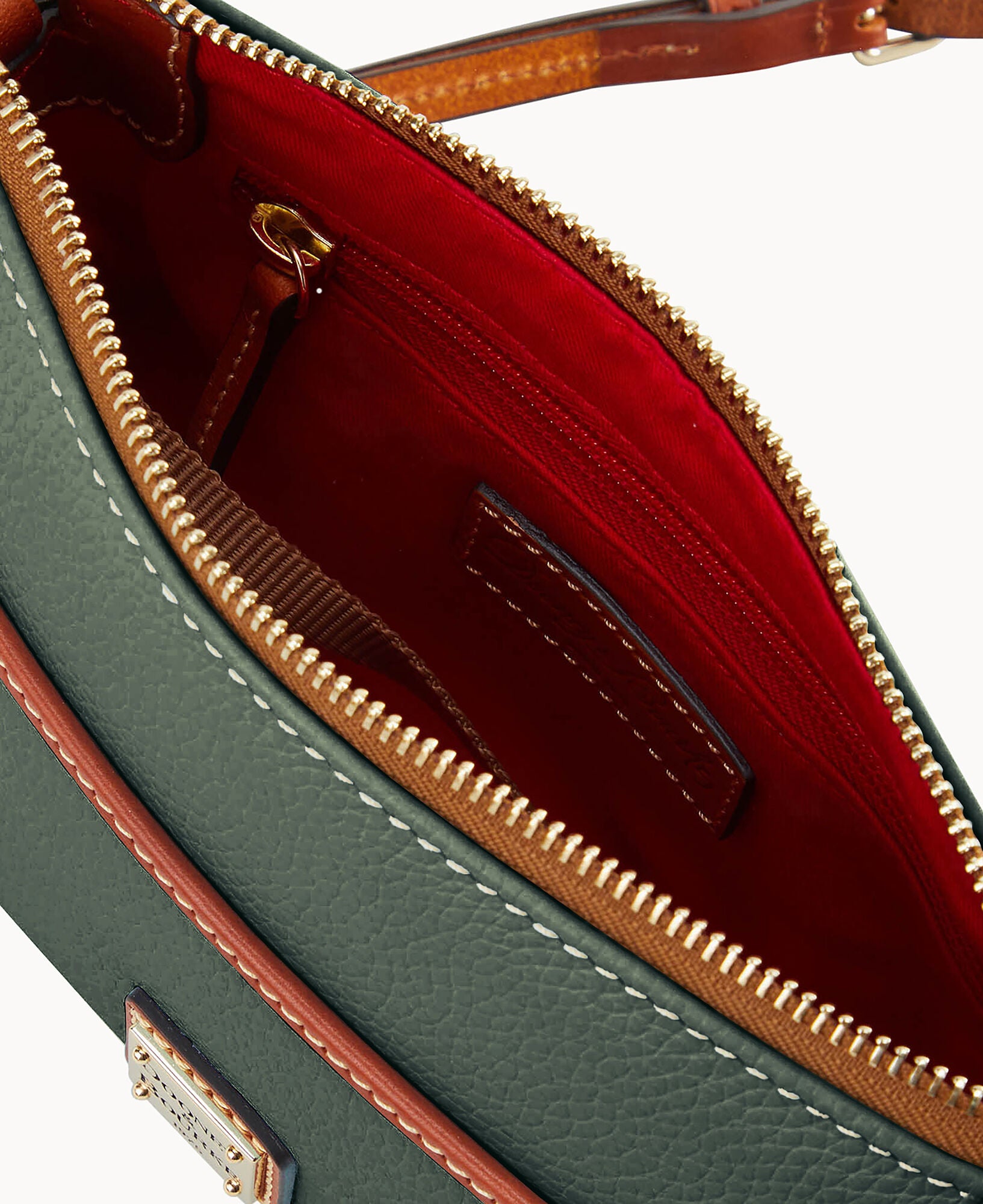 Two outside slip pockets. One inside zip pocket. One inside slip pocket. Inside key hook. Lined. Zipper closure. Strap drop length 28″.