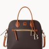 One outside zip pocket. One inside zip pocket. Two inside pockets. Cell phone pocket. Inside key hook. Adjustable handle. Handle drop length 9.5″. Lined. Feet. Zipper closure.
