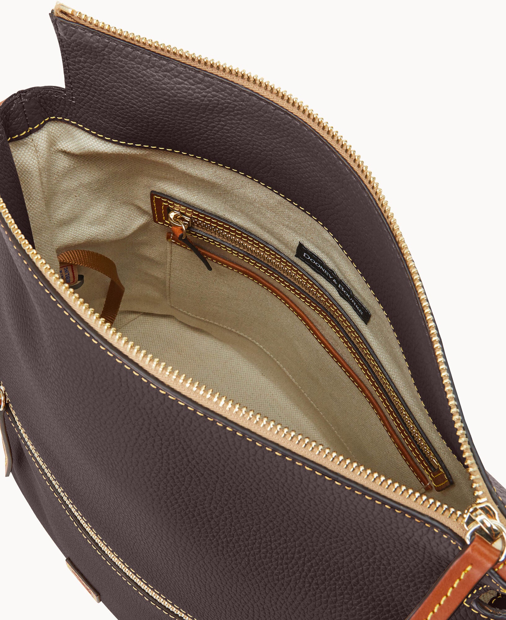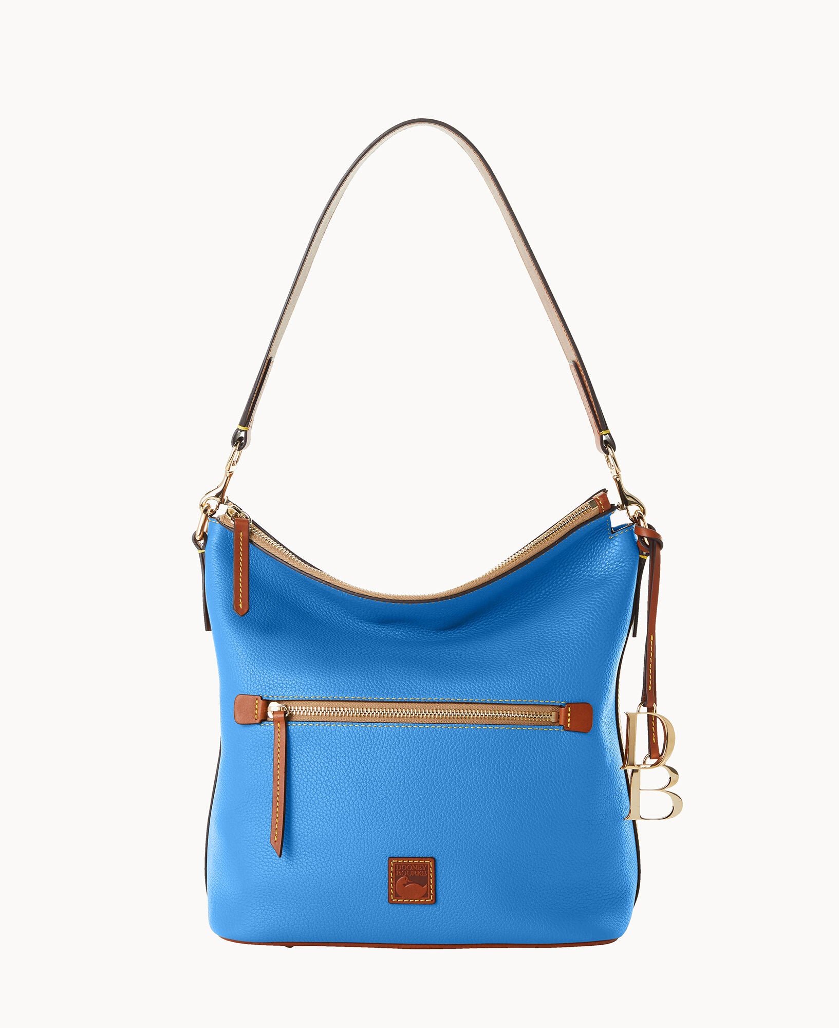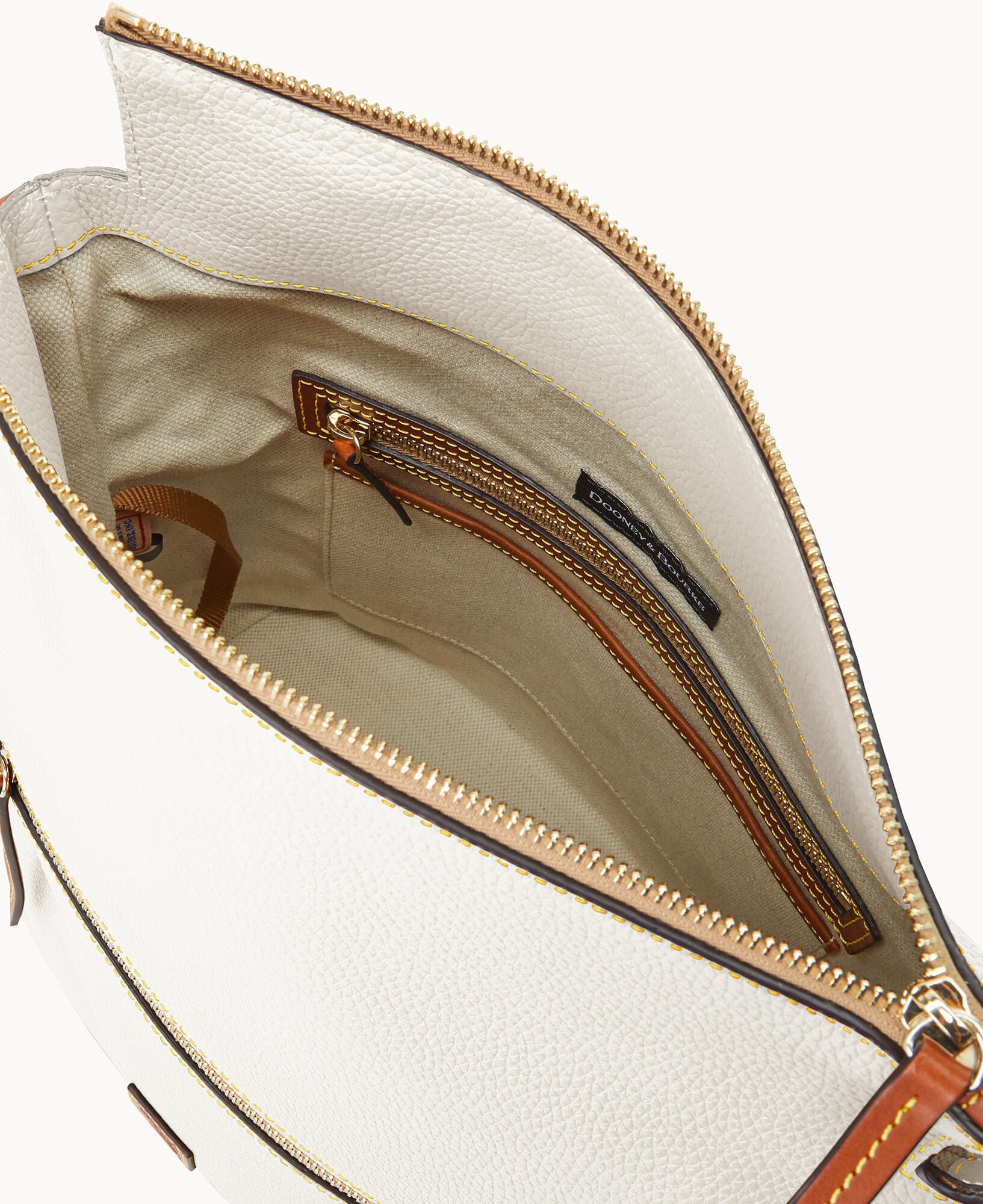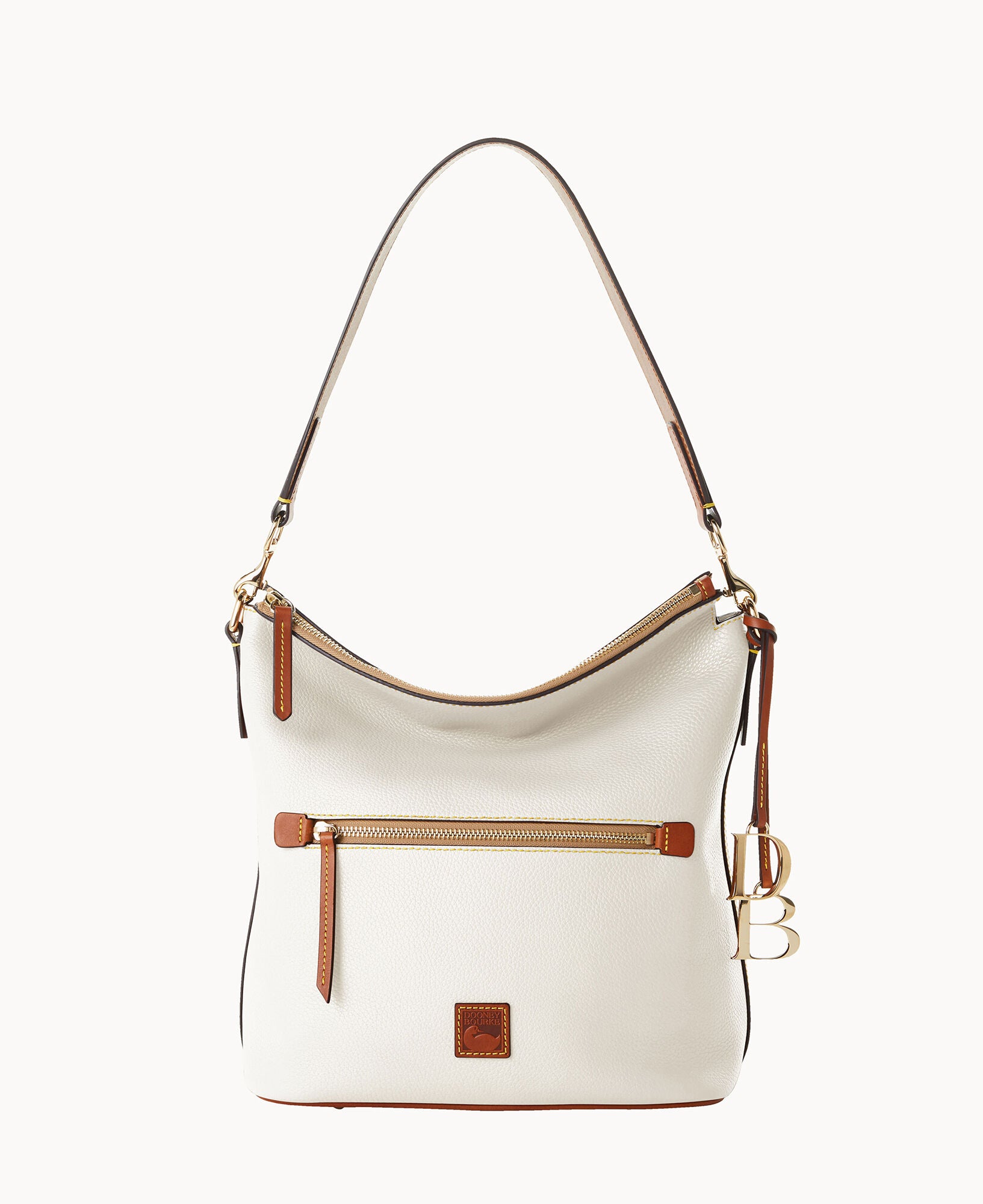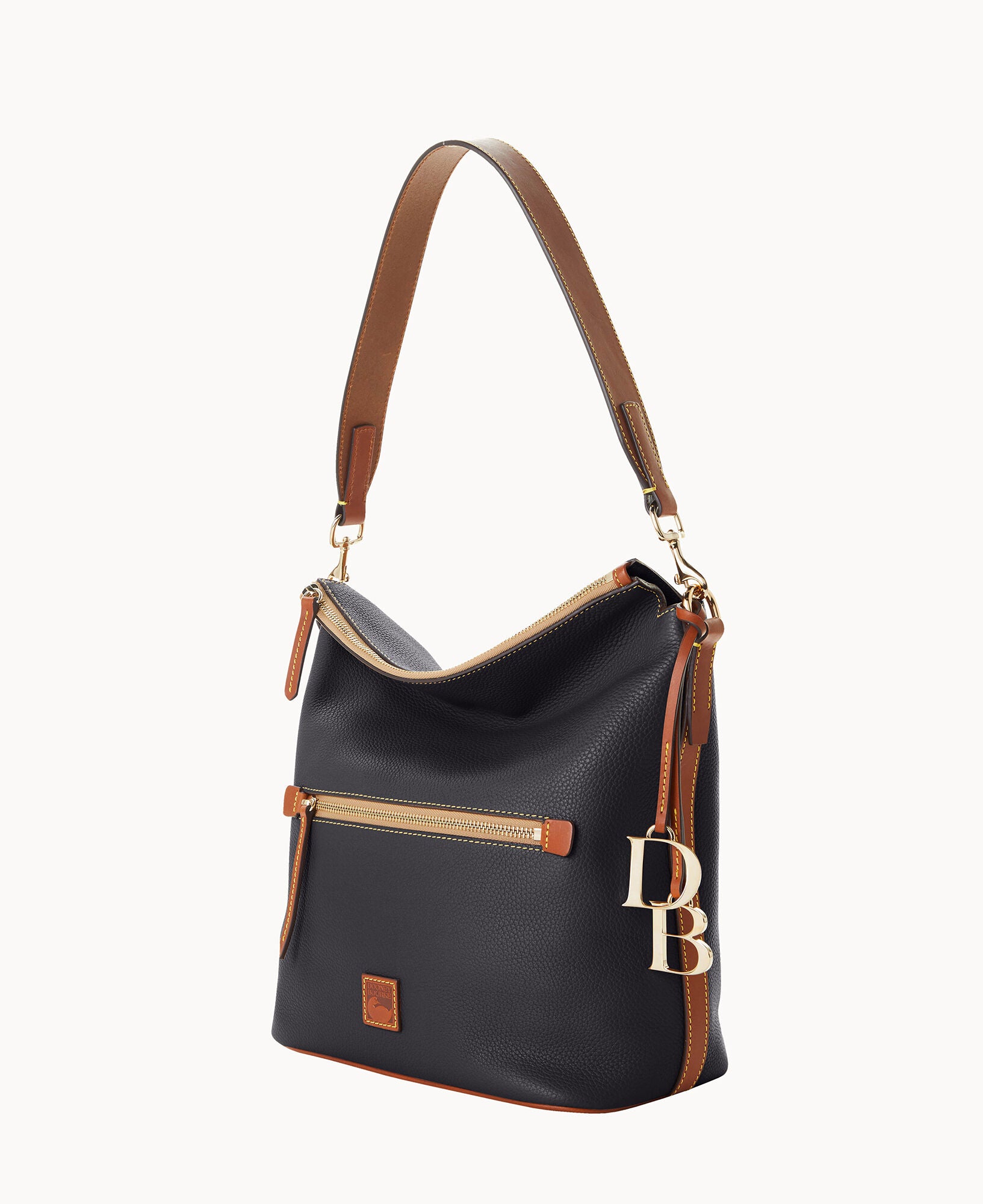 One outside zip pocket. One inside zip pocket. Two inside pockets. Cell phone pocket. Inside key hook. Handle length 13″. Lined. Zipper closure. Removable DB medallion.