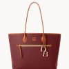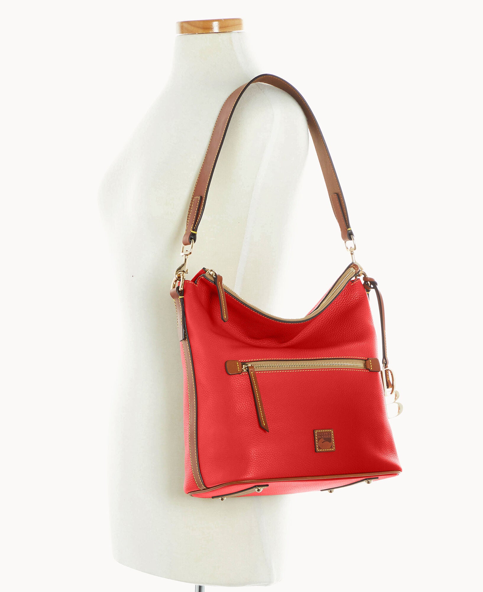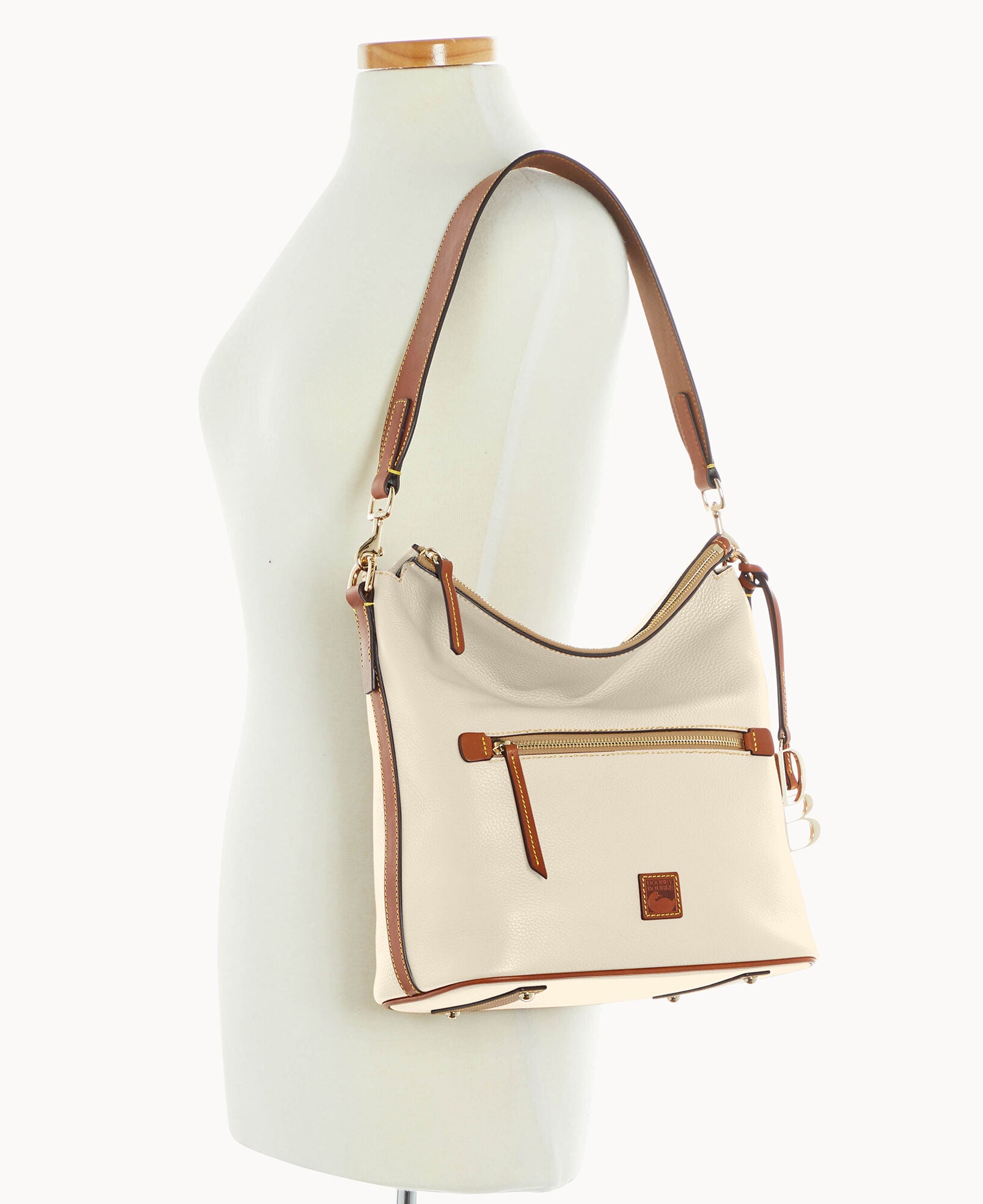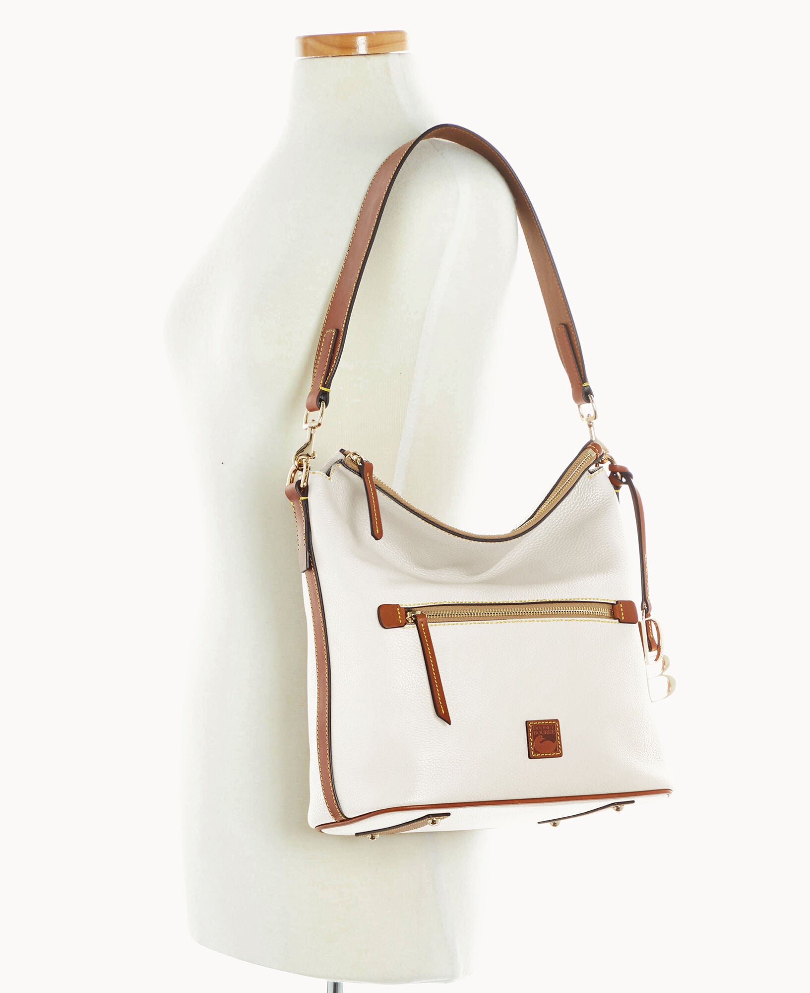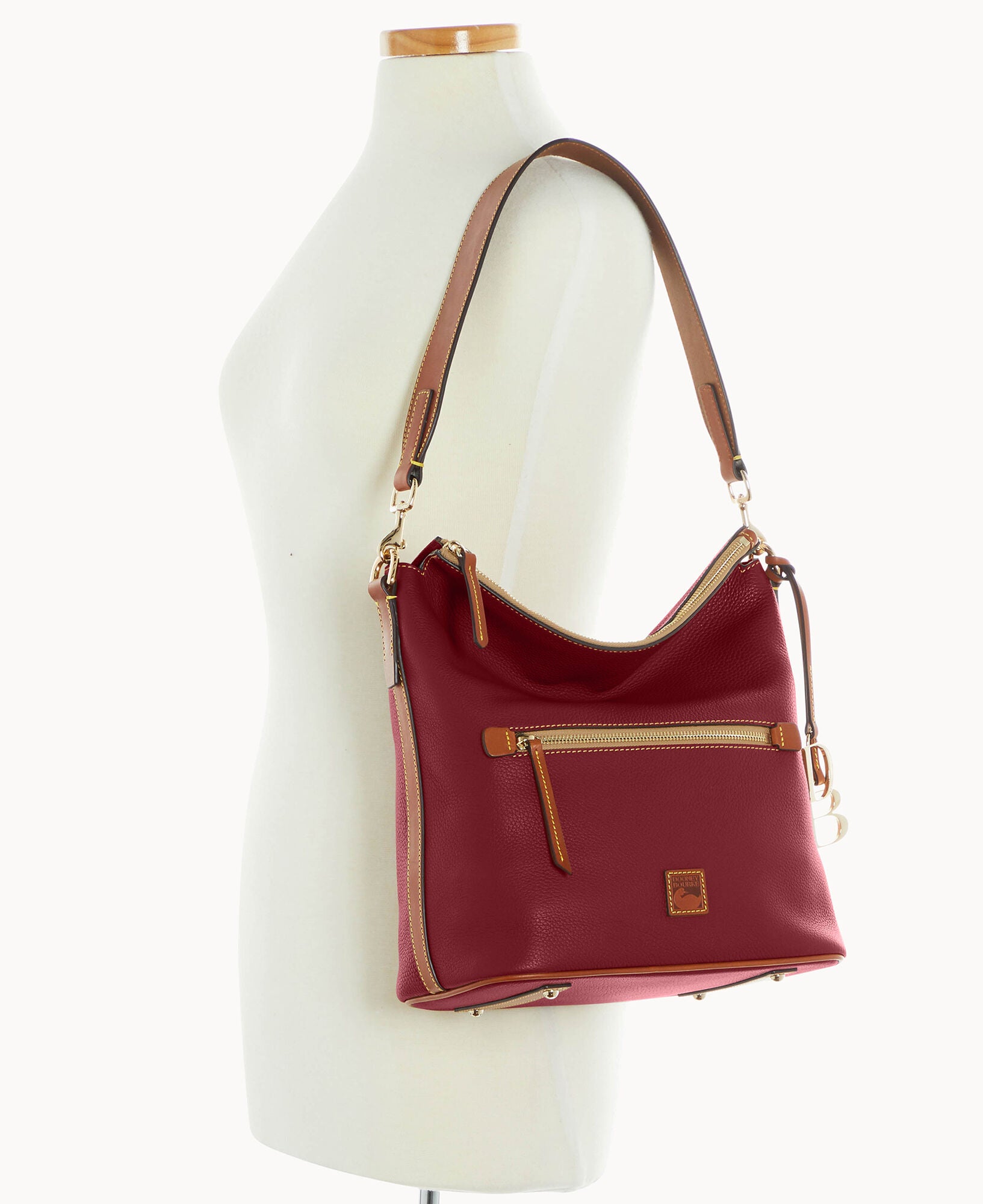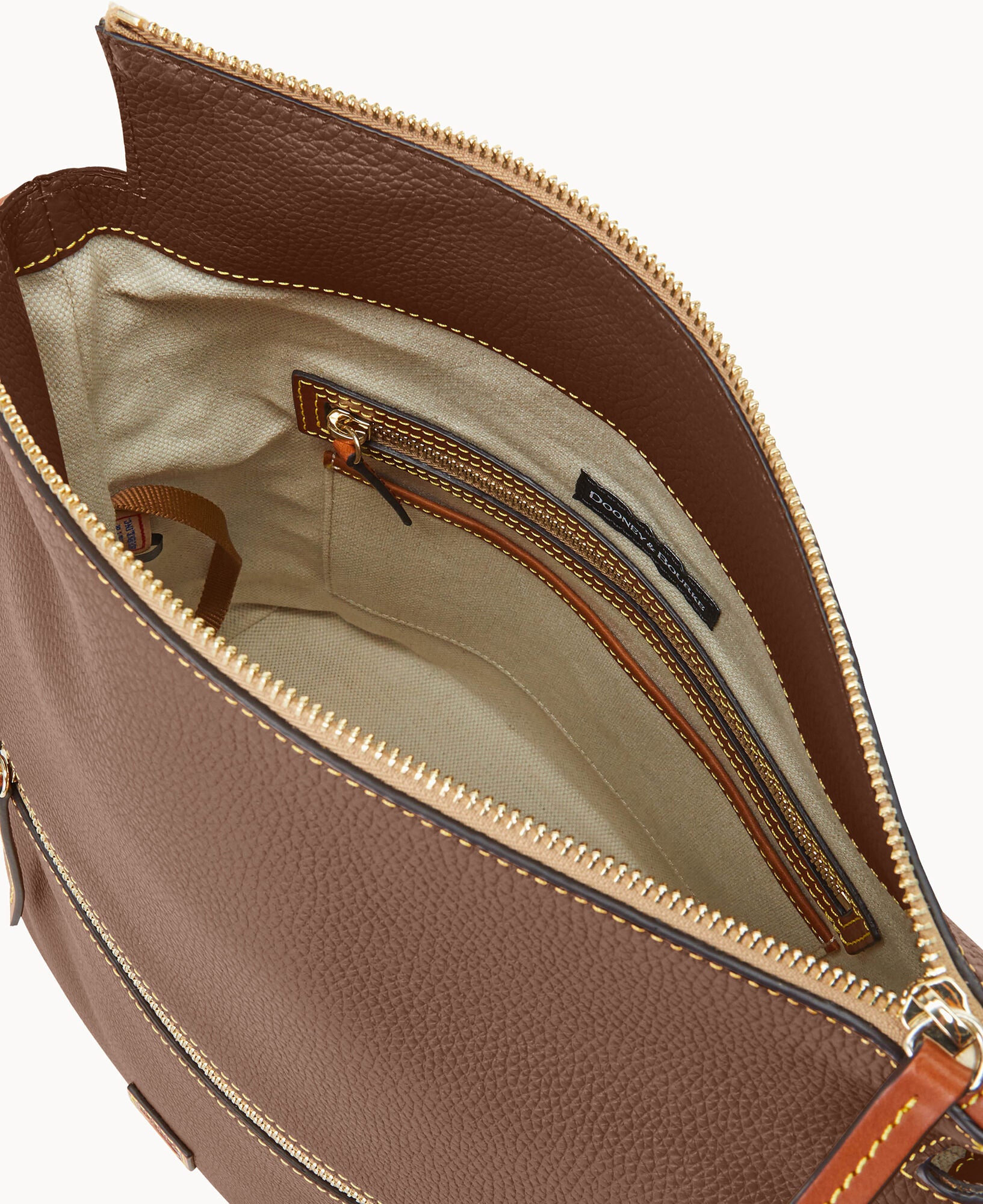 One outside zip pocket. One inside zip pocket. Two inside pockets. Cell phone pocket. Inside key hook. Handle length 13″. Lined. Zipper closure. Removable DB medallion.