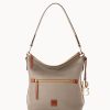 One outside zip pocket. One inside zip pocket. Two inside pockets. Cell phone pocket. Inside key hook. Handle drop length 10.5″. Strap drop length 10.5″. Feet. Lined. Zipper closure.