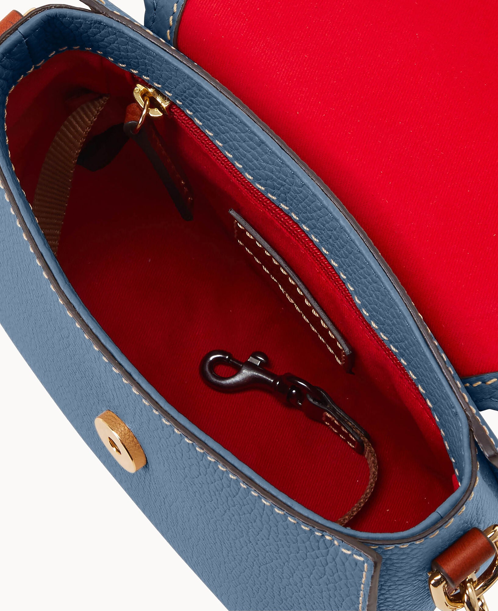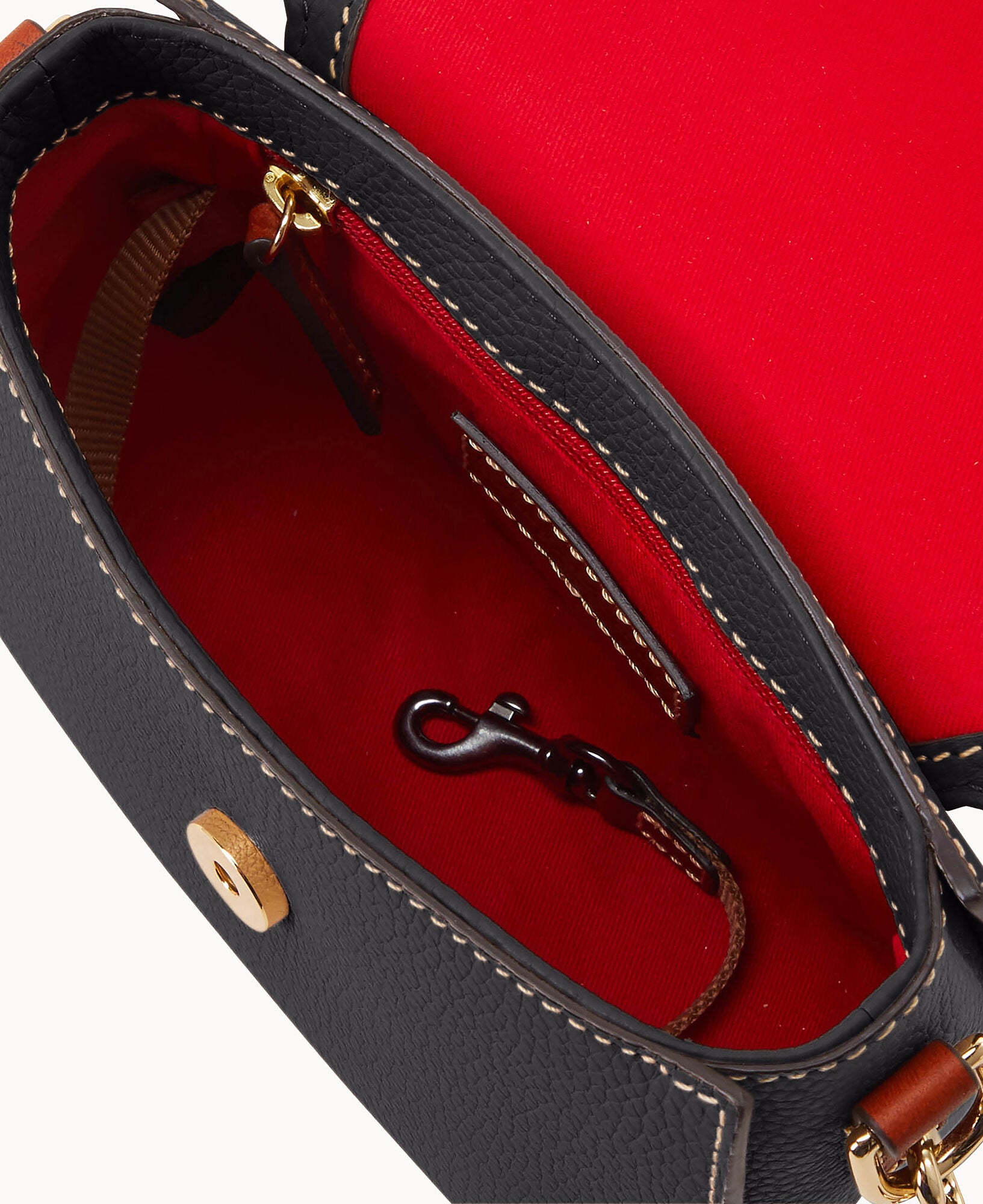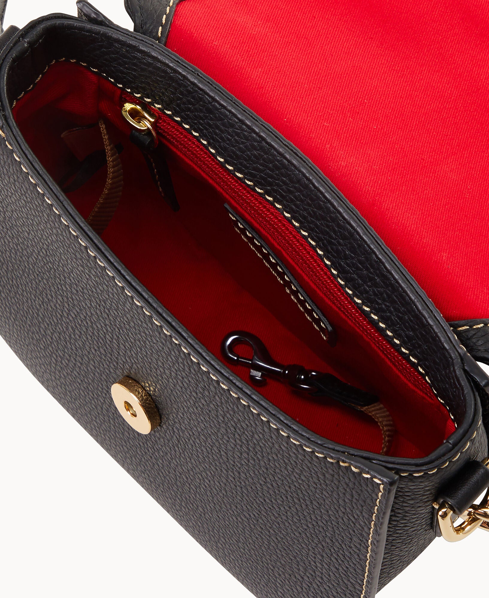 One exterior zip pocket. One interior zip pocket. One interior slip pocket. Interior key hook. Removable strap. Adjustable strap. Lined. Strap drop length 26″. Magnetic snap closure.