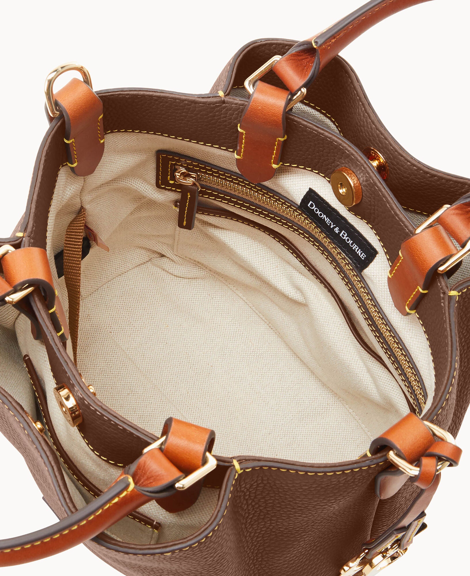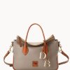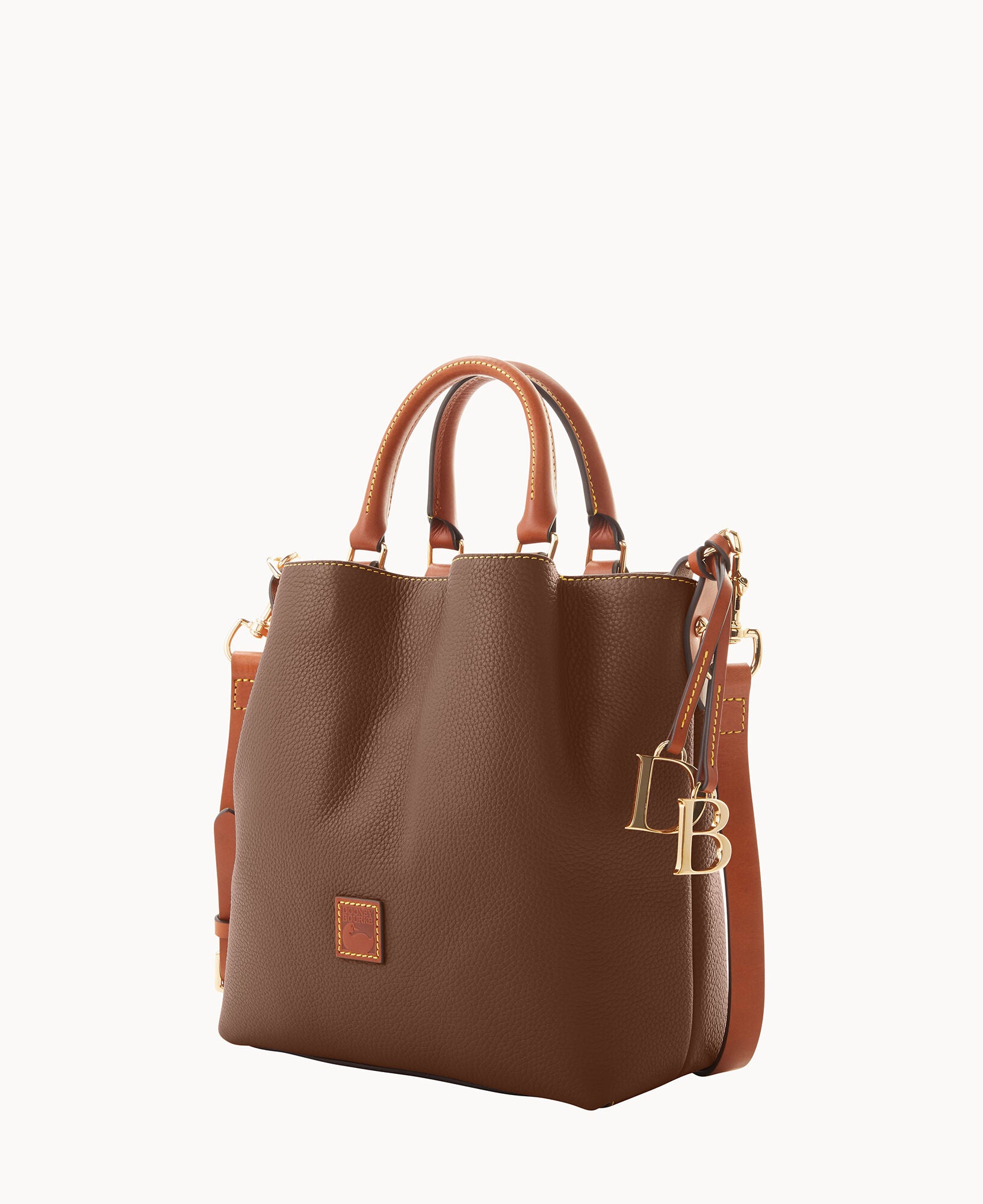 Two outside pockets. One inside zip pocket. Two inside pockets. One inside credit card slot. Cell phone pocket. Inside key hook. Adjustable shoulder strap. Handle drop length 4.50″. Strap drop length 18.00″. Lined. Feet. Snap closure.