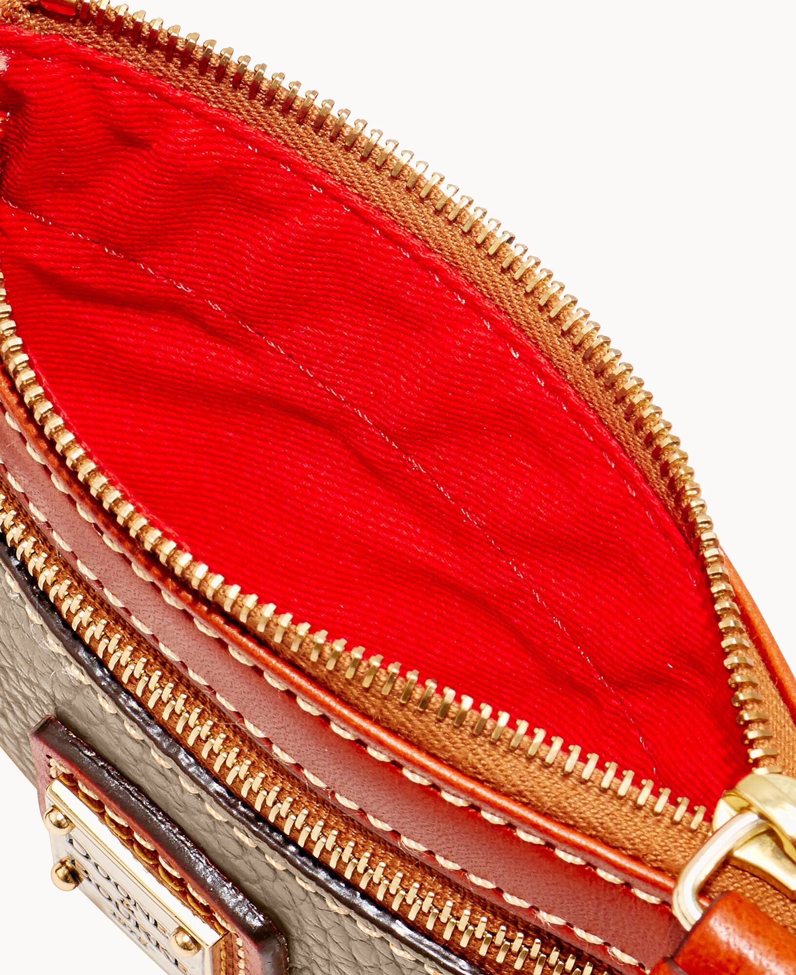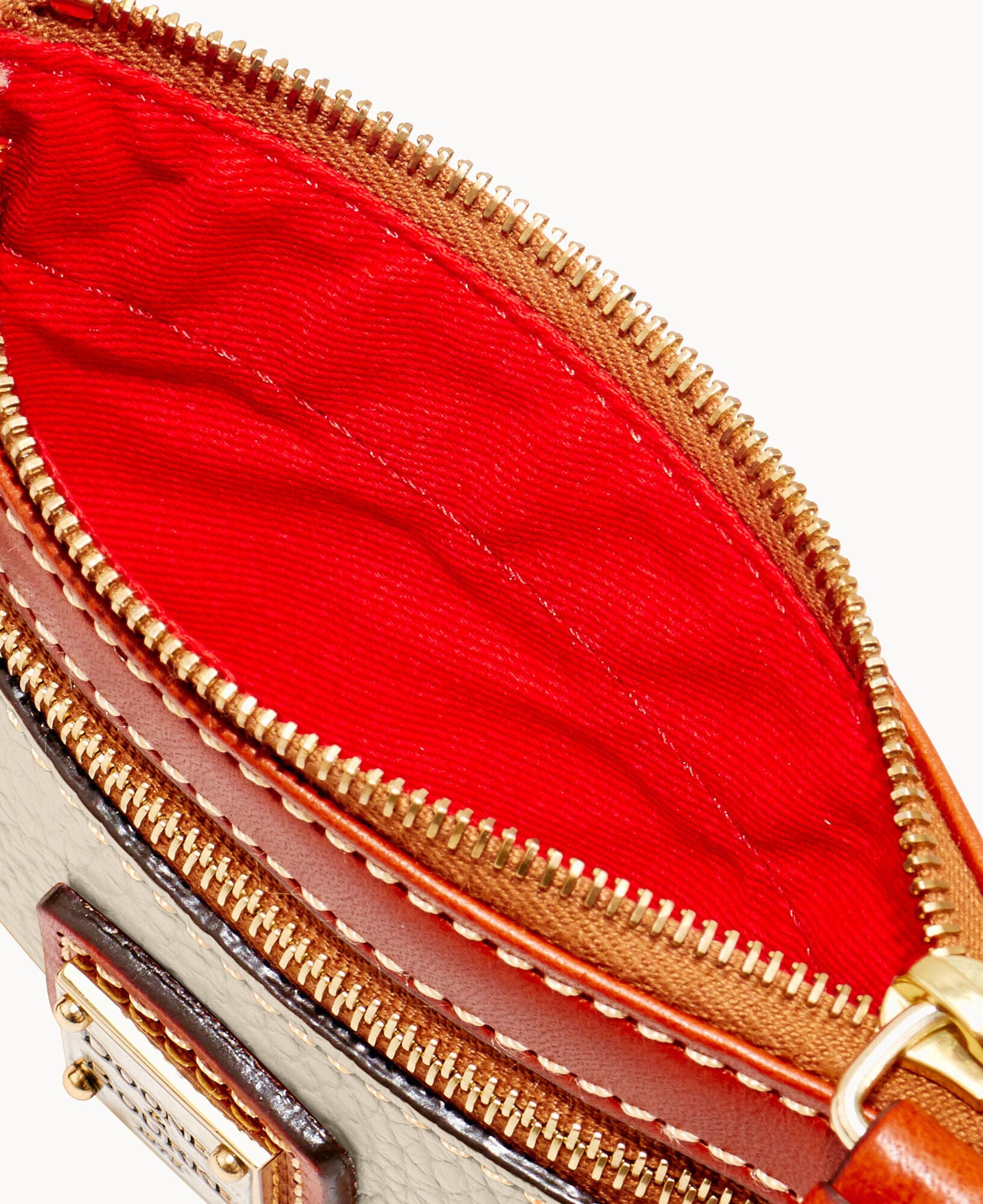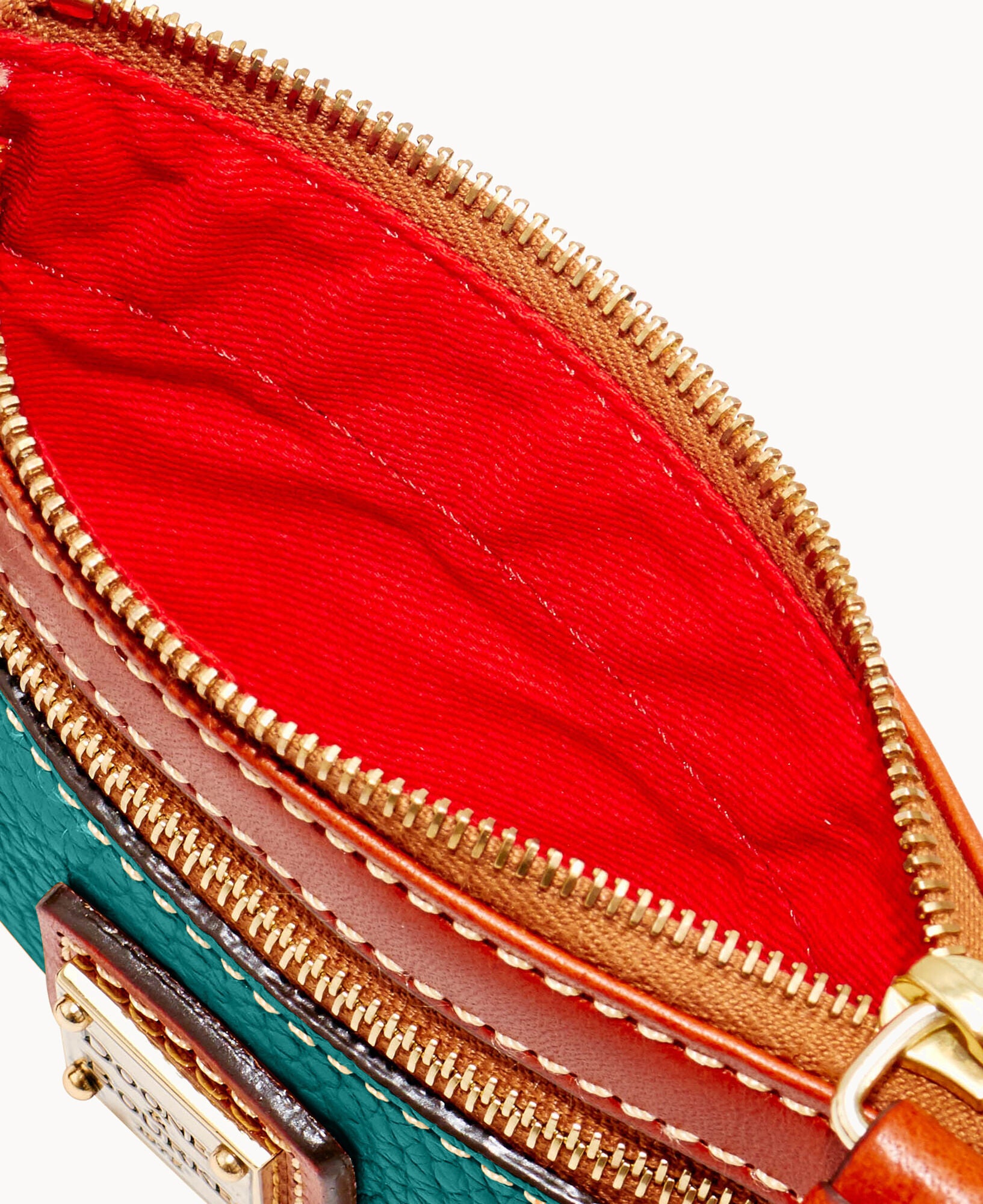 One outside zip pocket. Inside key ring. Lined. Zipper closure.
