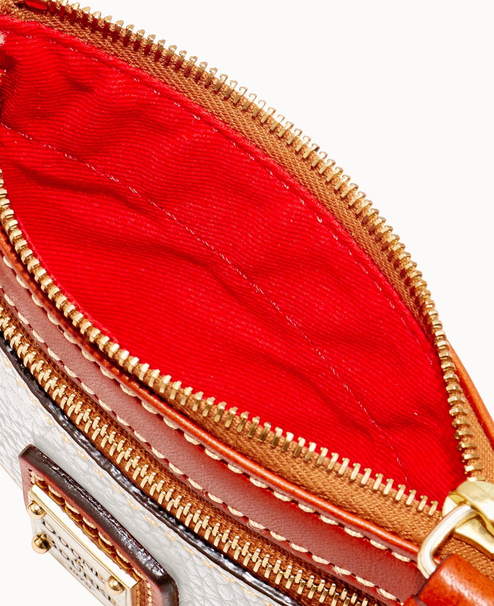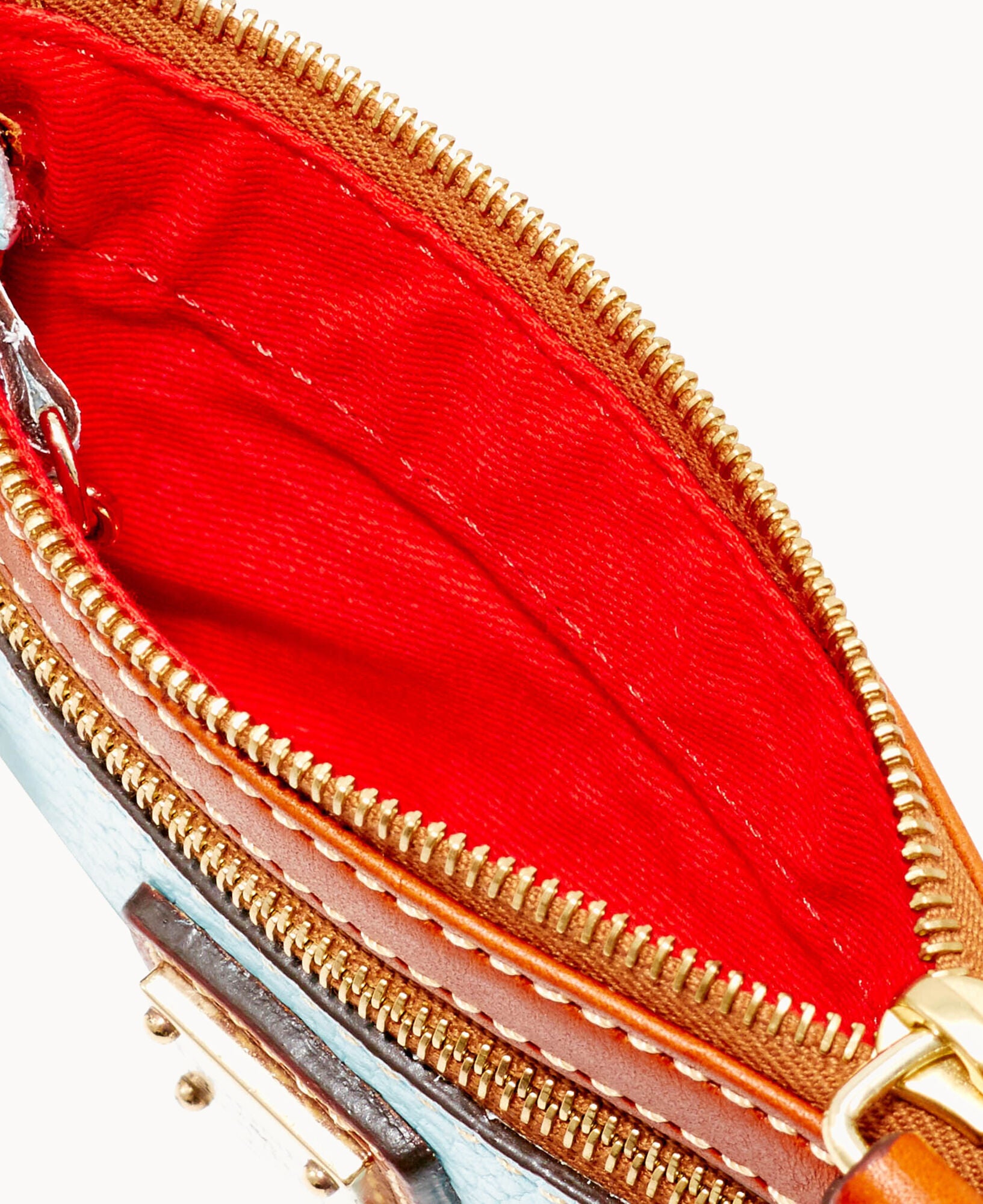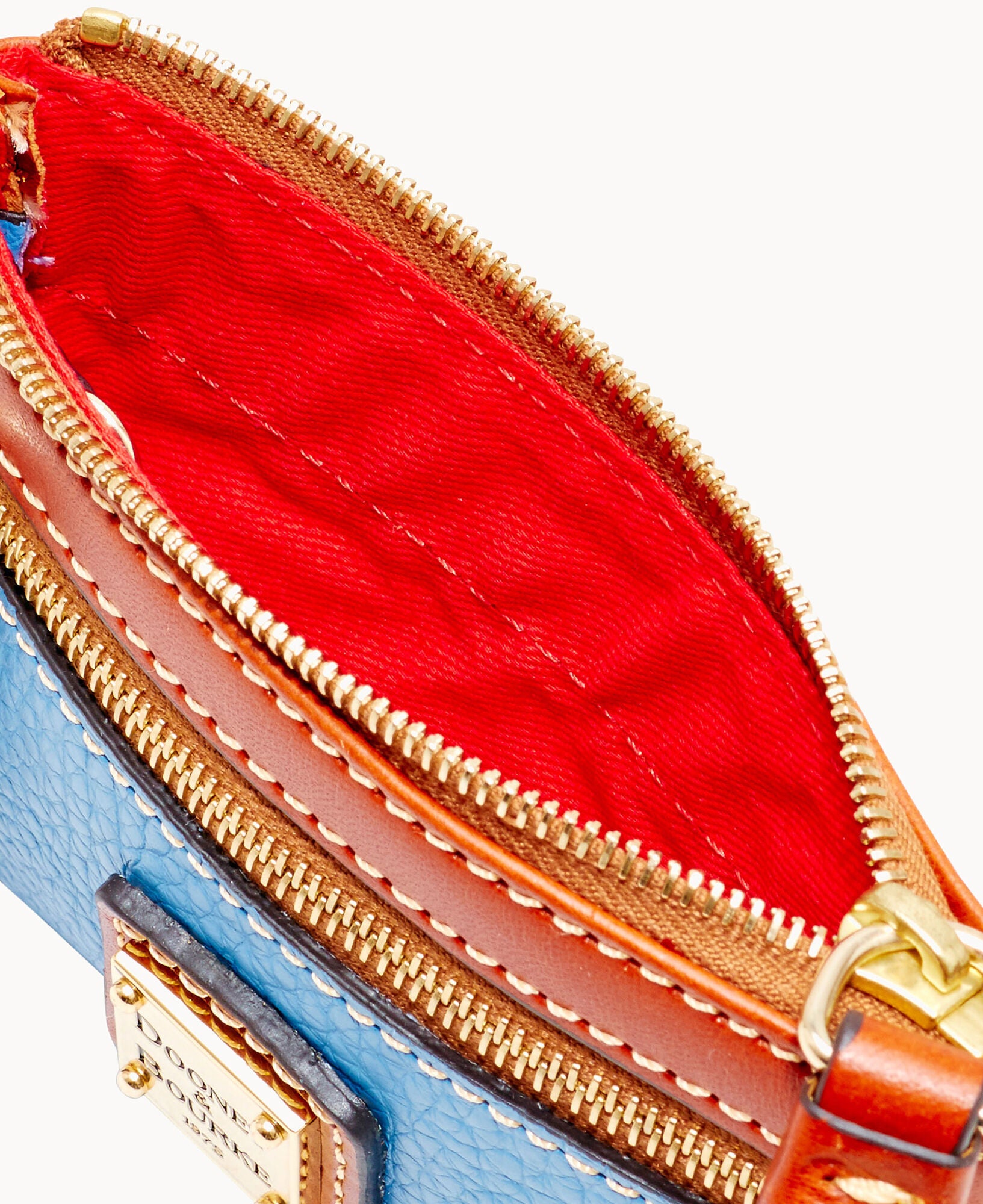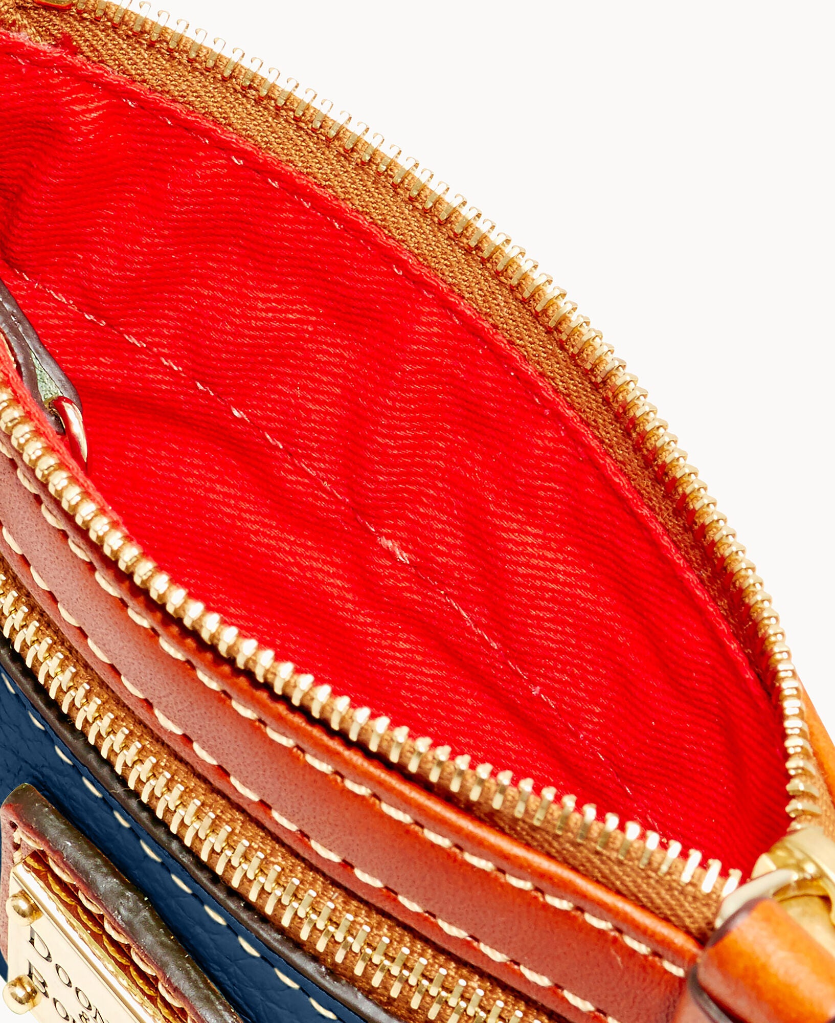 One outside zip pocket. Inside key ring. Lined. Zipper closure.