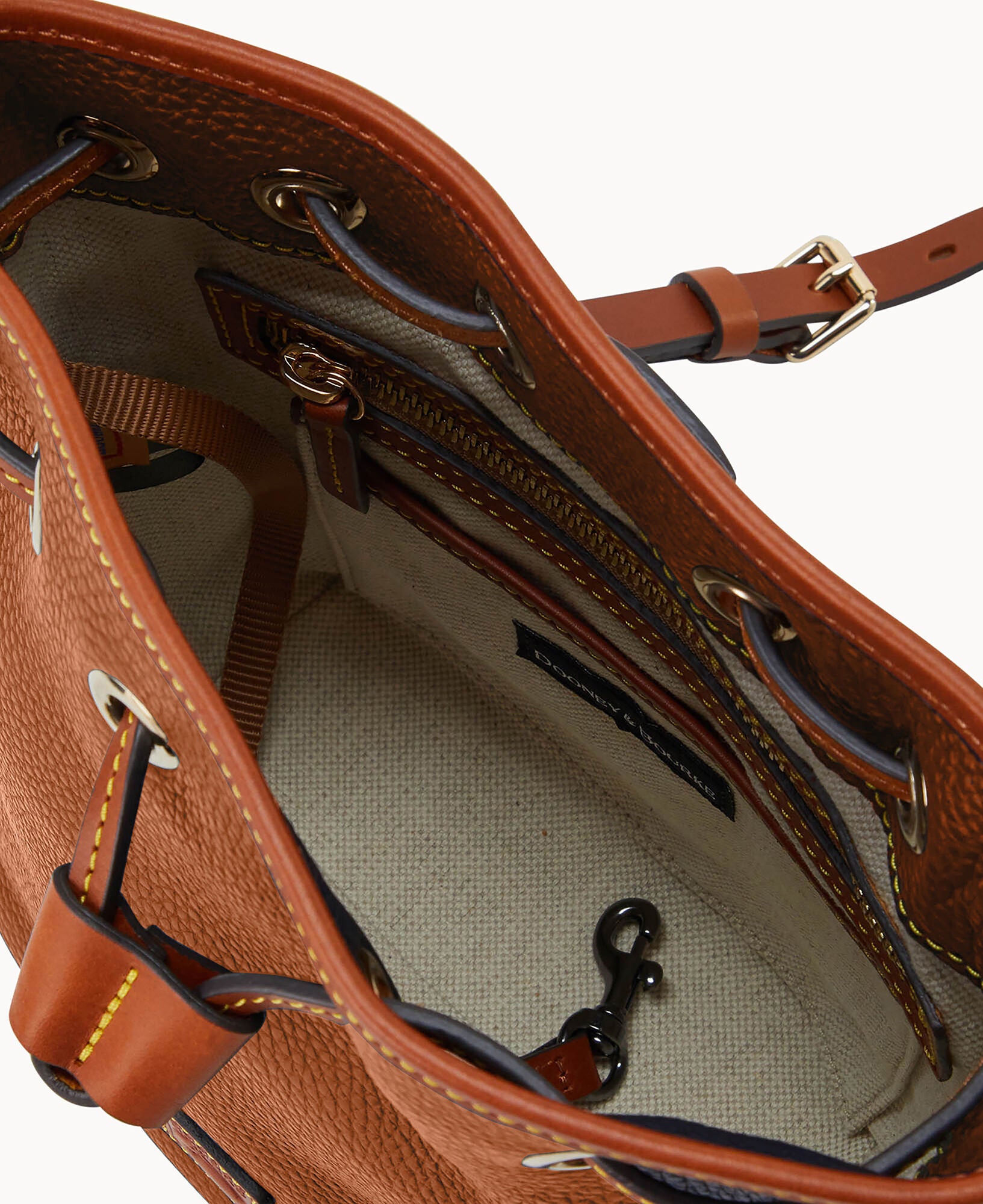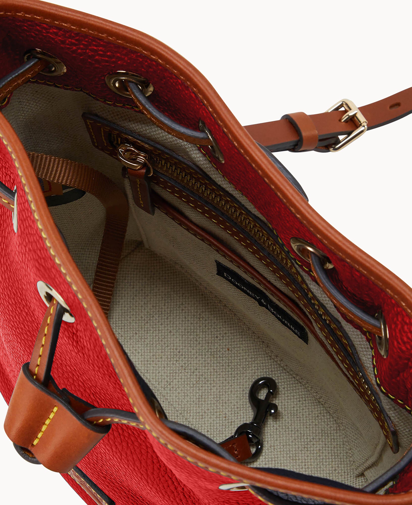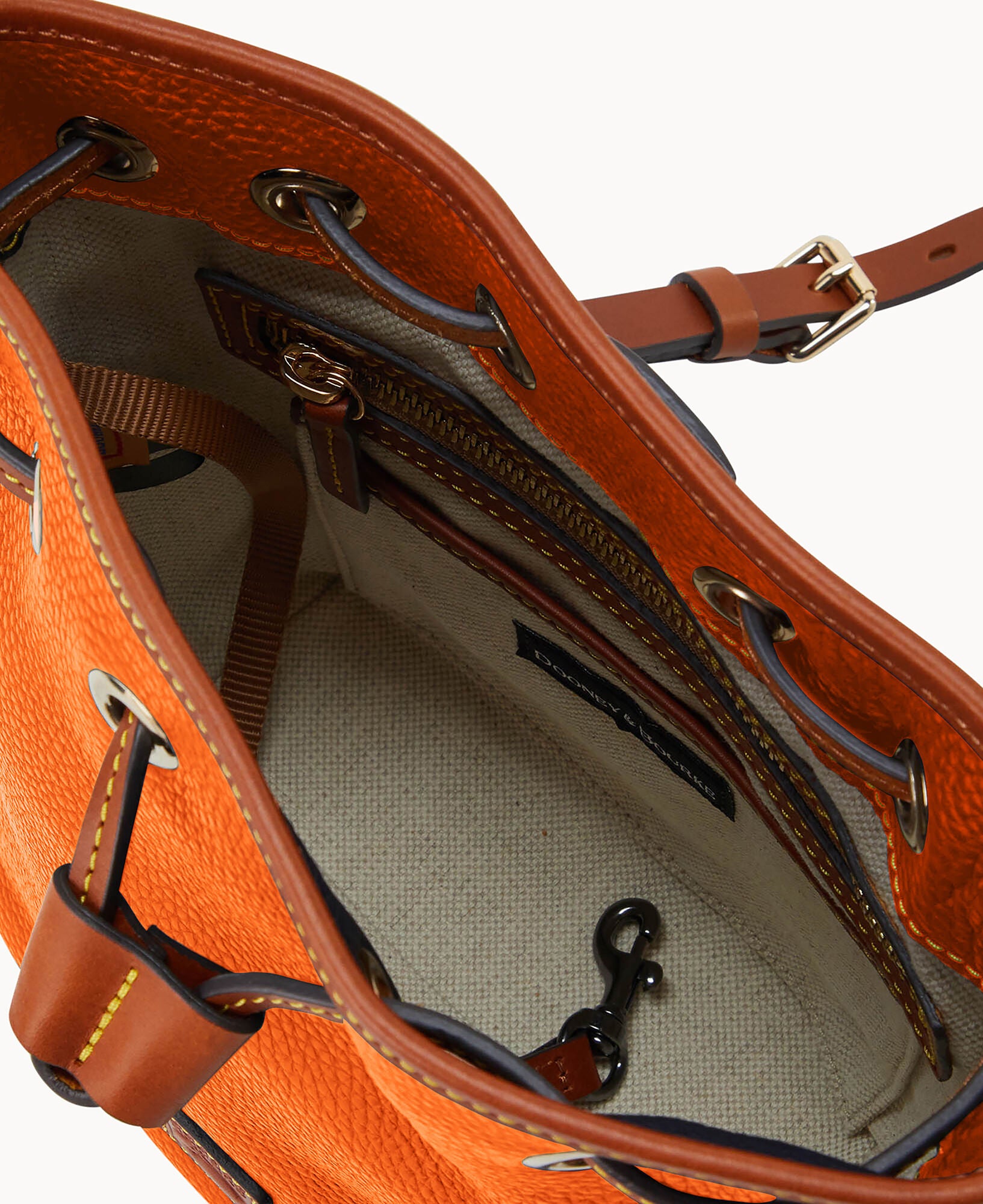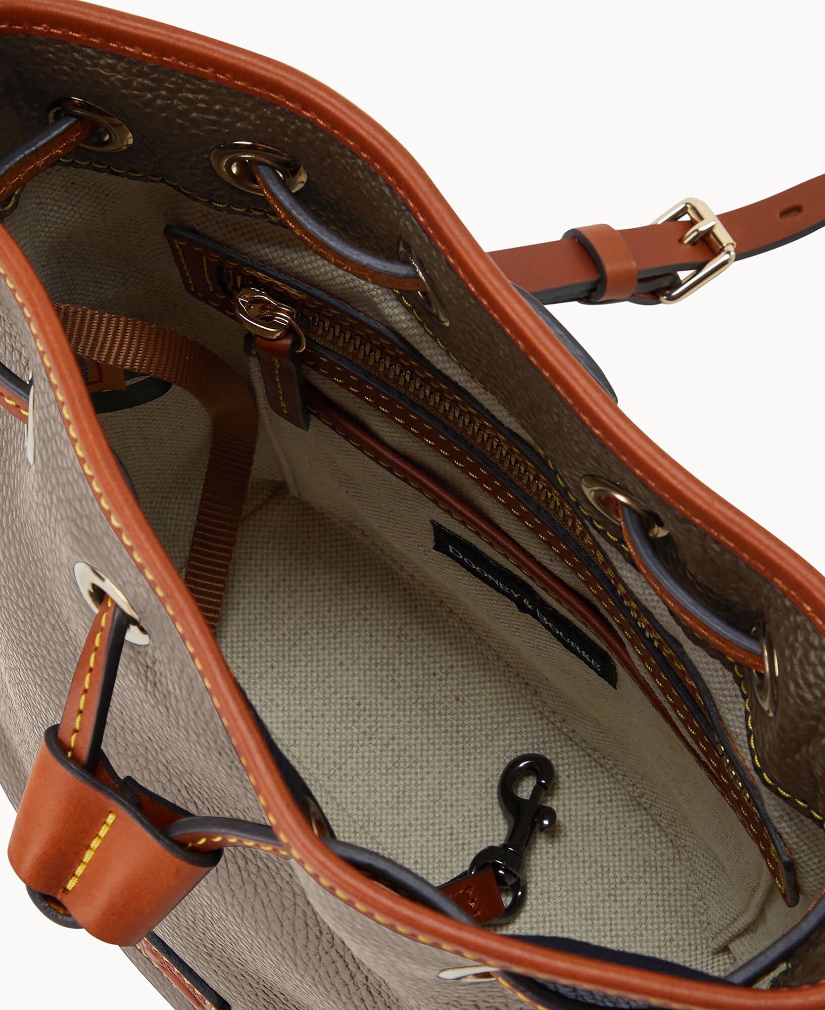 Two inside pockets. One inside zipper pocket. Inside key hook. Lined. Feet. Drawstring closure. Adjustable, removable strap. Strap drop length 25.5″. Removable DB medallion.