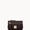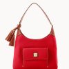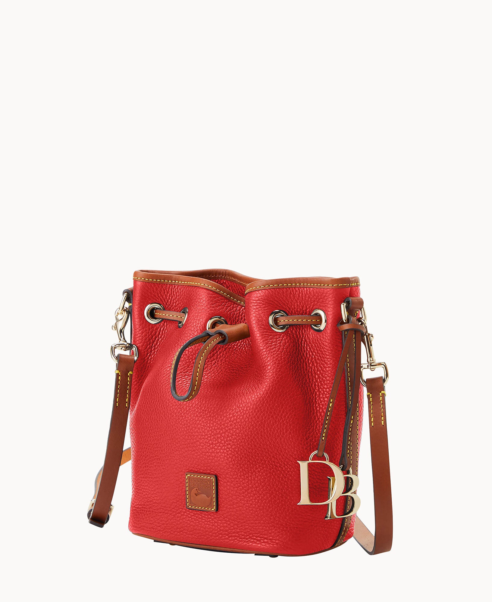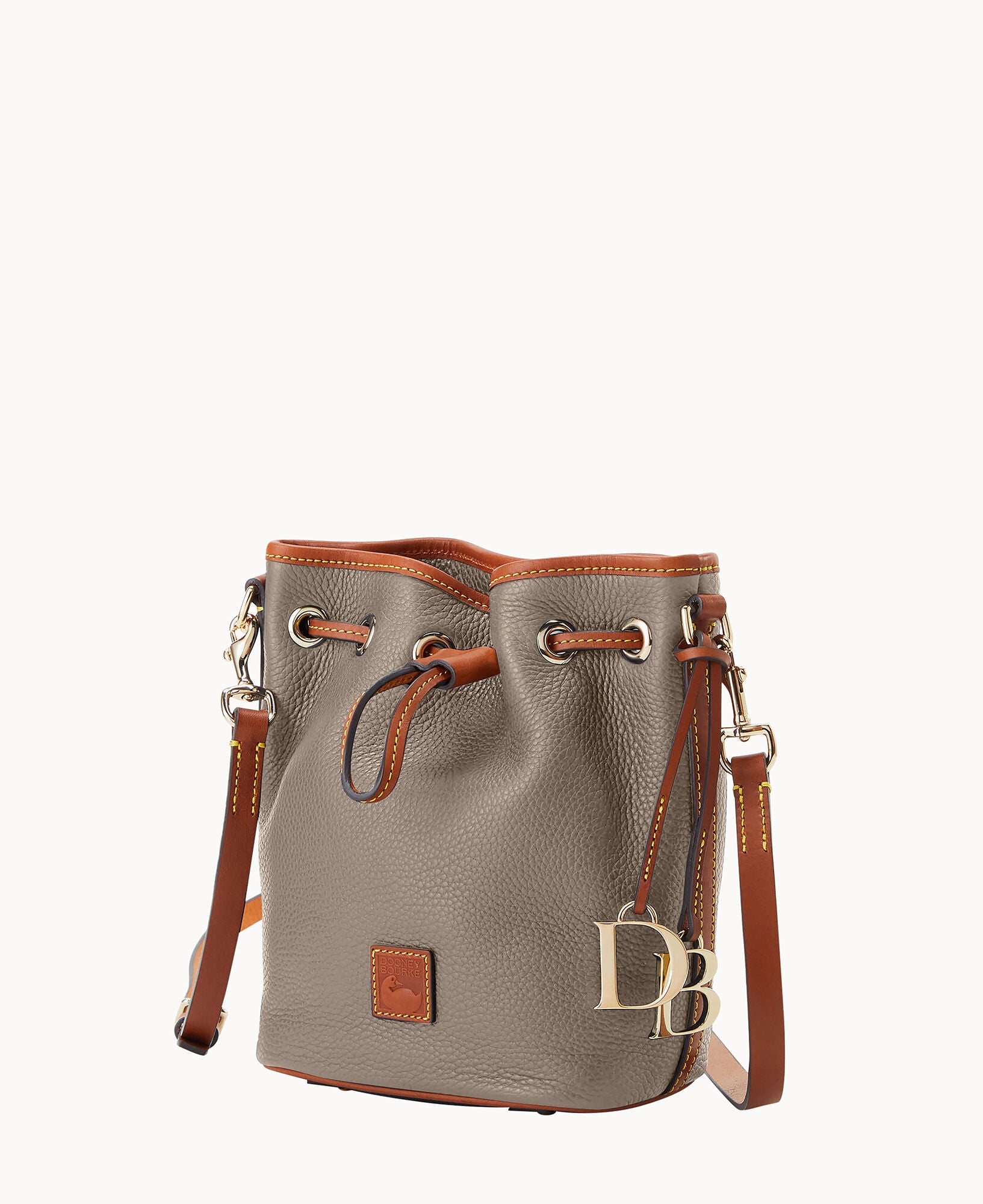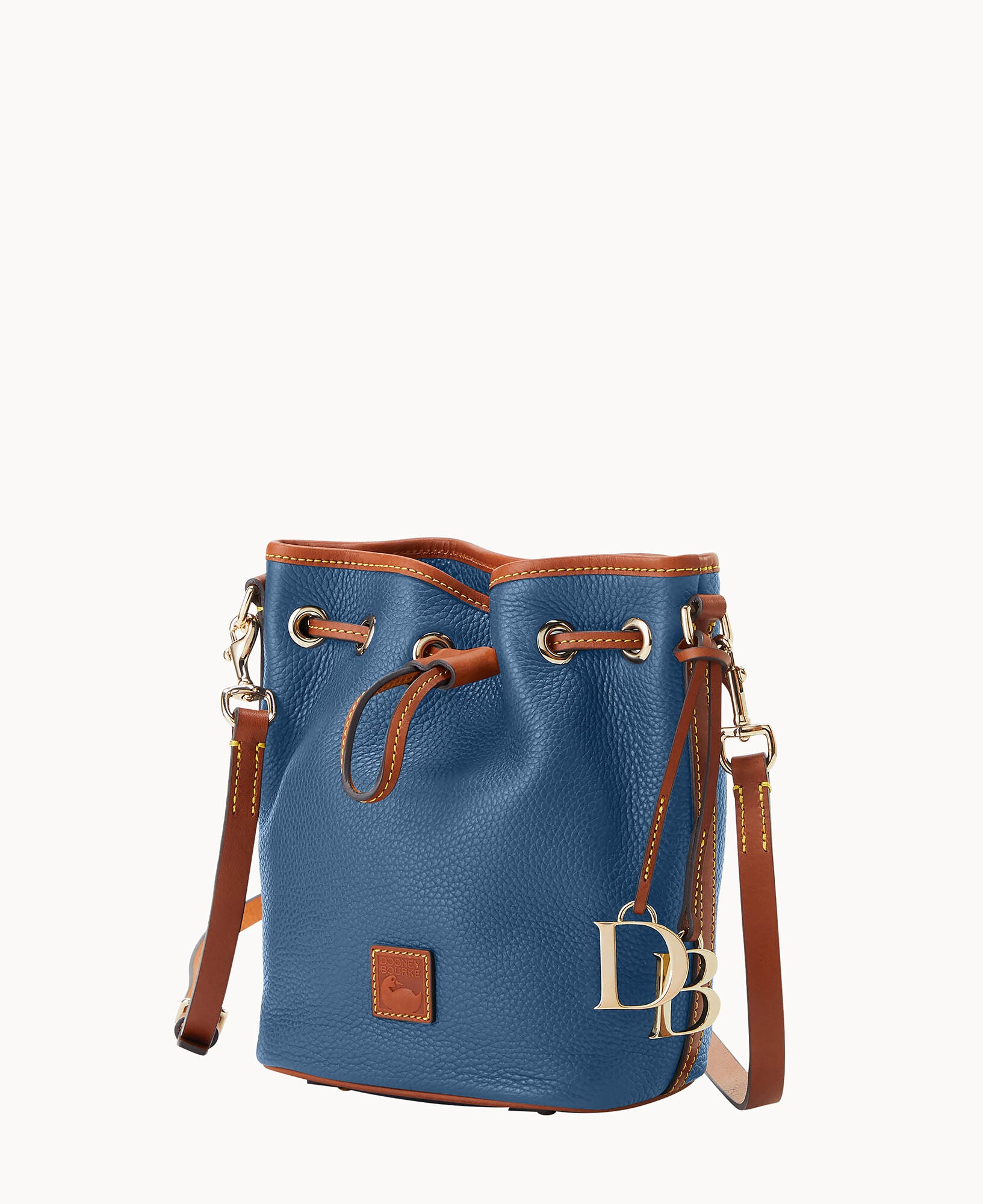 Two inside pockets. One inside zipper pocket. Inside key hook. Lined. Feet. Drawstring closure. Adjustable, removable strap. Strap drop length 25.5″. Removable DB medallion.