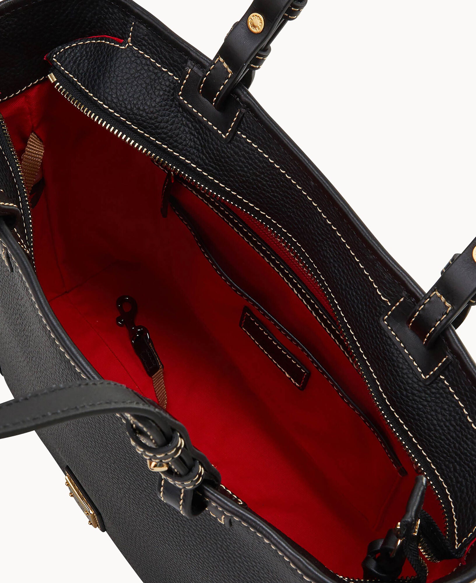 Two inside pockets. One inside zip pocket. Handle drop length 9″. Inside key hook. Feet. Zipper closure.