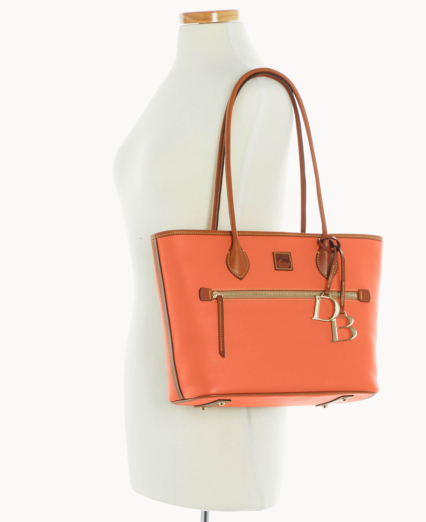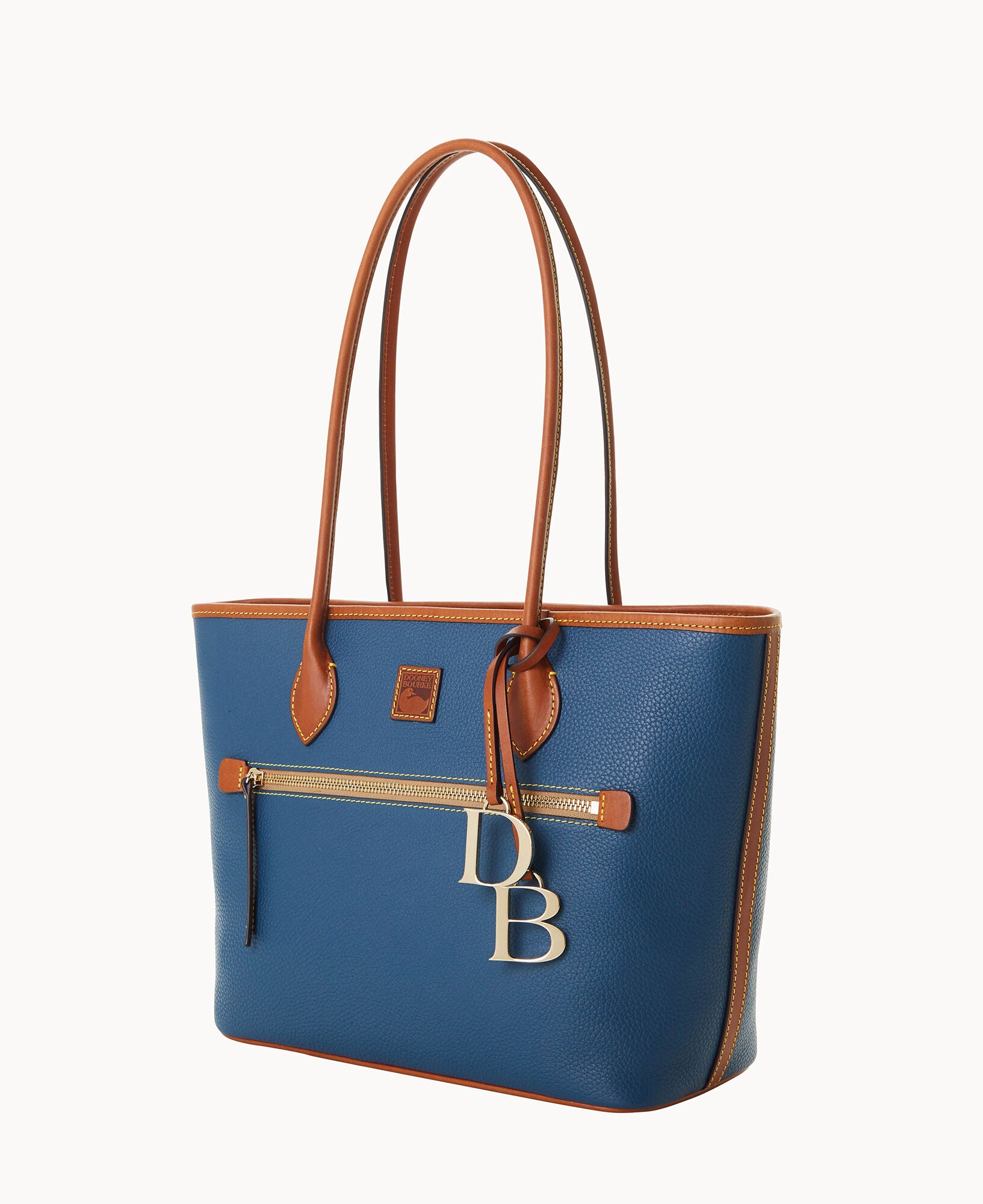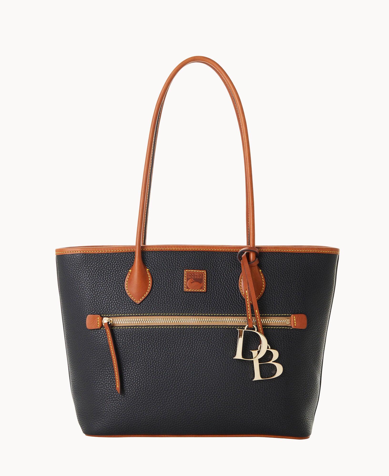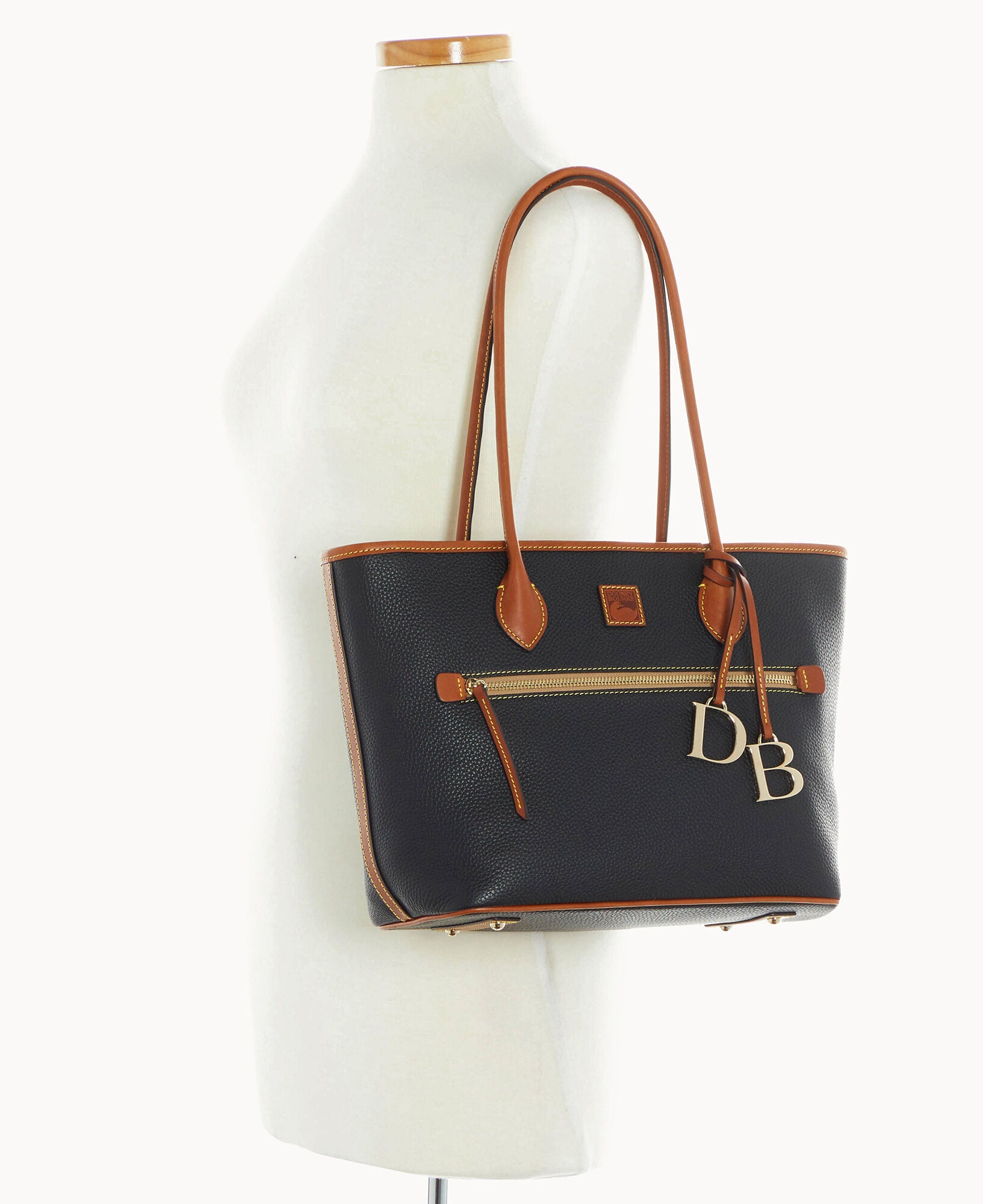 One outside zip pocket. Two inside slip pockets. One inside phone pocket. One inside zip pocket. Inside key hook. Strap drop length 10″. Feet. Lined. Zipper closure. Removable DB medallion.