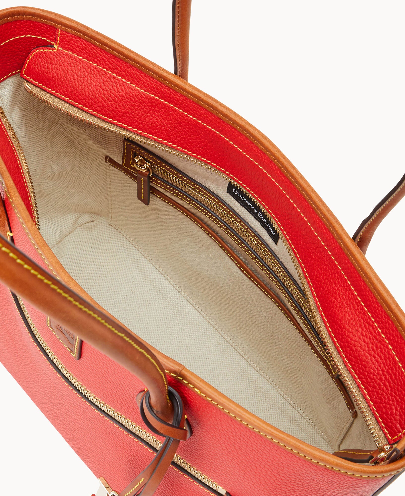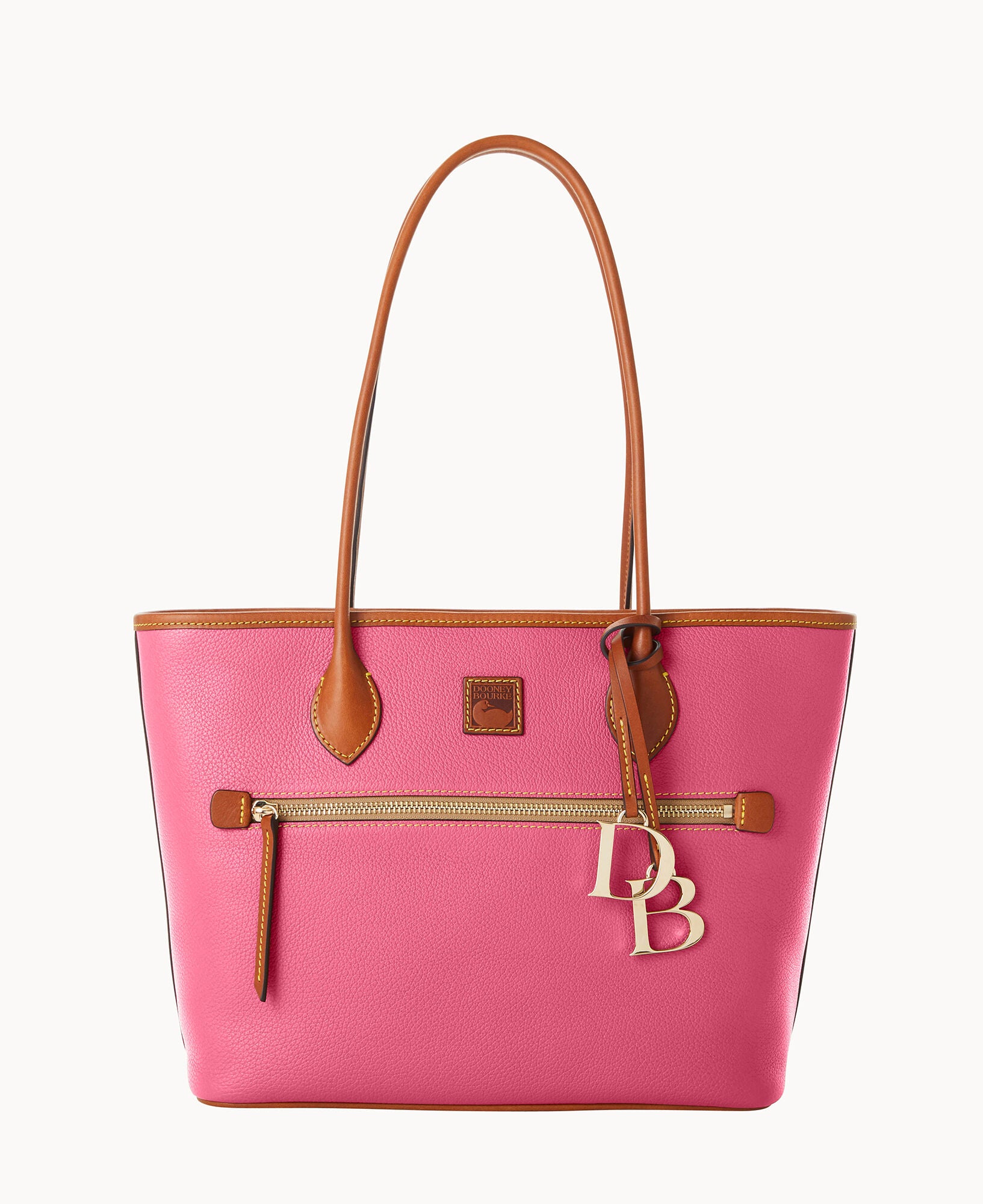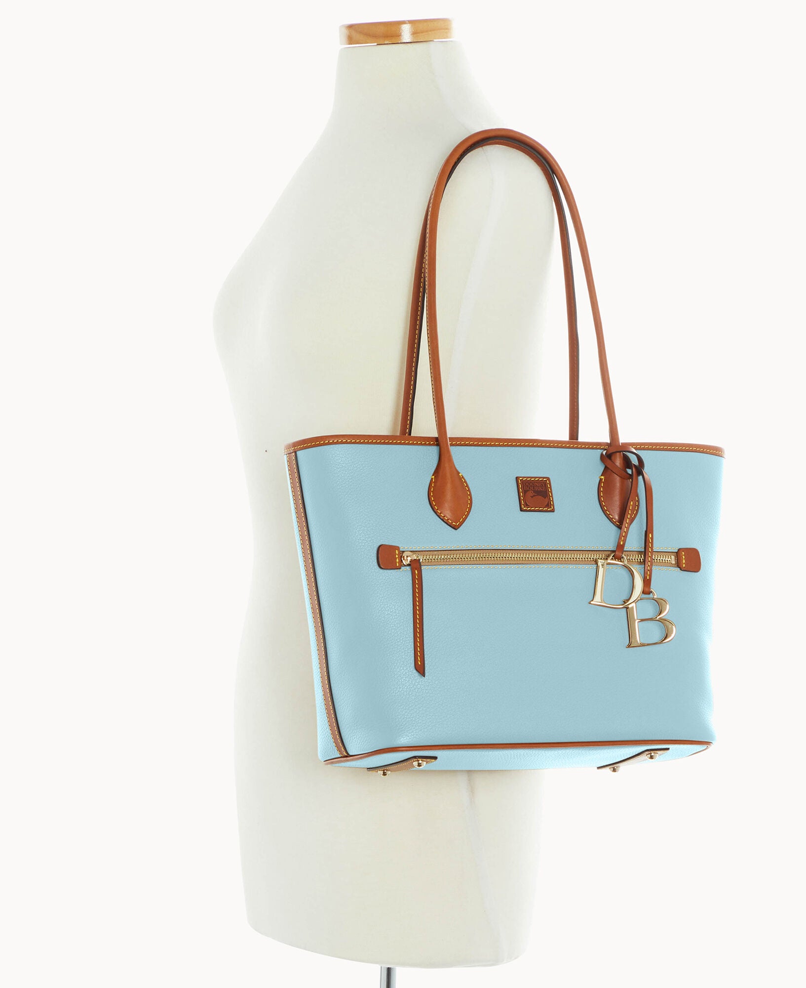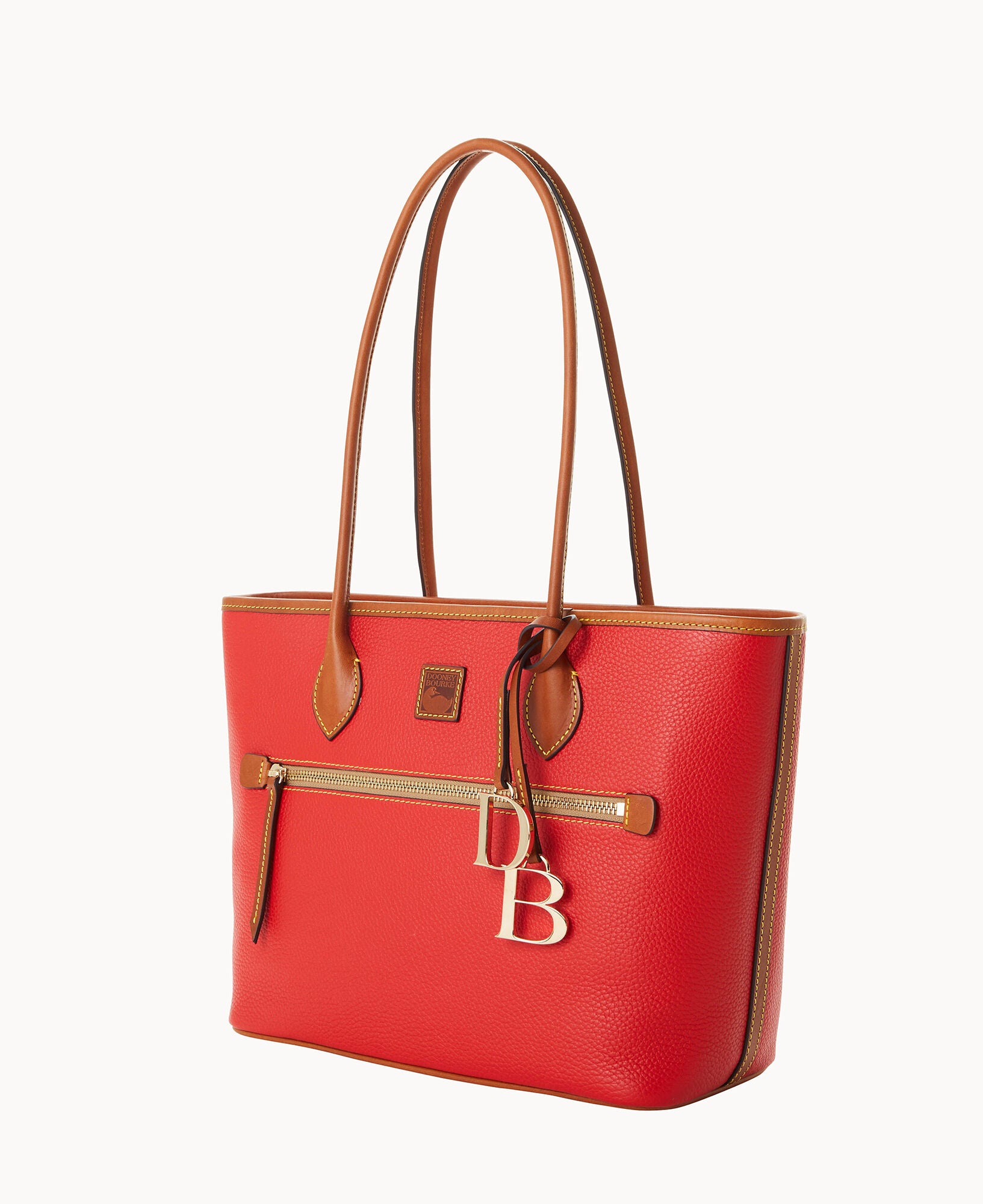 One outside zip pocket. Two inside slip pockets. One inside phone pocket. One inside zip pocket. Inside key hook. Strap drop length 10″. Feet. Lined. Zipper closure. Removable DB medallion.