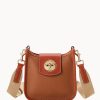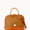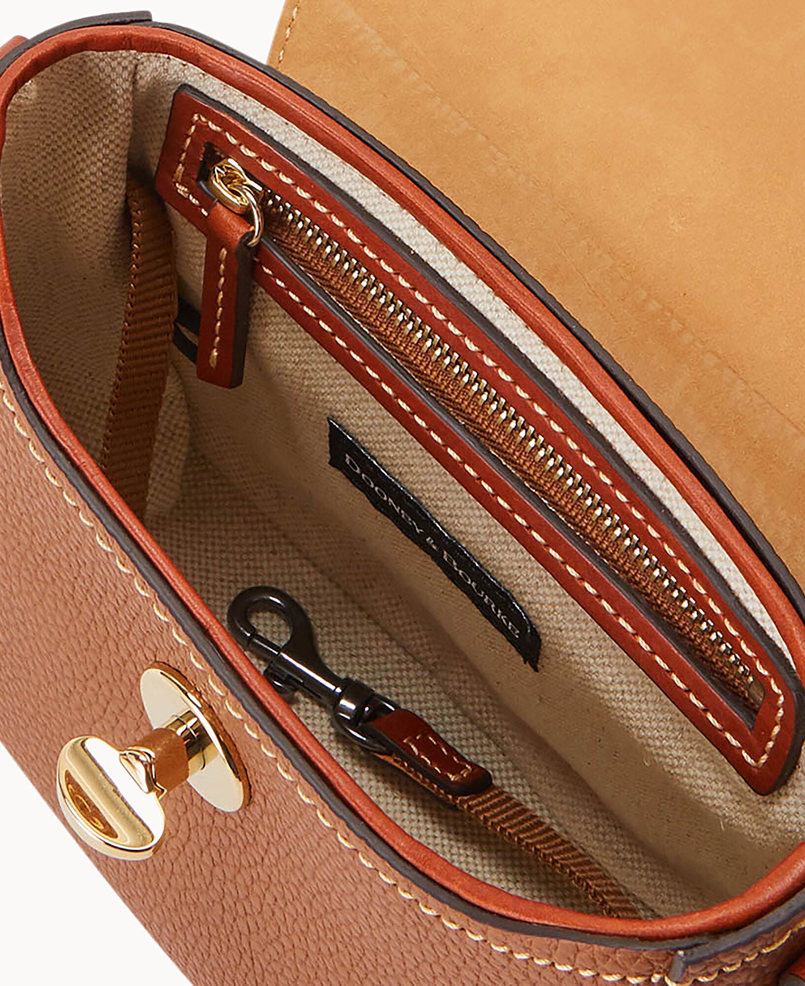 One inside zip pocket. One inside pocket. Inside key hook. Adjustable, detachable shoulder strap. Strap drop length 24″. Lined. Turnlock closure.