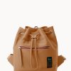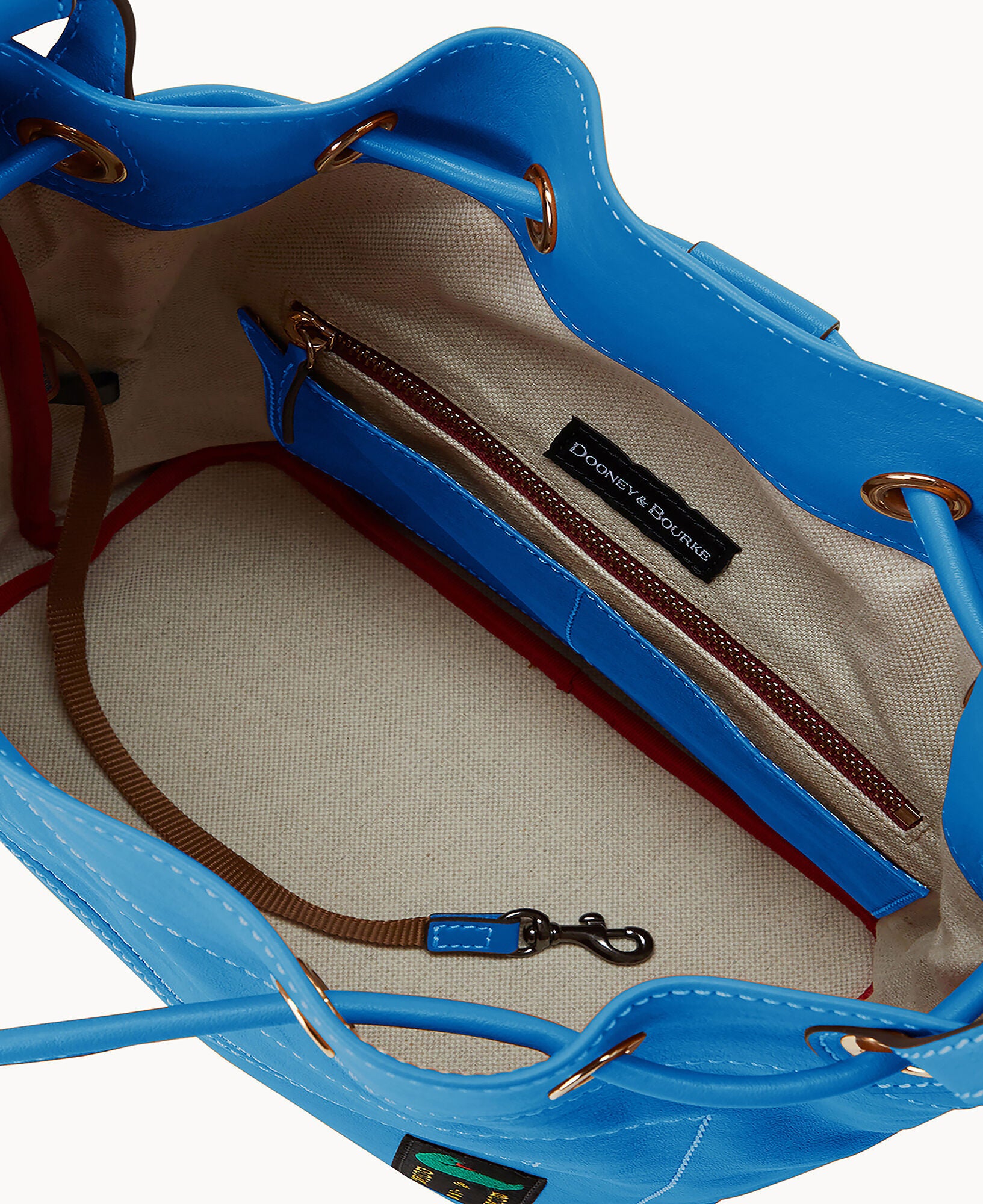 One outside zip pocket. One inside zip pocket. Four inside pockets. Inside key hook. Adjustable shoulder straps. Strap length 17″. Lined. Drawstring closure.