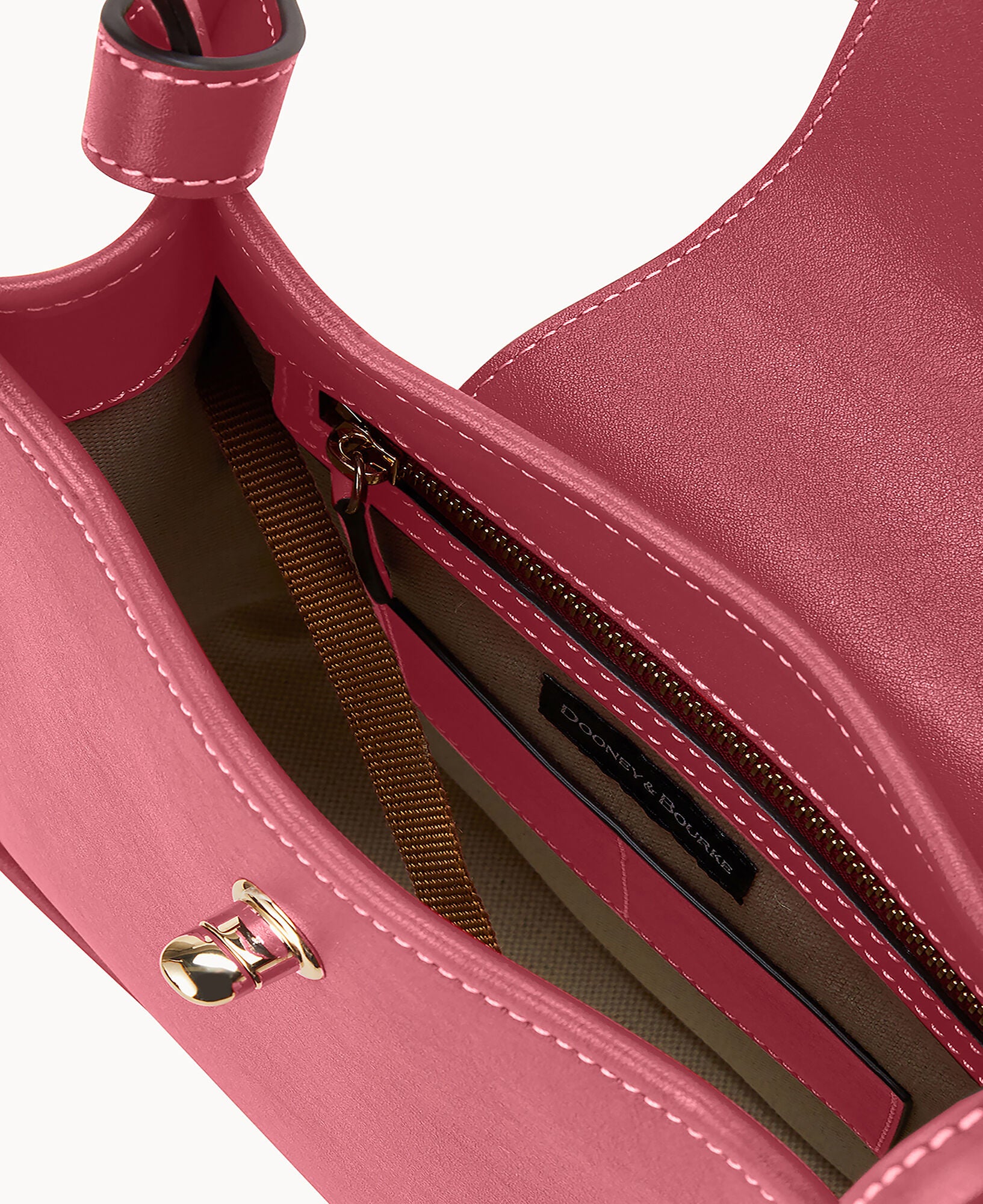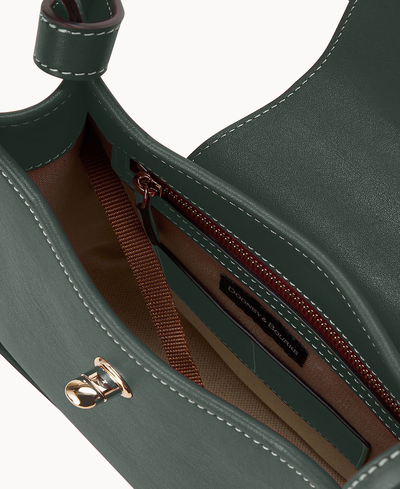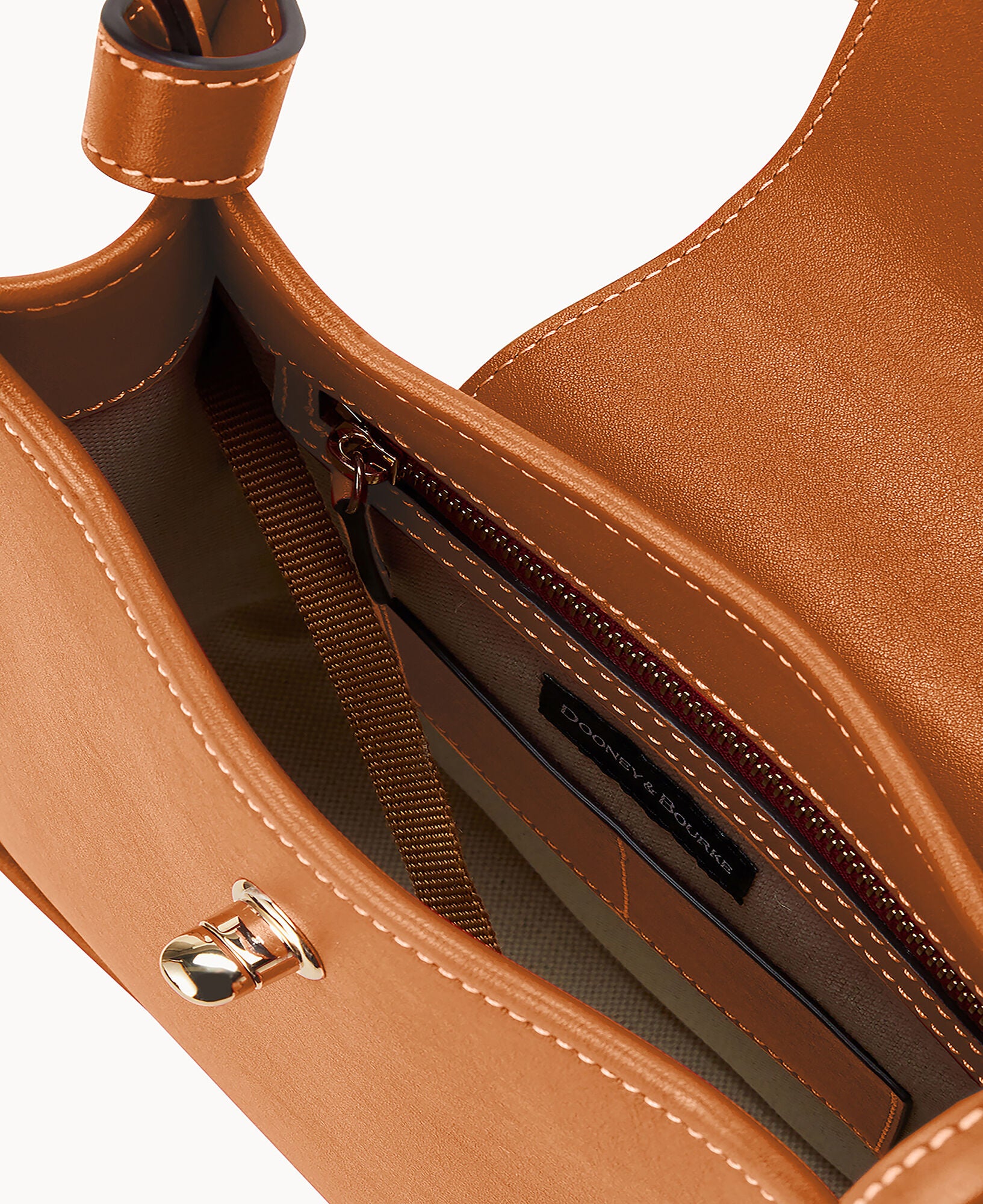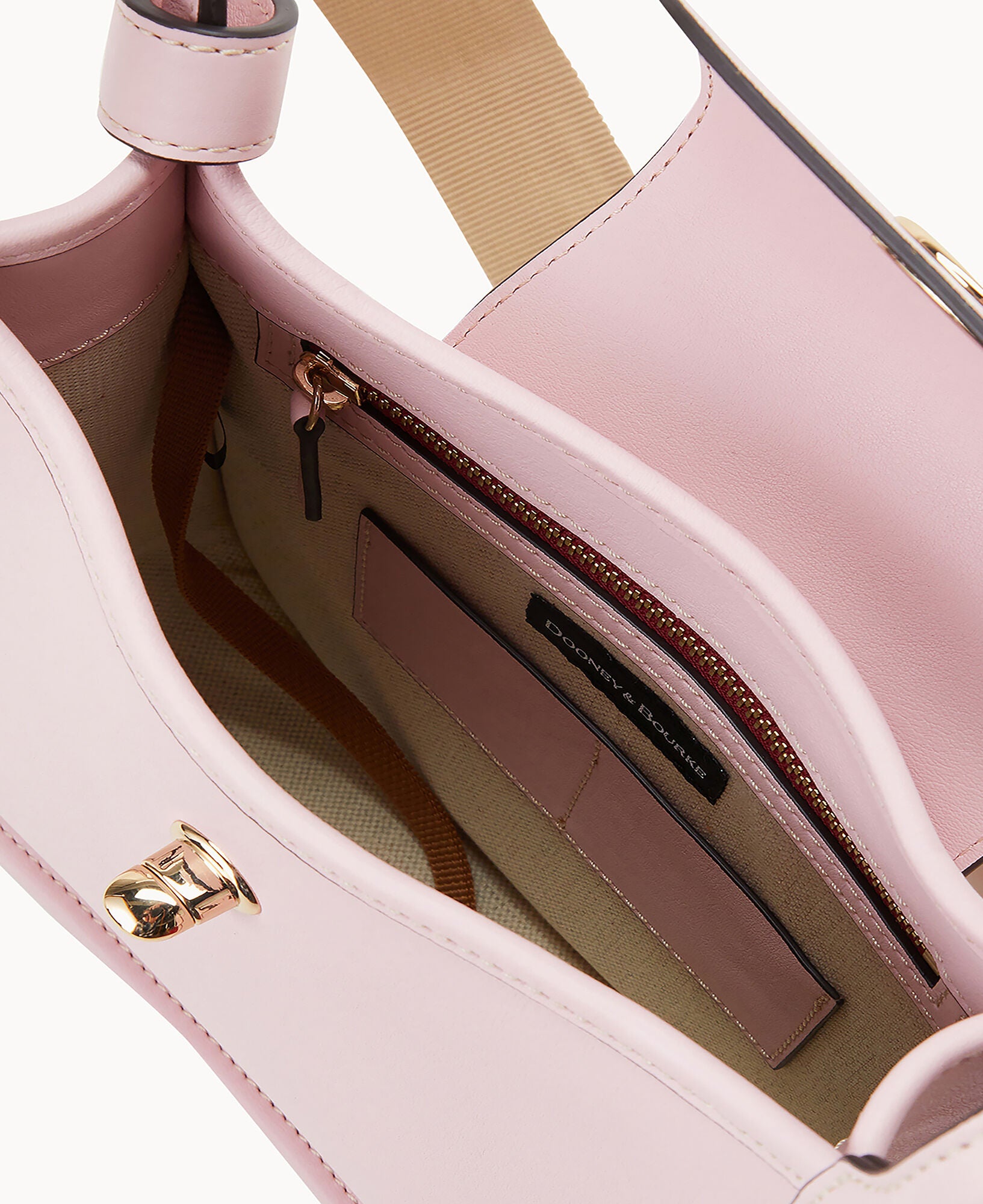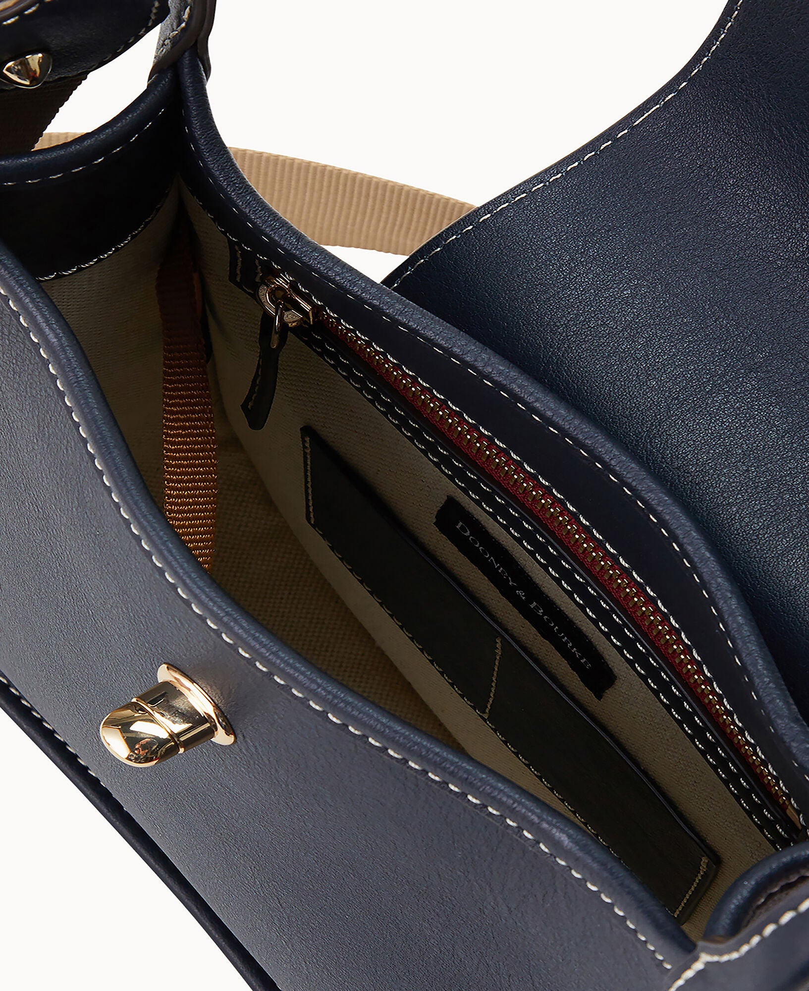 One outside pocket. Two inside card slots. Inside key hook. Adjustable shoulder strap. Strap drop length 23″. Lined. Turnlock closure.