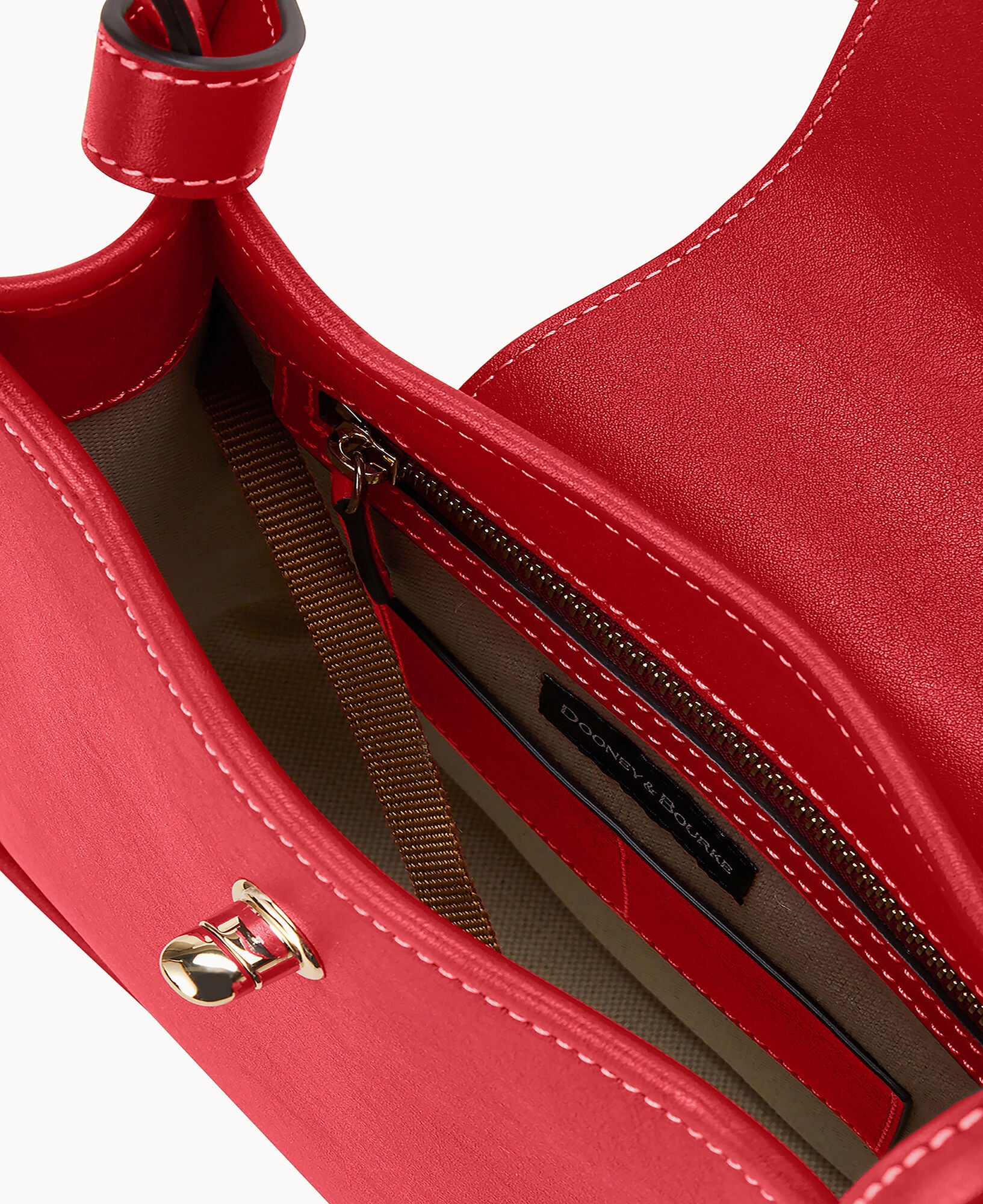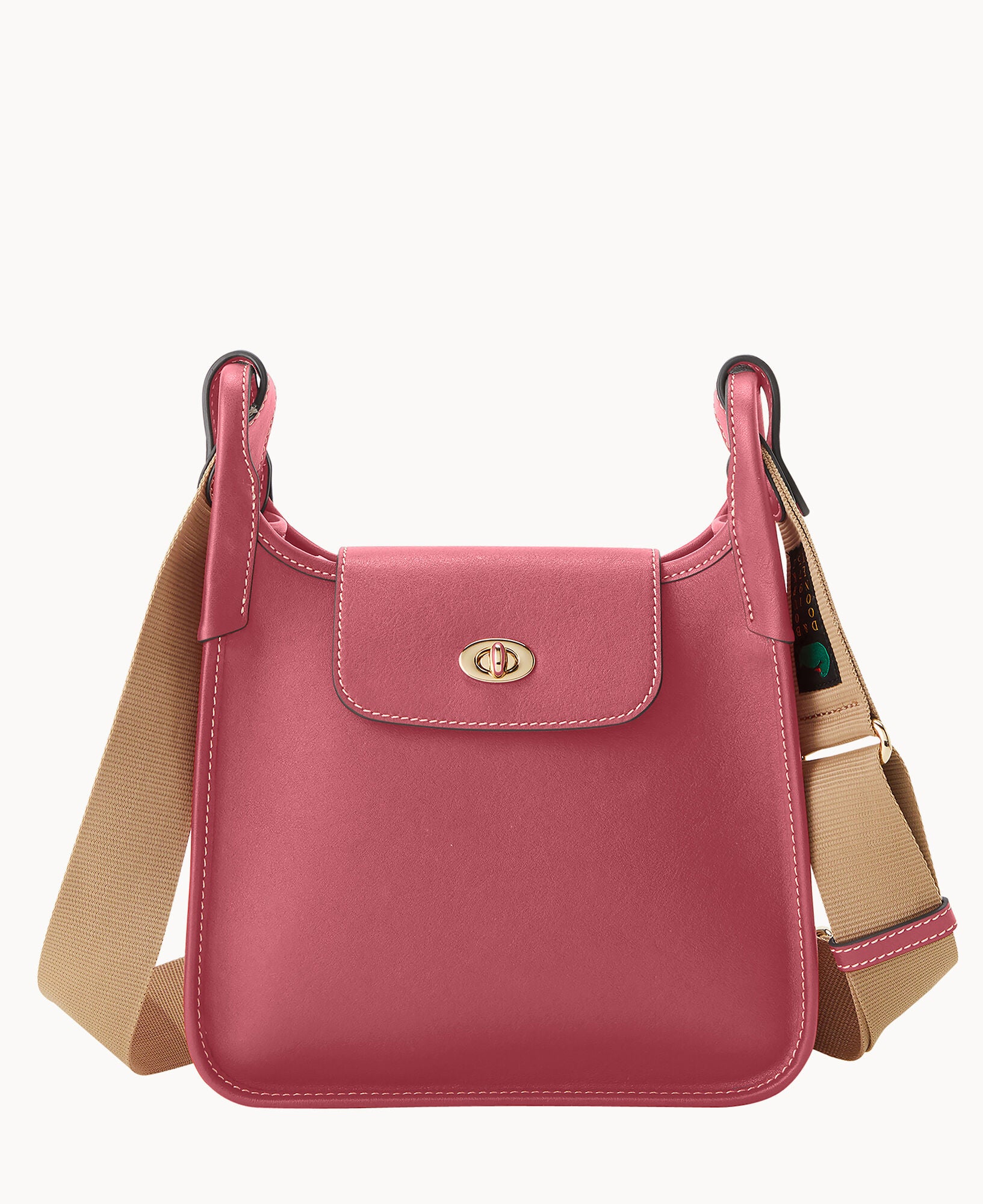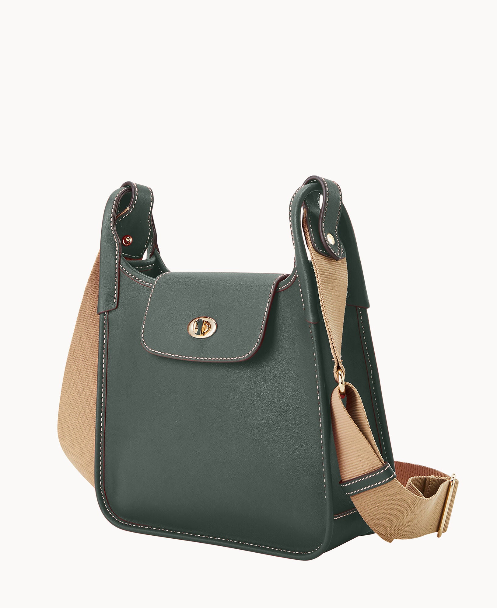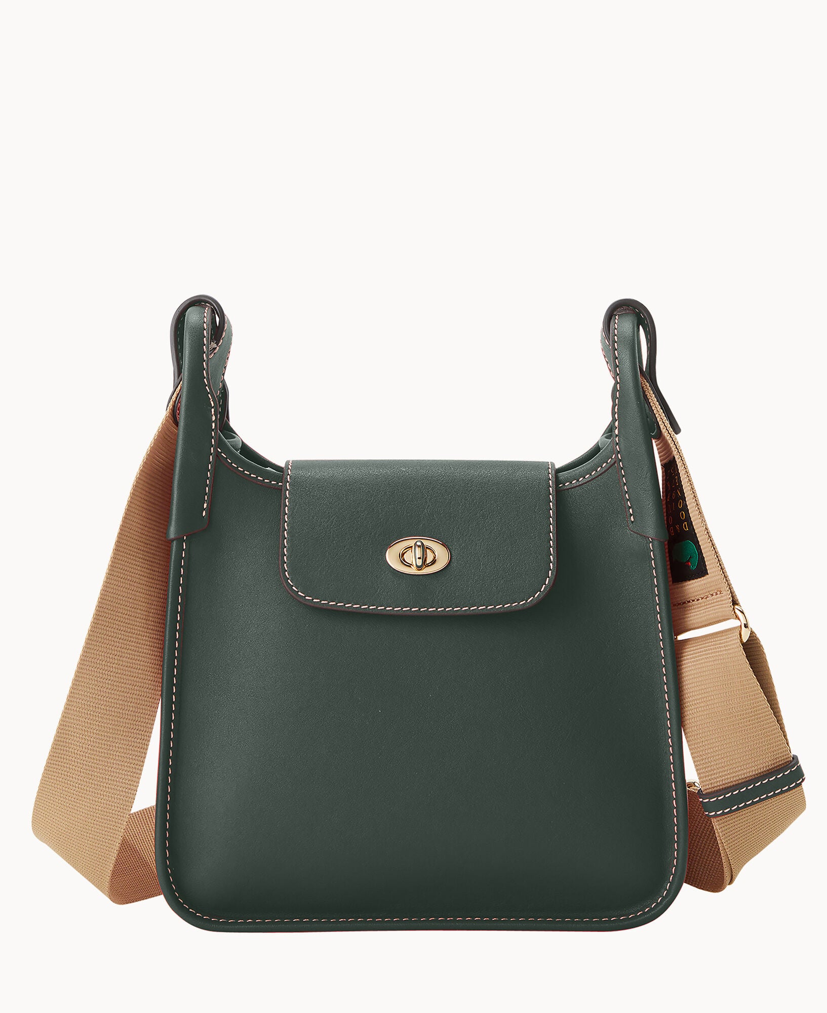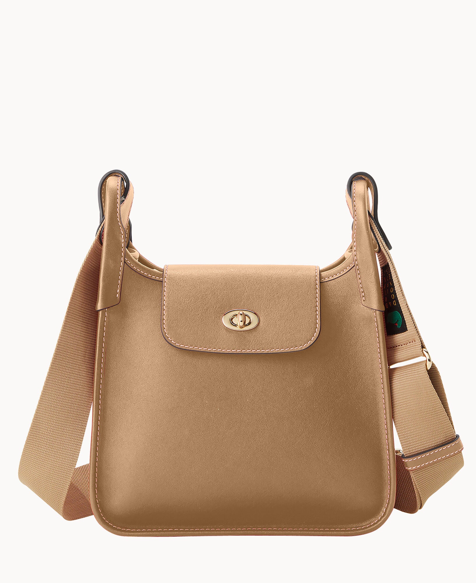 One outside pocket. Two inside card slots. Inside key hook. Adjustable shoulder strap. Strap drop length 23″. Lined. Turnlock closure.