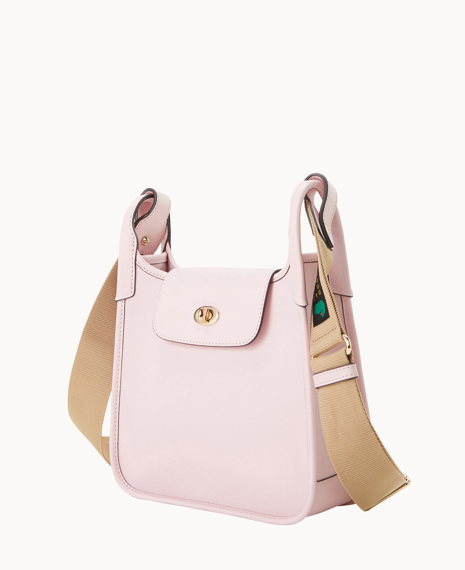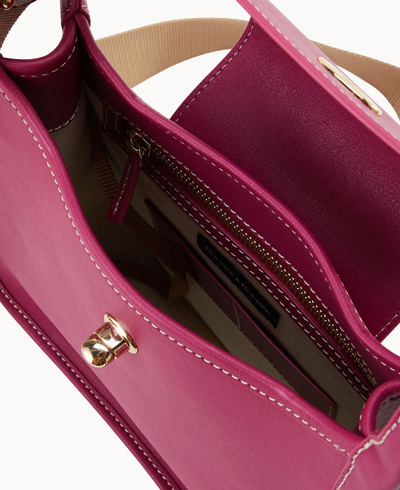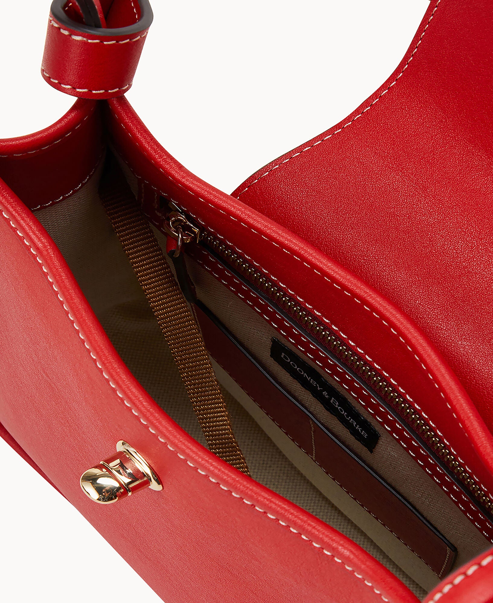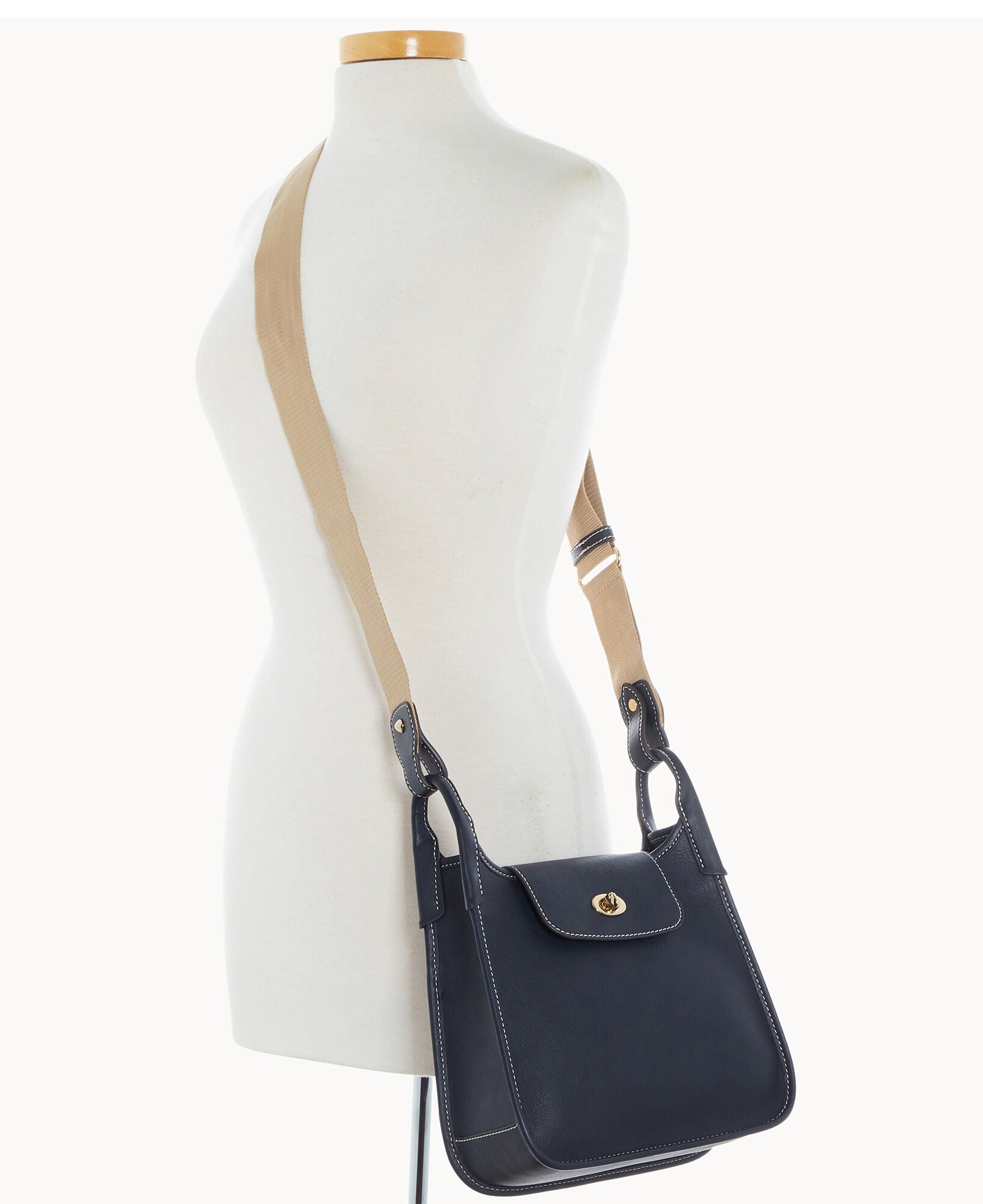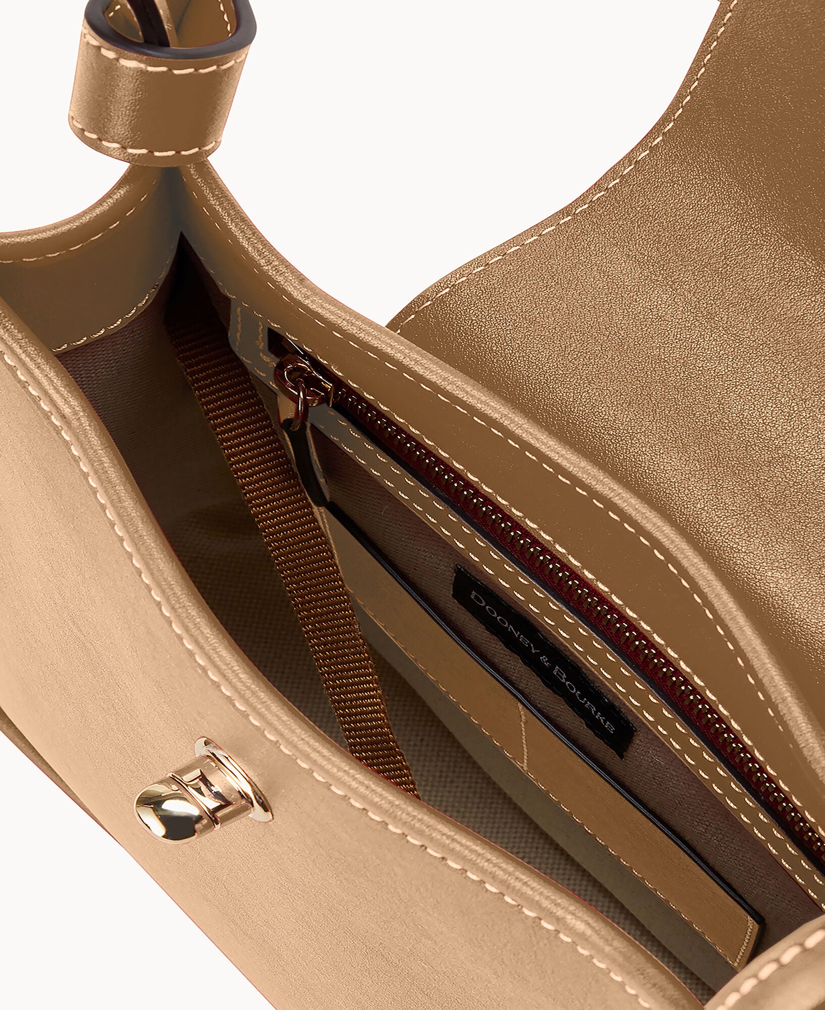 One outside pocket. Two inside card slots. Inside key hook. Adjustable shoulder strap. Strap drop length 23″. Lined. Turnlock closure.
