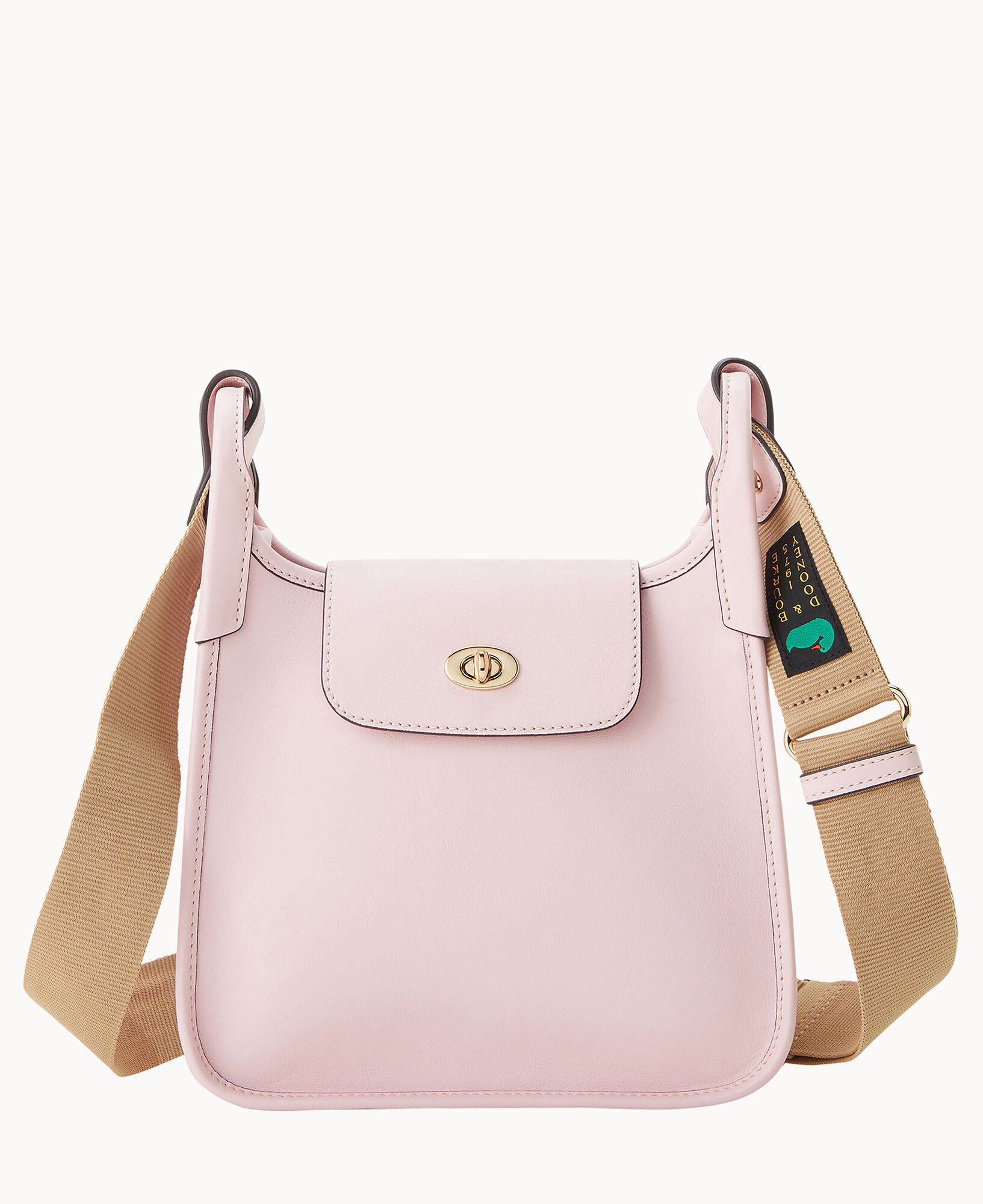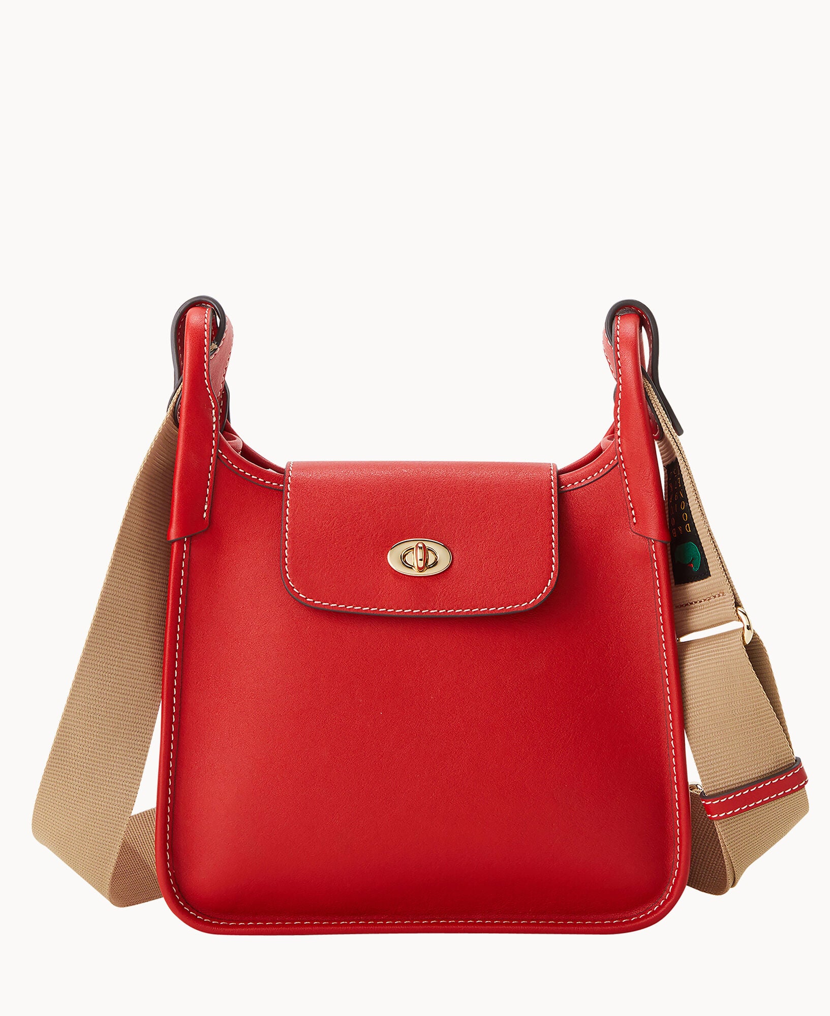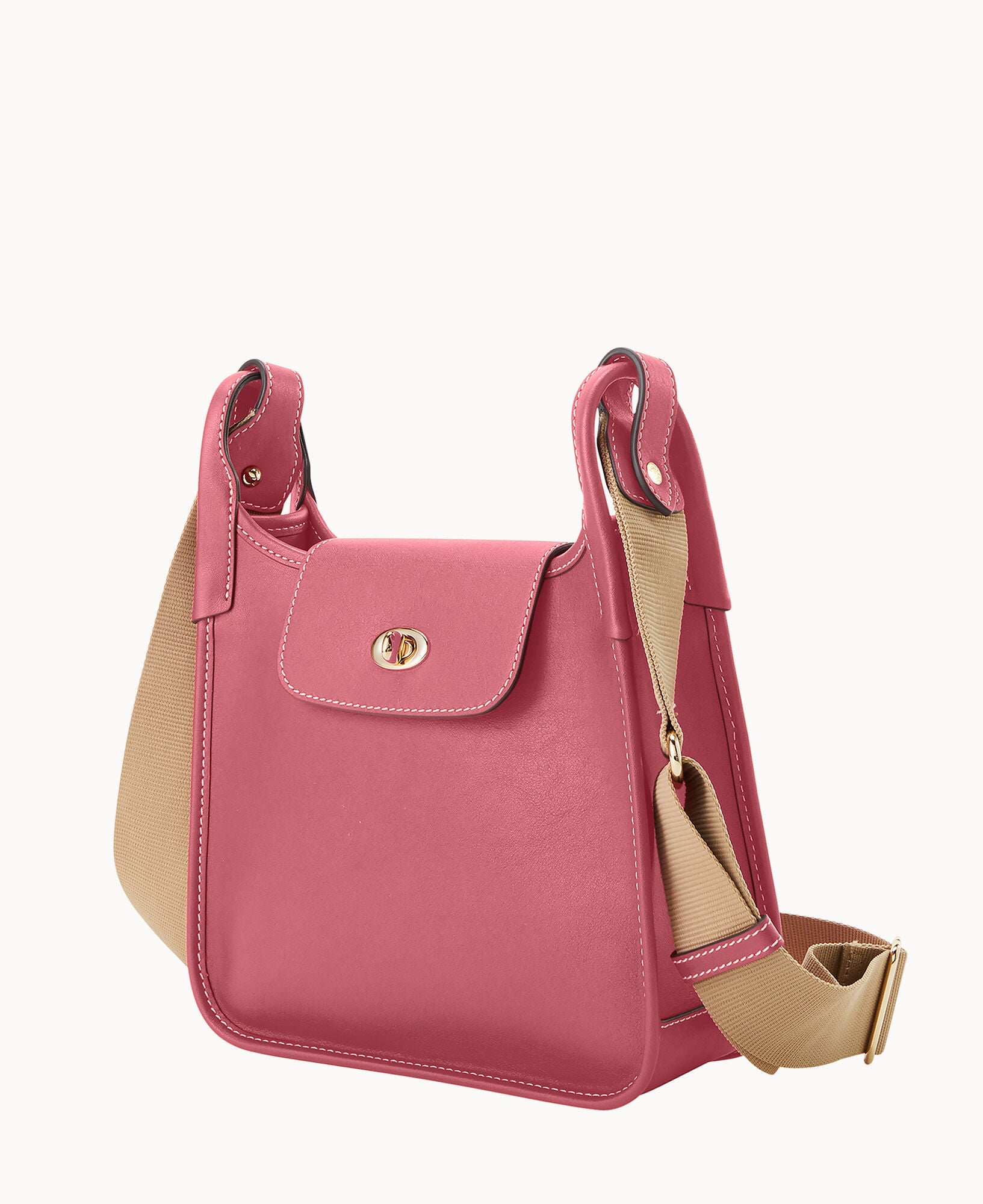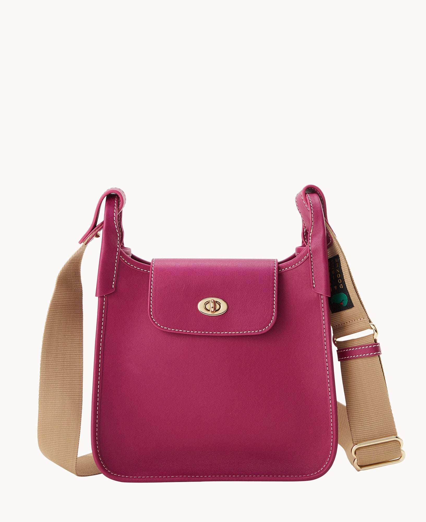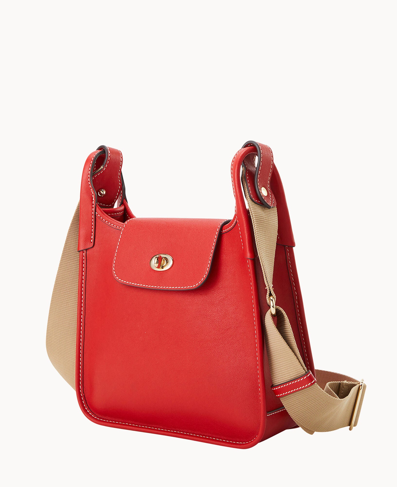 One outside pocket. Two inside card slots. Inside key hook. Adjustable shoulder strap. Strap drop length 23″. Lined. Turnlock closure.