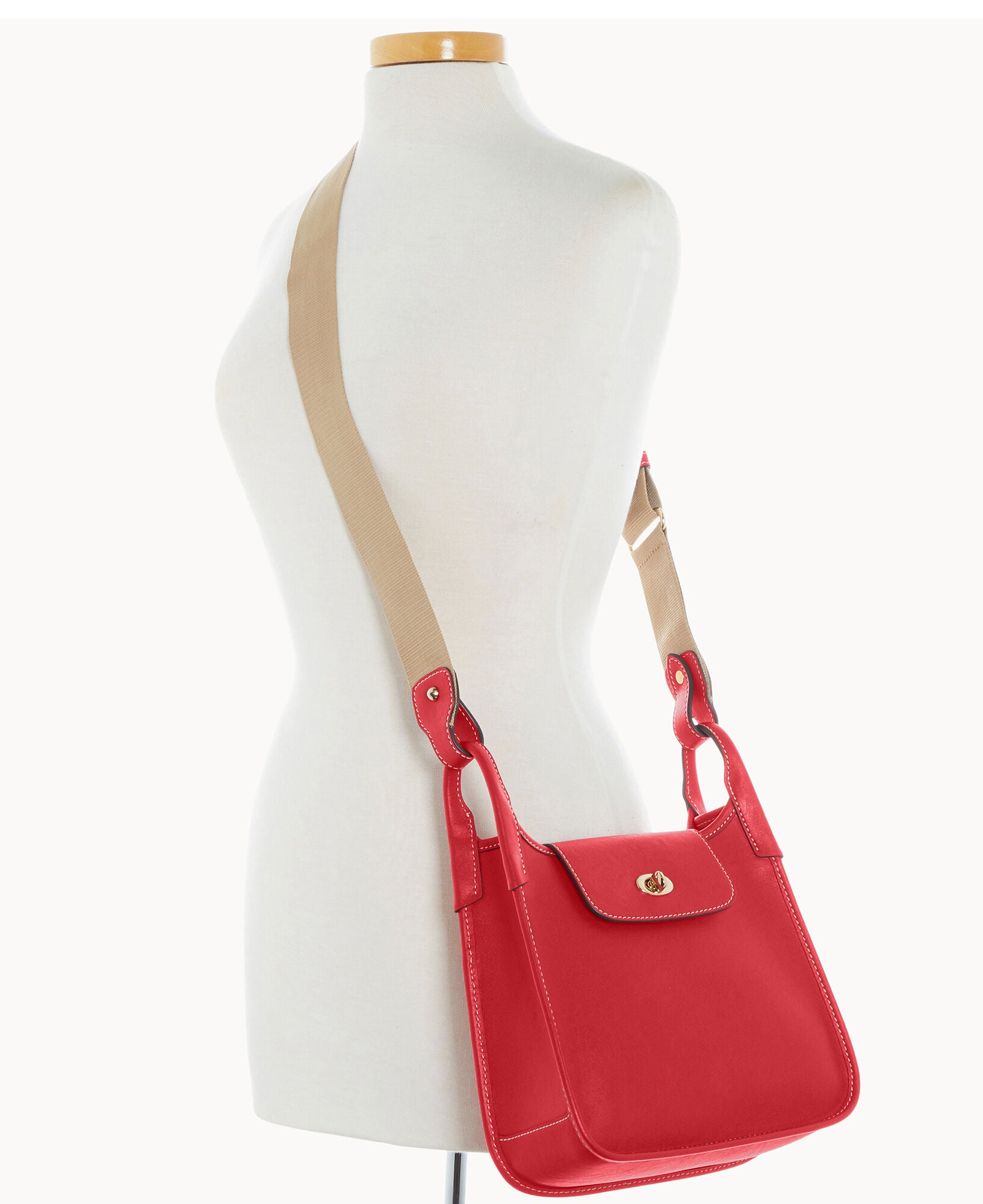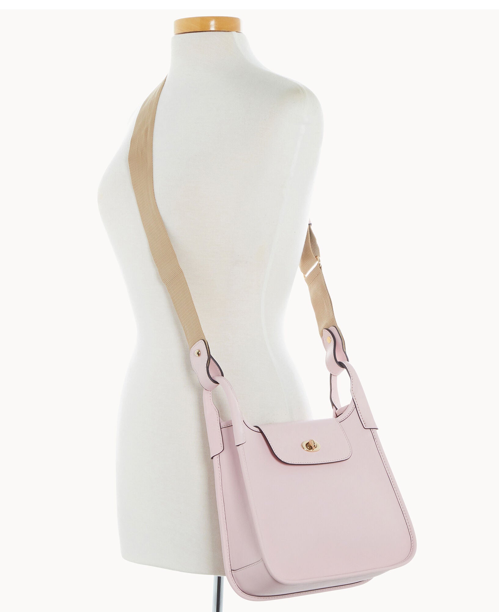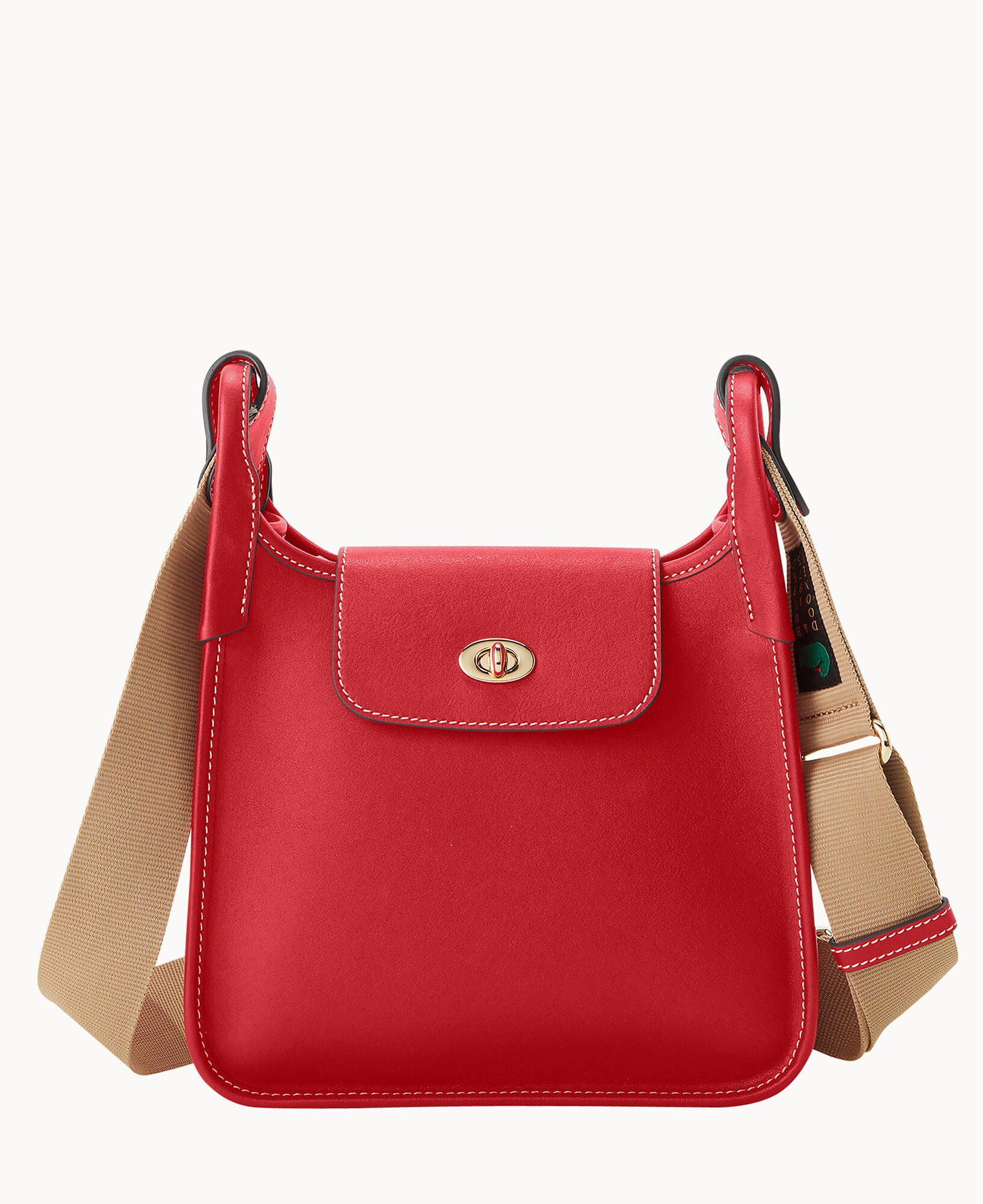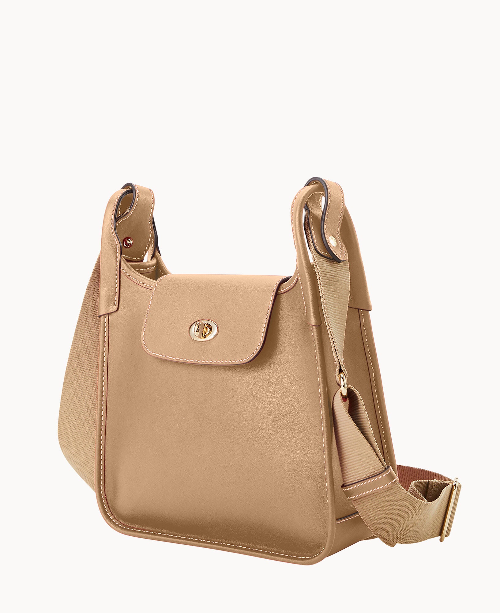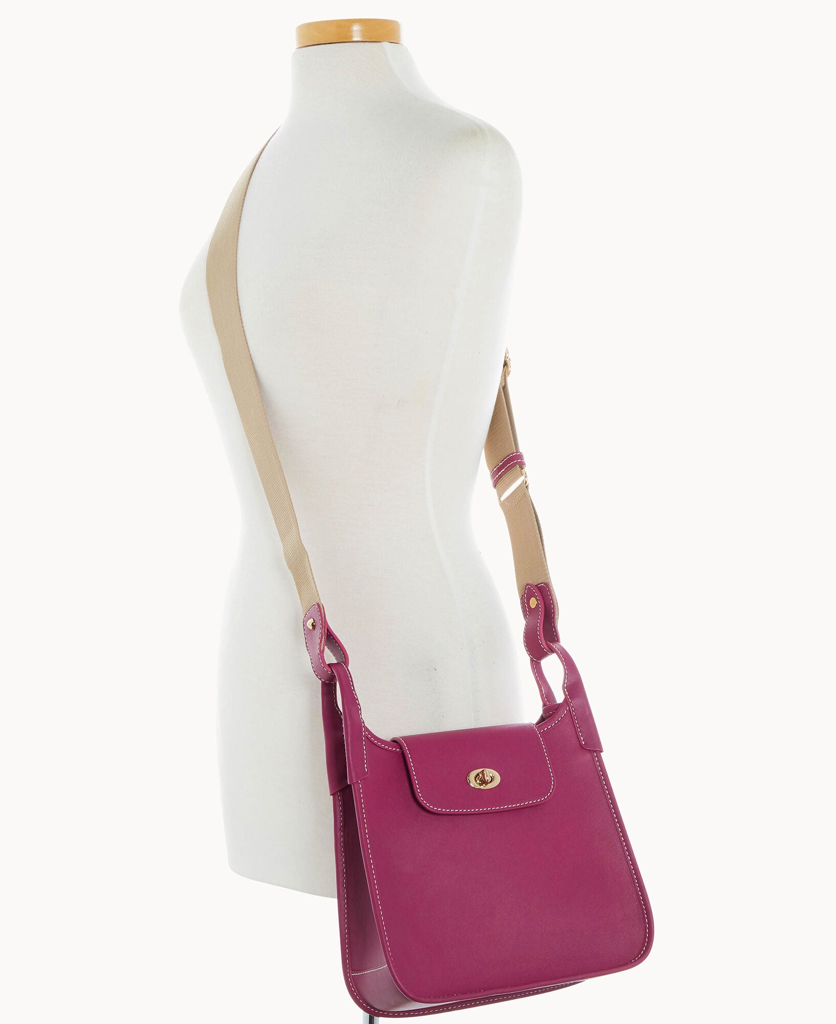 One outside pocket. Two inside card slots. Inside key hook. Adjustable shoulder strap. Strap drop length 23″. Lined. Turnlock closure.